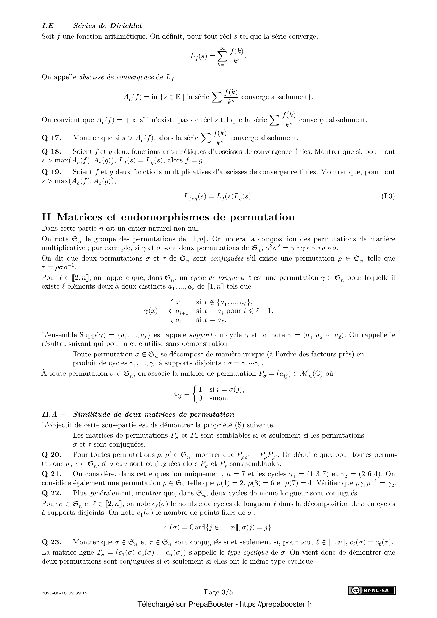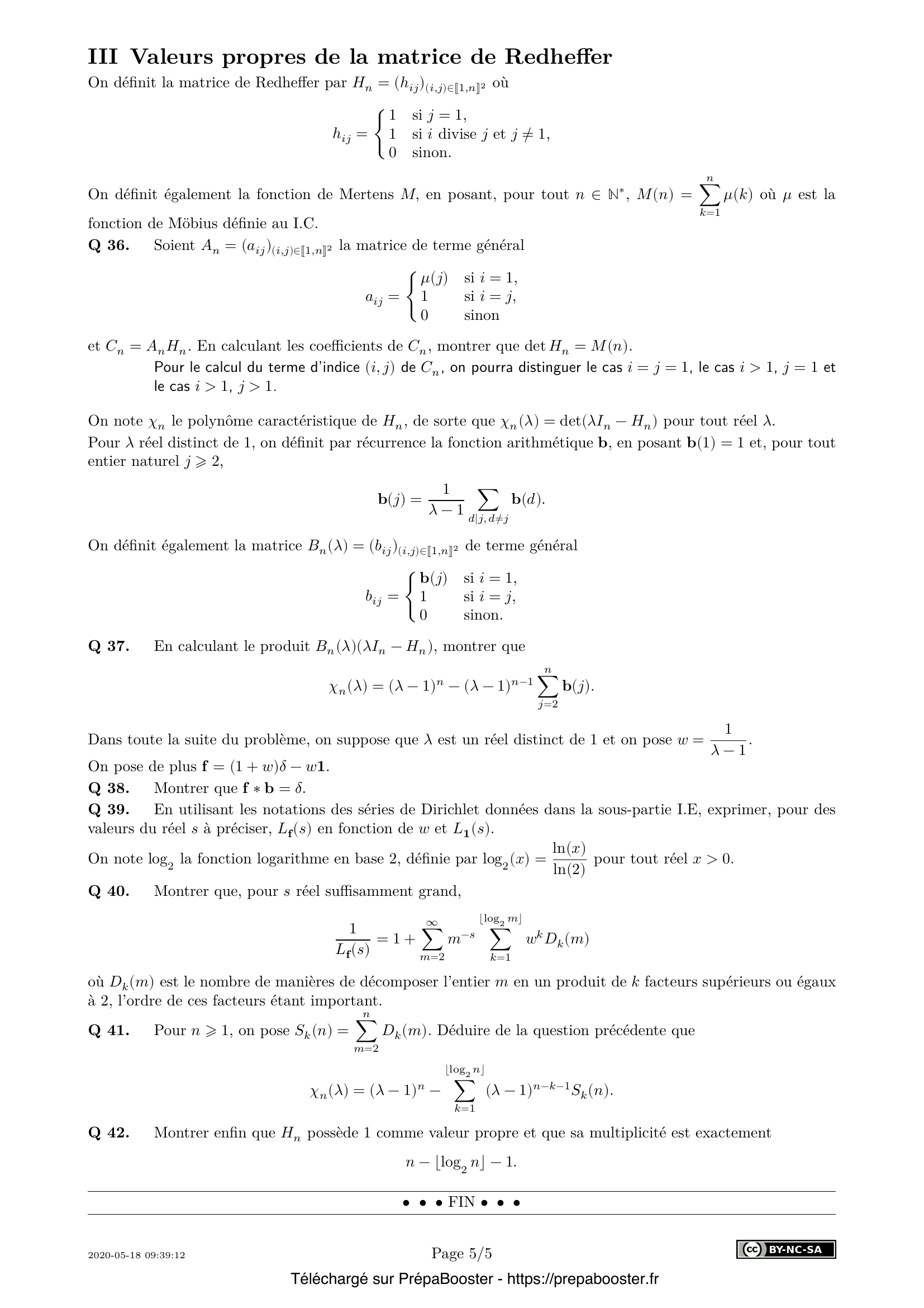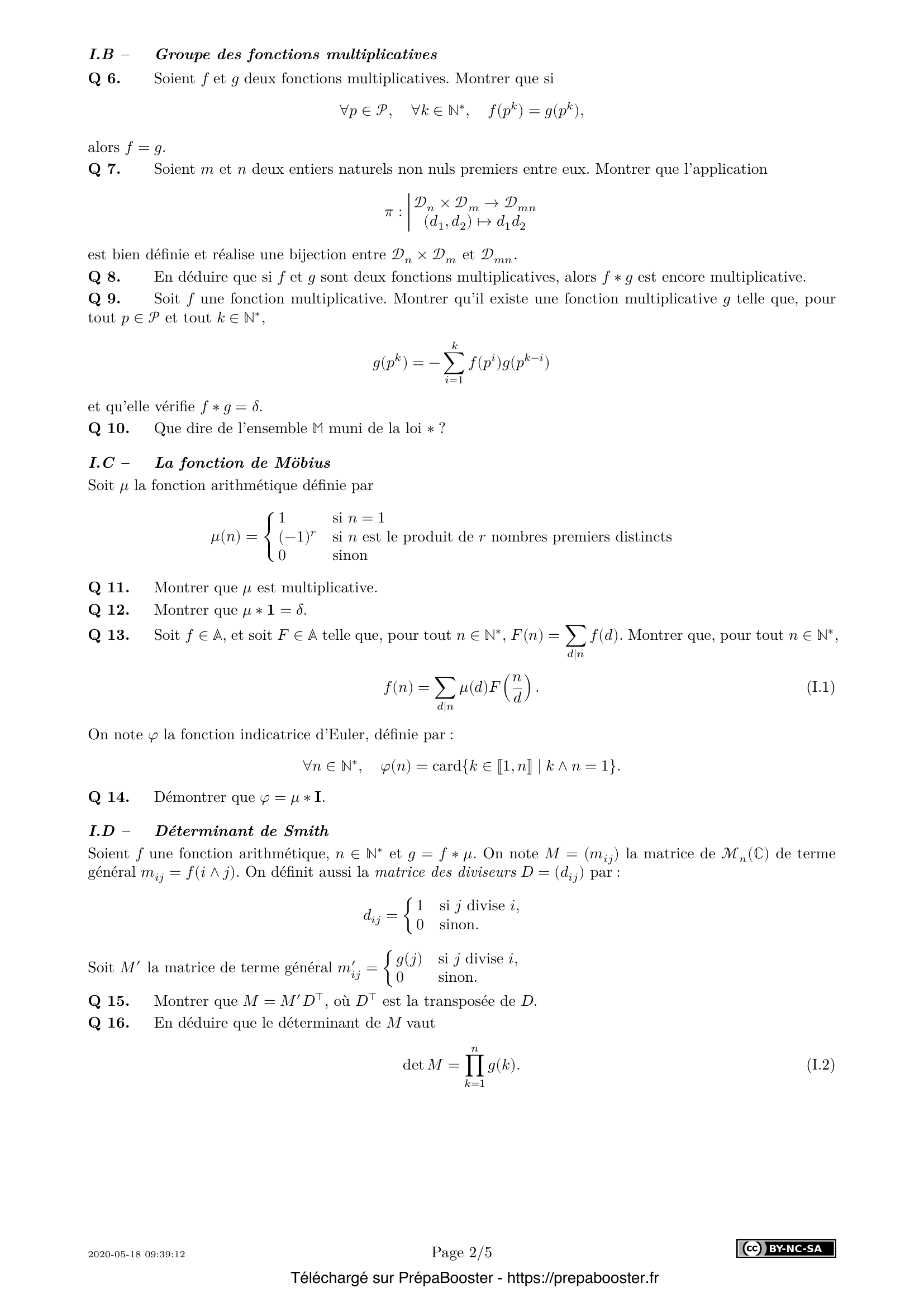 1. Vérifier que $\delta$ est un élément neutre pour la loi $\ast$. 2. Justifier que, pour tout $n \in \mathbb{N}^*$, $$(f \ast g)(n) = \sum_{(d_1,d_2)\in\mathcal{C}_n} f(d_1)g(d_2).$$ 3. En déduire que $\ast$ est commutative. 4. De même, en exploitant l’ensemble $\mathcal{C}’_n = \{(d_1, d_2, d_3) \in (\mathbb{N}^*)^3 ~|~ d_1 d_2 d_3 = n\}$, montrer que $\ast$ est associative. 5. Que peut-on dire de $(\mathcal{A}, +, \ast)$ ?} 6. Soient $f$ et $g$ deux fonctions multiplicatives. Montrer que si $$\forall p \in \mathcal{P},\ \forall k \in \mathbb{N}^*\ ,\ f(p^k) = g(p^k),$$ alors $f = g$. 7. Soient $m$ et $n$ deux entiers naturels non nuls premiers entre eux. Montrer que l’application $$\pi : \begin{cases} \mathcal{D}_n \times \mathcal{D}_m \to \mathcal{D}_{mn}\\ (d_1, d_2) \mapsto d_1 d_2 \end{cases} $$ est bien définie et réalise une bijection entre $\mathcal{D}_n \times \mathcal{D}_m$ et $\mathcal{D}_{mn}$. 8. En déduire que si $f$ et $g$ sont deux fonctions multiplicatives, alors $f \ast g$ est encore multiplicative. 9. Soit $f$ une fonction multiplicative. Montrer qu’il existe une fonction multiplicative $g$ telle que, pour tout $p \in \mathcal{P}$ et tout $k \in \mathbb{N}^*$, $$g(p^k) = – \sum_{i=1}^k f(p^i) g(p^{k-i})$$ et qu’elle vérifie $f \ast g = \delta$. 10. Que dire de l’ensemble $\mathcal{M}$ muni de la loi $\ast$ ?} 11. Montrer que $\mu$ est multiplicative. 12. Montrer que $\mu \ast \mathbf{1} = \delta$. 13. Soit $f \in \mathcal{A}$, et soit $F \in \mathcal{A}$ telle que, pour tout $n \in \mathbb{N}^*$, $F(n) = \sum_{d|n} f(d)$. Montrer que, pour tout $n \in \mathbb{N}^*$, $$f(n) = \sum_{d|n} \mu(d) F\left(\frac{n}{d}\right).$$ 14. Démontrer que $\varphi = \mu \ast I$. 15. Soient $f$ une fonction arithmétique, $n \in \mathbb{N}^*$ et $g = f \ast \mu$. On note $M = (m_{ij})$ la matrice de $\mathcal{M}_n(\mathbb{C})$ de terme général $m_{ij} = f(i \wedge j)$. On définit aussi la matrice des diviseurs $D = (d_{ij})$ par : $$d_{ij} = \begin{cases} 1 & \text{si $j$ divise $i$,} \\ 0 & \text{sinon.} \end{cases}$$ Soit $M’$ la matrice de terme général $$m’_{ij} = \begin{cases} g(j) & \text{si $j$ divise $i$,} \\ 0 & \text{sinon.} \end{cases}$$ Montrer que $M = M’ {D}^{\top}$, où $D^\top$ est la transposée de $D$.} 16. En déduire que le déterminant de $M$ vaut $$\det M = \prod_{k=1}^n g(k).$$ 17. Montrer que si $s > A_c(f)$, alors la série $\sum f(k)/k^s$ converge absolument. 18. Soient $f$ et $g$ deux fonctions arithmétiques d’abscisses de convergence finies. Montrer que si, pour tout $s > \max(A_c(f), A_c(g))$, $L_f(s) = L_g(s)$, alors $f = g$. 19. Soient $f$ et $g$ deux fonctions multiplicatives d’abscisses de convergence finies. Montrer que, pour tout $s > \max(A_c(f), A_c(g))$, $$L_{f\ast g}(s) = L_{f}(s)L_{g}(s).$$ 20. Pour toutes permutations $\rho, \rho’ \in \mathfrak{S}_n$, montrer que $P_{\rho\rho’} = P_\rho P_{\rho’}$. En déduire que, pour toutes permutations $\sigma, \tau \in \mathfrak{S}_n$, si $\sigma$ et $\tau$ sont conjuguées alors $P_\sigma$ et $P_\tau$ sont semblables.} 21. On considère, dans cette question uniquement, $n = 7$ et les cycles $\gamma_1 = (1~3~7)$ et $\gamma_2 = (2~6~4)$. On considère également une permutation $\rho \in \mathfrak{S}_7$ telle que $\rho(1) = 2$, $\rho(3) = 6$ et $\rho(7) = 4$. Vérifier que $\rho \gamma_1 \rho^{-1} = \gamma_2$. 22. Plus généralement, montrer que, dans $\mathfrak{S}_n$, deux cycles de même longueur sont conjugués. 23. Montrer que $\sigma \in \mathfrak{S}_n$ et $\tau \in \mathfrak{S}_n$ sont conjugués si et seulement si, pour tout $\ell \in \llbracket 1, n \rrbracket$, $c_\ell(\sigma) = c_\ell(\tau)$. 24. Soit $\ell \in \llbracket 2, n \rrbracket$ et soit $\gamma \in \mathfrak{S}_\ell$ un cycle de longueur $\ell$. Montrer que $\chi_\gamma(X) = X^\ell – 1.$ On pourra se ramener au cas $\gamma = (1~2~\dots~\ell)$ et considérer la matrice $$\Gamma_\ell = \begin{pmatrix} 0 & \cdots & 0 & 1 \\ 1 & 0 & \cdots & 0 \\ 0 & 1 & \ddots & 0 \\ \vdots & & \ddots & \vdots \\ 0 & \cdots & 1 & 0 \end{pmatrix} \in \mathcal{M}_\ell(\mathbb{C}).$$ 25. Montrer que si $\sigma \in \mathfrak{S}_n$, alors $$\chi_\sigma(X) = \prod_{\ell=1}^n (X^\ell – 1)^{c_\ell(\sigma)}.$$ On pourra justifier que $P_\sigma$ est semblable à une matrice diagonale par blocs dont les blocs sont des matrices de la forme $\Gamma_\ell$ $(\ell \geq 1)$, où $\Gamma_\ell$ est définie ci-dessus si $\ell \geq 2$ et où $\Gamma_\ell = (1)$ si $\ell = 1$.} 26. En raisonnant sur la multiplicité des racines de $\chi_\sigma$ et de $\chi_\tau$, montrer que si $P_\sigma$ et $P_\tau$ sont semblables, alors, pour tout $q \in \llbracket 1, n \rrbracket$, \[ \sum_{\substack{\ell=1\\ q|\ell}}^n c_\ell(\sigma) = \sum_{\substack{\ell=1\\ q|\ell}}^n c_\ell(\tau). \] (On somme sur les valeurs de $\ell$ multiples de $q$ et appartenant à $\llbracket 1, n \rrbracket$.) 27. En déduire la propriété (S). On pourra calculer $T_\sigma D$ où $T_\sigma$ est le type cyclique de $\sigma$ et $D$ est la matrice des diviseurs définie au I.D. 28. Montrer que $u$ est un endomorphisme de permutation si et seulement s’il existe une base dans laquelle sa matrice est une matrice de permutation. 29. Soit $u$ un endomorphisme de permutation de $E$. Montrer que $u$ est diagonalisable et que sa trace appartient à $\llbracket 0, n \rrbracket$. 30. Soient $A$, $B$ deux matrices diagonalisables de $\mathcal{M}_n(\mathbb{C})$. Montrer que $A$ et $B$ sont semblables si et seulement si elles ont même polynôme caractéristique.} 31. Soit $u$ un endomorphisme de $E$ tel que $u^2 = \mathrm{Id}_E$. Montrer que $u$ est un endomorphisme de permutation si et seulement si $\mathrm{Tr}(u)$ est un entier naturel. 32. Étudier si l’équivalence de la question précédente subsiste lorsqu’on remplace l’hypothèse $u^2 = \mathrm{Id}_E$ par $u^k = \mathrm{Id}_E$ pour $k=3$, puis pour $k=4$. 33. Soit $u$ un endomorphisme de $E$. Montrer que $u$ es