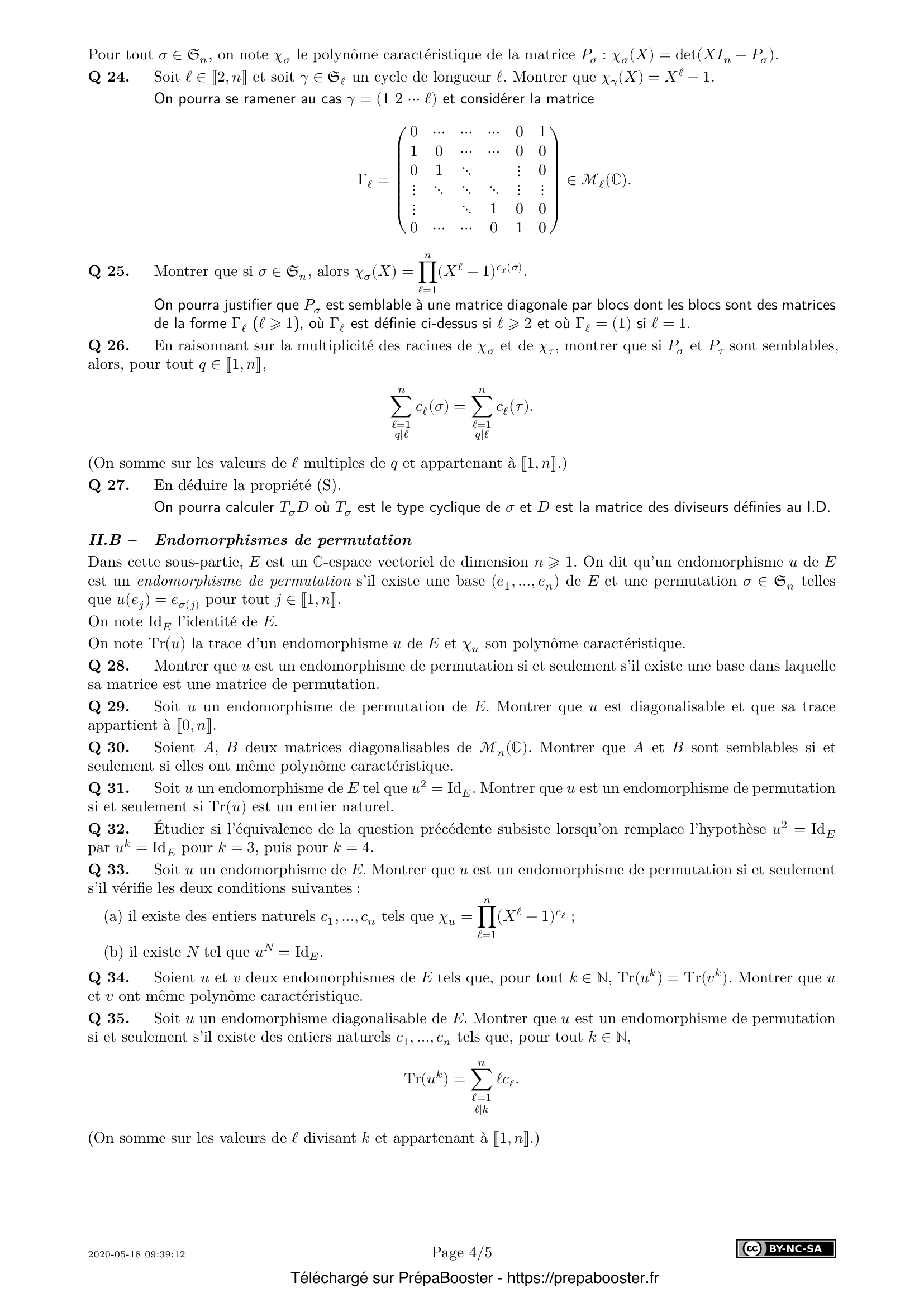 Pour traiter ces questions, il est important de bien connaître les propriétés spectrales des matrices de permutation, la façon dont leur polynôme caractéristique s’exprime à partir du type cyclique de la permutation, et comment l’étude de la diagonalisabilité ou du déterminant se traduit en termes combinatoires (cycles, conjugaison). Privilégie une analyse des blocs associés aux cycles, la correspondance entre structure arithmétique et spectrale, et tire profit des résultats structurels donnés dans ton cours de mathématiques MP.