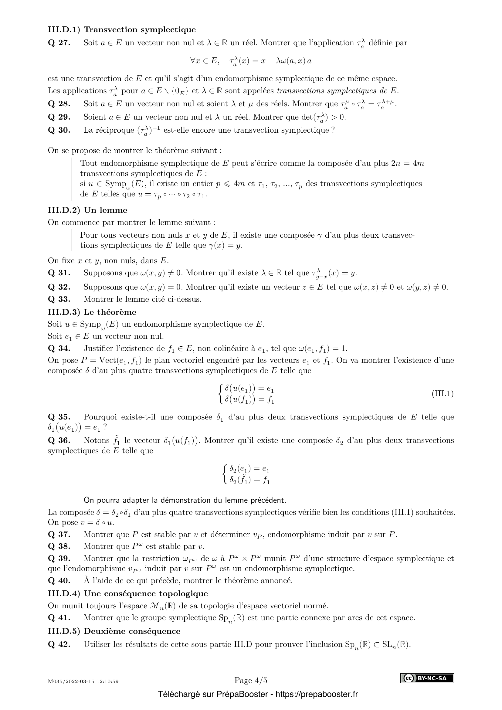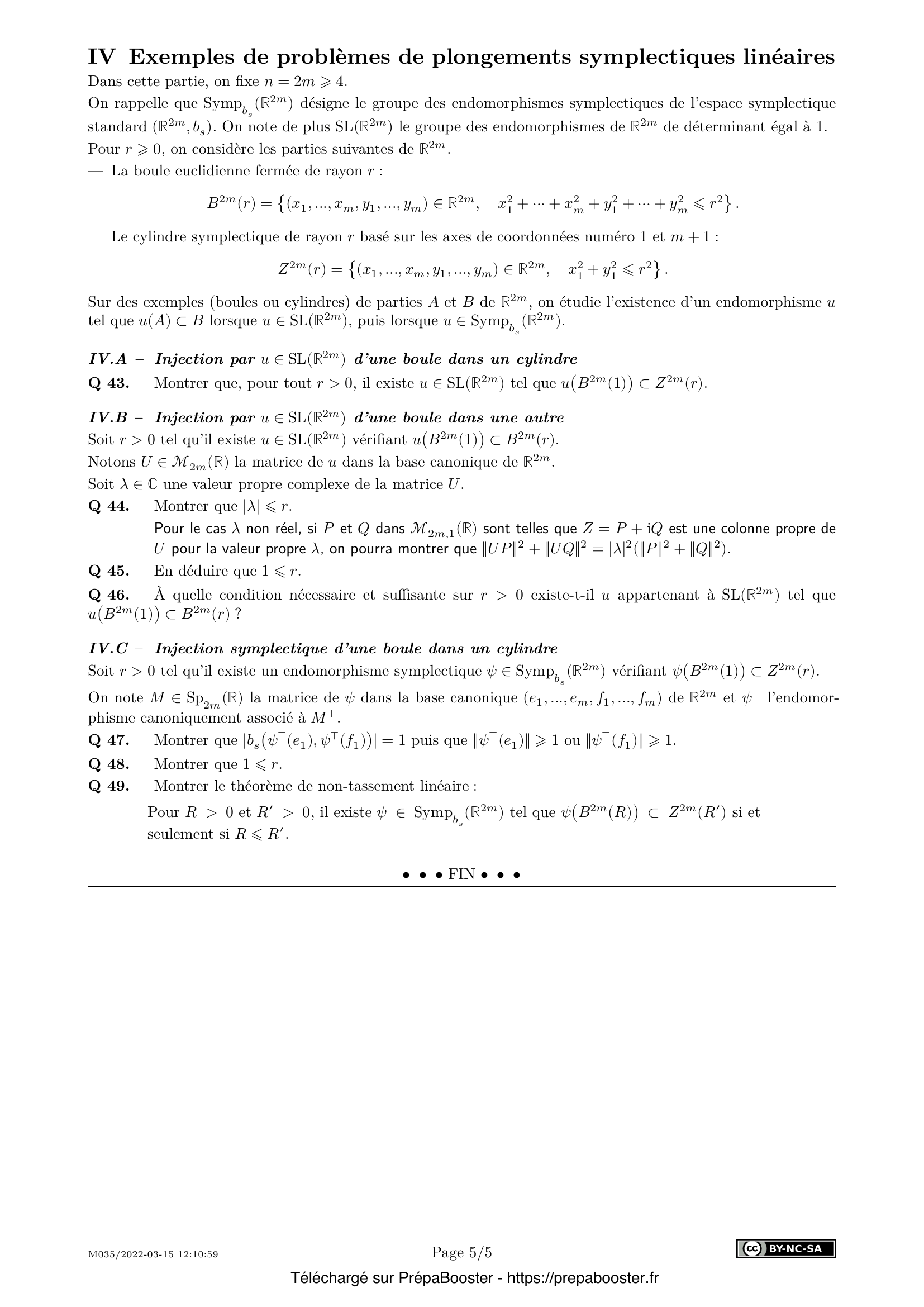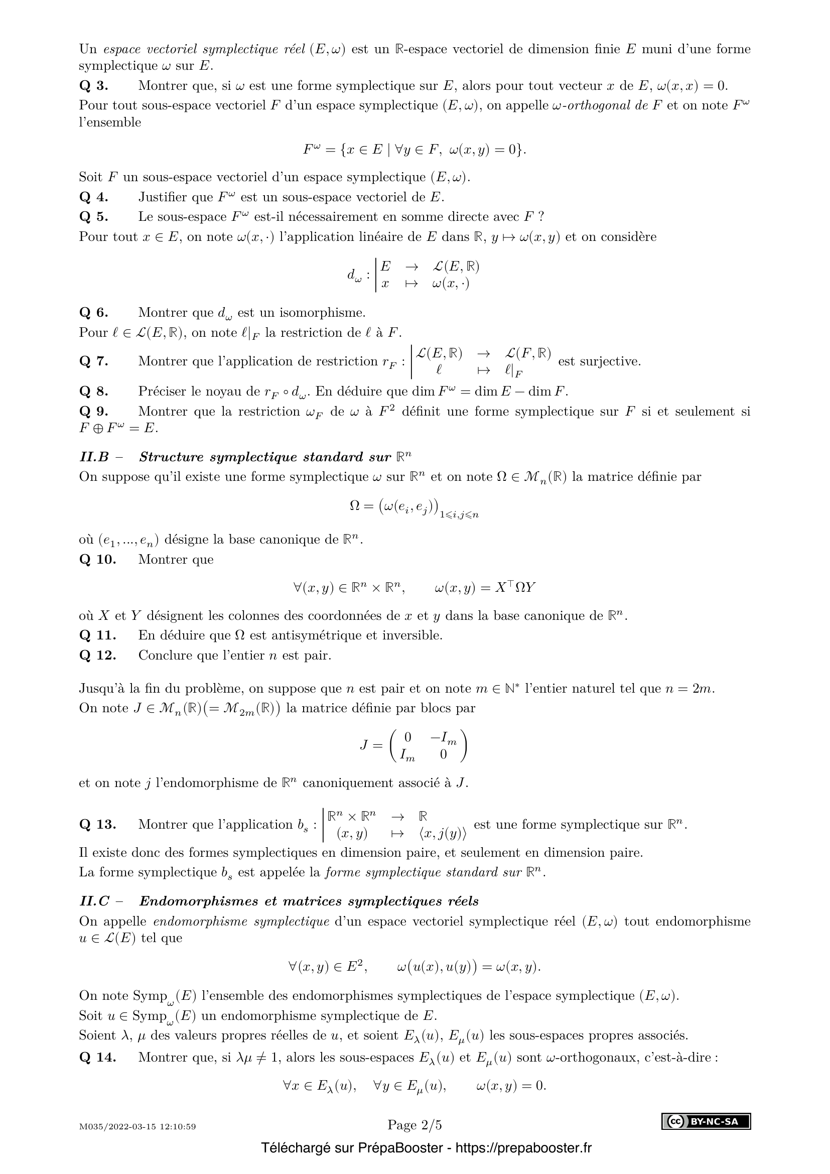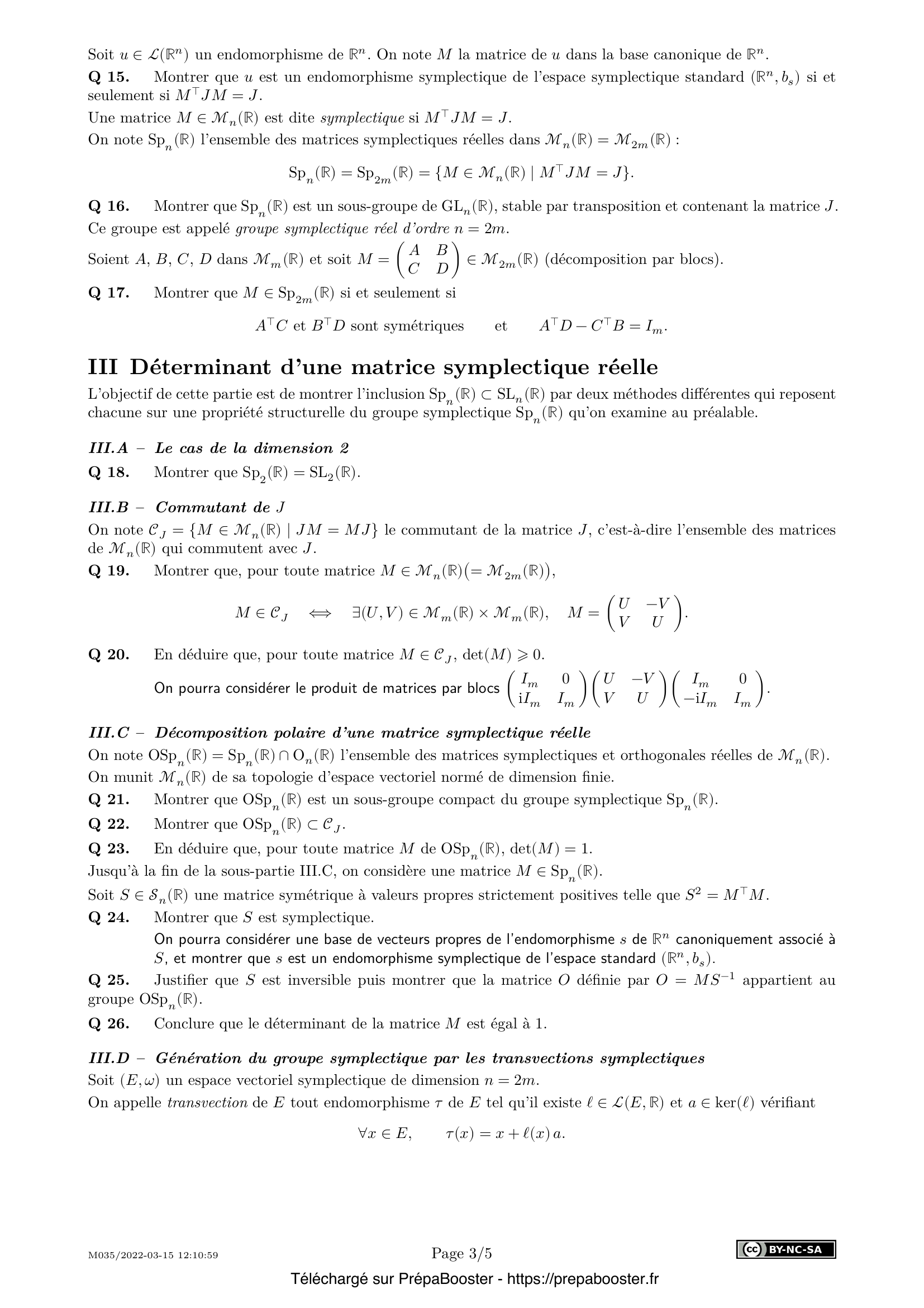 1. Soient $A$ et $B$ deux matrices de $\mathcal{M}_n(\mathbb{R})$ telles que $\forall (X, Y) \in (\mathcal{M}_{n,1}(\mathbb{R}))^2, X^\top A Y = X^\top B Y$. Montrer que $A = B$. 2. Soit $M \in \mathrm{GL}_n(\mathbb{R})$. Montrer que les valeurs propres de $M^\top M$ sont toutes strictement positives. En déduire qu’il existe une matrice $S$ symétrique à valeurs propres strictement positives telle que $S^2 = M^\top M$. 3. Montrer que, si $\omega$ est une forme symplectique sur $E$, alors pour tout vecteur $x$ de $E$, $\omega(x, x) = 0$. 4. Justifier que $F^\omega$ est un sous-espace vectoriel de $E$. 5. Le sous-espace $F^\omega$ est-il nécessairement en somme directe avec $F$~?} 6. Pour tout $x \in E$, on note $\omega(x, \cdot)$ l’application linéaire de $E$ dans $\mathbb{R}$, $y \mapsto \omega(x, y)$ et on considère $d_\omega: \; E \to \mathcal{L}(E, \mathbb{R})$, \quad $x \mapsto \omega(x, \cdot)$.\\ Montrer que $d_\omega$ est un isomorphisme. 7. Pour $\ell \in \mathcal{L}(E, \mathbb{R})$, on note $\ell|_F$ la restriction de $\ell$ à $F$. Montrer que l’application de restriction $r_F: \mathcal{L}(E, \mathbb{R}) \to \mathcal{L}(F, \mathbb{R})$, $\ell \mapsto \ell|_F$ est surjective. 8. Préciser le noyau de $r_F \circ d_\omega$. En déduire que $\dim F^\omega = \dim E – \dim F$. 9. Montrer que la restriction $\omega_F$ de $\omega$ à $F^2$ définit une forme symplectique sur $F$ si et seulement si $F \oplus F^\omega = E$. 10. Montrer que \[ \forall (x, y) \in \mathbb{R}^n \times \mathbb{R}^n,\ \omega(x, y) = X^\top \Omega Y \] où $X$ et $Y$ désignent les colonnes des coordonnées de $x$ et $y$ dans la base canonique de $\mathbb{R}^n$.} 11. En déduire que $\Omega$ est antisymétrique et inversible. 12. Conclure que l’entier $n$ est pair. 13. Montrer que l’application $b_s: \mathbb{R}^n \times \mathbb{R}^n \to \mathbb{R}$, $(x, y) \mapsto \langle x, j(y) \rangle$ est une forme symplectique sur $\mathbb{R}^n$. 14. Montrer que, si $\lambda\mu \neq 1$, alors les sous-espaces $E_\lambda(u)$ et $E_\mu(u)$ sont $\omega$-orthogonaux, c’est-à-dire : \[ \forall x \in E_\lambda(u),\ \forall y \in E_\mu(u),\;\; \omega(x, y) = 0. \] 15. Montrer que $u$ est un endomorphisme symplectique de l’espace symplectique standard $(\mathbb{R}^n, b_s)$ si et seulement si $M^\top J M = J$.} 16. Montrer que $\mathrm{Sp}_n(\mathbb{R})$ est un sous-groupe de $\mathrm{GL}_n(\mathbb{R})$, stable par transposition et contenant la matrice $J$. 17. Soient $A, B, C, D$ dans $\mathcal{M}_m(\mathbb{R})$ et soit $M = \begin{pmatrix} A & B \\ C & D \end{pmatrix} \in \mathcal{M}_{2m}(\mathbb{R})$ (décomposition par blocs). Montrer que $M \in \mathrm{Sp}_{2m}(\mathbb{R})$ si et seulement si $A^\top C$ et $B^\top D$ sont symétriques et $A^\top D – C^\top B = I_m$. 18. Montrer que $\mathrm{Sp}_2(\mathbb{R}) = \mathrm{SL}_2(\mathbb{R})$. 19. On note $\mathcal{C}_J = \{M \in \mathcal{M}_n(\mathbb{R}) \mid JM = MJ \}$ le commutant de la matrice $J$, c’est-à-dire l’ensemble des matrices de $\mathcal{M}_n(\mathbb{R})$ qui commutent avec $J$.\\ Montrer que, pour toute matrice $M \in \mathcal{M}_n(\mathbb{R})(= \mathcal{M}_{2m}(\mathbb{R}))$, \[ M \in \mathcal{C}_J \iff \exists (U, V) \in \mathcal{M}_m(\mathbb{R}) \times \mathcal{M}_m(\mathbb{R}),\ M = \begin{pmatrix} U & -V \\ V & U \end{pmatrix}. \] 20. En déduire que, pour toute matrice $M \in \mathcal{C}_J$, $\det(M) \geq 0$.\\ On pourra considérer le produit de matrices par blocs $\begin{pmatrix} I_m & 0 \\ i I_m & I_m \end{pmatrix} \begin{pmatrix} U & -V \\ V & U \end{pmatrix} \begin{pmatrix} I_m & 0 \\ -i I_m & I_m \end{pmatrix}$.} 21. Montrer que $\mathrm{OSp}_n(\mathbb{R})$ est un sous-groupe compact du groupe symplectique $\mathrm{Sp}_n(\mathbb{R})$. 22. Montrer que $\mathrm{OSp}_n(\mathbb{R}) \subset \mathcal{C}_J$. 23. En déduire que, pour toute matrice $M$ de $\mathrm{OSp}_n(\mathbb{R})$, $\det(M) = 1$. 24. Jusqu’à la fin de la sous-partie III.C, on considère une matrice $M \in \mathrm{Sp}_n(\mathbb{R})$. Soit $S \in \mathcal{S}_n(\mathbb{R})$ une matrice symétrique à valeurs propres strictement positives telle que $S^2 = M^\top M$. Montrer que $S$ est symplectique.\\ On pourra considérer une base de vecteurs propres de l’endomorphisme $s$ de $\mathbb{R}^n$ canoniquement associé à $S$, et montrer que $s$ est un endomorphisme symplectique de l’espace standard $(\mathbb{R}^n, b_s)$. 25. Justifier que $S$ est inversible puis montrer que la matrice $O$ définie par $O = MS^{-1}$ appartient au groupe $\mathrm{OSp}_n(\mathbb{R})$.} 26. Conclure que le déterminant de la matrice $M$ est égal à $1$. 27. Soit $a \in E$ un vecteur non nul et $\lambda \in \mathbb{R}$. Montrer que l’application $\tau_a^\lambda$ définie par\\ $\forall x \in E,\quad \tau_a^\lambda(x) = x + \lambda \omega(a, x)a$\\ est une transvection de $E$ et qu’il s’agit d’un endomorphisme symplectique de ce même espace.\\ Les applications $\tau_a^\lambda$ pour $a \in E \setminus \{0_E\}$ et $\lambda \in \mathbb{R}$ sont appelées transvections symplectiques de $E$. 28. Soit $a \in E$ un vecteur non nul et soient $\lambda$ et $\mu$ des réels. Montrer que $\tau_a^\mu \circ \tau_a^\lambda = \tau_a^{\lambda+\mu}$. 29. Soient $a \in E$ un vecteur non nul et $\lambda$ un réel. Montrer que $\det(\tau_a^\lambda) > 0$. 30. La réciproque $(\tau_a^\lambda)^{-1}$ est-elle encore une transvection symplectique~?} 31. On commence par montrer le lemme suivant :\\ Pour tous vecteurs non nuls $x$ et $y$ de $E$, il existe une composée $\gamma$ d’au plus deux transvections symplectiques de $E$ telle que $\gamma(x) = y$.\\ On fixe $x$ et $y$, non nuls, dans $E$.\\ Supposons que $\omega(x, y) \neq 0$. Montrer qu’il existe $\lambda \in \mathbb{R}$ tel que $\tau_{y-x}^\lambda(x) = y$. 32. Supposons que $\omega(x, y) = 0$. Montrer qu’il existe un vecteur $z \in E$ tel que $\omega(x, z) \neq 0$ et $\omega(y, z) \neq 0$. 33. Montrer le lemme cité ci-dessus. 34. Soit $u \