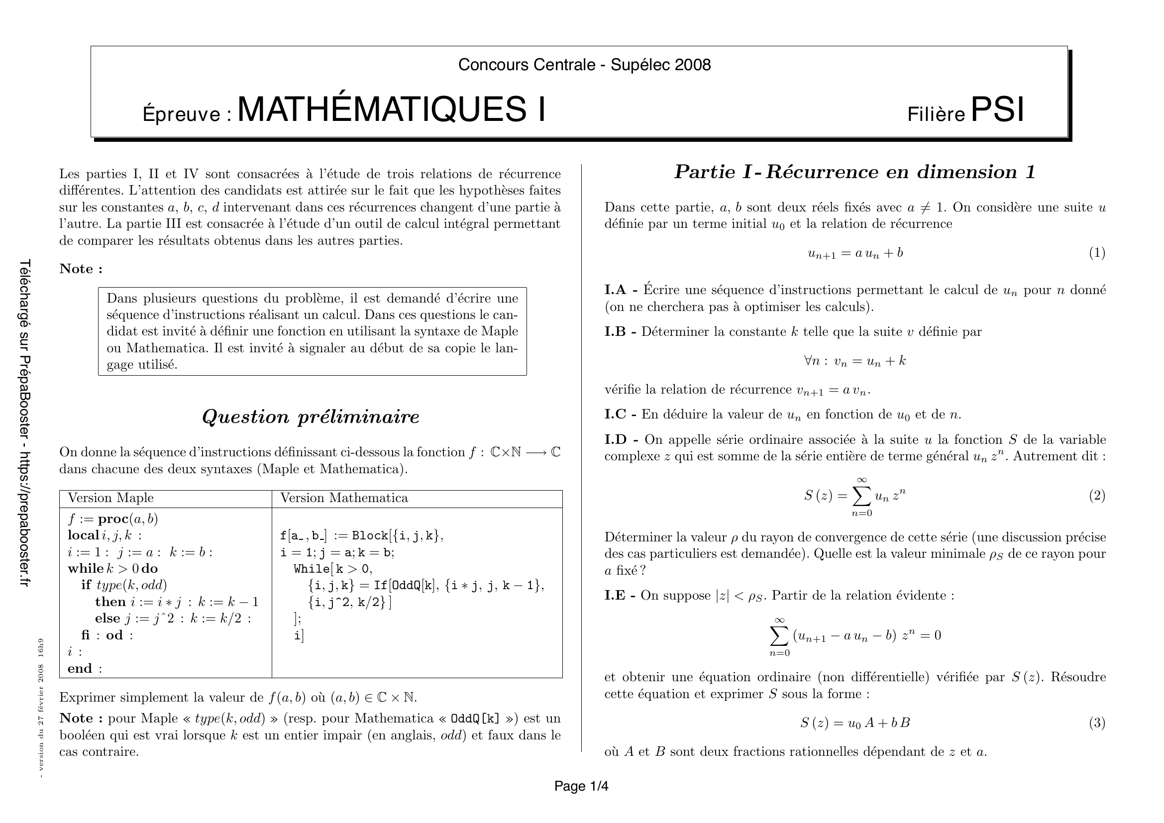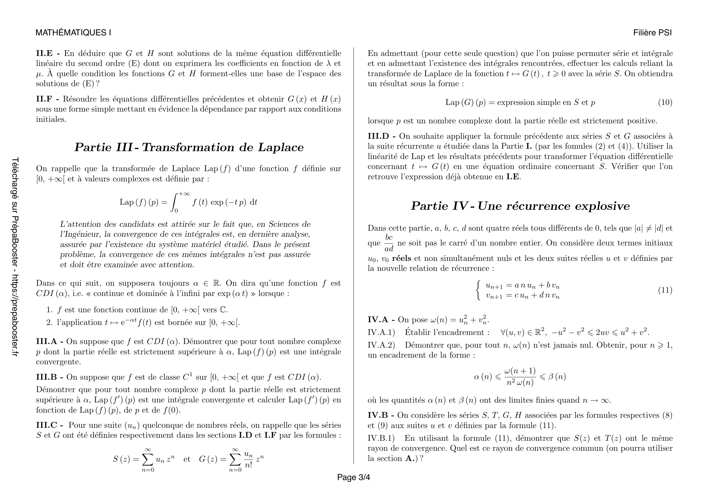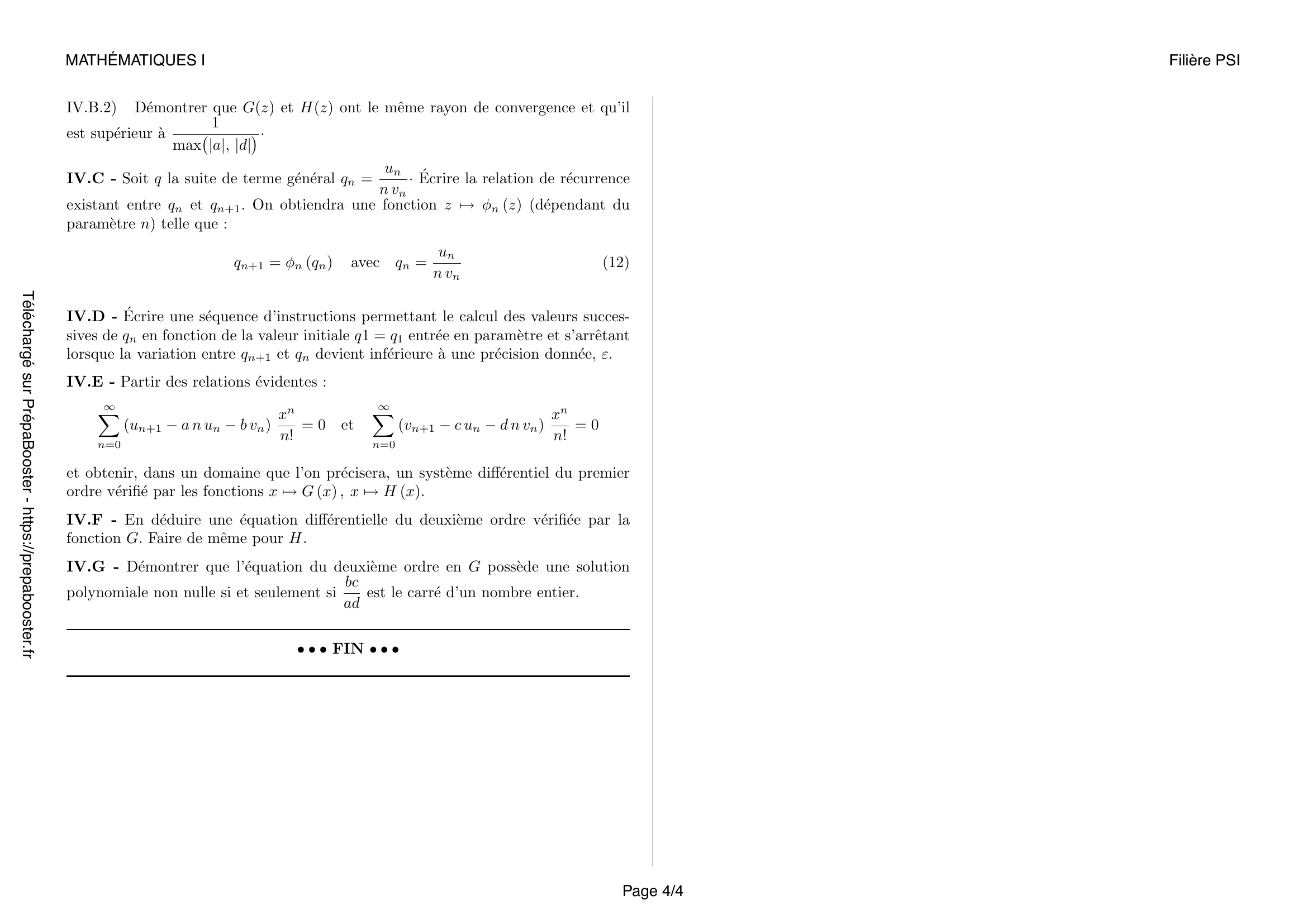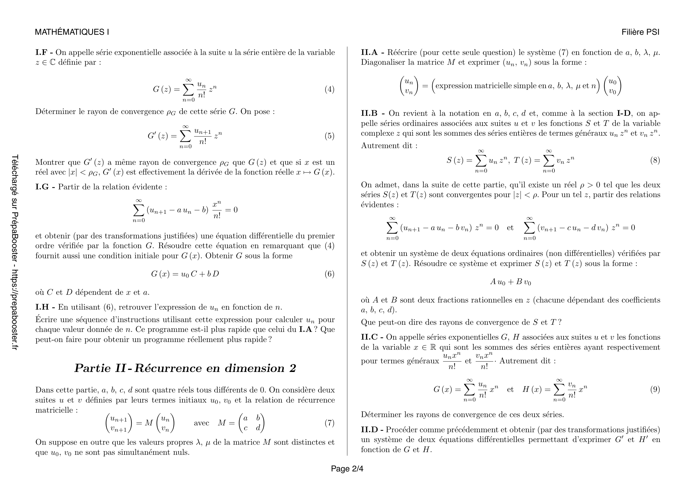 1. I.A – Écrire une séquence d’instructions permettant le calcul de $u_n$ pour $n$ donné (on ne cherchera pas à optimiser les calculs).} 2. I.B – Déterminer la constante $k$ telle que la suite $v$ définie par $\forall n : v_n = u_n + k$ vérifie la relation de récurrence $v_{n+1} = a v_n$.} 3. I.C – En déduire la valeur de $u_n$ en fonction de $u_0$ et de $n$.} 4. I.D – On appelle série ordinaire associée à la suite $u$ la fonction $S$ de la variable complexe $z$ qui est somme de la série entière de terme général $u_n z^n$. Autrement dit : \[ S(z) = \sum_{n=0}^{\infty} u_n z^n \] Déterminer la valeur $\rho$ du rayon de convergence de cette série (une discussion précise des cas particuliers est demandée). Quelle est la valeur minimale $\rho_S$ de ce rayon pour $a$ fixé ?} 5. I.E – On suppose $|z| < \rho_S$. Partir de la relation évidente : \[ \sum_{n=0}^{\infty} (u_{n+1} - a u_n - b) z^n = 0 \] et obtenir une équation ordinaire (non différentielle) vérifiée par $S(z)$. Résoudre cette équation et exprimer $S$ sous la forme : \[ S(z) = u_0 A + b B \] où $A$ et $B$ sont deux fractions rationnelles dépendant de $z$ et $a$.} 6. I.F - On appelle série exponentielle associée à la suite $u$ la série entière de la variable $z\in\mathbb{C}$ définie par : \[ G(z) = \sum_{n=0}^{\infty} \frac{u_n}{n!} z^n \] Déterminer le rayon de convergence $\rho_G$ de cette série $G$. On pose : \[ G'(z) = \sum_{n=0}^{\infty} \frac{u_{n+1}}{n!} z^n \] Montrer que $G'(z)$ a même rayon de convergence $\rho_G$ que $G(z)$ et que si $x$ est un réel avec $|x| < \rho_G$, $G'(x)$ est effectivement la dérivée de la fonction réelle $x \mapsto G(x)$.} 7. I.G - Partir de la relation évidente : \[ \sum_{n=0}^\infty (u_{n+1} - a u_n - b) \frac{x^n}{n!} = 0 \] et obtenir (par des transformations justifiées) une équation différentielle du premier ordre vérifiée par la fonction $G$. Résoudre cette équation en remarquant que (4) fournit aussi une condition initiale pour $G(x)$. Obtenir $G$ sous la forme \[ G(x) = u_0 C + b D \] où $C$ et $D$ dépendent de $x$ et $a$.} 8. I.H - En utilisant (6), retrouver l’expression de $u_n$ en fonction de $n$. Écrire une séquence d’instructions utilisant cette expression pour calculer $u_n$ pour chaque valeur donnée de $n$. Ce programme est-il plus rapide que celui du I.A ? Que peut-on faire pour obtenir un programme réellement plus rapide ?} 9. II.A - Réécrire (pour cette seule question) le système (7) en fonction de $a$, $b$, $\lambda$, $\mu$. Diagonaliser la matrice $M$ et exprimer $(u_n, v_n)$ sous la forme : \[ \begin{pmatrix} u_n \\ v_n \end{pmatrix} = (\text{expression matricielle simple en } a, b, \lambda, \mu \text{ et } n) \begin{pmatrix} u_0 \\ v_0 \end{pmatrix} \] } 10. II.B - On revient à la notation en $a, b, c, d$ et, comme à la section I-D, on appelle séries ordinaires associées aux suites $u$ et $v$ les fonctions $S$ et $T$ de la variable complexe $z$ qui sont les sommes des séries entières de termes généraux $u_n z^n$ et $v_n z^n$. Autrement dit : \[ S(z) = \sum_{n=0}^\infty u_n z^n, \qquad T(z) = \sum_{n=0}^\infty v_n z^n \] On admet, dans la suite de cette partie, qu’il existe un réel $\rho > 0$ tel que les deux séries $S(z)$ et $T(z)$ sont convergentes pour $|z| < \rho$. Pour un tel $z$, partir des relations évidentes : \[ \sum_{n=0}^\infty (u_{n+1} - a u_n - b v_n) z^n = 0 \] et \[ \sum_{n=0}^\infty (v_{n+1} - c u_n - d v_n) z^n = 0 \] et obtenir un système de deux équations ordinaires (non différentielles) vérifiées par $S(z)$ et $T(z)$. Résoudre ce système et exprimer $S(z)$ et $T(z)$ sous la forme : \[ A u_0 + B v_0 \] où $A$ et $B$ sont deux fractions rationnelles en $z$ (chacune dépendant des coefficients $a, b, c, d$). Que peut-on dire des rayons de convergence de $S$ et $T$ ?} 11. II.C - On appelle séries exponentielles $G$, $H$ associées aux suites $u$ et $v$ les fonctions de la variable $x\in\mathbb{R}$ qui sont les sommes des séries entières ayant respectivement pour termes généraux $\frac{u_n}{n!} x^n$ et $\frac{v_n}{n!} x^n$. Autrement dit : \[ G(x) = \sum_{n=0}^\infty \frac{u_n}{n!} x^n \qquad\text{et}\qquad H(x) = \sum_{n=0}^\infty \frac{v_n}{n!} x^n \] Déterminer les rayons de convergence de ces deux séries.} 12. II.D - Procéder comme précédemment et obtenir (par des transformations justifiées) un système de deux équations différentielles permettant d’exprimer $G'$ et $H'$ en fonction de $G$ et $H$.} 13. II.E - En déduire que $G$ et $H$ sont solutions de la même équation différentielle linéaire du second ordre $(E)$ dont on exprimera les coefficients en fonction de $\lambda$ et $\mu$. À quelle condition les fonctions $G$ et $H$ forment-elles une base de l’espace des solutions de $(E)$ ?} 14. II.F - Résoudre les équations différentielles précédentes et obtenir $G(x)$ et $H(x)$ sous une forme simple mettant en évidence la dépendance par rapport aux conditions initiales.} 15. III.A - On suppose que $f$ est CDI$(\alpha)$. Démontrer que pour tout nombre complexe $p$ dont la partie réelle est strictement supérieure à $\alpha$, $\operatorname{Lap}(f)(p)$ est une intégrale convergente.} 16. III.B - On suppose que $f$ est de classe $C^1$ sur $[0,+\infty[$ et que $f$ est CDI$(\alpha)$. Démontrer que pour tout nombre complexe $p$ dont la partie réelle est strictement supérieure à $\alpha$, $\operatorname{Lap}(f')(p)$ est une intégrale convergente et calculer $\operatorname{Lap}(f')(p)$ en fonction de $\operatorname{Lap}(f)(p)$, de $p$ et de $f(0)$.} 17. III.C - Pour une suite $(u_n)$ quelconque de nombres réels, on rappelle que les séries $S$ et $G$ ont été définies respectivement dans les sections I.D et I.F par les formules : $S(z) = \sum_{n=0}^\infty u_n z^n$ et $G(z) = \sum_{n=0}^\infty \frac{u_n}{n!} z^n$. En admettant (pour cette seule question) que l’on puisse permuter série et intégrale et en admettant l’existence des 