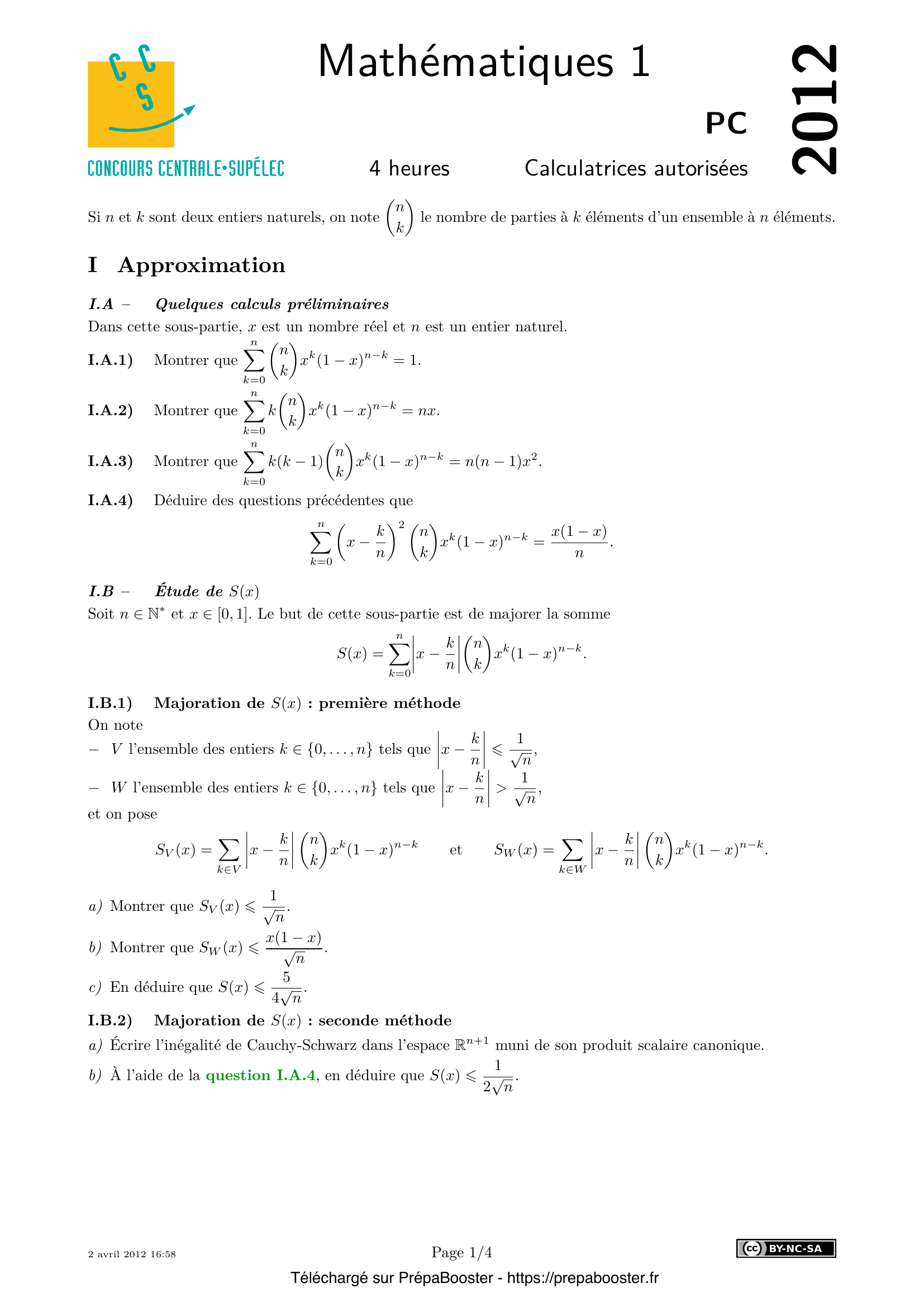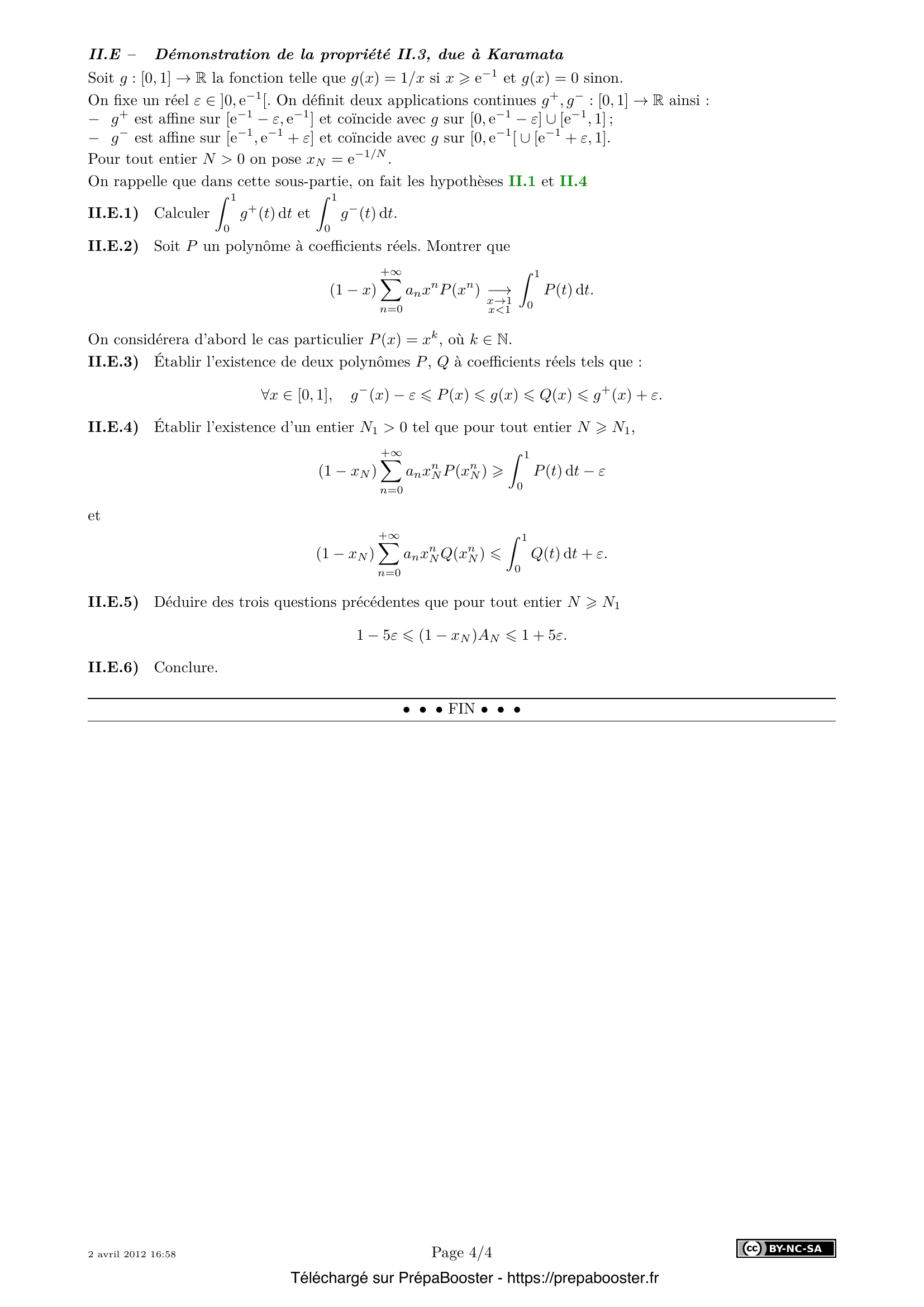 1. I.A.1) Montrer que \(\sum_{k=0}^{n} \binom{n}{k} x^k (1-x)^{n-k} = 1\). 2. I.A.2) Montrer que \(\sum_{k=0}^{n} k \binom{n}{k} x^k (1-x)^{n-k} = nx\). 3. I.A.3) Montrer que \(\sum_{k=0}^{n} k(k-1) \binom{n}{k} x^k (1-x)^{n-k} = n(n-1)x^2\). 4. I.A.4) Déduire des questions précédentes que \(\sum_{k=0}^{n} \left(x – \frac{k}{n}\right)^2 \binom{n}{k} x^k (1-x)^{n-k} = \frac{x(1-x)}{n}\). 5. I.B.1) a) Montrer que \(S_V(x) \leq \frac{1}{\sqrt{n}}\).} 6. I.B.1) b) Montrer que \(S_W(x) \leq \frac{x(1-x)}{\sqrt{n}}\). 7. I.B.1) c) En déduire que \(S(x) \leq \frac{5}{4\sqrt{n}}\). 8. I.B.2) a) Écrire l’inégalité de Cauchy-Schwarz dans l’espace \(\mathbb{R}^{n+1}\) muni de son produit scalaire canonique. 9. I.B.2) b) À l’aide de la question I.A.4, en déduire que \(S(x) \leq \frac{1}{2\sqrt{n}}\). 10. I.C.1) Si \(f(x) = x^2\) pour tout \(x \in [0, 1]\), déterminer, pour tout \(n \in \mathbb{N}^*\), le polynôme \(B_n(f)\) et en déduire la valeur de \(\|B_n(f) – f\|_\infty\).} 11. I.C.2) Soit \(f \in C\). Montrer, pour tout \(x \in [0, 1]\), la relation \[ B_n(f)(x) – f(x) = \sum_{k=0}^{n} \left(f\left(\frac{k}{n}\right) – f(x)\right) \binom{n}{k} x^k (1-x)^{n-k}. \] 12. I.C.3) a) Montrer que si \(f\) est \(\delta\)-lipschitzienne, alors \(\|B_n(f) – f\|_\infty \leq \frac{\delta}{2\sqrt{n}}\) pour tout entier \(n > 1\). 13. I.C.3) b) En déduire que si \(f\) est de classe \(C^1\), alors il existe un réel \(c\) tel que, pour tout \(n \in \mathbb{N}^*\), \(\|B_n(f) – f\|_\infty \leq \frac{c}{\sqrt{n}}\). 14. I.C.3) c) Étendre le résultat précédent au cas où \(f\) est une fonction continue, de classe \(C^1\) par morceaux. 15. I.C.4) Soit \(f : [0,1] \to \mathbb{R}\) une fonction continue, \(C^1\) par morceaux. Déduire de ce qui précède que, pour tout réel \(r > 0\), il existe un polynôme \(P\) à coefficients réels tel que \(\forall x \in [0,1],\ f(x) – r \leq P(x) \leq f(x) + r\).} 16. II.A.1) Déterminer une suite réelle \((b_n)_{n>0}\) telle que \[\forall x \in ]-1,1[,\ \frac{1}{(1-x)^2} = \sum_{n=0}^{+\infty} b_n x^n.\] 17. II.A.2) En déduire un exemple de suite \((a_n)_{n>0}\) vérifiant II.1 mais ne convergeant pas vers 1. 18. II.B.1) Donner le développement en série entière de la fonction \(t \mapsto \frac{1}{(1-t)^2}\) ainsi que son rayon de convergence. Préciser si la série converge aux bornes de l’intervalle de convergence. 19. II.B.2) On considère les fonctions \(\varphi : x \mapsto \frac{1}{(1-x^2)^2}\) et \(\psi : x \mapsto \frac{1}{(1+x)^2(1-x)}\). Déterminer des suites \((u_n)_{n\in\mathbb{N}}\) et \((v_n)_{n\in\mathbb{N}}\) telles que, pour tout \(x\in]-1,1[\), \(\varphi(x) = \sum_{n=0}^{+\infty} u_n x^n\) et \(\psi(x) = \sum_{n=0}^{+\infty} v_n x^n\). On explicitera en fonction de \(n\), suivant la parité de \(n\), les réels \(u_n\) et \(v_n\). 20. II.B.3) Calculer \(v^\star_n\) (moyenne arithmétique des nombres \(v_0,…,v_n\)).} 21. II.B.4) Construire à l’aide de \(\psi\) un exemple de suite \((a_n)_{n>0}\) vérifiant II.1 mais ne vérifiant pas la propriété II.3. 22. II.C.1) Pour tout \(x \in [0, 1[\) et tout \(n \in \mathbb{N}\), montrer que \(f(x) \geq A_n x^n\). 23. II.C.2) Montrer l’existence d’un entier \(N > 0\) tel que \(\forall n > N, f(e^{-1/n}) \leq \frac{2}{1-e^{-1/n}}\). 24. II.C.3) En déduire que la suite \((\overline{a}_n)_{n>0}\) est majorée. 25. II.D.1) a) Pour tout \(x \in ]-1,1[\), montrer que \((1-x)\sum_{k=0}^{+\infty} A_k x^k = f(x)\).} 26. II.D.1) b) En déduire que pour tout \(x \in [0,1[\) et tout \(N \in \mathbb{N}^*\), \( \frac{f(x)}{1-x} \leq \frac{A_{N-1}}{1-x} + \mu \sum_{k=N}^{+\infty} (k+1)x^k \). 27. II.D.1) c) En déduire que pour tout \(x \in [0,1[\) et tout \(N \in \mathbb{N}^*\), \( f(x) \leq A_{N-1} + \mu \left( (N+1)x^N + \frac{x^{N+1}}{1-x} \right) \). 28. II.D.2) a) Montrer qu’il existe un entier \(N_0 > 0\) tel que pour tout \(N > N_0\), \( f(e^{-\lambda/N}) \geq \frac{1}{2(1-e^{-\lambda/N})} \geq \frac{N}{2\lambda} \). 29. II.D.2) b) Montrer que pour tout \(N > N_0\), \(\overline{a}_{N-1} \geq \frac{1}{2\lambda} – \mu e^{-\lambda} \left( 1+\frac{1}{N} + \frac{e^{-\lambda/N}}{N(1-e^{-\lambda/N})} \right)\). 30. II.D.2) c) Déterminer en fonction de \(\lambda\) la limite, quand \(N\) tend vers l’infini, du membre de droite dans l’inégalité précédente.} 31. II.D.2) d) Montrer qu’il existe un réel \(\lambda > 0\) tel que cette limite soit strictement positive. 32. II.D.3) Conclure qu’il existe un réel \(\nu > 0\) tel qu’à partir d’un certain rang on ait \(\overline{a}_n > \nu\). 33. II.E.1) Calculer \(\int_0^1 g_+(t)\,dt\) et \(\int_0^1 g_-(t)\,dt\). 34. II.E.2) Soit \(P\) un polynôme à coefficients réels. Montrer que \((1-x)\sum_{n=0}^{+\infty} a_n x^n P(x_n) \xrightarrow[x\to1^{-}]{} \int_0^1 P(t)dt\). On considérera d’abord le cas particulier \(P(x) = x^k\), où \(k \in \mathbb{N}\). 35. II.E.3) Établir l’existence de deux polynômes \(P, Q\) à coefficients réels tels que : \(\forall x \in [0,1],\ g_-(x) – \varepsilon \leq P(x) \leq g(x) \leq Q(x) \leq g_+(x) + \varepsilon\).} 36. II.E.4) Établir l’existence d’un entier \(N_1 > 0\) tel que pour tout entier \(N > N_1\), \((1-x_N) \sum_{n=0}^{+\infty} a_n x_N^n P(x_N^n) \geq \int_0^1 P(t)dt – \varepsilon \) et \((1-x_N) \sum_{n=0}^{+\infty} a_n x_N^n Q(x_N^n) \leq \int_0^1 Q(t)dt + \varepsilon\). 37. II.E.5) Déduire des trois questions précédentes que pour tout entier \(N > N_1\) \(1-5\varepsilon \leq (1-x_N)A_N \leq 1+5\varepsilon\). 38. II.E.6) Conclure.}FAQ