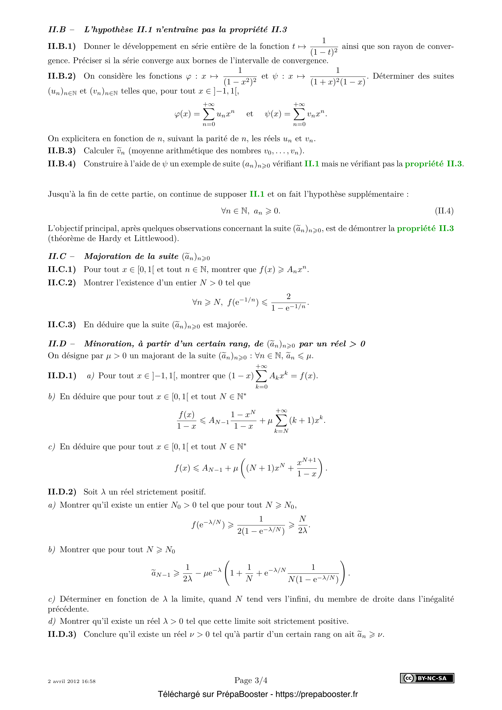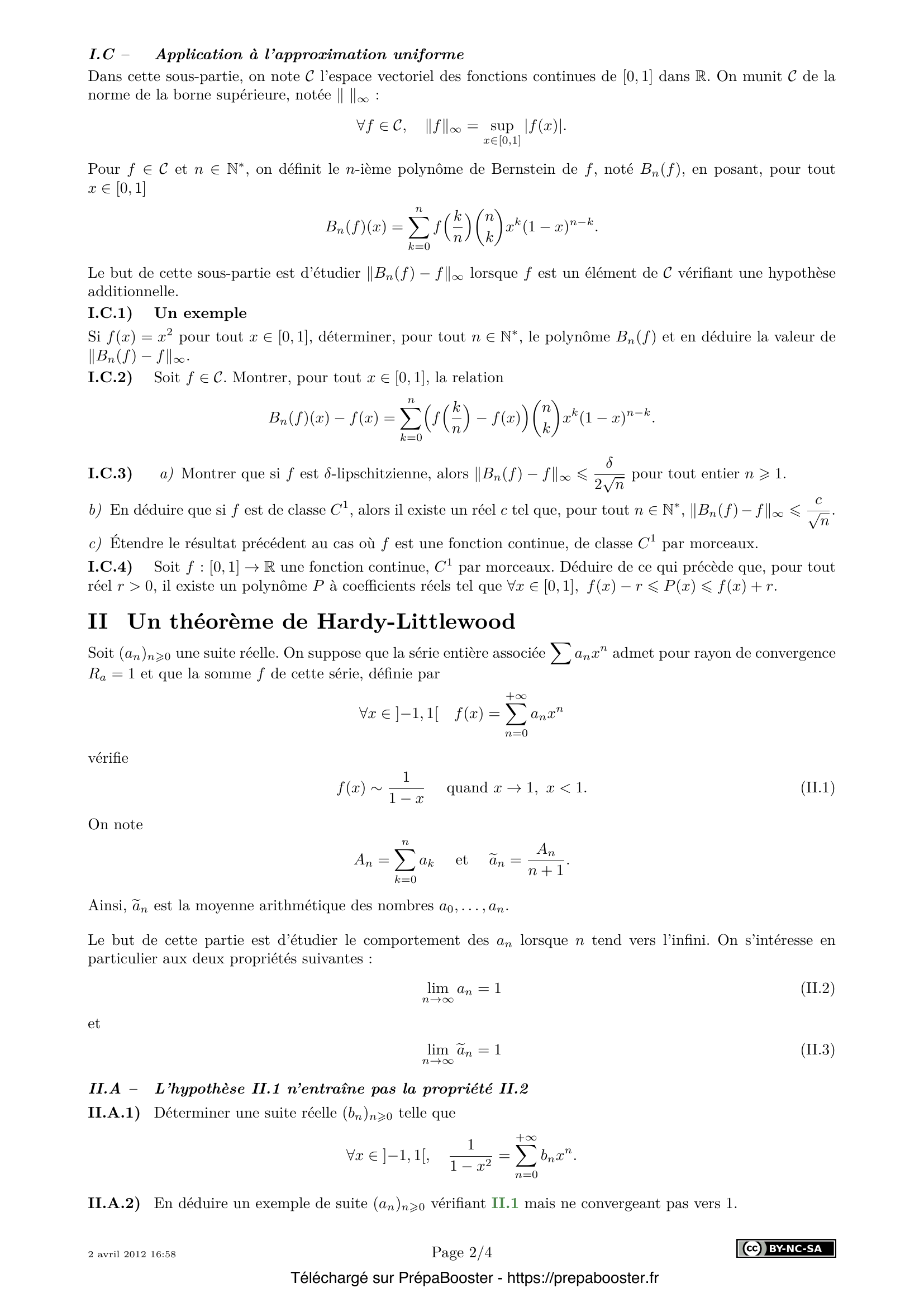 La partie I est centrée sur les polynômes de Bernstein et leurs propriétés d’approximation, tandis que la partie II traite des séries entières et de leur convergence, avec des applications à des suites spécifiques. Les deux parties illustrent des concepts clés d’analyse et d’algèbre en CPGE.