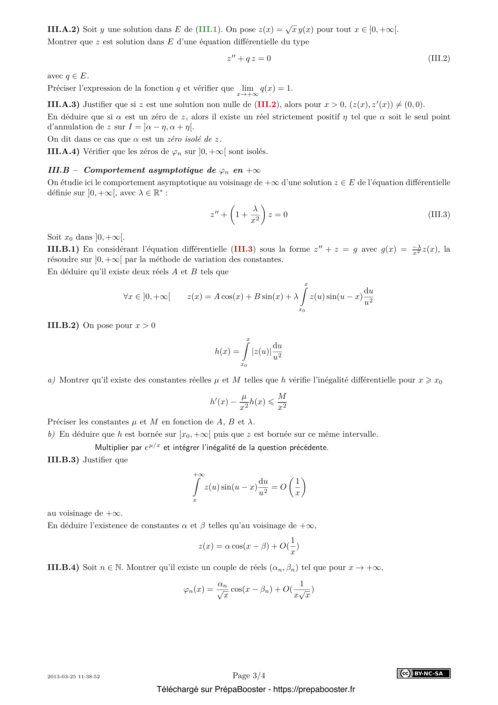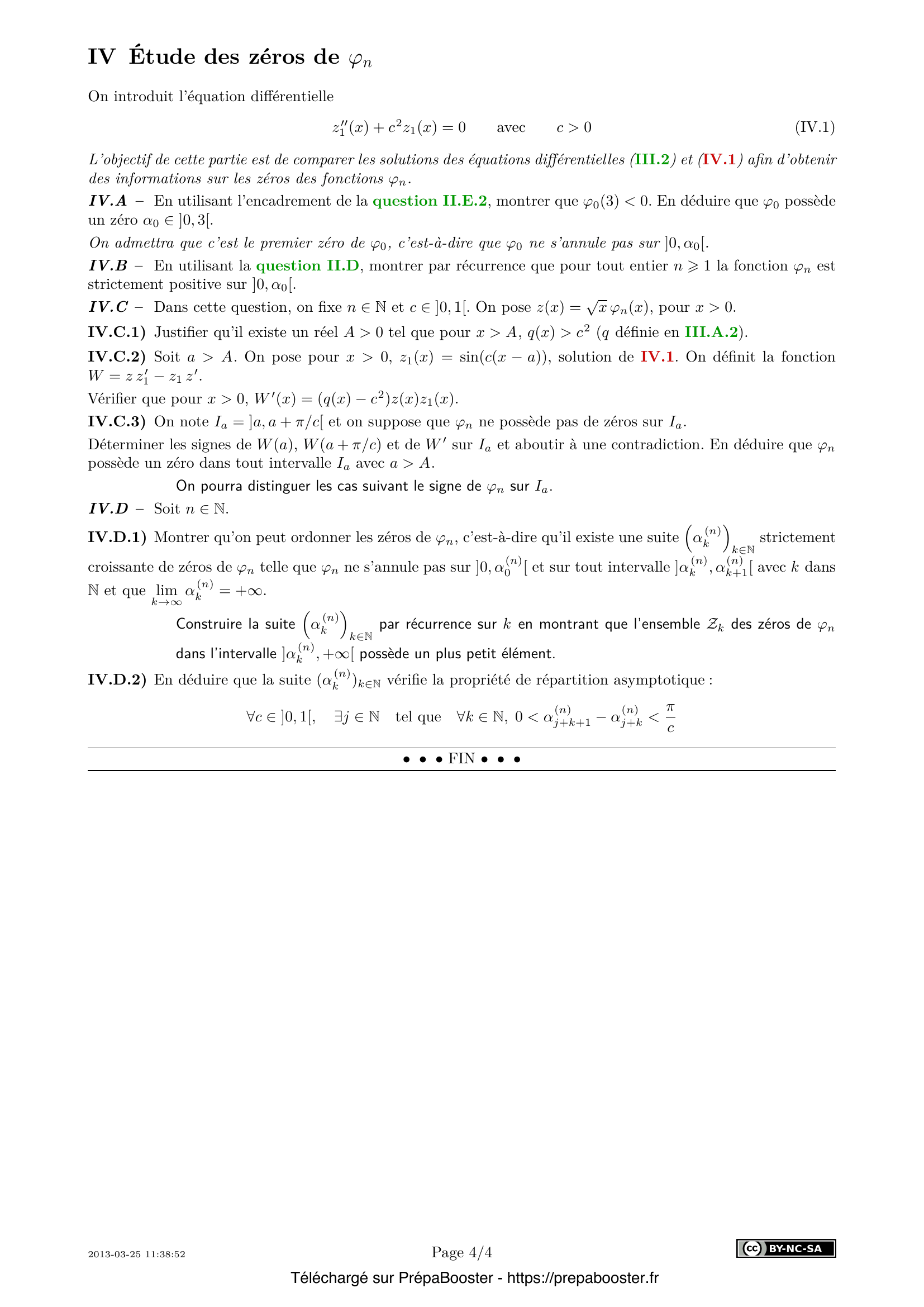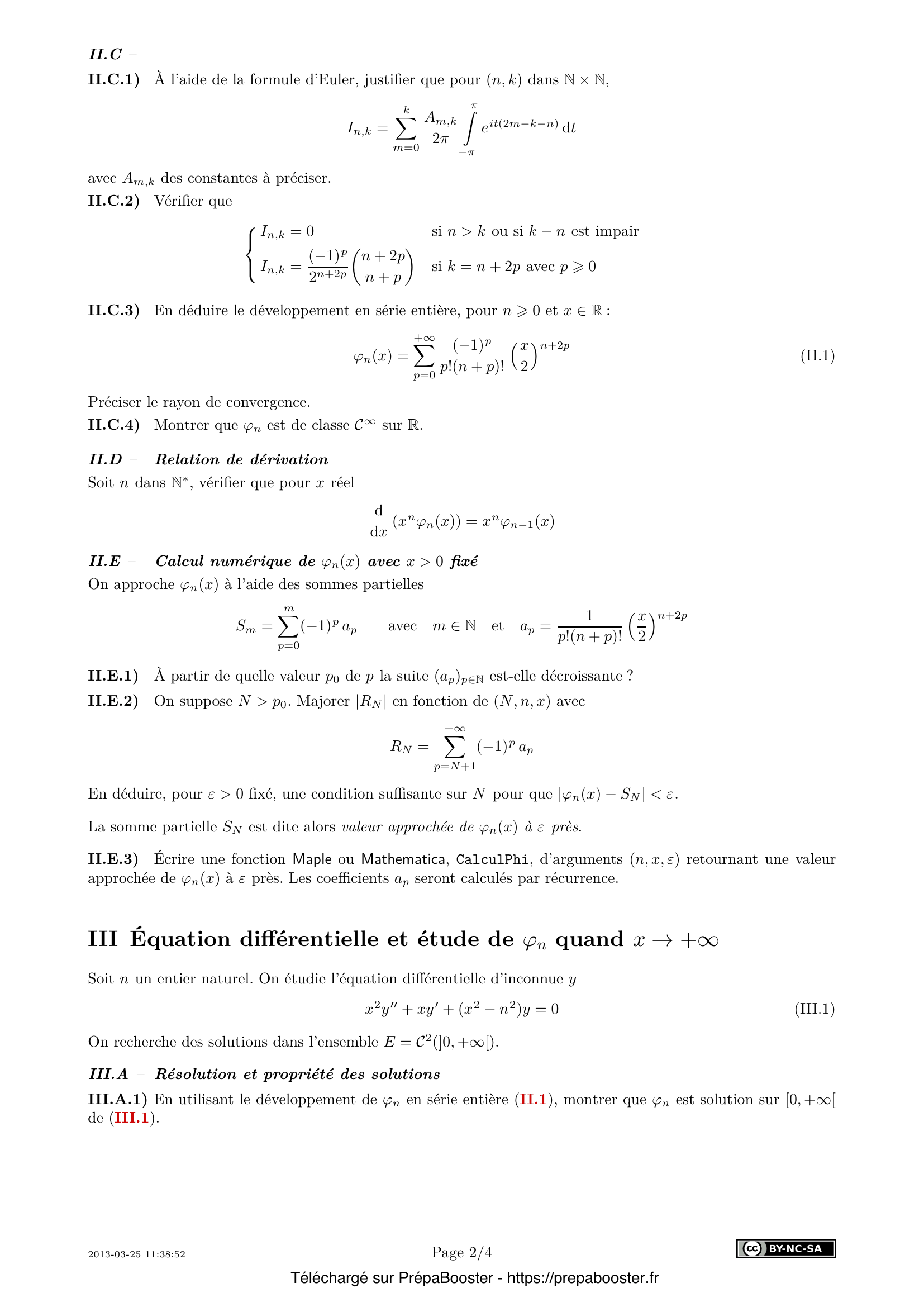 1. I.A.1) Justifier l’égalité \[ \forall t \in \mathbb{R}~ G_x(t) = e^{ix \sin t} = \sum_{n=-\infty}^{+\infty} \varphi_n(x) e^{int} \] Que peut-on dire de la convergence de la série de Fourier de $G_x$~?} 2. I.A.2) Montrer que pour tout $k$ dans $\mathbb{N}^*$, \[ |\varphi_n(x)| = o\left(\frac{1}{n^k}\right) \] lorsque $n$ tend vers $+\infty$.\\ On utilisera des séries de Fourier des dérivées successives de $G_x$.} 3. I.B — En exprimant $G_x(-t)$ en fonction de $G_x(t)$, montrer que pour $n$ dans $\mathbb{Z}$, $\varphi_n(x) \in \mathbb{R}$.} 4. I.C — Exprimer $G_x(t + \pi)$ et en déduire les égalités suivantes pour $n$ dans $\mathbb{Z}$~:\\ $\varphi_n(-x) = (-1)^n \varphi_n(x) = \varphi_{-n}(x)$\\ Que peut-on dire de la parité de $\varphi_n$ pour $n \in \mathbb{Z}$~?} 5. I.D — Calculer $\sum_{n=-\infty}^{+\infty} |\varphi_n(x)|^2$.\\ L’étude préliminaire permet de restreindre l’étude des fonctions réelles $\varphi_n$ à $\mathbb{R}_+ $ et de se limiter au cas où $n>0$.} 6. II.A — Justifier que pour $x$ réel, $|\varphi_n(x)| \leq 1$.} 7. II.B — Montrer que pour $x$ réel, \[ \varphi_n(x) = \sum_{k=0}^{+\infty} \frac{x^k}{k!} I_{n,k} \quad \text{avec} \quad I_{n,k} = \frac{1}{2\pi} \int_{-\pi}^{\pi} i^k e^{-int} (\sin t)^k dt \] } 8. II.C.1) À l’aide de la formule d’Euler, justifier que pour $(n, k) \in \mathbb{N} \times \mathbb{N}$, \[ I_{n,k} = \sum_{m=0}^{k} A_{m,k} \frac{1}{2\pi} \int_{-\pi}^{\pi} e^{it(2m – k – n)} dt \] avec $A_{m,k}$ des constantes à préciser.} 9. II.C.2) Vérifier que \[ \begin{cases} I_{n,k} = 0 & \text{si } n>k \text{ ou si } k-n \text{ est impair} \\ I_{n,k} = \displaystyle \frac{(-1)^p}{2^{n+2p}} \binom{n+2p}{n+p} & \text{si } k=n+2p \text{ avec } p>0 \end{cases} \] } 10. II.C.3) En déduire le développement en série entière, pour $n>0$ et $x \in \mathbb{R}$~: \[ \varphi_n(x) = \sum_{p=0}^{+\infty} \frac{(-1)^p}{p!(n+p)!} \left(\frac{x}{2}\right)^{n+2p} \] Préciser le rayon de convergence.} 11. II.C.4) Montrer que $\varphi_n$ est de classe $\mathcal{C}^\infty$ sur $\mathbb{R}$.} 12. II.D — Relation de dérivation\\ Soit $n$ dans $\mathbb{N}^*$, vérifier que pour $x$ réel \[ \frac{d}{dx} (x^n \varphi_n(x)) = x^n\varphi_{n-1}(x) \] } 13. II.E.1) À partir de quelle valeur $p_0$ de $p$ la suite $(a_p)_{p \in \mathbb{N}}$ est-elle décroissante~?} 14. II.E.2) On suppose $N>p_0$. Majorer $|R_N|$ en fonction de $(N, n, x)$ avec \[ R_N = \sum_{p=N+1}^{+\infty} (-1)^p a_p \] En déduire, pour $\varepsilon >0$ fixé, une condition suffisante sur $N$ pour que $|\varphi_n(x) – S_N| < \varepsilon$.\\ La somme partielle $S_N$ est dite alors valeur approchée de $\varphi_n(x)$ à $\varepsilon$ près. } 15. II.E.3) Écrire une fonction Maple ou Mathematica, CalculPhi, d’arguments $(n, x, \varepsilon)$ retournant une valeur approchée de $\varphi_n(x)$ à $\varepsilon$ près. Les coefficients $a_p$ seront calculés par récurrence.} 16. III.A.1) En utilisant le développement de $\varphi_n$ en série entière (II.1), montrer que $\varphi_n$ est solution sur $[0, +\infty[$ de (III.1). \[ x^2 y'' + x y' + (x^2 - n^2)y = 0 \] } 17. III.A.2) Soit $y$ une solution dans $E$ de (III.1). On pose $z(x) = \sqrt{x} y(x)$ pour tout $x \in ]0, +\infty[$.\\ Montrer que $z$ est solution dans $E$ d'une équation différentielle du type \[ z'' + q z = 0 \] avec $q \in E$.\\ Préciser l'expression de la fonction $q$ et vérifier que $\lim_{x \to +\infty} q(x) = 1$. } 18. III.A.3) Justifier que si $z$ est une solution non nulle de (III.2), alors pour $x>0$, $(z(x), z'(x)) \neq (0, 0)$.\\ En déduire que si $\alpha$ est un zéro de $z$, alors il existe un réel strictement positif $\eta$ tel que $\alpha$ soit le seul point d’annulation de $z$ sur $I = ]\alpha – \eta, \alpha + \eta[$.\\ On dit dans ce cas que $\alpha$ est un zéro isolé de $z$.} 19. III.A.4) Vérifier que les zéros de $\varphi_n$ sur $]0, +\infty[$ sont isolés.} 20. III.B.1) En considérant l’équation différentielle (III.3) sous la forme $z” + z = g$ avec $g(x) = -\lambda/x^2 z(x)$, la résoudre sur $]0, +\infty[$ par la méthode de variation des constantes.\\ En déduire qu’il existe deux réels $A$ et $B$ tels que \[ \forall x \in ]0, +\infty[, \qquad z(x) = A\cos(x) + B\sin(x) + \lambda \int_{x_0}^x \frac{z(u)\sin(u-x)}{u^2} du \] } 21. III.B.2) On pose pour $x > 0$ \[ h(x) = \int_{x_0}^x \frac{|z(u)|}{u^2} du \] a) Montrer qu’il existe des constantes réelles $\mu$ et $M$ telles que $h$ vérifie l’inégalité différentielle pour $x > x_0$: \[ h'(x) – \frac{\mu}{x^2} h(x) \leq \frac{M}{x^2} \] Préciser les constantes $\mu$ et $M$ en fonction de $A, B$ et $\lambda$. b) En déduire que $h$ est bornée sur $[x_0, +\infty[$ puis que $z$ est bornée sur ce même intervalle.\\ Multiplier par $e^{\mu/x}$ et intégrer l’inégalité de la question précédente. } 22. III.B.3) Justifier que \[ \int_x^{+\infty} \frac{z(u)\sin(u-x)}{u^2} du = O\left(\frac{1}{x}\right) \] au voisinage de $+\infty$.\\ En déduire l’existence de constantes $\alpha$ et $\beta$ telles qu’au voisinage de $+\infty$, \[ z(x) = \alpha \cos(x – \beta) + O\left(\frac{1}{x}\right) \] } 23. III.B.4) Soit $n \in \mathbb{N}$. Montrer qu’il existe un couple de réels $(\alpha_n, \beta_n)$ tel que, pour $x \to +\infty$, \[ \varphi_n(x) = \alpha_n \sqrt{x} \cos(x – \beta_n) + O\left(\frac{1}{x\sqrt{x}}\right) \] } 24. IV.A — En utilisant l’encadrement de la question II.E.2, montrer que $\varphi_0(3)<0$. En déduire que $\varphi_0$ possède un zéro $\alpha_0 \in ]0, 3[$.\\ On admettra que c’est le premier zéro de $\varphi_0$, c’est-à-dire que $\varphi_0$ ne s’annule pas sur $]0, \alpha_0[$. } 25. IV.B -- En utilisant la question II.D, montrer par récurrence que pour tout entier $n>1$ la fonction $\varphi_n$ est strictement positive sur $]0, \alpha_0[$.} 26. IV.C.1) Dans cette question, on fixe $n \in \mathbb{N}$ et $c \in ]0, 1[$. On pose $z(x) = \sqrt{x} \varphi_n(x)$, po