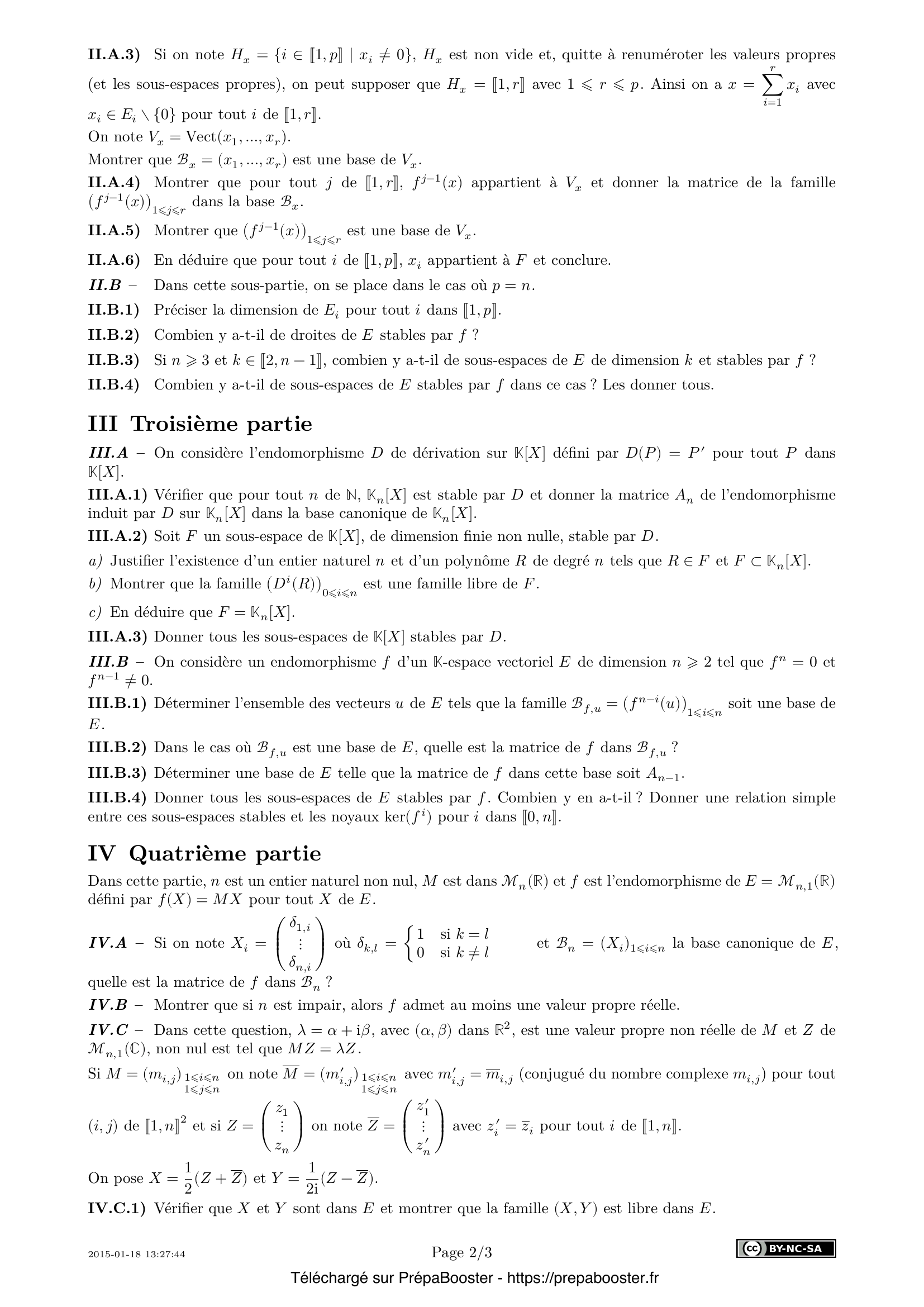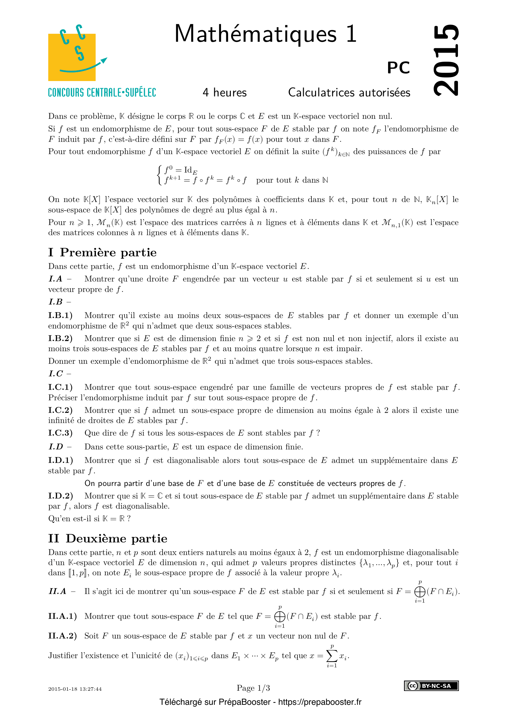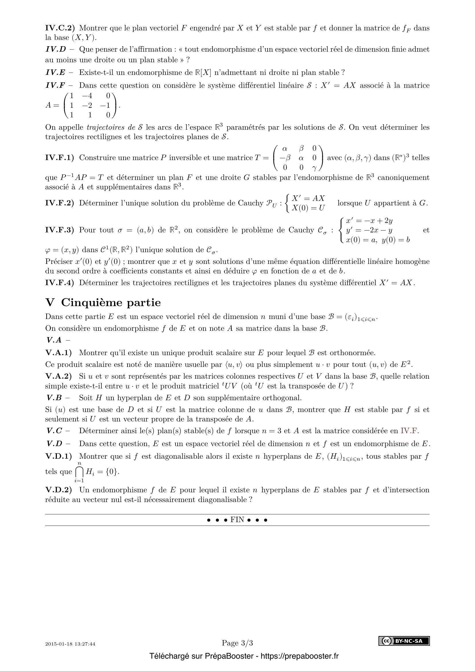 1. I.A – Montrer qu’une droite $F$ engendrée par un vecteur $u$ est stable par $f$ si et seulement si $u$ est un vecteur propre de $f$. 2. I.B.1) Montrer qu’il existe au moins deux sous-espaces de $E$ stables par $f$ et donner un exemple d’un endomorphisme de $\mathbb{R}^{2}$ qui n’admet que deux sous-espaces stables. 3. I.B.2) Montrer que si $E$ est de dimension finie $n \geq 2$ et si $f$ est non nul et non injectif, alors il existe au moins trois sous-espaces de $E$ stables par $f$ et au moins quatre lorsque $n$ est impair. Donner un exemple d’endomorphisme de $\mathbb{R}^{2}$ qui n’admet que trois sous-espaces stables. 4. I.C.1) Montrer que tout sous-espace engendré par une famille de vecteurs propres de $f$ est stable par $f$. Préciser l’endomorphisme induit par $f$ sur tout sous-espace propre de $f$. 5. I.C.2) Montrer que si $f$ admet un sous-espace propre de dimension au moins égale à $2$ alors il existe une infinité de droites de $E$ stables par $f$.} 6. I.C.3) Que dire de $f$ si tous les sous-espaces de $E$ sont stables par $f$ ? 7. I.D.1) Montrer que si $f$ est diagonalisable alors tout sous-espace de $E$ admet un supplémentaire dans $E$ stable par $f$. On pourra partir d’une base de $F$ et d’une base de $E$ constituée de vecteurs propres de $f$. 8. I.D.2) Montrer que si $\mathbb{K} = \mathbb{C}$ et si tout sous-espace de $E$ stable par $f$ admet un supplémentaire dans $E$ stable par $f$, alors $f$ est diagonalisable. Qu’en est-il si $\mathbb{K} = \mathbb{R}$~? 9. II.A.1) Montrer que tout sous-espace $F$ de $E$ tel que $F = \bigoplus_{i=1}^p (F \cap E_i)$ est stable par $f$. 10. II.A.2) Soit $F$ un sous-espace de $E$ stable par $f$ et $x$ un vecteur non nul de $F$. Justifier l’existence et l’unicité de $(x_i)_{1 \leq i \leq p}$ dans $E_1 \times \cdots \times E_p$ tel que $x = \sum_{i=1}^{p} x_i$.} 11. II.A.3) Si on note $H_x = \{ i \in [[1, p]] ~|~ x_i \neq 0 \}$, $H_x$ est non vide et, quitte à renuméroter les valeurs propres (et les sous-espaces propres), on peut supposer que $H_x = [[1, r]]$ avec $1 \leq r \leq p$. Ainsi on a $x = \sum_{i=1}^r x_i$ avec $x_i \in E_i \setminus \{0\}$ pour tout $i$ de $[[1, r]]$. On note $V_x = \text{Vect}(x_1, \ldots, x_r)$. Montrer que $\mathcal{B}_x = (x_1, \ldots, x_r)$ est une base de $V_x$. 12. II.A.4) Montrer que pour tout $j$ de $[[1, r]]$, $f^{j-1}(x)$ appartient à $V_x$ et donner la matrice de la famille $(f^{j-1}(x))_{1\leq j \leq r}$ dans la base $\mathcal{B}_x$. 13. II.A.5) Montrer que $(f^{j-1}(x))_{1\leq j\leq r}$ est une base de $V_x$. 14. II.A.6) En déduire que pour tout $i$ de $[[1, p]]$, $x_i$ appartient à $F$ et conclure. 15. II.B.1) Préciser la dimension de $E_i$ pour tout $i$ dans $[[1, p]]$.} 16. II.B.2) Combien y a-t-il de droites de $E$ stables par $f$ ? 17. II.B.3) Si $n \geq 3$ et $k \in [[2, n-1]]$, combien y a-t-il de sous-espaces de $E$ de dimension $k$ et stables par $f$ ? 18. II.B.4) Combien y a-t-il de sous-espaces de $E$ stables par $f$ dans ce cas ? Les donner tous. 19. III.A.1) Vérifier que pour tout $n$ de $\mathbb{N}$, $\mathbb{K}_n[X]$ est stable par $D$ et donner la matrice $A_n$ de l’endomorphisme induit par $D$ sur $\mathbb{K}_n[X]$ dans la base canonique de $\mathbb{K}_n[X]$. 20. III.A.2) Soit $F$ un sous-espace de $\mathbb{K}[X]$, de dimension finie non nulle, stable par $D$. \begin{itemize} \item[a)] Justifier l’existence d’un entier naturel $n$ et d’un polynôme $R$ de degré $n$ tels que $R \in F$ et $F \subset \mathbb{K}_n[X]$. \item[b)] Montrer que la famille $(D^k(R))_{0 \leq k \leq n}$ est une famille libre de $F$. \item[c)] En déduire que $F = \mathbb{K}_n[X]$. \end{itemize}} 21. III.A.3) Donner tous les sous-espaces de $\mathbb{K}[X]$ stables par $D$. 22. III.B.1) Déterminer l’ensemble des vecteurs $u$ de $E$ tels que la famille $\mathcal{B}_{u,n} = (f^{n-k}(u))_{1\leq k \leq n}$ soit une base de $E$. 23. III.B.2) Dans le cas où $\mathcal{B}_{u,n}$ est une base de $E$, quelle est la matrice de $f$ dans $\mathcal{B}_{u,n}$~? 24. III.B.3) Déterminer une base de $E$ telle que la matrice de $f$ dans cette base soit $A_{n-1}$. 25. III.B.4) Donner tous les sous-espaces de $E$ stables par $f$. Combien y en a-t-il ? Donner une relation simple entre ces sous-espaces stables et les noyaux $\ker(f^i)$ pour $i$ dans $[[0, n]]$.} 26. IV.A – Si on note $X_k = \begin{pmatrix} \delta_{1,k} \\ \vdots \\ \delta_{n,k} \end{pmatrix}$ où $\delta_{i,k} = \begin{cases} 1 & \text{si } i = k \\ 0 & \text{si } i \neq k \end{cases}$ et $\mathcal{B}_n = (X_1, \ldots, X_n)$ la base canonique de $E$, quelle est la matrice de $f$ dans $\mathcal{B}_n$~? 27. IV.B – Montrer que si $n$ est impair, alors $f$ admet au moins une valeur propre réelle. 28. IV.C.1) Vérifier que $X$ et $Y$ sont dans $E$ et montrer que la famille $(X, Y)$ est libre dans $E$. 29. IV.C.2) Montrer que le plan vectoriel $F$ engendré par $X$ et $Y$ est stable par $f$ et donner la matrice de $f_F$ dans la base $(X, Y)$. 30. IV.D – Que penser de l’affirmation : « tout endomorphisme d’un espace vectoriel réel de dimension finie admet au moins une droite ou un plan stable » ?} 31. IV.E – Existe-t-il un endomorphisme de $\mathbb{R}[X]$ n’admettant ni droite ni plan stable ? 32. IV.F.1) Construire une matrice $P$ inversible et une matrice $T = \begin{pmatrix} \alpha & \beta & 0 \\ -\beta & \alpha & 0 \\ 0 & 0 & \gamma \end{pmatrix}$ avec $(\alpha, \beta, \gamma) \in (\mathbb{R}^*)^{3}$ telles que $P^{-1}AP = T$ et déterminer un plan $F$ et une droite $G$ stables par l’endomorphisme de $\mathbb{R}^3$ canoniquement associé à $A$ et supplémentaires dans $\mathbb{R}^3$. 33. IV.F.2) Déterminer l’unique solution du problème de Cauchy $\mathcal{P}_U : \begin{cases} X’ = AX \\ X(0) = U \end{cases}$ lorsque $U$ appartient à $G$. 34. IV.F.3) Pour tout $\sigma = (a, b) \in \mathbb{R}^2$, on considère le problème de Cauchy $\mathcal{C}_\sigma$~: \[ \begin{cases} x’ = -x + 2y \\ y