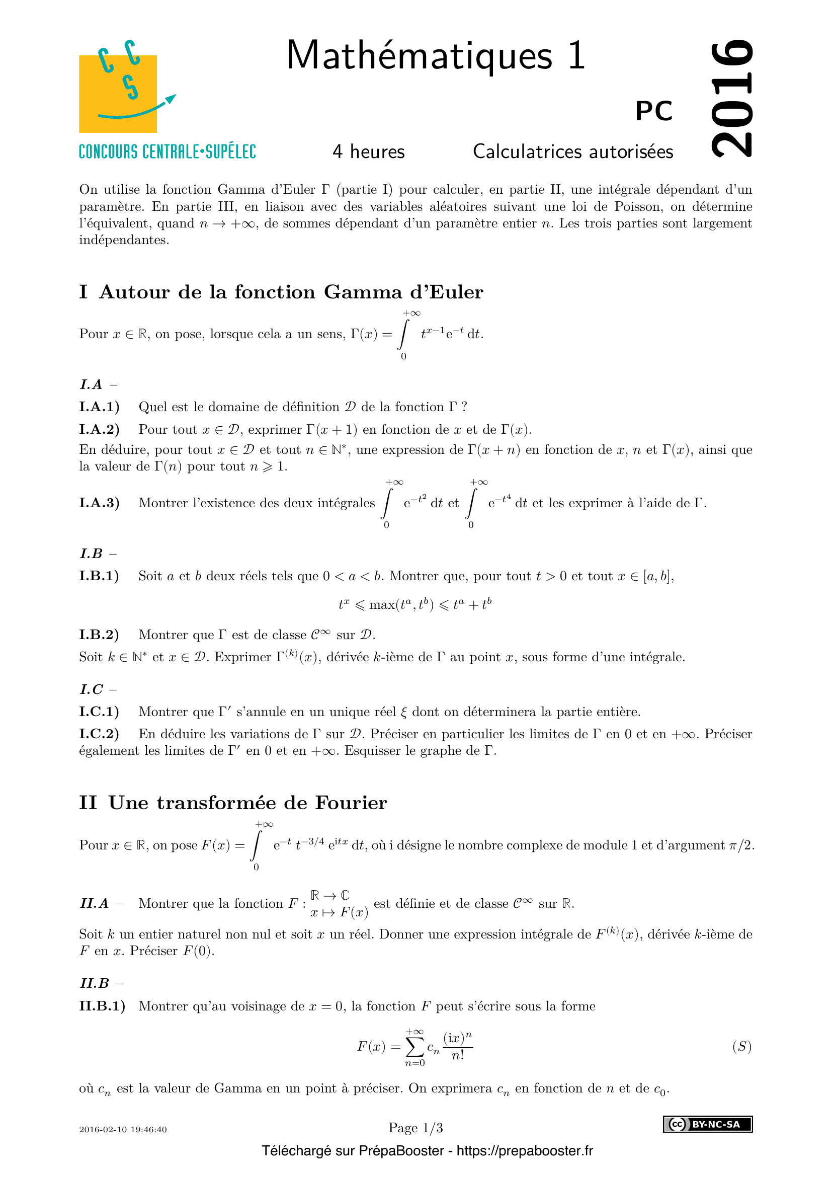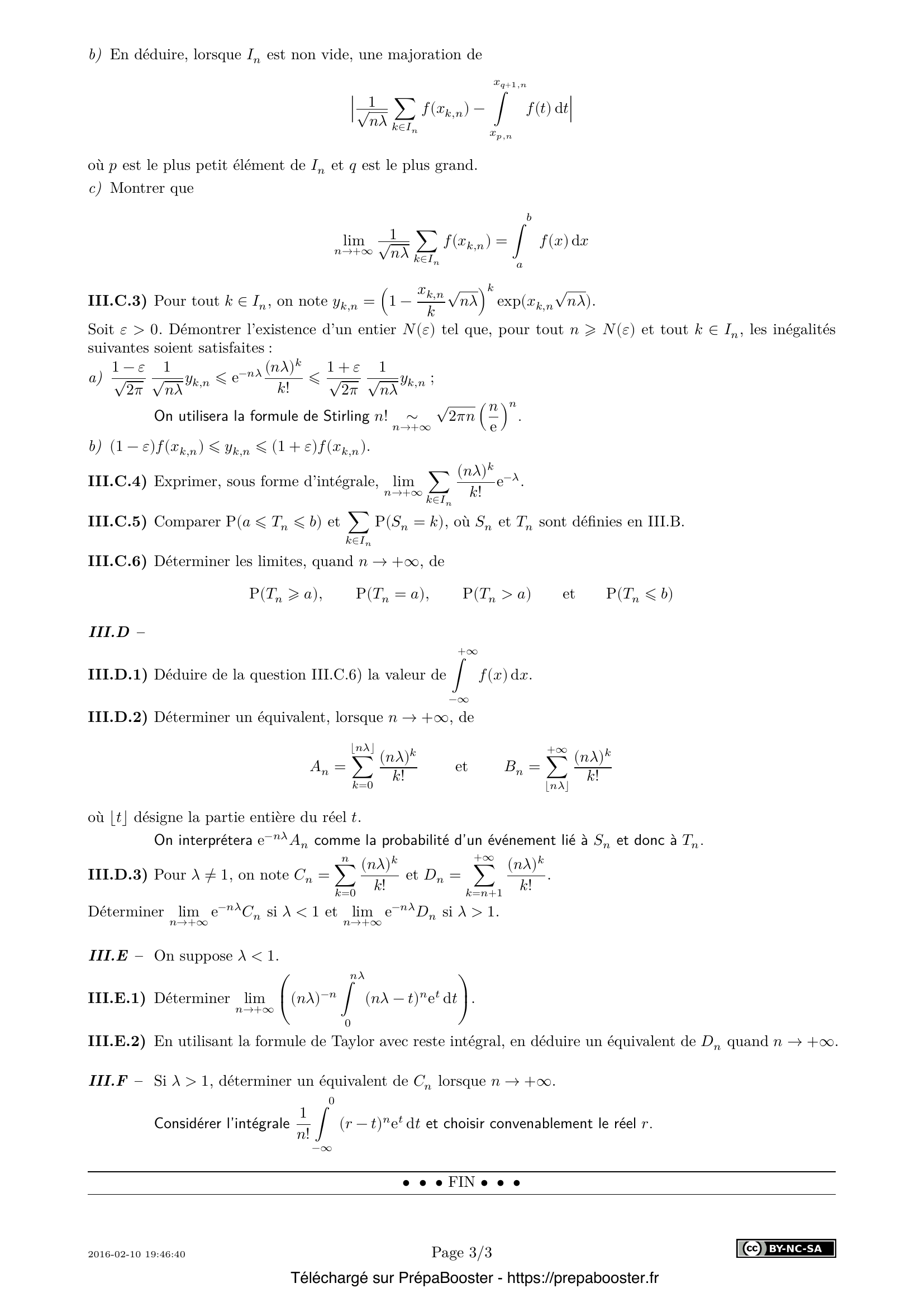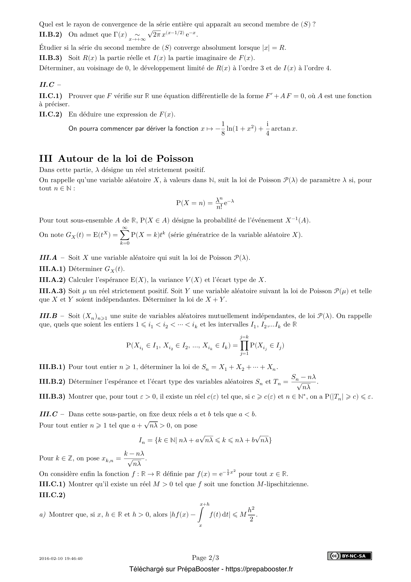 1. I.A.1) Quel est le domaine de définition $\mathcal{D}$ de la fonction $\Gamma$~? 2. I.A.2) Pour tout $x \in \mathcal{D}$, exprimer $\Gamma(x + 1)$ en fonction de $x$ et de $\Gamma(x)$.\\ En déduire, pour tout $x \in \mathcal{D}$ et tout $n \in \mathbb{N}^*$, une expression de $\Gamma(x + n)$ en fonction de $x$, $n$ et $\Gamma(x)$, ainsi que la valeur de $\Gamma(n)$ pour tout $n \geq 1$. 3. I.A.3) Montrer l’existence des deux intégrales \[ \int_{0}^{+\infty} e^{-t^2} dt \quad \text{et} \quad \int_{0}^{+\infty} e^{-t^4}dt \] et les exprimer à l’aide de $\Gamma$.} 4. I.B.1) Soient $a$ et $b$ deux réels tels que $0 < a < b.$ Montrer que, pour tout $t > 0$ et tout $x \in [a, b]$, \[ t^a \leq \max(t^a, t^b) \leq t^a + t^b \] 5. I.B.2) Montrer que $\Gamma$ est de classe $\mathcal{C}^{\infty}$ sur $\mathcal{D}$.\\ Soit $k \in \mathbb{N}^*$ et $x \in \mathcal{D}$. Exprimer $\Gamma^{(k)}(x)$, dérivée $k$-ième de $\Gamma$ au point $x$, sous forme d’une intégrale.} 6. I.C.1) Montrer que $\Gamma’$ s’annule en un unique réel $\xi$ dont on déterminera la partie entière. 7. I.C.2) En déduire les variations de $\Gamma$ sur $\mathcal{D}$. Préciser en particulier les limites de $\Gamma$ en $0$ et en $+\infty$. Préciser également les limites de $\Gamma’$ en $0$ et en $+\infty$. Esquisser le graphe de $\Gamma$. 8. II.A – Montrer que la fonction $F : \mathbb{R} \to \mathbb{C},~ x \mapsto F(x)$ est définie et de classe $\mathcal{C}^{\infty}$ sur $\mathbb{R}$.\\ Soit $k$ un entier naturel non nul et soit $x$ un réel. Donner une expression intégrale de $F^{(k)}(x)$, dérivée $k$-ième de $F$ en $x$. Préciser $F(0)$. 9. II.B.1) Montrer qu’au voisinage de $x = 0$, la fonction $F$ peut s’écrire sous la forme \[ F(x) = \sum_{n=0}^{+\infty} \frac{c_n (ix)^n}{n!} \tag{S} \] où $c_n$ est la valeur de Gamma en un point à préciser. On exprimera $c_n$ en fonction de $n$ et de $c_0$.\\ Quel est le rayon de convergence de la série entière qui apparaît au second membre de $(S)$~? 10. II.B.2) On admet que $\Gamma(x) \sim_{x\to+\infty} \sqrt{2\pi}\; x^{x-1/2}e^{-x}$.\\ Étudier si la série du second membre de $(S)$ converge absolument lorsque $|x| = R$.} 11. II.B.3) Soit $R(x)$ la partie réelle et $I(x)$ la partie imaginaire de $F(x)$.\\ Déterminer, au voisinage de $0$, le développement limité de $R(x)$ à l’ordre~3 et de $I(x)$ à l’ordre~4. 12. II.C.1) Prouver que $F$ vérifie sur $\mathbb{R}$ une équation différentielle de la forme $F’ + A F = 0$, où $A$ est une fonction à préciser. 13. II.C.2) En déduire une expression de $F(x)$.\\ On pourra commencer par dériver la fonction $x \mapsto -\frac{1}{8} \ln(1 + x^2) + i\frac{1}{4}\arctan x$. 14. III.A.1) Déterminer $G_X(t)$. 15. III.A.2) Calculer l’espérance $E(X)$, la variance $V(X)$ et l’écart type de $X$.} 16. III.A.3) Soit $\mu$ un réel strictement positif. Soit $Y$ une variable aléatoire suivant la loi de Poisson $\mathcal{P}(\mu)$ et telle que $X$ et $Y$ soient indépendantes. Déterminer la loi de $X + Y$. 17. III.B.1) Pour tout entier $n \geq 1$, déterminer la loi de $S_n = X_1 + X_2 + \cdots + X_n$. 18. III.B.2) Déterminer l’espérance et l’écart type des variables aléatoires $S_n$ et $T_n = \dfrac{S_n-n\lambda}{\sqrt{n\lambda}}$. 19. III.B.3) Montrer que, pour tout $\varepsilon > 0$, il existe un réel $c(\varepsilon)$ tel que, si $c \geq c(\varepsilon)$ et $n \in \mathbb{N}^*$, on a $\mathbb{P}(|T_n|\geq c)\leq \varepsilon$. 20. III.C.1) Montrer qu’il existe un réel $M > 0$ tel que $f$ soit une fonction $M$-lipschitzienne.} 21. III.C.2) \begin{itemize} \item[(a)] Montrer que, si $x, h \in \mathbb{R}$ et $h > 0$, alors $|h f(x) – \int_x^{x+h} f(t) dt| \leq \dfrac{Mh^2}{2}$. \item[(b)] En déduire, lorsque $I_n$ est non vide, une majoration de \[ \left| \sqrt{\frac{1}{n\lambda}} \sum_{k \in I_n} f(x_{n,k}) – \int_{x_{n,p}}^{x_{n,q+1}} f(t)dt\right| \] où $p$ est le plus petit élément de $I_n$ et $q$ est le plus grand. \item[(c)] Montrer que \[ \lim_{n\to+\infty} \sqrt{\frac{1}{n\lambda}} \sum_{k \in I_n} f(x_{n,k}) = \int_a^b f(x)dx. \] \end{itemize} 22. III.C.3) Pour tout $k \in I_n$, on note $y_{n,k} = (1 – \frac{x_{n,k}}{\sqrt{n\lambda}})^k \exp(x_{n,k} \sqrt{n\lambda})$.\\ Soit $\varepsilon > 0$. Démontrer l’existence d’un entier $N(\varepsilon)$ tel que, pour tout $n \geq N(\varepsilon)$ et tout $k \in I_n$, les inégalités suivantes soient satisfaites :\\ \begin{itemize} \item[(a)] $1 – \varepsilon \leq \frac{1}{\sqrt{2\pi n\lambda}} y_{n,k} \leq 1 + \varepsilon$, en posant $y_{n,k}$ comme défini plus haut et en utilisant la formule de Stirling $n! \sim_{n\to+\infty} \sqrt{2\pi n}\left(\frac{n}{e}\right)^n$. \item[(b)] $(1 – \varepsilon)f(x_{n,k}) \leq y_{n,k} \leq (1 + \varepsilon)f(x_{n,k})$. \end{itemize} 23. III.C.4) Exprimer, sous forme d’intégrale, \[ \lim_{n\to+\infty} \sum_{k \in I_n} \frac{(n\lambda)^k}{k!}e^{-n\lambda}. \] 24. III.C.5) Comparer $P(a \leq T_n \leq b)$ et $\sum_{k \in I_n} P(S_n = k)$, où $S_n$ et $T_n$ sont définies en III.B. 25. III.C.6) Déterminer les limites, quand $n \to +\infty$, de $P(T_n \geq a)$, $P(T_n = a)$, $P(T_n > a)$ et $P(T_n \leq b)$.} 26. III.D.1) Déduire de la question III.C.6) la valeur de $\int_{-\infty}^{+\infty} f(x)dx$. 27. III.D.2) Déterminer un équivalent, lorsque $n \to +\infty$, de \[A_n = \sum_{k=0}^{\lfloor n\lambda \rfloor} \frac{(n\lambda)^k}{k!} \quad \text{et} \quad B_n = \sum_{k=\lfloor n\lambda \rfloor}^{+\infty} \frac{(n\lambda)^k}{k!} \] où $\lfloor t\rfloor$ désigne la partie entière du réel $t$. On interprétera $e^{-n\lambda}A_n$ comme la probabilité d’un événement lié à $S_n$ et donc à $T_n$. 28. III.D.3) Pour $\lambda \neq 1$, on note $C_n = \sum_{k=0}^{n} \frac{(n\lambda)^k}{k!},~ D_n = \sum_{k=n+1}^{+\infty} \frac{(n\lambda)^k}{k!}$.\\ Déterminer $\lim_{n\to+\infty} e^{-n\lambda}C_n$ si $\lambda < 1$ et $\lim_{n\to+\infty} e^{-n\lambda}D_n$ si $\lambda > 1$. 29. III.E