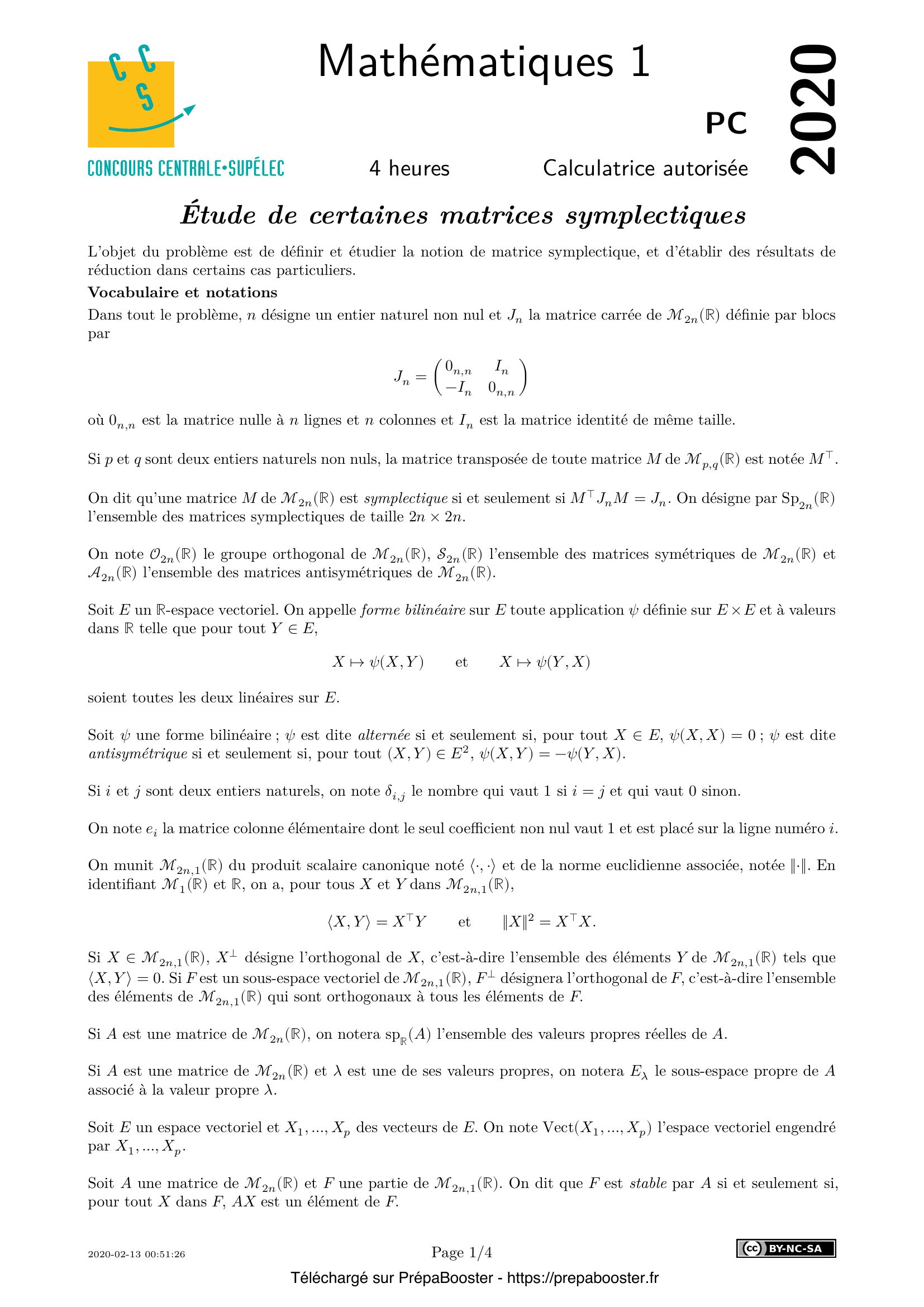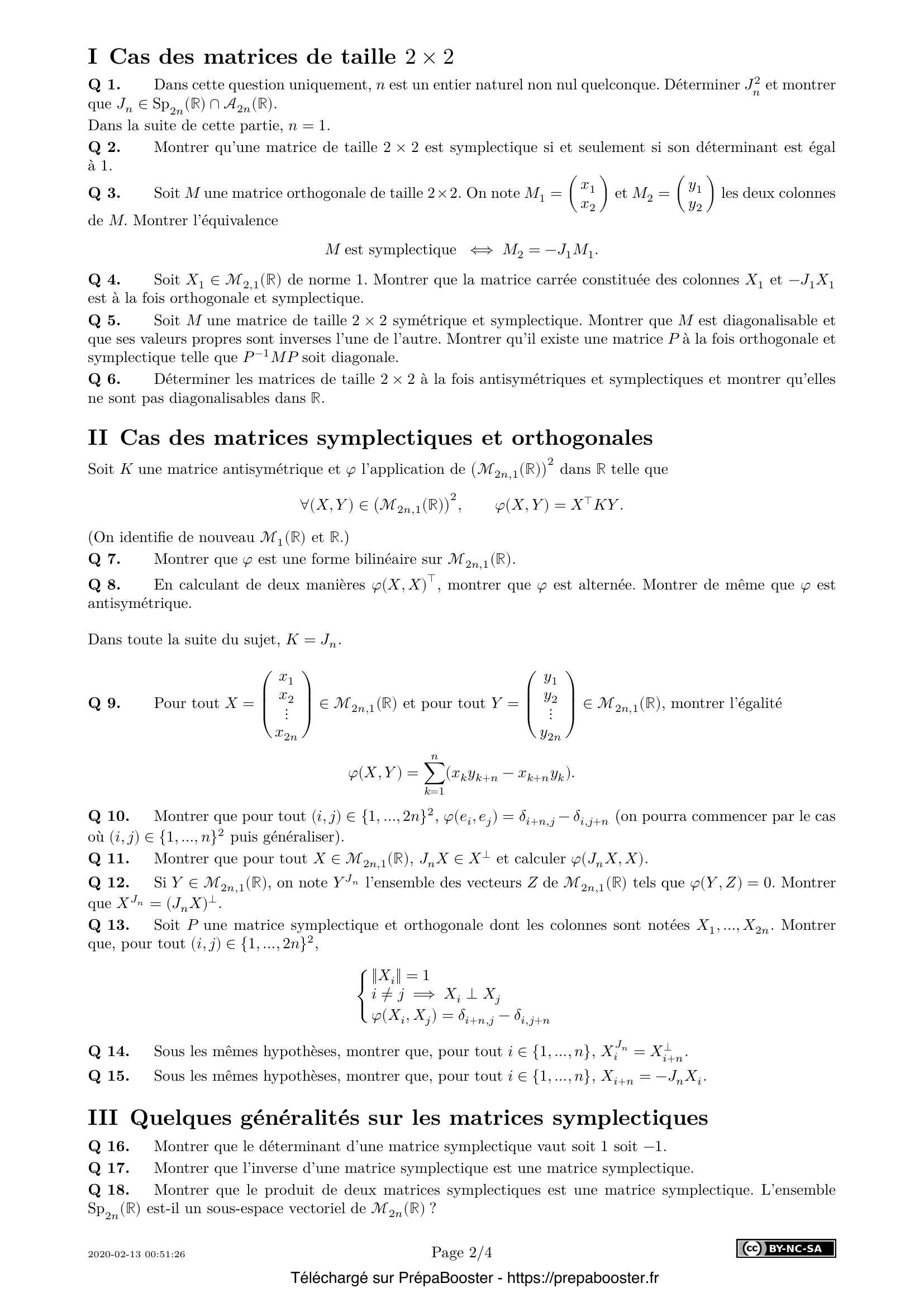Montrer que le produit de deux matrices symplectiques est une matrice symplectique. L’ensemble $Sp_{2n}(\mathbb{R})$ est-il un sous-espace vectoriel de $\mathcal{M}_{2n}(\mathbb{R})$ ?