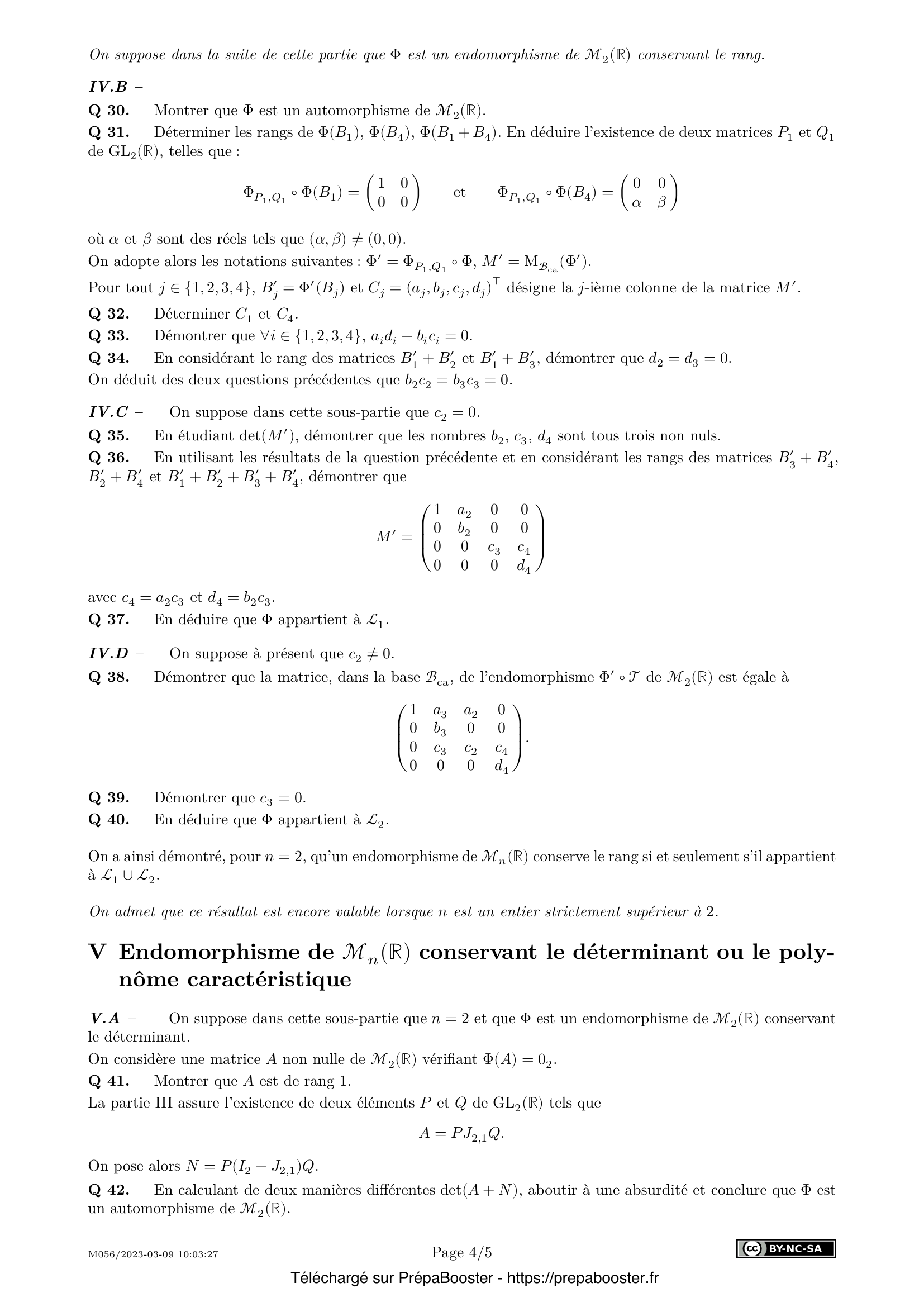 1. Question de cours. Démontrer que $M_{\mathcal{E},\mathcal{G}}(g \circ f) = M_{\mathcal{F},\mathcal{G}}(g) M_{\mathcal{E},\mathcal{F}}(f)$. 2. En déduire qu’il existe deux matrices $P$ et $Q$ appartenant à $GL_n(\mathbb{R})$ telles que $M_{\mathcal{F},\mathcal{G}}(f) = P M_\mathcal{E}(f) Q$. 3. Soit $\lambda \in \mathbb{C}$ une valeur propre de $M$ et $X$ un vecteur propre associé. Montrer que, pour tout entier naturel $k$, $M^k X = \lambda^k X$. 4. En déduire que, si $\Pi \in \mathbb{R}[X]$ est un polynôme annulateur de $M$, alors toute valeur propre complexe de $M$ est une racine dans $\mathbb{C}$ de $\Pi$. 5. Vérifier que, pour toute matrice $A \in \mathcal{M}_n(\mathbb{R})$, $\Gamma_A$ appartient à $\mathcal{L}(\mathcal{M}_n(\mathbb{R}))$.} 6. Démontrer que, si $A$ appartient à $GL_n(\mathbb{R})$, alors $\Gamma_A$ conserve le rang. 7. Démontrer que l’application $\Gamma : \mathcal{M}_n(\mathbb{R}) \to \mathcal{L}(\mathcal{M}_n(\mathbb{R}))$, $A \mapsto \Gamma_A$ est linéaire et injective. 8. Démontrer que $\forall k \in \mathbb{N}$, $\Gamma_{A^k} = (\Gamma_A)^k$. 9. En déduire que, pour tout polynôme $\Pi$ de $\mathbb{R}[X]$, $\Gamma_{\Pi(A)} = \Pi(\Gamma_A)$. 10. À l’aide du résultat précédent, démontrer que $A$ est diagonalisable si et seulement si $\Gamma_A$ est diagonalisable.} 11. Démontrer que $\chi_A$ est un polynôme annulateur de $\Gamma_A$ et que $\chi_{\Gamma_A}$ est un polynôme annulateur de $A$. 12. En déduire que $Sp_\mathbb{C} (\Gamma_A) = Sp_\mathbb{C}(A)$. 13. Démontrer que $\mathcal{L}_1 \cup \mathcal{L}_2$ est stable par composition, c’est-à-dire que $\forall (\Theta, \Theta’) \in (\mathcal{L}_1 \cup \mathcal{L}_2)^2,~ \Theta \circ \Theta’ \in \mathcal{L}_1 \cup \mathcal{L}_2$. 14. Montrer que $\Phi_{P,Q}$ et $\Psi_{P,Q}$ sont des automorphismes de $\mathcal{M}_n(\mathbb{R})$ et préciser leurs applications réciproques. 15. Montrer que $\Phi_{P,Q}$ et $\Psi_{P,Q}$ conservent le rang.} 16. Donner une condition nécessaire et suffisante sur $P$ et $Q$ pour que $\Phi_{P,Q}$ et $\Psi_{P,Q}$ conservent le déterminant. 17. Montrer que $\Phi_{P,P^{-1}}$ et $\Psi_{P,P^{-1}}$ conservent le polynôme caractéristique. 18. Montrer que $\mathcal{T} \in \mathcal{L}_2$ et $\mathcal{T} \notin \mathcal{L}_1$. 19. En déduire que les ensembles $\mathcal{L}_1$ et $\mathcal{L}_2$ sont disjoints. 20. Déterminer $M_{\mathcal{B},\mathcal{B}’}(f)$.} 21. Montrer que la famille $(f(e_1),…,f(e_k))$ est libre. 22. Justifier que $k < n$. 23. On complète la famille $(f(e_1), ..., f(e_k))$ en une base $\mathcal{B}' = (f(e_1), ..., f(e_k), f_{k+1}, ..., f_n)$ de $\mathbb{R}^n$. Déterminer $M_{\mathcal{B},\mathcal{B}'}(f)$. 24. Montrer qu’il existe deux matrices $P$ et $Q$ de $GL_n(\mathbb{R})$ telles que $M = \Phi_{P,Q}(J_{n,r})$. 25. Montrer qu’il existe deux matrices $P_2$ et $Q_2$ de $GL_2(\mathbb{R})$ telles que $A = P_2 \begin{pmatrix}1 & 0 \\ 0 & 0\end{pmatrix} Q_2$~ et~ $B = P_2 \begin{pmatrix}0 & 0 \\ \alpha & \beta\end{pmatrix} Q_2$~ où $\alpha$ et $\beta$ sont des réels, non tous deux nuls.} 26. Expliciter la matrice de la transposition $\mathcal{T}$ dans la base canonique de $\mathcal{M}_2(\mathbb{R})$. Cette matrice de $\mathcal{M}_4(\mathbb{R})$ sera notée $T$. 27. Justifier sans calcul que $T$ est diagonalisable. 28. Préciser les valeurs propres et les sous-espaces propres de $\mathcal{T}$. 29. Montrer que la matrice, dans la base $\mathcal{B}_{ca}$, de l’endomorphisme $\Phi_{P,Q}$ est de la forme $\left( \begin{array}{cc} a U & b U \\ c U & d U \\ \end{array} \right)$, où $U$ est un élément de $\mathcal{M}_2(\mathbb{R})$ à déterminer. 30. Montrer que $\Phi$ est un automorphisme de $\mathcal{M}_2(\mathbb{R})$.} 31. Déterminer les rangs de $\Phi(B_1)$, $\Phi(B_4)$, $\Phi(B_1+B_4)$. En déduire l’existence de deux matrices $P_1$ et $Q_1$ de $GL_2(\mathbb{R})$, telles que : $\Phi_{P_1,Q_1} \circ \Phi(B_1) = \begin{pmatrix}1 & 0 \\ 0 & 0\end{pmatrix}$ et $\Phi_{P_1,Q_1} \circ \Phi(B_4) = \begin{pmatrix}0 & 0 \\ \alpha & \beta\end{pmatrix}$ où $\alpha$ et $\beta$ sont des réels tels que $(\alpha, \beta) \neq (0,0)$. On adopte alors les notations suivantes : $\Phi' = \Phi_{P_1,Q_1} \circ \Phi,~ M' = M_{\mathcal{B}_{ca}}(\Phi')$. Pour tout $j \in \{1,2,3,4\}$, $B'_j = \Phi'(B_j)$ et $C_j = (a_j,b_j,c_j,d_j)^\top$ désigne la $j$-ième colonne de la matrice $M'$. 32. Déterminer $C_1$ et $C_4$. 33. Démontrer que $\forall i \in \{1,2,3,4\}, ~ a_i d_i - b_i c_i = 0$. 34. En considérant le rang des matrices $B'_1+B'_2$ et $B'_1+B'_3$, démontrer que $d_2 = d_3 = 0$. On déduit des deux questions précédentes que $b_2 c_2 = b_3 c_3 = 0$. 35. On suppose que $c_2 = 0$. En étudiant $\det(M')$, démontrer que les nombres $b_2, c_3, d_4$ sont tous trois non nuls.} 36. En utilisant les résultats de la question précédente et en considérant les rangs des matrices $B'_3 + B'_4$, $B'_2 + B'_4$ et $B'_1 + B'_2 + B'_3 + B'_4$, démontrer que \[ M' = \begin{pmatrix} 1 & a_2 & 0 & 0 \\ 0 & b_2 & 0 & 0 \\ 0 & 0 & c_3 & c_4 \\ 0 & 0 & 0 & d_4 \end{pmatrix} \] avec $c_4 = a_2 c_3$ et $d_4 = b_2 c_3$. 37. En déduire que $\Phi$ appartient à $\mathcal{L}_1$. 38. On suppose à présent que $c_2 \neq 0$. Démontrer que la matrice, dans la base $\mathcal{B}_{ca}$, de l’endomorphisme $\Phi' \circ \mathcal{T}$ de $\mathcal{M}_2(\mathbb{R})$ est égale à \[ \begin{pmatrix} 1 & a_3 & a_2 & 0 \\ 0 & b_3 & 0 & 0 \\ 0 & c_3 & c_2 & c_4 \\ 0 & 0 & 0 & d_4 \end{pmatrix} \] . 39. Démontrer que $c_3 = 0$. 40. En déduire que $\Phi$ appartient à $\mathcal{L}_2$.} 41. Montrer que $A$ est de rang 1. 42. La partie III assure l’existence de deux éléments $P$ et $Q$ de $GL_2(\mathbb{R})$ tels que $A = P J_{2,1} Q$. On pose alors $N = P (I_2 - J_{2,1}) Q$. En calculant de deux manières différentes $\det(A + N)$, aboutir à une absurdité et conclure que $\Phi$ est un automorphisme de $\mathcal{M}_2(\mathbb{R})$. 43. En discutant selon les valeurs
