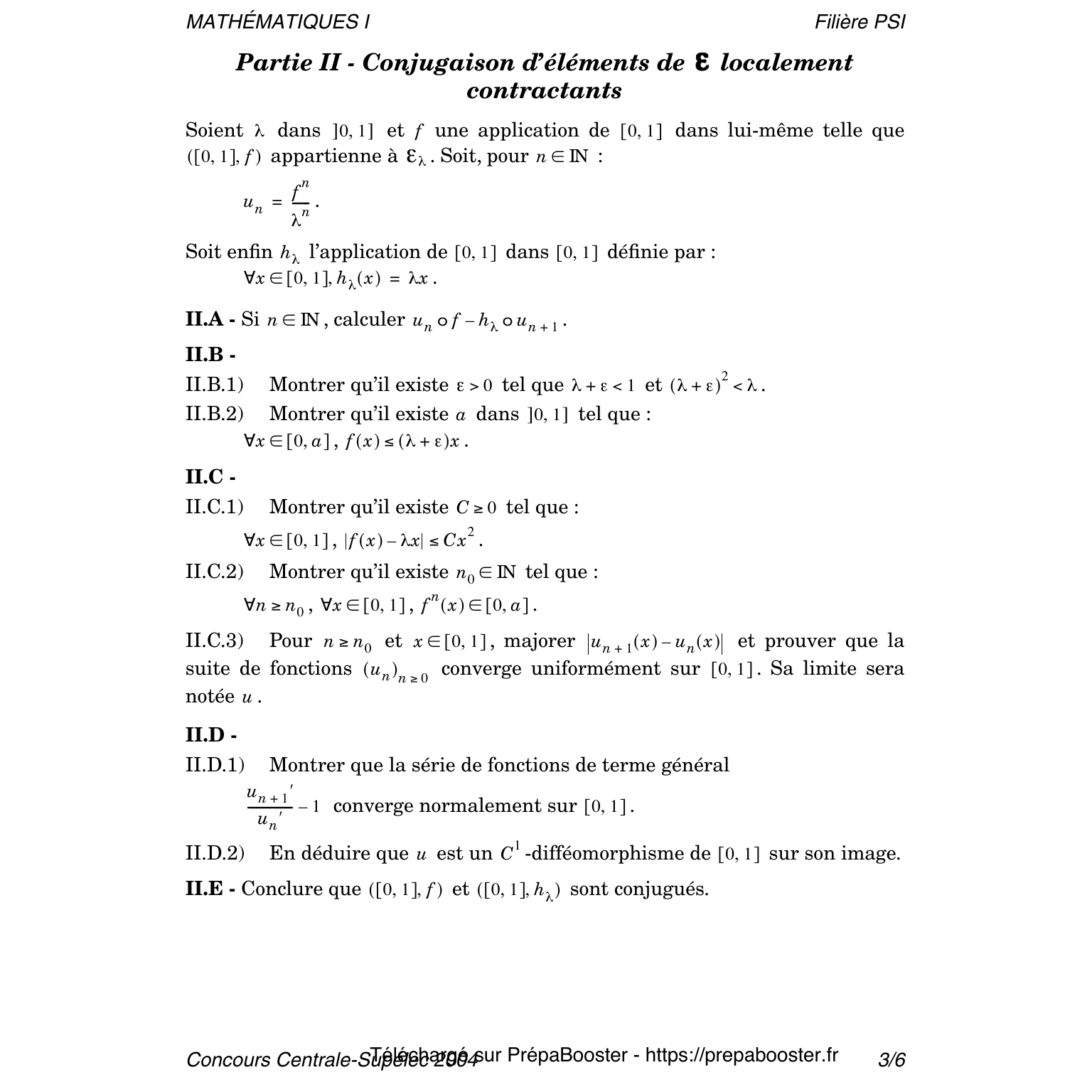 1. I.A – Soit $(I, f), (I, g) \in \epsilon$. Montrer que $f'(0) = g'(0)$. 2. I.B – Soit $f$ une application de $[0,1]$ dans lui-même telle que $( [0,1], f)$ appartient à $\epsilon$. 3. I.B.1) Montrer que $f’ (0) \in ]0,1[$. 4. I.B.2) Montrer que la suite de fonctions $(f^n)_{n \geq 0}$ converge simplement vers $0$ sur $[0,1]$. 5. I.B.3) Montrer que cette convergence est uniforme.} 6. I.C – Soit $(a_n)_{n \geq 0}$ une suite de réels strictement positifs. On suppose que la série de terme général $(a_n)$ converge absolument et on pose, si $n$ : \[ P_n = \prod_{k=0}^n u_k \] En considérant la série de terme général $\ln \frac{P_{n+1}}{P_n}$, montrer que la suite $(P_n)$ converge vers un réel strictement positif. 7. I.D – Soit $I$ un intervalle de $\mathbb{R}$ et $(\varphi_n)_{n \geq 0}$ une suite de fonctions de $I$ dans $\mathbb{R}_+^*$. On suppose que la série de fonctions de terme général $(\varphi_n)$ converge normalement sur $I$. On pose, si $n$: \[ Q_n = \prod_{k=0}^n \varphi_k \] Montrer que la suite de fonctions $(Q_n)_{n \geq 0}$ converge uniformément sur $I$ vers une fonction à valeurs dans $\mathbb{R}_+^*$.} 8. II.A – Si $x \in [0, 1]$, calculer $h_\lambda(f(x))$. 9. II.B.1) Montrer qu’il existe $a \in ]0,1]$ tel que $f([0,a]) \subset [0,a]$ et $f(x) \leq (\lambda + \varepsilon)x$ pour tout $x \in [0,a]$. 10. II.B.2) Montrer qu’il existe $C \in \mathbb{R}$ tel que \[ |f(x) – \lambda x| \leq Cx^2 \] pour tout $x \in [0,1]$. 11. II.C.1) Montrer qu’il existe $n_0 \in \mathbb{N}$ tel que \[ f^n(x) \in [0,a] \] pour tout $n \geq n_0$ et tout $x \in [0,1]$. 12. II.C.2) Montrer qu’il existe $C \in \mathbb{R}$ tel que pour tout $n \geq n_0$, $x \in [0,1]$ : \[ |u_{n+1}(x) – u_n(x)| \leq C\lambda^n \] où $u_n = f^n$.} 13. II.C.3) Pour $n \geq n_0$ et $x \in [0,1]$, majorer $|u_{n+1}(x) – u_n(x)|$ et prouver que la suite de fonctions $(u_n)_{n \geq 0}$ converge uniformément sur $[0,1]$. Sa limite sera notée $u$. 14. II.D.1) Montrer que la série de fonctions de terme général $\frac{u_{n+1}'(x)}{u_n'(x)} – 1$ converge normalement sur $[0,1]$. 15. II.D.2) En déduire que $u$ est un $C^1$-difféomorphisme de $[0,1]$ sur son image. 16. II.E – Conclure que $( [0,1], f)$ et $( [0,1], g)$ sont conjugués.} 17. III.A.1) Pour $q \in \mathbb{N}^*$, soit la fonction $\theta_q$ définie sur $[0,1]$ par : \[ \forall x \in [0,1],~ \theta_q(x) = x + x^{q+1} \] Montrer que $( [0,1], \theta_q)$ est dans $\epsilon_1^*$. Préciser $\nu(\theta_q)$. 18. III.A.2) Dans la suite de III.A, on considère une fonction $f$ de $[0,1]$ dans lui-même telle que $( [0,1], f) $ appartient à $\epsilon_1^*$ et on pose $q = \nu(f)$ puis $a = \frac{f^{(q+1)}(0)}{(q+1)!}$. 19. III.A.2.a) Vérifier que $a$ est strictement positif. 20. III.A.2.b) Si $g$ appartient à $\epsilon_1^*$ et est conjugué à $f$, vérifier que $g$ est aussi dans $\epsilon_1^*$ avec $\nu(g) = q$. 21. III.A.3.a) Montrer qu’il existe $r, r’ > 0$ et $h \in C^1([0, r], [0, r’])$ tels que $h$ induise un $C^1$-difféomorphisme de $[0, r]$ sur $[0, r’]$ dont l’inverse $h^{-1}$ est de classe $C^1$.} 22. III.A.3.b) Établir : quand $y \rightarrow 0$, $h^{-1}(y) = y – \beta y^k + o(y^k)$. 23. III.A.3.c) Déterminer les développements limités à l’ordre $2q+1$ en $0$ de $h \circ f \circ h^{-1}$ puis de $g$. 24. III.A.4) De ce qui précède déduire l’existence d’un réel $E$ et d’un couple $( [0,1], g)$ de $\epsilon_1^*$ conjugué à $( [0,1], f)$ et tels que : \[ \text{quand}~ y \rightarrow 0,~ g(y) = y + y^{q+1} + \frac{E}{q} y^{2q+1} + o(y^{2q+1}) \] 25. III.B.1.a) Identifier $T_q = \tau_q \circ \theta_q \circ \tau_q^{-1}$. 26. III.B.1.b) Quelles propriétés de $G$ déduit-on des propriétés ii) et iii) du début de l’énoncé ?} 27. III.B.1.c) Déterminer un nombre réel $R$ tel que : \[ x \rightarrow +\infty,~ G(x) = x + \frac{1}{q} + O\left(\frac{1}{x^{1+1/q}}\right) \] 28. III.B.2.a) Montrer qu’il existe un entier naturel $n_0$ tel que : \[ n \geq n_0,~ \forall x \in [1+1/q, +\infty[,~ G^n(x) \geq x + \frac{n}{2q} \] 29. III.B.2.b) Montrer qu’il existe $C>0$ tel que : \[ n \geq n_0,~ \forall x \in [1+1/q, +\infty[,~ |u_{n+1}(x) – u_n(x)| \leq \frac{C}{n} \] où $u_n(x) = G^n(x) – nR$. 30. III.B.2.c) Pour tous entier naturel strictement positif $n$ et réel supérieur ou égal à $1$, on pose $v_n(x) = u_n(x) – Rn\ln n$, où $R$ est la constante définie au III.B.1.c). Démontrer, en procédant comme au II.C.3), que la suite de fonctions $(v_n)_{n \geq 0}$ converge vers une fonction $v$ et que cette convergence est uniforme sur tout segment inclus dans $[1+1/q, +\infty[$. 31. III.B.2.d) Si $x \geq 1$, vérifier que $\lim_{n \to +\infty} v_n(x) = +\infty$.} 32. III.B.3.a) Montrer que $v(Gx) = v(x) + 1$. 33. III.B.3.b) Montrer que $v \in C^1([1+1/q, +\infty[)$ et, en procédant comme en II.D.1), prouver que $v$ est un $C^1$-difféomorphisme de $[1+1/q, +\infty[$ sur son image. 34. III.B.4.a) Montrer que $v'(x) \rightarrow 1$ quand $x \rightarrow +\infty$. 35. III.B.4.b) Conclure, si $f$ est une fonction de $[0,1]$ dans lui-même telle que $( [0,1], f)$ soit dans $\epsilon_1^*$ et $\nu(f) = q$, que $( [0,1], f)$ est conjugué à $( [0,1], \theta_q)$.} 36. III.C.1.a) Utiliser ce qui précède pour montrer que $(w_n)$ admet un équivalent du type $a/n^\alpha$ avec $a$ et $\alpha$ réels. Déterminer $a$ et $\alpha$. 37. III.C.1.b) Montrer qu’il existe des nombres réels $b$ et $c$ tels que : \[ w_n = \frac{a}{n^\alpha} + \frac{b}{n^{3\alpha}} + \frac{c \ln n}{n^{5\alpha}} + O\left(\frac{1}{n^{5\alpha}}\right) \] 38. III.C.2) Établir un programme permettant de calculer $(w_n)$ (on utilisera le langage de programmation associé au logiciel de calcul formel).}FAQ