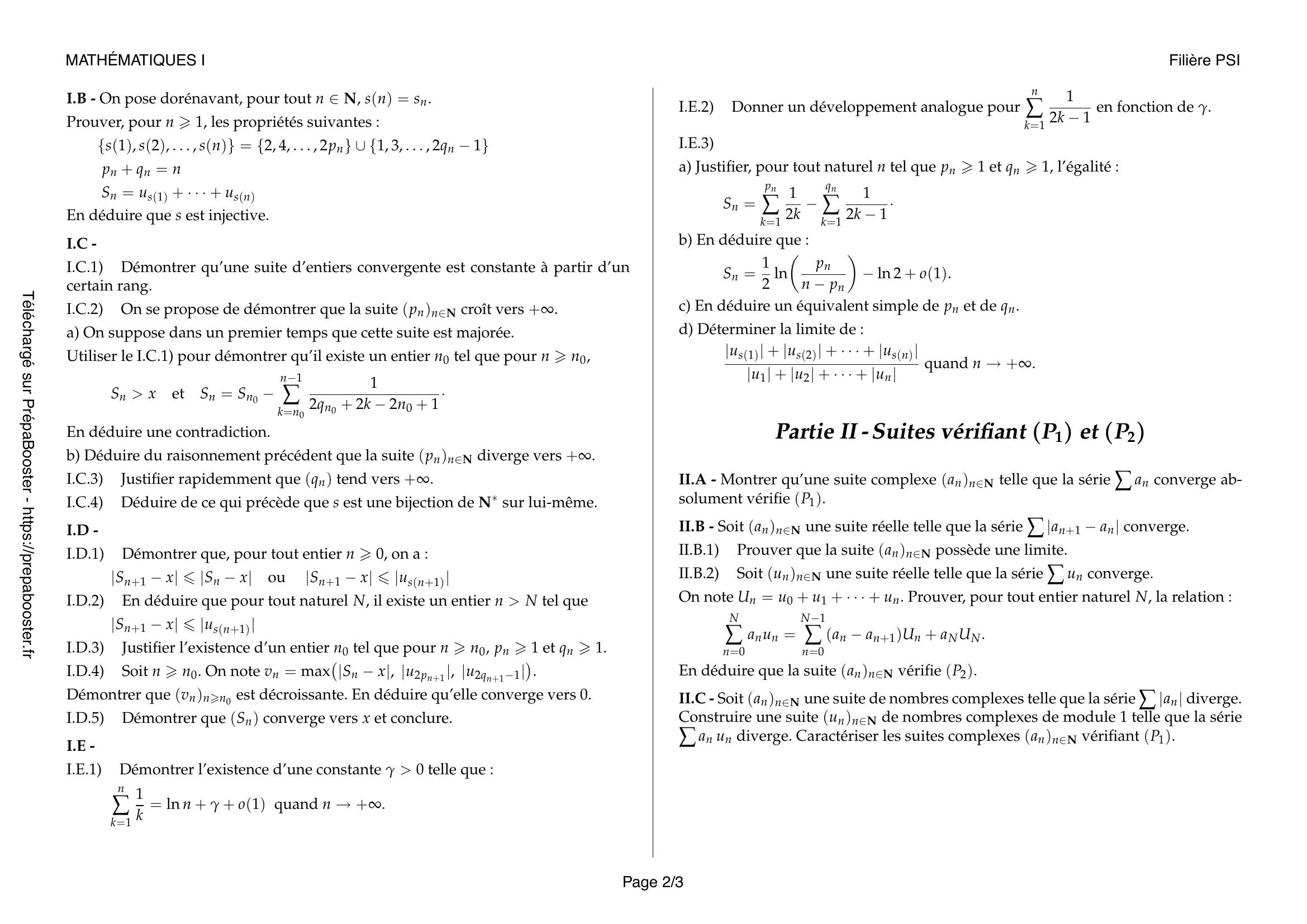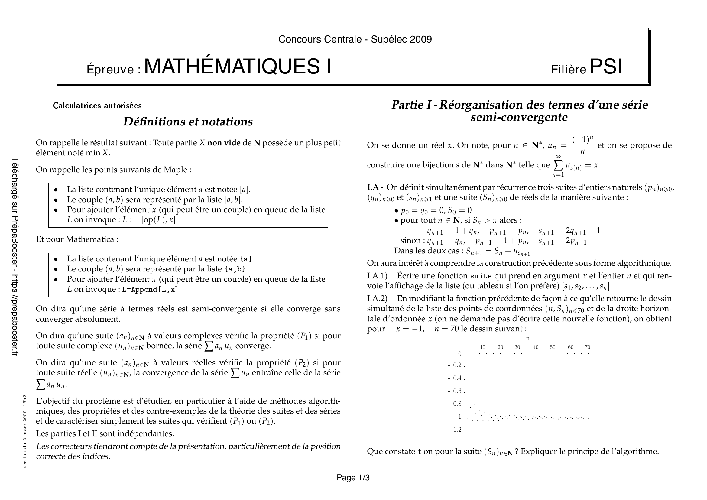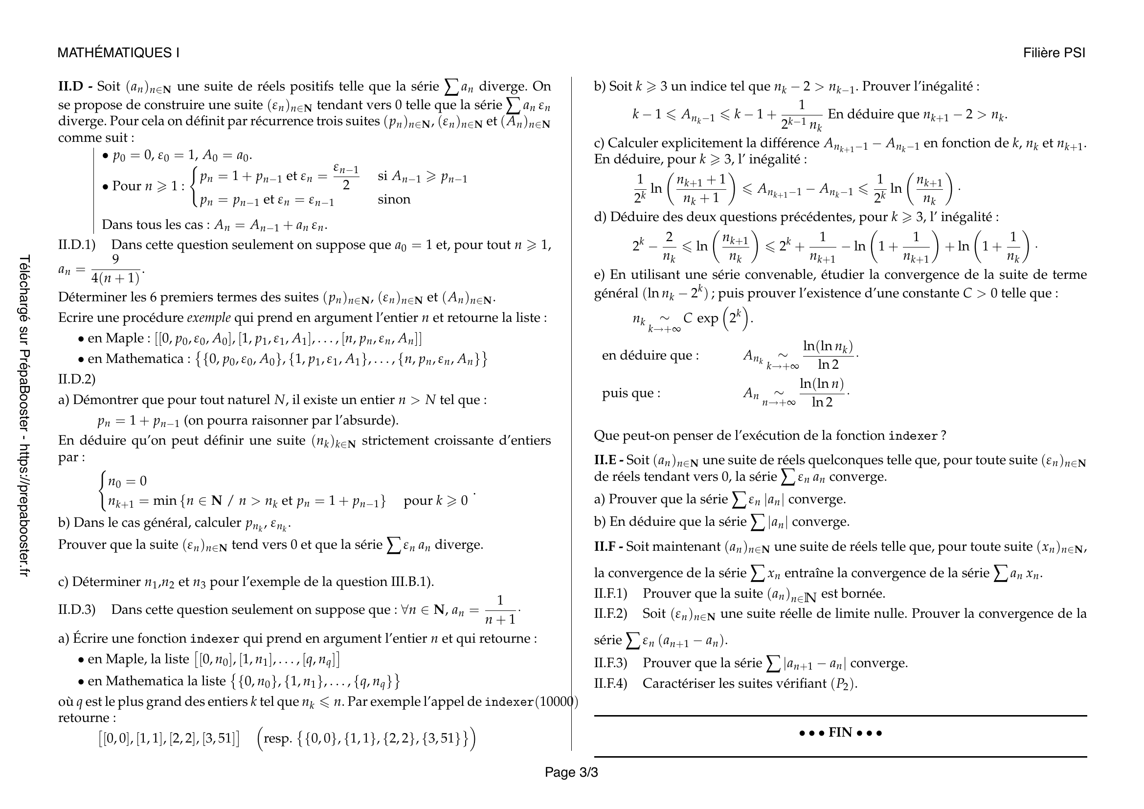 1. I.A.1) Écrire une fonction suite qui prend en argument $x$ et l’entier $n$ et qui renvoie l’affichage de la liste (ou tableau si l’on préfère) $[s_1,s_2, \ldots ,s_n]$. 2. I.A.2) En modifiant la fonction précédente de façon à ce qu’elle retourne le dessin simultané de la liste des points de coordonnées $(n, S_n)_{n\leq 70}$ et de la droite horizontale d’ordonnée $x$ (on ne demande pas d’écrire cette nouvelle fonction), on obtient pour $x = -1$, $n=70$ le dessin suivant : \emph{[figure non reproduite]}. \\ Que constate-t-on pour la suite $(S_n)_{n\in\mathbb{N}}$ ? Expliquer le principe de l’algorithme. 3. I.B \quad On pose dorénavant, pour tout $n \in \mathbb{N}$, $s(n) = s_n$.\newline Prouver, pour $n > 1$, les propriétés suivantes : $$\{s(1), s(2), \ldots, s(n)\} = \{2, 4, \ldots, 2p_n\} \cup \{1, 3, \ldots, 2q_n – 1\}$$ $$p_n + q_n = n$$ $$S_n = u_{s(1)} + \cdots + u_{s(n)}$$ En déduire que $s$ est injective. 4. I.C.1) Démontrer qu’une suite d’entiers convergente est constante à partir d’un certain rang. 5. I.C.2) On se propose de démontrer que la suite $(p_n)_{n\in\mathbb{N}}$ croît vers $+\infty$. \begin{itemize} \item[a)] On suppose dans un premier temps que cette suite est majorée. Utiliser le I.C.1) pour démontrer qu’il existe un entier $n_0$ tel que pour $n > n_0$, $S_n > x$ et $$S_n = S_{n_0} – \sum_{k=n_0}^{n-1} \frac{1}{2q_{n_0} + 2k – 2n_0 + 1}$$ En déduire une contradiction. \item[b)] Déduire du raisonnement précédent que la suite $(p_n)_{n\in\mathbb{N}}$ diverge vers $+\infty$. \end{itemize}} 6. I.C.3) Justifier rapidement que $(q_n)$ tend vers $+\infty$. 7. I.C.4) Déduire de ce qui précède que $s$ est une bijection de $\mathbb{N}^*$ sur lui-même. 8. I.D.1) Démontrer que, pour tout entier $n > 0$, on a : $|S_{n+1} – x| \leq |S_n – x|$ ou $|S_{n+1} – x| \leq |u_{s(n+1)}|$. 9. I.D.2) En déduire que pour tout naturel $N$, il existe un entier $n > N$ tel que $|S_{n+1} – x| \leq |u_{s(n+1)}|$. 10. I.D.3) Justifier l’existence d’un entier $n_0$ tel que pour $n > n_0$, $p_n > 1$ et $q_n > 1$.} 11. I.D.4) Soit $n > n_0$. On note $v_n = \max\big(|S_n-x|,\, |u_{2p_n+1}|,\, |u_{2q_n+1-1}|\big)$.\\ Démontrer que $(v_n)_{n> n_0}$ est décroissante. En déduire qu’elle converge vers $0$. 12. I.D.5) Démontrer que $(S_n)$ converge vers $x$ et conclure. 13. I.E.1) Démontrer l’existence d’une constante $\gamma > 0$ telle que : \[ \sum_{k=1}^n \frac{1}{k} = \ln n + \gamma + o(1) \quad \text{quand } n \to +\infty. \] 14. I.E.2) Donner un développement analogue pour $\sum_{k=1}^n \frac{1}{2k-1}$ en fonction de $\gamma$. 15. I.E.3) \begin{itemize} \item[(a)] Justifier, pour tout naturel $n$ tel que $p_n > 1$ et $q_n > 1$, l’égalité : \[ S_n = \sum_{k=1}^{p_n} \frac{1}{2k} – \sum_{k=1}^{q_n} \frac{1}{2k-1}. \] \item[(b)] En déduire que : $S_n = \frac{1}{2} \ln\left(\frac{p_n}{n-p_n}\right) – \ln2 + o(1)$. \item[(c)] En déduire un équivalent simple de $p_n$ et de $q_n$. \item[(d)] Déterminer la limite de : \[ \frac{|u_{s(1)}| + |u_{s(2)}| + \cdots + |u_{s(n)}|}{|u_1| + |u_2| + \cdots + |u_n|} \quad \text{quand } n \to +\infty. \] \end{itemize}} 16. II.A \quad Montrer qu’une suite complexe $(a_n)_{n\in \mathbb{N}}$ telle que la série $\sum a_n$ converge absolument vérifie (P1). 17. II.B.1) Prouver que la suite $(a_n)_{n\in\mathbb{N}}$ possède une limite si la série $\sum |a_{n+1} – a_n|$ converge. 18. II.B.2) Soit $(u_n)_{n\in\mathbb{N}}$ une suite réelle telle que la série $\sum u_n$ converge. On note $U_n = u_0 + u_1 + \cdots + u_n.$ Prouver, pour tout entier naturel $N$, la relation : \[ \sum_{n=0}^N a_n u_n = \sum_{n=0}^{N-1} (a_n – a_{n+1}) U_n + a_N U_N. \] En déduire que la suite $(a_n)_{n\in\mathbb{N}}$ vérifie (P2). 19. II.C \quad Soit $(a_n)_{n\in\mathbb{N}}$ une suite de nombres complexes telle que la série $\sum |a_n|$ diverge.\\ Construire une suite $(u_n)_{n\in\mathbb{N}}$ de nombres complexes de module 1 telle que la série $\sum a_n u_n$ diverge. Caractériser les suites complexes $(a_n)_{n\in\mathbb{N}}$ vérifiant (P1). 20. II.D.1) Dans cette question seulement on suppose que $a_0 = 1$ et, pour tout $n > 1$, $a_n = \frac{9}{4(n+1)}$. Déterminer les 6 premiers termes des suites $(p_n)$, $(\varepsilon_n)$ et $(A_n)$.\\ Écrire une procédure \emph{exemple} qui prend en argument l’entier $n$ et retourne la liste :\newline \textbf{en Maple :} $[[0,p_0,\varepsilon_0,A_0],[1,p_1,\varepsilon_1,A_1],\ldots, [n,p_n,\varepsilon_n,A_n]]$\newline \textbf{en Mathematica :} $\\{{0,p_0,\varepsilon_0,A_0}, \{1,p_1,\varepsilon_1,A_1\},\ldots, \{n,p_n,\varepsilon_n,A_n\}}$} 21. II.D.2) \begin{itemize} \item[(a)] Démontrer que pour tout naturel $N$, il existe un entier $n > N$ tel que $p_n = 1 + p_{n-1}$ (on pourra raisonner par l’absurde).\\ En déduire qu’on peut définir une suite $(n_k)_{k\in\mathbb{N}}$ strictement croissante d’entiers par : \[ \left\{ \begin{array}{l} n_0=0 \\ n_{k+1} = \min \{n \in \mathbb{N}\mid n > n_k \text{ et } p_n=1+p_{n-1}\} \end{array} \right. \] pour $k>0$. \item[(b)] Dans le cas général, calculer $p_{n_k}$, $\varepsilon_{n_k}$.\\ Prouver que la suite $(\varepsilon_n)$ tend vers 0 et que la série $\sum \varepsilon_n a_n$ diverge. \item[(c)] Déterminer $n_1$, $n_2$ et $n_3$ pour l’exemple de la question III.B.1). \end{itemize} 22. II.D.3) Dans cette question seulement on suppose que : $\forall n \in \mathbb{N}$, $a_n = \frac{1}{n+1}$. \begin{itemize} \item[a)] Écrire une fonction \emph{indexer} qui prend en argument l’entier $n$ et qui retourne :\\ \textbf{en Maple :} \[ [0,n_0], [1,n_1], \ldots, [q,n_q] \] \textbf{en Mathematica :} \[ \{0,n_0\}, \{1,n_1\}, \ldots, \{q,n_q\} \] où $q$ est le plus grand des entiers $k$ tels que $n_k \leq n$. Par exemple, l’appel de \emph{indexer}(10000) retourne $[0,0],[1,1],[2,2],[3,51]$ (resp.\ $\{0,0\},\{1,1\},\{2,2\},\{3,51\}$). \end{itemize} 23. II.E \begin{itemize} \item[a)] Soit $(a_n)$ une suite d