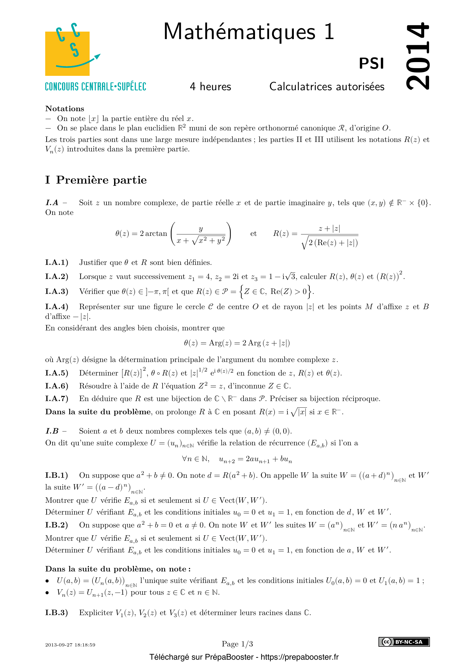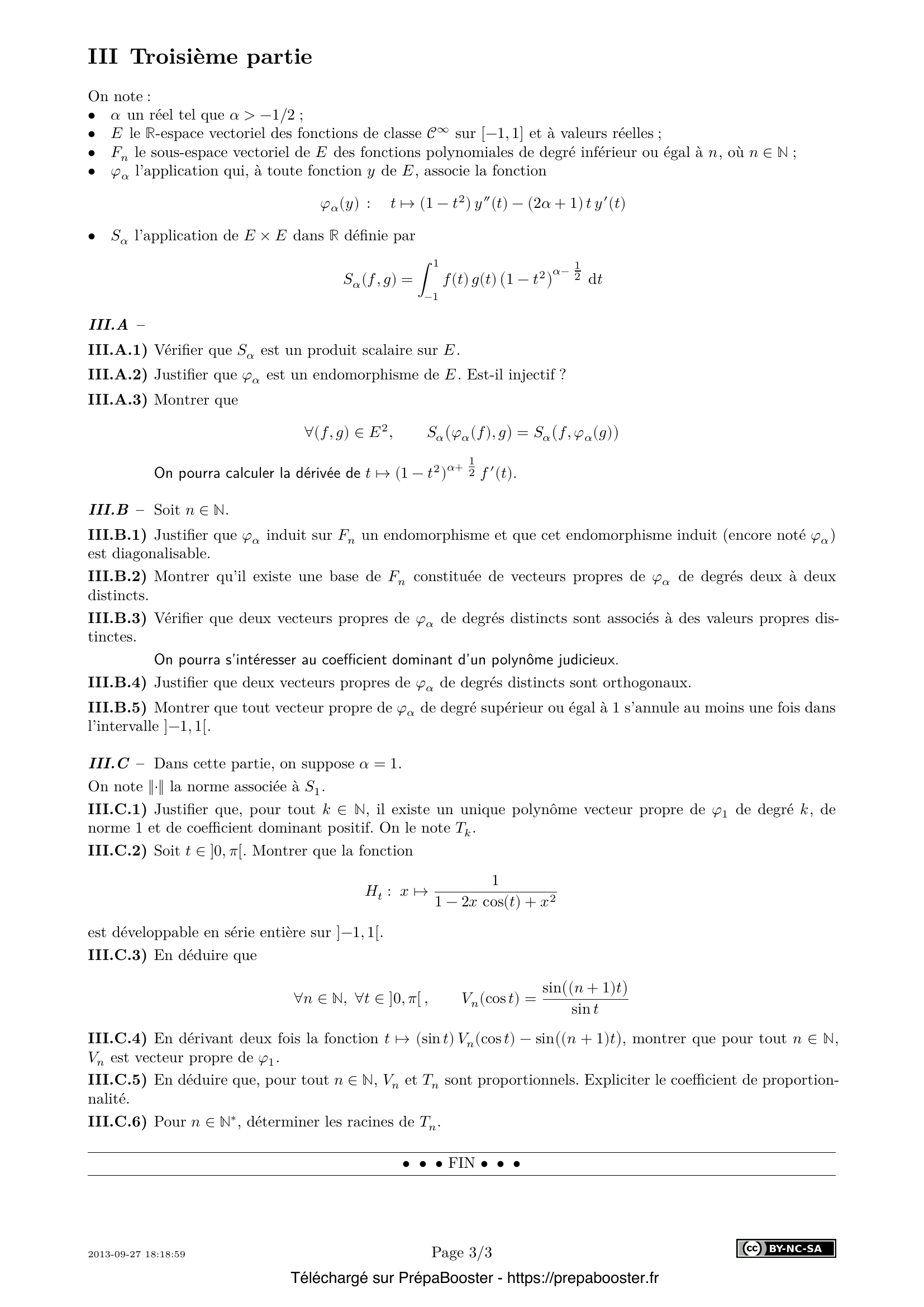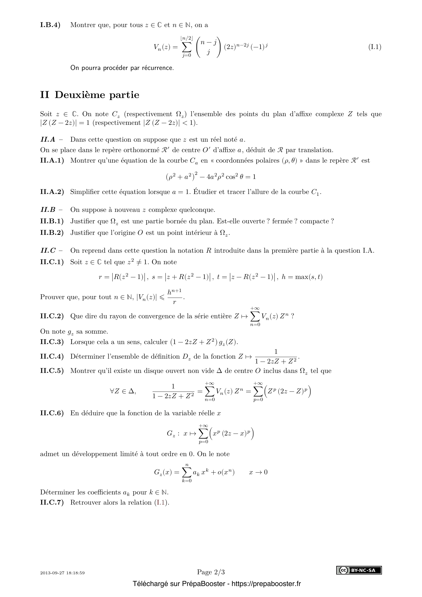 1. I.A.1) Justifier que $\theta$ et $R$ sont bien définies. 2. I.A.2) Lorsque $z$ vaut successivement $z_1 = 4$, $z_2 = 2i$ et $z_3 = 1 – i\sqrt{3}$, calculer $R(z)$, $\theta(z)$ et $[R(z)]^2$. 3. I.A.3) Vérifier que $\theta(z) \in ]-\pi, \pi[$ et que $R(z) \in \mathcal{P} = \left\{ Z \in \mathbb{C}, \operatorname{Re}(Z) > 0 \right\}$. 4. I.A.4) Représenter sur une figure le cercle $\mathcal{C}$ de centre $O$ et de rayon $|z|$ et les points $M$ d’affixe $z$ et $B$ d’affixe $-|z|$.\\ En considérant des angles bien choisis, montrer que\\ $\theta(z) = \Arg(z) = 2 \Arg (z + |z|)$\\ où $\Arg(z)$ désigne la détermination principale de l’argument du nombre complexe $z$. 5. I.A.5) Déterminer $|R(z)|^2$, $\theta \circ R(z)$ et $|z|^{1/2}e^{i \theta(z)/2}$ en fonction de $z$, $R(z)$ et $\theta(z)$.} 6. I.A.6) Résoudre à l’aide de $R$ l’équation $Z^2 = z$, d’inconnue $Z \in \mathbb{C}$. 7. I.A.7) En déduire que $R$ est une bijection de $\mathbb{C} \setminus \mathbb{R}^{-}$ dans $\mathcal{P}$. Préciser sa bijection réciproque. 8. I.B.1) On suppose que $a^2 + b \neq 0$. On note $d = R(a^2 + b)$. On appelle $W$ la suite $W = ((a + d)^n)_{n \in \mathbb{N}}$ et $W’$ la suite $W’ = ((a – d)^n)_{n \in \mathbb{N}}$.\\ Montrer que $U$ vérifie $E_{a,b}$ si et seulement si $U \in \operatorname{Vect}(W, W’)$.\\ Déterminer $U$ vérifiant $E_{a,b}$ et les conditions initiales $u_0 = 0$ et $u_1 = 1$, en fonction de $d$, $W$ et $W’$. 9. I.B.2) On suppose que $a^2 + b = 0$ et $a \neq 0$. On note $W$ et $W’$ les suites $W = (a^n)_{n \in \mathbb{N}}$ et $W’ = (n a^n)_{n \in \mathbb{N}}$.\\ Montrer que $U$ vérifie $E_{a,b}$ si et seulement si $U \in \operatorname{Vect}(W, W’)$.\\ Déterminer $U$ vérifiant $E_{a,b}$ et les conditions initiales $u_0 = 0$ et $u_1 = 1$, en fonction de $a$, $W$ et $W’$. 10. I.B.3) Expliciter $V_1(z)$, $V_2(z)$ et $V_3(z)$ et déterminer leurs racines dans $\mathbb{C}$.} 11. I.B.4) Montrer que, pour tous $z \in \mathbb{C}$ et $n \in \mathbb{N}$, on a $$V_n(z) = \sum_{j=0}^{\lfloor n/2 \rfloor} \binom{n-j}{j} (2z)^{n-2j} (-1)^j$$ (On pourra procéder par récurrence.) 12. II.A.1) Montrer qu’une équation de la courbe $C_a$ en « coordonnées polaires $(\rho, \theta)$ » dans le repère $\mathcal{R}’$ est $$\left(\rho^2 + a^2\right)^2 – 4 a^2 \rho^2 \cos^2\theta = 1$$ 13. II.A.2) Simplifier cette équation lorsque $a = 1$. Étudier et tracer l’allure de la courbe $C_1$. 14. II.B.1) Justifier que $\Omega_z$ est une partie bornée du plan. Est-elle ouverte ? fermée ? compacte ? 15. II.B.2) Justifier que l’origine $O$ est un point intérieur à $\Omega_z$.} 16. II.C.1) Soit $z \in \mathbb{C}$ tel que $z^2 \neq 1$. On note $$r = |R(z^2-1)|,\quad s = |z + R(z^2-1)|, \quad t = |z – R(z^2-1)|, \quad h = \max(s, t)$$ Prouver que, pour tout $n \in \mathbb{N}$, $$|V_n(z)| \leq \frac{h^{n+1}}{r}.$$ 17. II.C.2) Que dire du rayon de convergence de la série entière $Z \mapsto \sum_{n=0}^{+\infty} V_n(z) Z^n$ ?\\ On note $g_z$ sa somme. 18. II.C.3) Lorsque cela a un sens, calculer $(1 – 2zZ + Z^2) g_z(Z)$. 19. II.C.4) Déterminer l’ensemble de définition $D_z$ de la fonction $Z \mapsto \frac{1}{1 – 2zZ + Z^2}$. 20. II.C.5) Montrer qu’il existe un disque ouvert non vide $\Delta$ de centre $O$ inclus dans $\Omega_z$ tel que $$\forall Z \in \Delta, \quad \frac{1}{1 – 2zZ + Z^2} = \sum_{n=0}^{+\infty} V_n(z) Z^n = \sum_{p=0}^{+\infty} [Z^p(2z-Z)^p]$$} 21. II.C.6) En déduire que la fonction de la variable réelle $x$ $$G_z: x \mapsto \sum_{p=0}^{+\infty} [x^p (2z-x)^p]$$ admet un développement limité à tout ordre en 0. On le note $$G_z(x) = \sum_{k=0}^{n} a_k x^k + o(x^n)\quad x \to 0$$ Déterminer les coefficients $a_k$ pour $k \in \mathbb{N}$. 22. II.C.7) Retrouver alors la relation (I.1). 23. III.A.1) Vérifier que $S_\alpha$ est un produit scalaire sur $E$. 24. III.A.2) Justifier que $\varphi_\alpha$ est un endomorphisme de $E$. Est-il injectif ? 25. III.A.3) Montrer que $$\forall(f,g) \in E^2, \quad S_\alpha(\varphi_\alpha(f), g) = S_\alpha(f, \varphi_\alpha(g))$$ On pourra calculer la dérivée de $t \mapsto (1-t^2)^{\alpha+\frac{1}{2}} f'(t)$.} 26. III.B.1) Justifier que $\varphi_\alpha$ induit sur $F_n$ un endomorphisme et que cet endomorphisme induit (encore noté $\varphi_\alpha$) est diagonalisable. 27. III.B.2) Montrer qu’il existe une base de $F_n$ constituée de vecteurs propres de $\varphi_\alpha$ de degrés deux à deux distincts. 28. III.B.3) Vérifier que deux vecteurs propres de $\varphi_\alpha$ de degrés distincts sont associés à des valeurs propres distinctes.\\ On pourra s’intéresser au coefficient dominant d’un polynôme judicieux. 29. III.B.4) Justifier que deux vecteurs propres de $\varphi_\alpha$ de degrés distincts sont orthogonaux. 30. III.B.5) Montrer que tout vecteur propre de $\varphi_\alpha$ de degré supérieur ou égal à 1 s’annule au moins une fois dans l’intervalle $]-1, 1[$.} 31. III.C.1) Justifier que, pour tout $k \in \mathbb{N}$, il existe un unique polynôme vecteur propre de $\varphi_1$ de degré $k$, de norme 1 et de coefficient dominant positif. On le note $T_k$. 32. III.C.2) Soit $t \in ]0, \pi[$. Montrer que la fonction $$H_t: x \mapsto \frac{1}{1 – 2x\cos(t) + x^2}$$ est développable en série entière sur $]-1, 1[$. 33. III.C.3) En déduire que $$\forall n \in \mathbb{N},\forall t \in ]0, \pi[, \quad V_n(\cos t) = \frac{\sin((n+1)t)}{\sin t}$$ 34. III.C.4) En dérivant deux fois la fonction $t \mapsto (\sin t) V_n(\cos t) – \sin((n+1)t)$, montrer que pour tout $n \in \mathbb{N}$, $V_n$ est vecteur propre de $\varphi_1$. 35. III.C.5) En déduire que, pour tout $n \in \mathbb{N}$, $V_n$ et $T_n$ sont proportionnels. Expliciter le coefficient de proportionnalité.} 36. III.C.6) Pour $n \in \mathbb{N}^*$, déterminer les racines de $T_n$.}FAQ