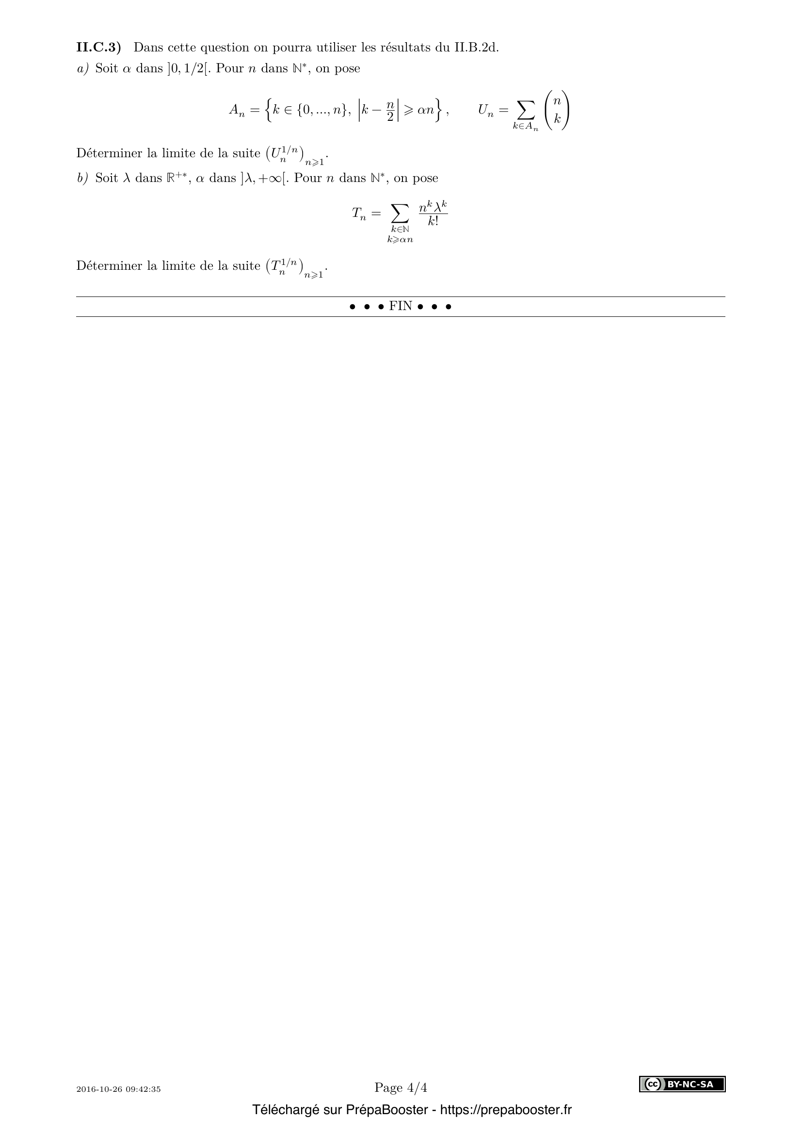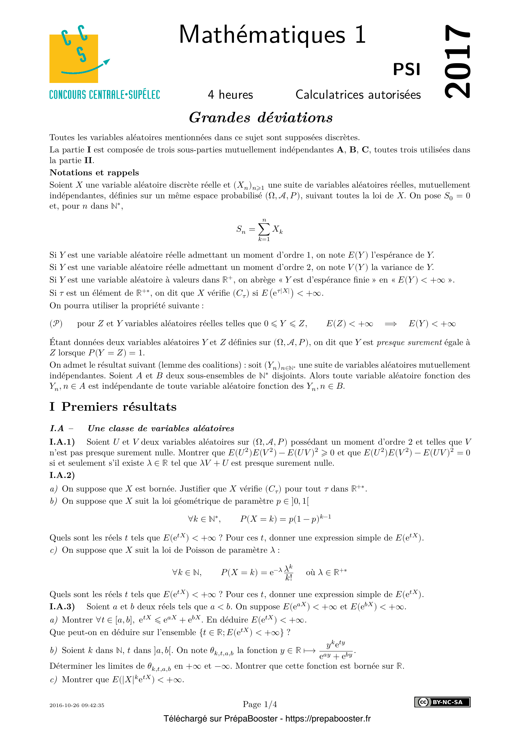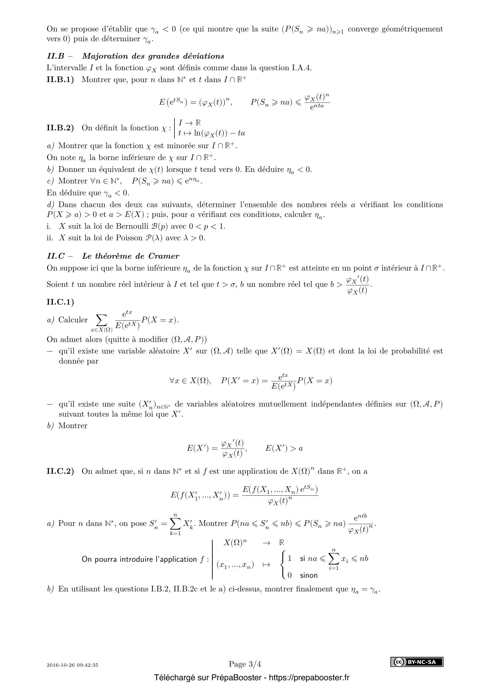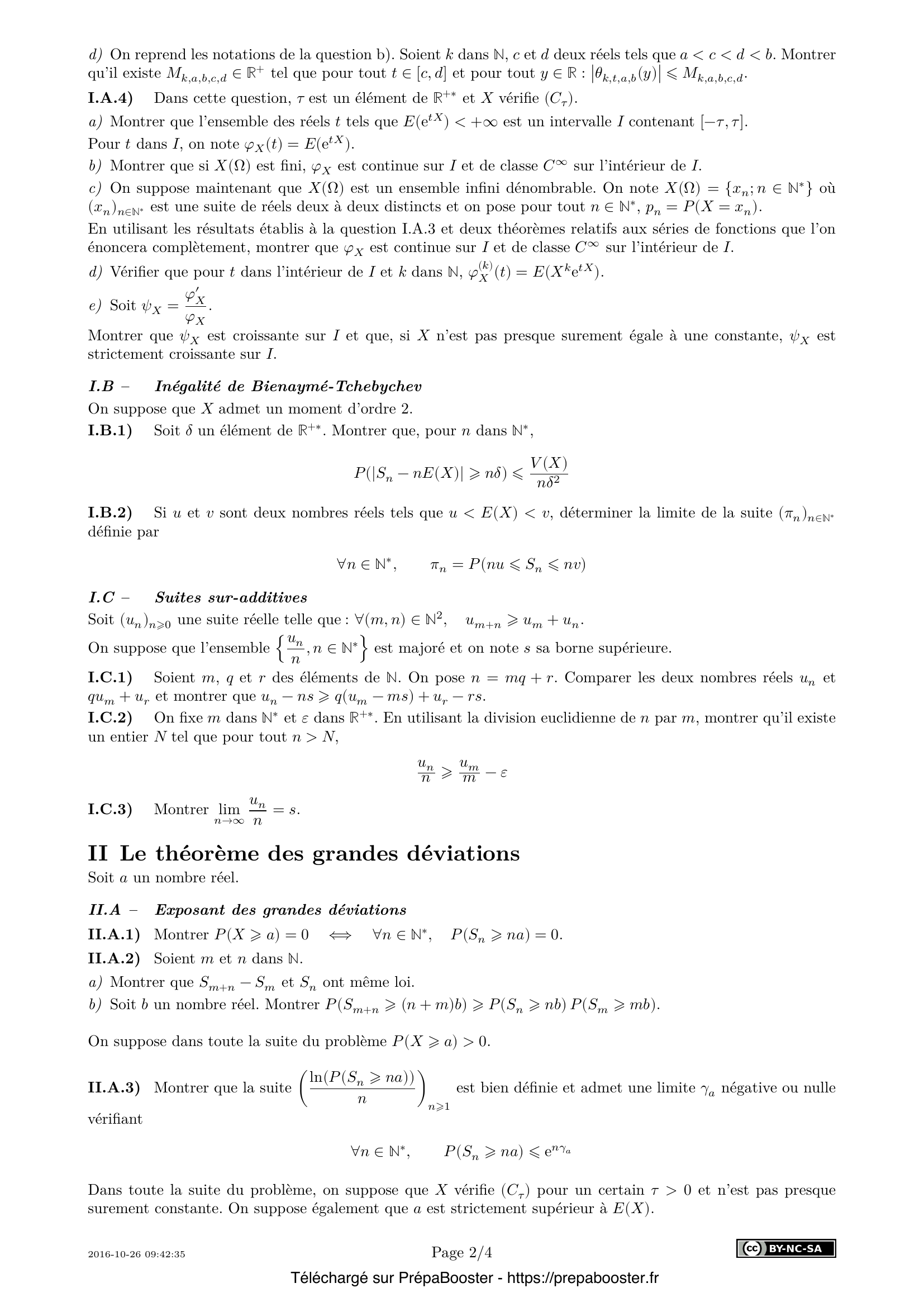 1. I.A.1) Soient $U$ et $V$ deux variables aléatoires sur $(\Omega, \mathcal{A}, P)$ possédant un moment d’ordre 2 et telles que $V$ n’est pas presque surement nulle. Montrer que $E(U^2)E(V^2) – E(UV)^2 \geq 0$ et que $E(U^2)E(V^2) – E(UV)^2 = 0$ si et seulement s’il existe $\lambda \in \mathbb{R}$ tel que $\lambda V + U$ est presque surement nulle.} 2. I.A.2) \begin{enumerate} \item[a)] On suppose que $X$ est bornée. Justifier que $X$ vérifie $(C_\tau)$ pour tout $\tau$ dans $\mathbb{R}^{+*}$. \item[b)] On suppose que $X$ suit la loi géométrique de paramètre $p \in ]0, 1[$ \\ $\forall k \in \mathbb{N}^{*},\ P(X = k) = p(1-p)^{k-1}$ \\ Quels sont les réels $t$ tels que $E(e^{tX}) < +\infty$ ? Pour ces $t$, donner une expression simple de $E(e^{tX})$. \item[c)] On suppose que $X$ suit la loi de Poisson de paramètre $\lambda$ : \\ $\forall k\in\mathbb{N},\ P(X=k) = e^{-\lambda} \frac{\lambda^k}{k!}$ où $\lambda \in \mathbb{R}^{+*}$ \\ Quels sont les réels $t$ tels que $E(e^{tX}) < +\infty$ ? Pour ces $t$, donner une expression simple de $E(e^{tX})$. \end{enumerate} } 3. I.A.3) Soient $a$ et $b$ deux réels tels que $a < b$. On suppose $E(e^{aX}) < +\infty$ et $E(e^{bX}) < +\infty$. \begin{enumerate} \item[a)] Montrer $\forall t \in [a, b],\ e^{tX} \leq e^{aX} + e^{bX}$. En déduire $E(e^{tX}) < +\infty$. Que peut-on en déduire sur l’ensemble $\{t \in \mathbb{R};\ E(e^{tX}) < +\infty\}$ ? \item[b)] Soient $k$ dans $\mathbb{N}$, $t$ dans $]a, b[$. On note $\theta_{k, t, a, b}$ la fonction $y \in \mathbb{R} \mapsto y^k \frac{e^{ty}}{e^{a y} + e^{b y}}$. Déterminer les limites de $\theta_{k, t, a, b}$ en $+\infty$ et $-\infty$. Montrer que cette fonction est bornée sur $\mathbb{R}$. \item[c)] Montrer que $E(|X|^k e^{tX}) < +\infty$. \end{enumerate} } 4. I.A.4) Dans cette question, $\tau$ est un élément de $\mathbb{R}^{+*}$ et $X$ vérifie $(C_{\tau})$. \begin{enumerate} \item[a)] Montrer que l’ensemble des réels $t$ tels que $E(e^{tX}) < +\infty$ est un intervalle $I$ contenant $[-\tau, \tau]$. Pour $t$ dans $I$, on note $\varphi_X(t) = E(e^{tX})$. \item[b)] Montrer que si $X(\Omega)$ est fini, $\varphi_X$ est continue sur $I$ et de classe $C^\infty$ sur l’intérieur de $I$. \item[c)] On suppose maintenant que $X(\Omega)$ est un ensemble infini dénombrable. On note $X(\Omega) = \{x_n;\ n \in \mathbb{N}^{*}\}$ où $(x_n)_{n\in \mathbb{N}^{*}}$ est une suite de réels deux à deux distincts et on pose pour tout $n \in \mathbb{N}^{*},\ p_n = P(X = x_n)$. En utilisant les résultats établis à la question I.A.3 et deux théorèmes relatifs aux séries de fonctions que l’on énoncera complètement, montrer que $\varphi_X$ est continue sur $I$ et de classe $C^\infty$ sur l’intérieur de $I$. \item[d)] Vérifier que pour $t$ dans l’intérieur de $I$ et $k$ dans $\mathbb{N}$, $\varphi^{(k)}_X(t) = E(X^k e^{tX})$. \item[e)] Soit $\psi_X = \frac{\varphi'_X}{\varphi_X}$. Montrer que $\psi_X$ est croissante sur $I$ et que, si $X$ n’est pas presque surement égale à une constante, $\psi_X$ est strictement croissante sur $I$. \end{enumerate} } 5. I.B.1) Soit $\delta$ un élément de $\mathbb{R}^{+*}$. Montrer que, pour $n$ dans $\mathbb{N}^{*}$, \[ P(|S_n - nE(X)| \geq n\delta) \leq \frac{V(X)}{n\delta^2} \] } 6. I.B.2) Si $u$ et $v$ sont deux nombres réels tels que $u < E(X) < v$, déterminer la limite de la suite $(\pi_n)_{n\in\mathbb{N}^{*}}$ définie par \[ \forall n \in \mathbb{N}^{*},\ \pi_n = P(nu \leq S_n \leq nv) \] } 7. I.C.1) Soient $m, q$ et $r$ des éléments de $\mathbb{N}$. On pose $n = mq + r$. Comparer les deux nombres réels $u_n$ et $q u_m + u_r$ et montrer que $u_n - n s \geq q(u_m - m s) + u_r - r s$.} 8. I.C.2) On fixe $m$ dans $\mathbb{N}^{*}$ et $\varepsilon$ dans $\mathbb{R}^{+*}$. En utilisant la division euclidienne de $n$ par $m$, montrer qu’il existe un entier $N$ tel que pour tout $n > N$, \[ \frac{u_n}{n} \geq \frac{u_m}{m} – \varepsilon \] } 9. I.C.3) Montrer $\lim_{n\to\infty} \frac{u_n}{n} = s$.} 10. II.A.1) Montrer $P(X \geq a) = 0 \iff \forall n \in \mathbb{N}^{*},\ P(S_n \geq n a) = 0$.} 11. II.A.2) Soient $m$ et $n$ dans $\mathbb{N}$. \begin{enumerate} \item[a)] Montrer que $S_{m+n} – S_m$ et $S_n$ ont même loi. \item[b)] Soit $b$ un nombre réel. Montrer $P(S_{m+n} \geq (n + m)b) \geq P(S_n \geq n b ) P(S_m \geq m b)$. \end{enumerate} } 12. II.A.3) Montrer que la suite $\left(\frac{\ln P(S_n \geq n a)}{n}\right)_{n\geq 1}$ est bien définie et admet une limite $\gamma_a$ négative ou nulle vérifiant $\forall n \in \mathbb{N}^{*},\ P(S_n \geq n a) \leq e^{n\gamma_a}$.} 13. II.B.1) Montrer que, pour $n$ dans $\mathbb{N}^{*}$ et $t$ dans $I \cap \mathbb{R}^+$, \[ E(e^{t S_n}) = (\varphi_X(t))^n, \quad P(S_n \geq n a) \leq \frac{\varphi_X(t)^n}{e^{n t a}} \] } 14. II.B.2) On définit la fonction $\chi : I \rightarrow \mathbb{R}$ par $t \mapsto \ln(\varphi_X(t)) – t a$. \begin{enumerate} \item[a)] Montrer que la fonction $\chi$ est minorée sur $I \cap \mathbb{R}^+$. \item[b)] Donner un équivalent de $\chi(t)$ lorsque $t$ tend vers $0$. En déduire $\eta_a < 0$. \item[c)] Montrer $\forall n \in \mathbb{N}^{*},\ P(S_n \geq n a) \leq e^{n \eta_a}$. En déduire que $\gamma_a < 0$. \item[d)] Dans chacun des deux cas suivants, déterminer l’ensemble des nombres réels $a$ vérifiant les conditions $P(X \geq a) > 0$ et $a > E(X)$ ; puis, pour $a$ vérifiant ces conditions, calculer $\eta_a$. \begin{enumerate} \item[i.] $X$ suit la loi de Bernoulli $\mathcal{B}(p)$ avec $0 < p < 1$. \item[ii.] $X$ suit la loi de Poisson $\mathcal{P}(\lambda)$ avec $\lambda > 0$. \end{enumerate} \end{enumerate} } 15. II.C.1) On suppose ici que la borne inférieure $\eta_a$ de la fonction $\chi$ sur $I \cap \mathbb{R}^+$ est atteinte en un point $\sigma$ intérieur à $I \cap \mathbb{R}^+$. Soient $t$ un nombre réel intérieur à $I$ et tel que $t > \sigma$, $b$ un nombre réel tel que $b > \frac{\varphi_X'(t)}{\varphi_X(t)}$. \begin{enumera