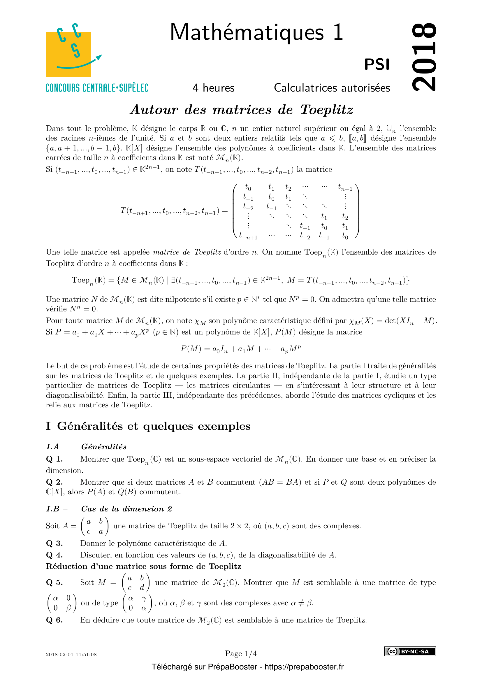 1. Montrer que \text{Toep}_n(\mathbb{C}) est un sous-espace vectoriel de \mathcal{M}_n(\mathbb{C}). En donner une base et en préciser la dimension.