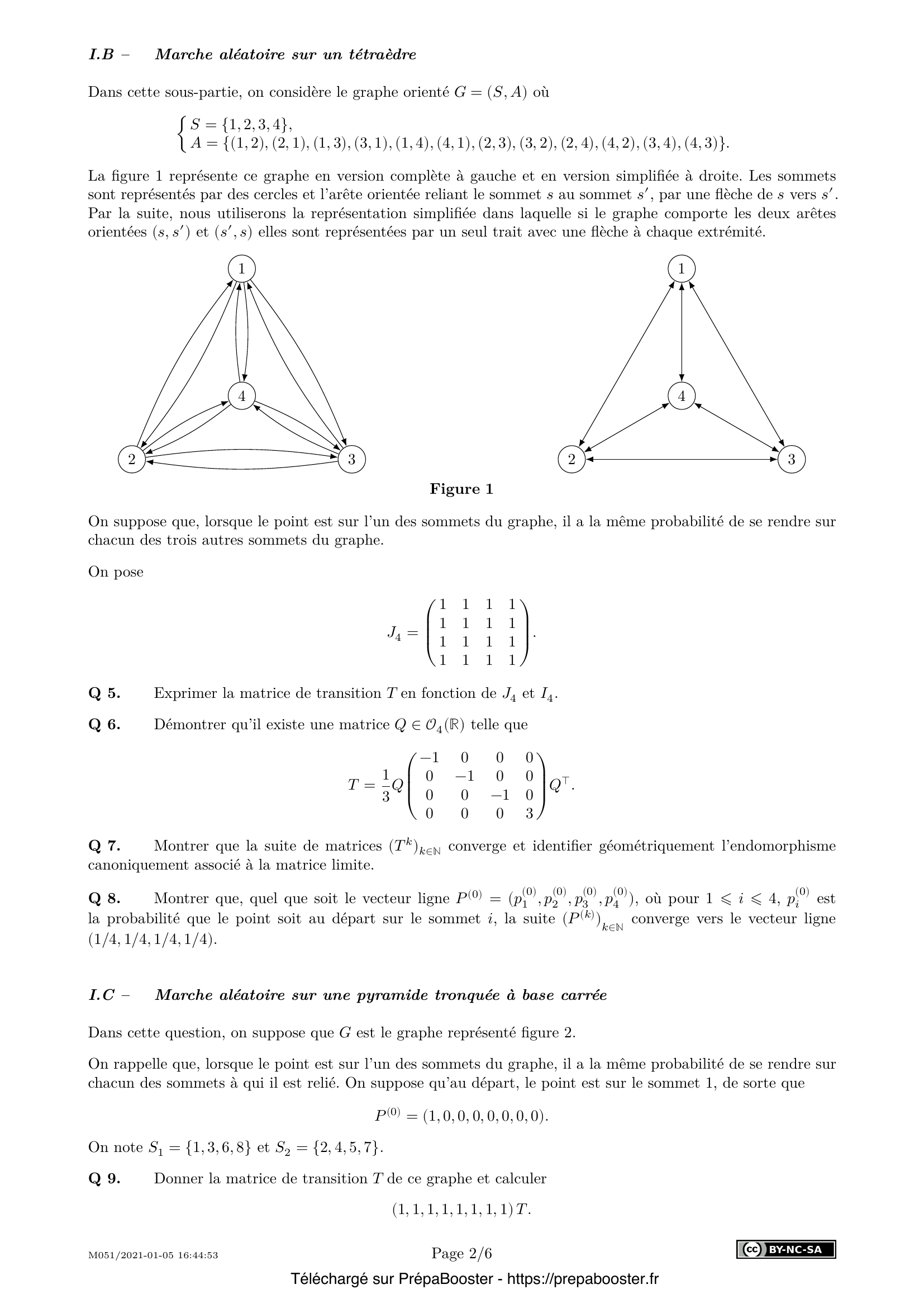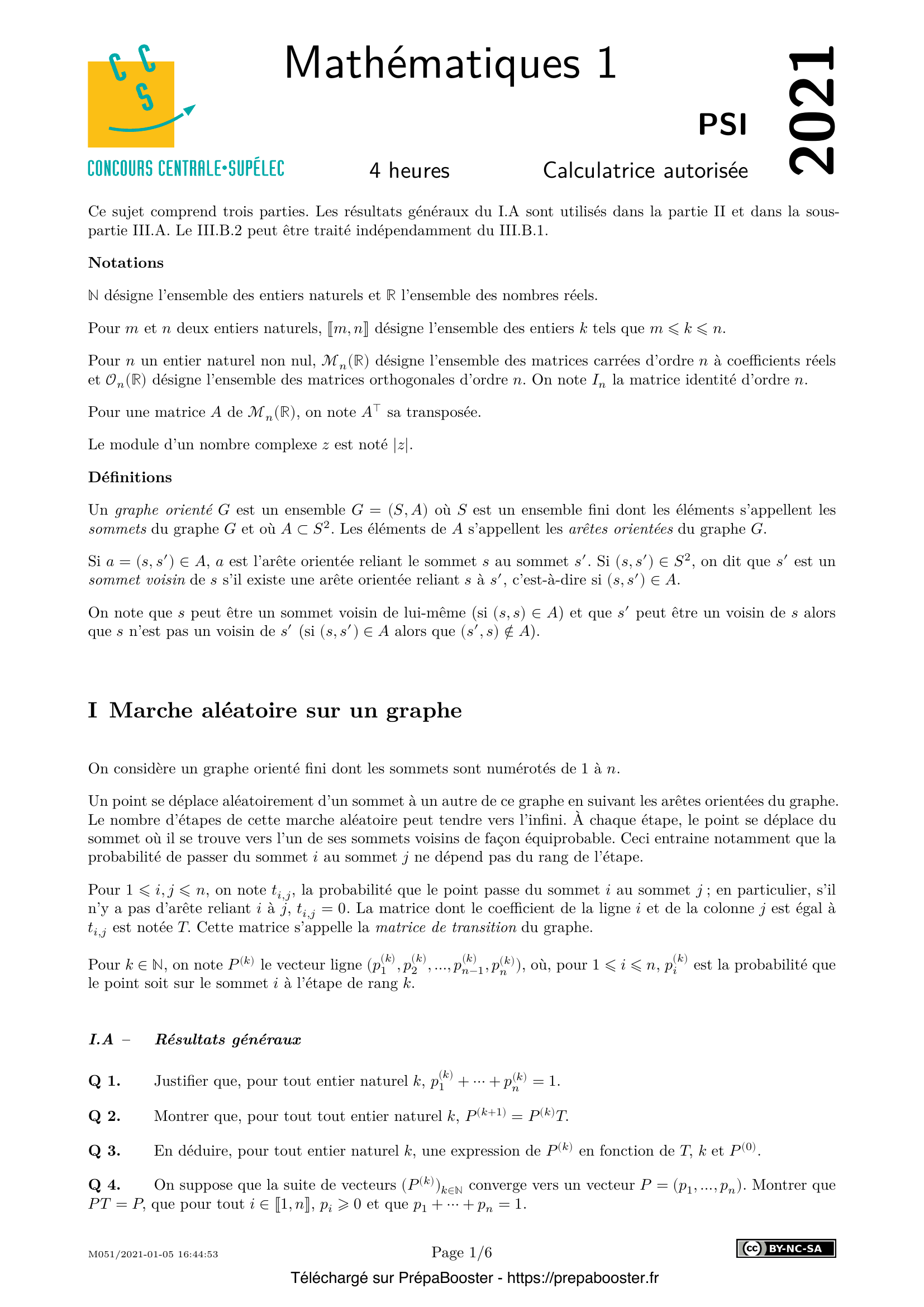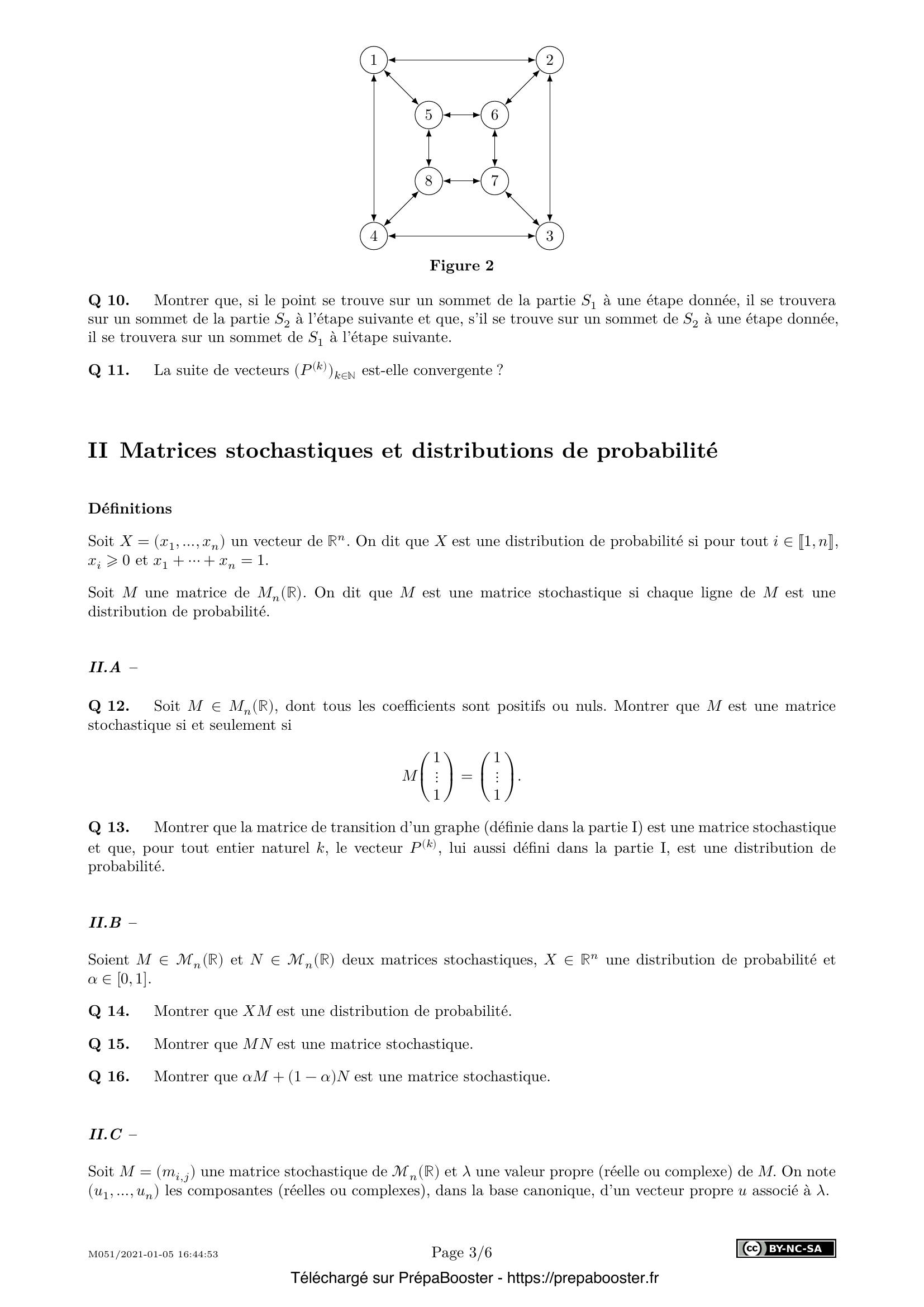 13. Montrer que la matrice de transition d’un graphe (définie dans la partie I) est une matrice stochastique et que, pour tout entier naturel $k$, le vecteur $P^{(k)}$, lui aussi défini dans la partie I, est une distribution de probabilité.