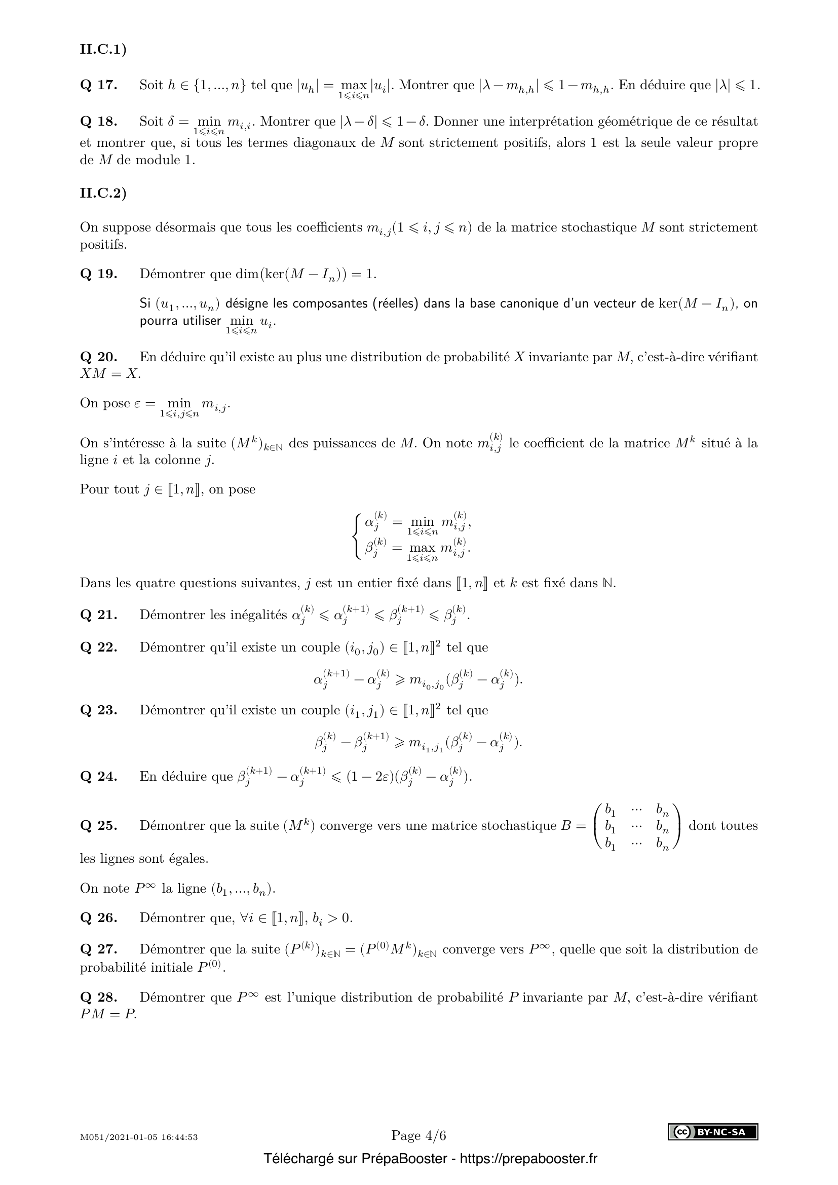 28. Démontrer que $P^\infty$ est l’unique distribution de probabilité $P$ invariante par $M$, c’est-à-dire vérifiant $PM = P$.