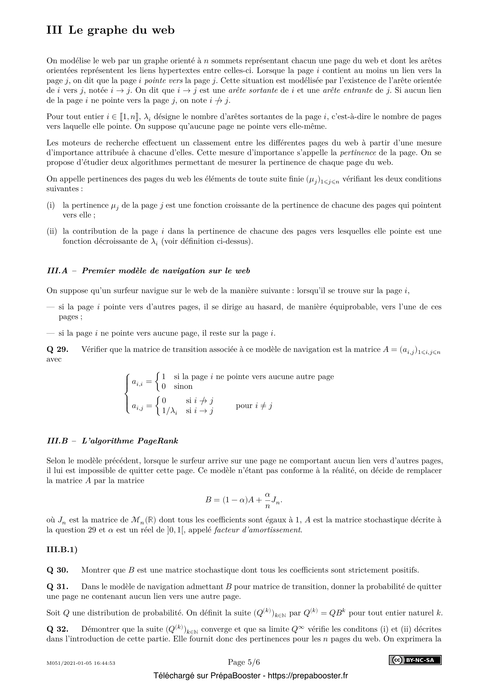 32. Démontrer que la suite $(Q^{(k)})_{k\in\mathbb{N}}$ converge et que sa limite $Q^\infty$ vérifie les conditions (i) et (ii) décrites dans l’introduction de cette partie. Elle fournit donc des pertinences pour les $n$ pages du web. On exprimera la pertinence de chaque page $j$ en fonction de celles des pages qui pointent vers elle en distinguant les pages qui pointent vers une autre page et les autres.