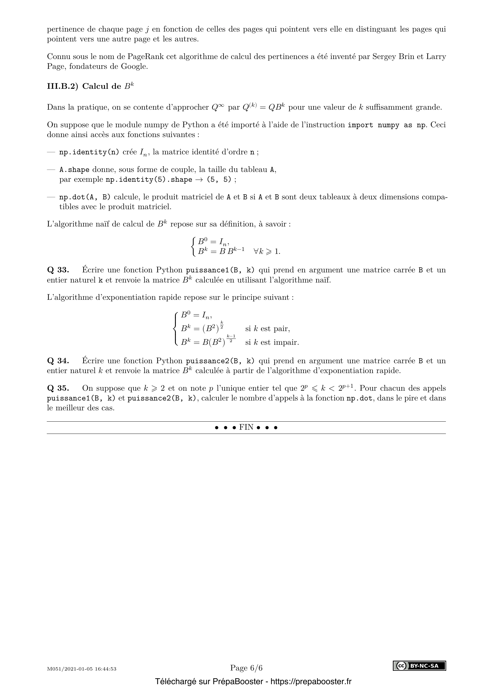 34. Écrire une fonction Python \texttt{puissance2(B, k)} qui prend en argument une matrice carrée $B$ et un entier naturel $k$ et renvoie la matrice $B^k$ calculée à partir de l’algorithme d’exponentiation rapide.