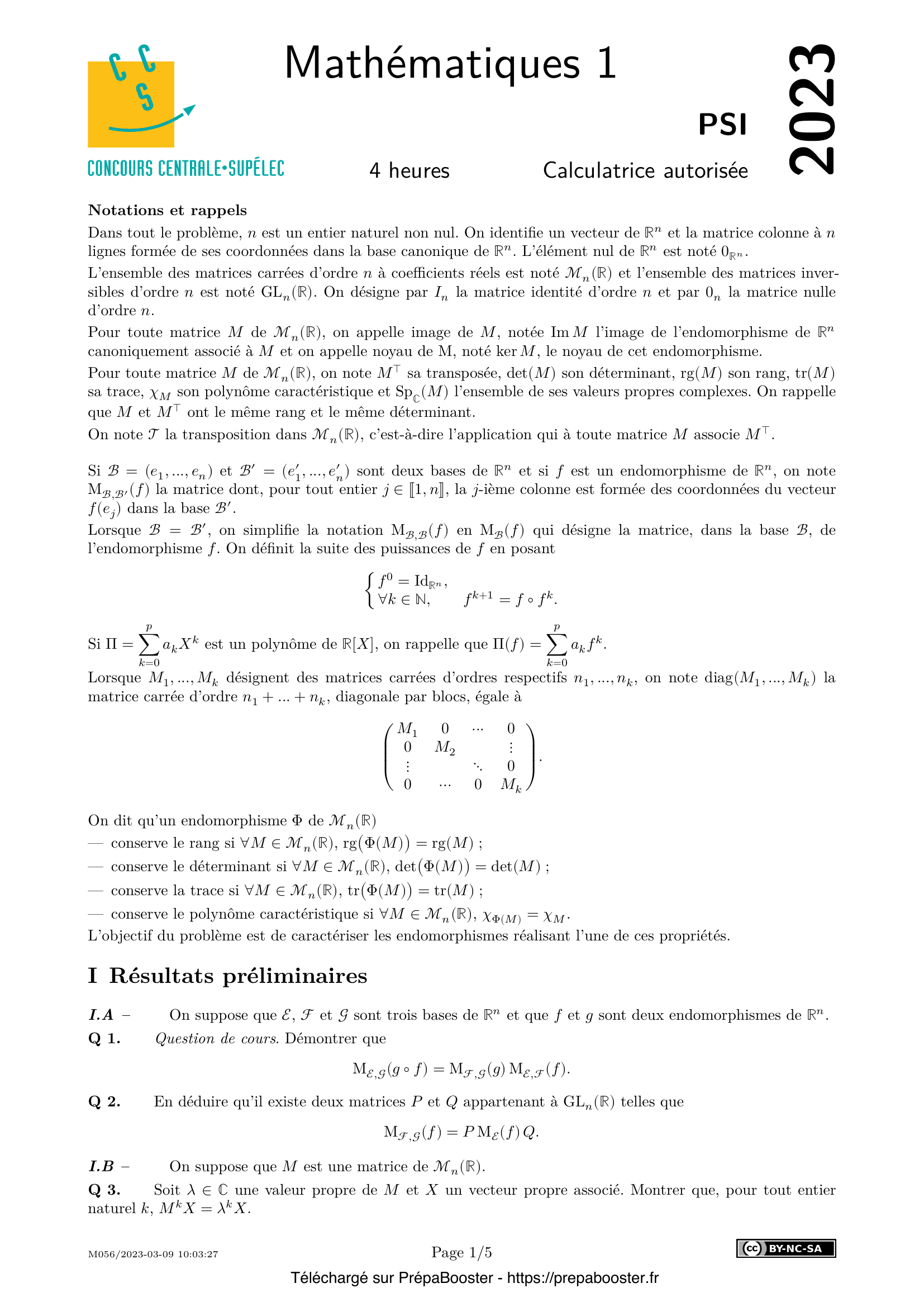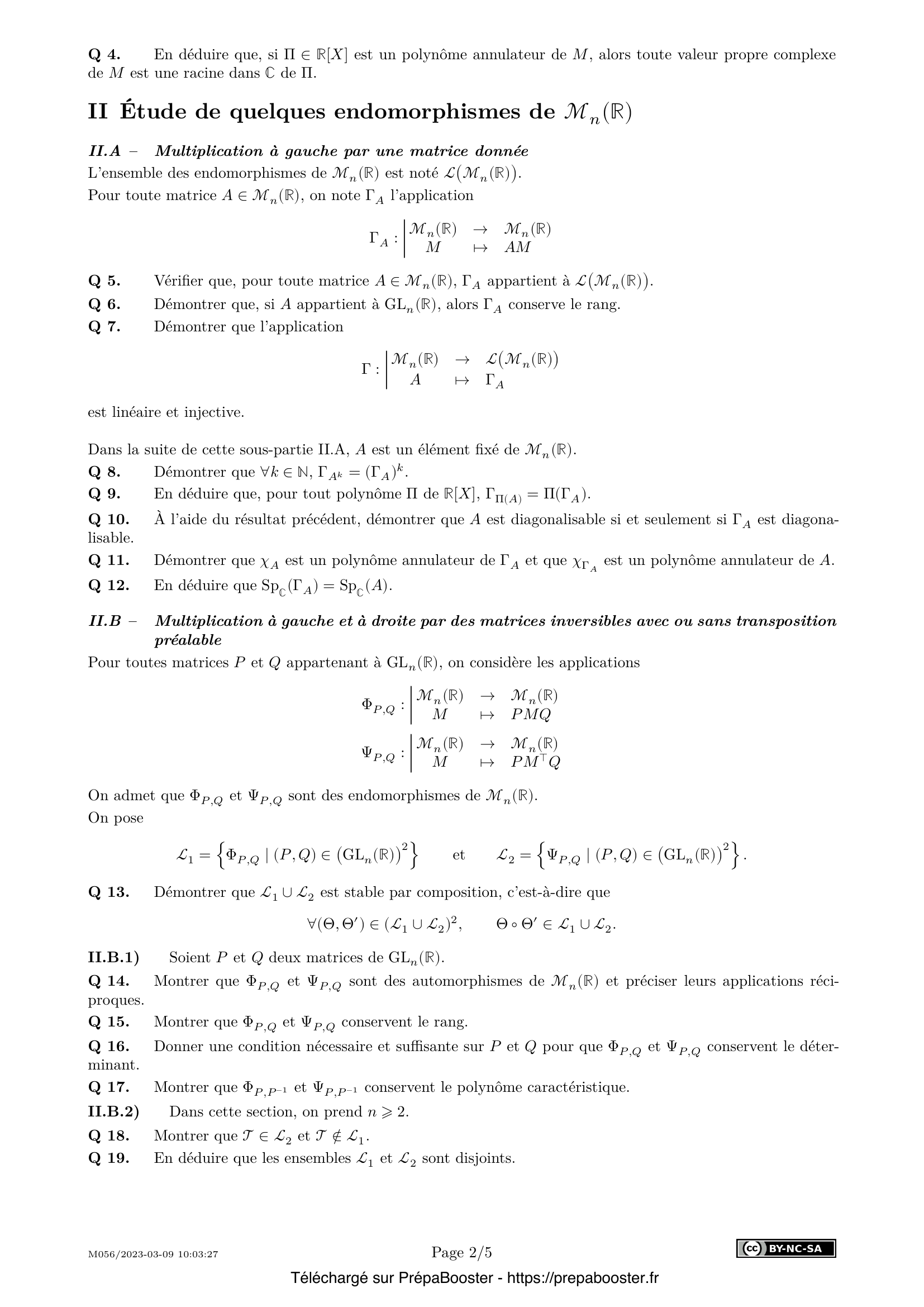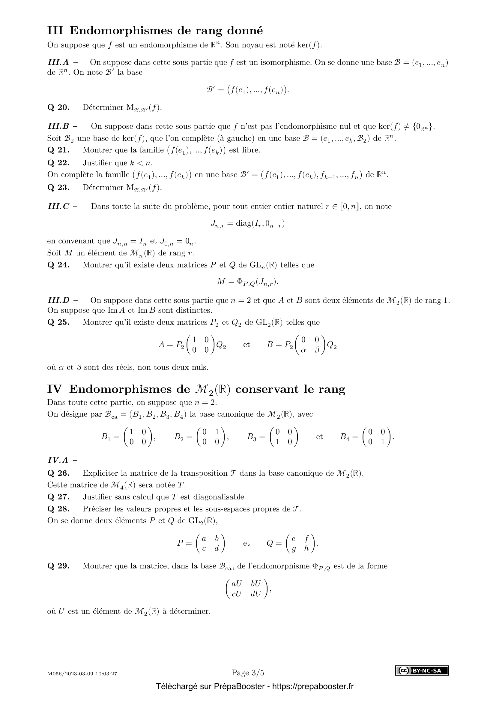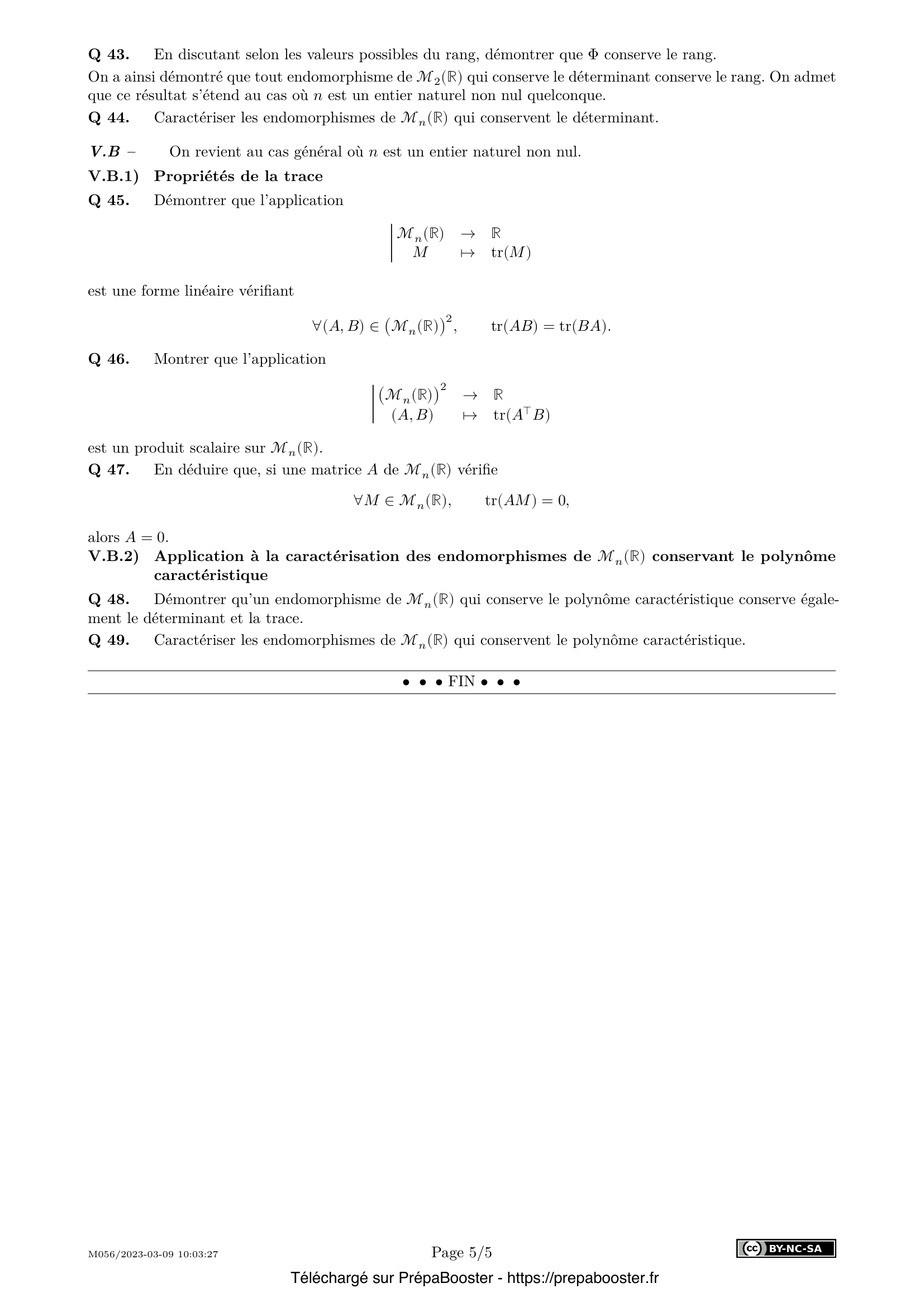 22. Justifier que $k < n$.} 23. Déterminer $M_{\mathcal{B},\mathcal{B}'}(f)$.} 24. Montrer qu’il existe deux matrices $P$ et $Q$ de $\mathrm{GL}_n(\mathbb{R})$ telles que $$M = \Phi_{P,Q}(J_{n,r}).$$} 25. Montrer qu’il existe deux matrices $P_2$ et $Q_2$ de $\mathrm{GL}_2(\mathbb{R})$ telles que $$A = P_2\begin{pmatrix}1 & 0 \\ 0 & 0\end{pmatrix}Q_2 \text{ et } B = P_2\begin{pmatrix}0 & 0 \\ \alpha & \beta\end{pmatrix}Q_2 $$ où $\alpha$ et $\beta$ sont des réels, non tous deux nuls.} 26. Expliciter la matrice de la transposition $\mathcal{T}$ dans la base canonique de $\mathcal{M}_2(\mathbb{R})$. Cette matrice de $\mathcal{M}_4(\mathbb{R})$ sera notée $T$.} 27. Justifier sans calcul que $T$ est diagonalisable.} 28. Préciser les valeurs propres et les sous-espaces propres de $\mathcal{T}$.} 29. Montrer que la matrice, dans la base $\mathcal{B}_{ca}$, de l’endomorphisme $\Phi_{P,Q}$ est de la forme $$ \begin{pmatrix} a U & b U \\ c U & d U \end{pmatrix}, $$ où $U$ est un élément de $\mathcal{M}_2(\mathbb{R})$ à déterminer.} 30. Montrer que $\Phi$ est un automorphisme de $\mathcal{M}_2(\mathbb{R})$.} 31. Déterminer les rangs de $\Phi(B_1)$, $\Phi(B_4)$, $\Phi(B_1+B_4)$. En déduire l’existence de deux matrices $P_1$ et $Q_1$ de $\mathrm{GL}_2(\mathbb{R})$, telles que : $$ \Phi_{P_1,Q_1} \circ \Phi(B_1) = \begin{pmatrix}1 & 0\\0 & 0\end{pmatrix} \quad\text{et}\quad \Phi_{P_1,Q_1} \circ \Phi(B_4) = \begin{pmatrix}0 & 0 \\ \alpha & \beta\end{pmatrix} $$ où $\alpha$ et $\beta$ sont des réels tels que $(\alpha, \beta)\neq (0,0)$.} 32. Déterminer $C_1$ et $C_4$.} 33. Démontrer que $\forall i \in \{1,2,3,4\}$, $a_i d_i - b_i c_i = 0$.} 34. En considérant le rang des matrices $B_1'+B_2'$ et $B_1'+B_3'$, démontrer que $d_2 = d_3 = 0$. On déduit des deux questions précédentes que $b_2 c_2 = b_3 c_3 = 0$.} 35. En étudiant $\det(M')$, démontrer que les nombres $b_2,\, c_3,\, d_4$ sont tous trois non nuls.} 36. En utilisant les résultats de la question précédente et en considérant les rangs des matrices $B_3'+B_4'$, $B_2'+B_4'$, et $B_1'+B_2'+B_3'+B_4'$, démontrer que $$ M' = \begin{pmatrix} 1 & a_2 & 0 & 0\\ 0 & b_2 & 0 & 0 \\ 0 & 0 & c_3 & c_4 \\ 0 & 0 & 0 & d_4 \end{pmatrix} $$ avec $c_4 = a_2 c_3$ et $d_4 = b_2 c_3$.} 37. En déduire que $\Phi$ appartient à $\mathcal{L}_1$.} 38. On suppose à présent que $c_2 \neq 0$. Démontrer que la matrice, dans la base $\mathcal{B}_{ca}$, de l’endomorphisme $\Phi' \circ \mathcal{T}$ de $\mathcal{M}_2(\mathbb{R})$ est égale à $$ \begin{pmatrix} 1 & a_3 & a_2 & 0\\ 0 & b_3 & 0 & 0\\ 0 & c_3 & c_2 & c_4\\ 0 & 0 & 0 & d_4 \end{pmatrix} $$ .} 39. Démontrer que $c_3 = 0$.} 40. En déduire que $\Phi$ appartient à $\mathcal{L}_2$.} 41. Montrer que $A$ est de rang $1$.} 42. En calculant de deux manières différentes $\det(A+N)$, aboutir à une absurdité et conclure que $\Phi$ est un automorphisme de $\mathcal{M}_2(\mathbb{R})$.} 43. En discutant selon les valeurs possibles du rang, démontrer que $\Phi$ conserve le rang.} 44. Caractériser les endomorphismes de $\mathcal{M}_n(\mathbb{R})$ qui conservent le déterminant.} 45. Démontrer que l’application $$ \begin{array}{l|l} \mathcal{M}_n(\mathbb{R}) & \to \mathbb{R}\\ M & \mapsto \mathrm{tr}(M) \end{array} $$ est une forme linéaire vérifiant $\forall (A, B) \in (\mathcal{M}_n(\mathbb{R}))^2,\, \mathrm{tr}(AB)=\mathrm{tr}(BA)$.} 46. Montrer que l’application $$ \begin{array}{l|l} (\mathcal{M}_n(\mathbb{R}))^2 & \to \mathbb{R}\\ (A,B) & \mapsto \mathrm{tr}(A^T B) \end{array} $$ est un produit scalaire sur $\mathcal{M}_n(\mathbb{R})$.} 47. En déduire que, si une matrice $A$ de $\mathcal{M}_n(\mathbb{R})$ vérifie $\forall M\in \mathcal{M}_n(\mathbb{R}),\ \mathrm{tr}(A M) = 0$, alors $A=0$.} 48. Démontrer qu’un endomorphisme de $\mathcal{M}_n(\mathbb{R})$ qui conserve le polynôme caractéristique conserve également le déterminant et la trace.} 49. Caractériser les endomorphismes de $\mathcal{M}_n(\mathbb{R})$ qui conservent le polynôme caractéristique.}