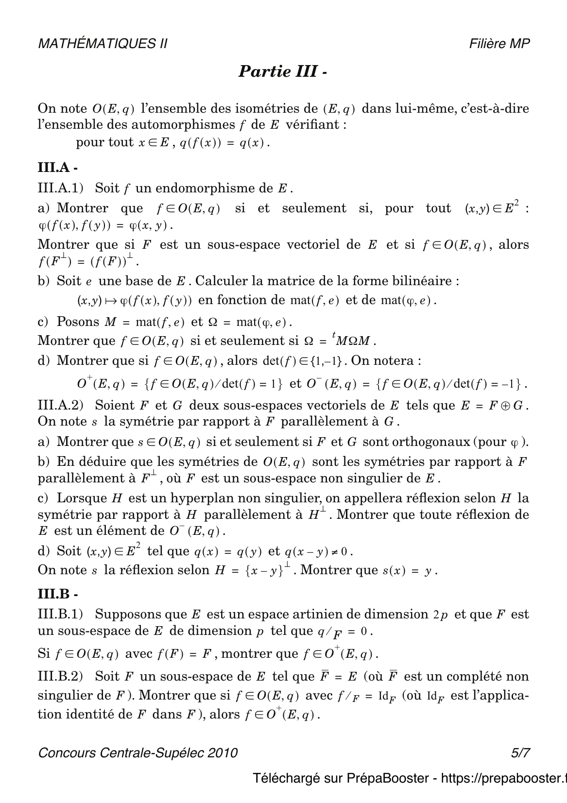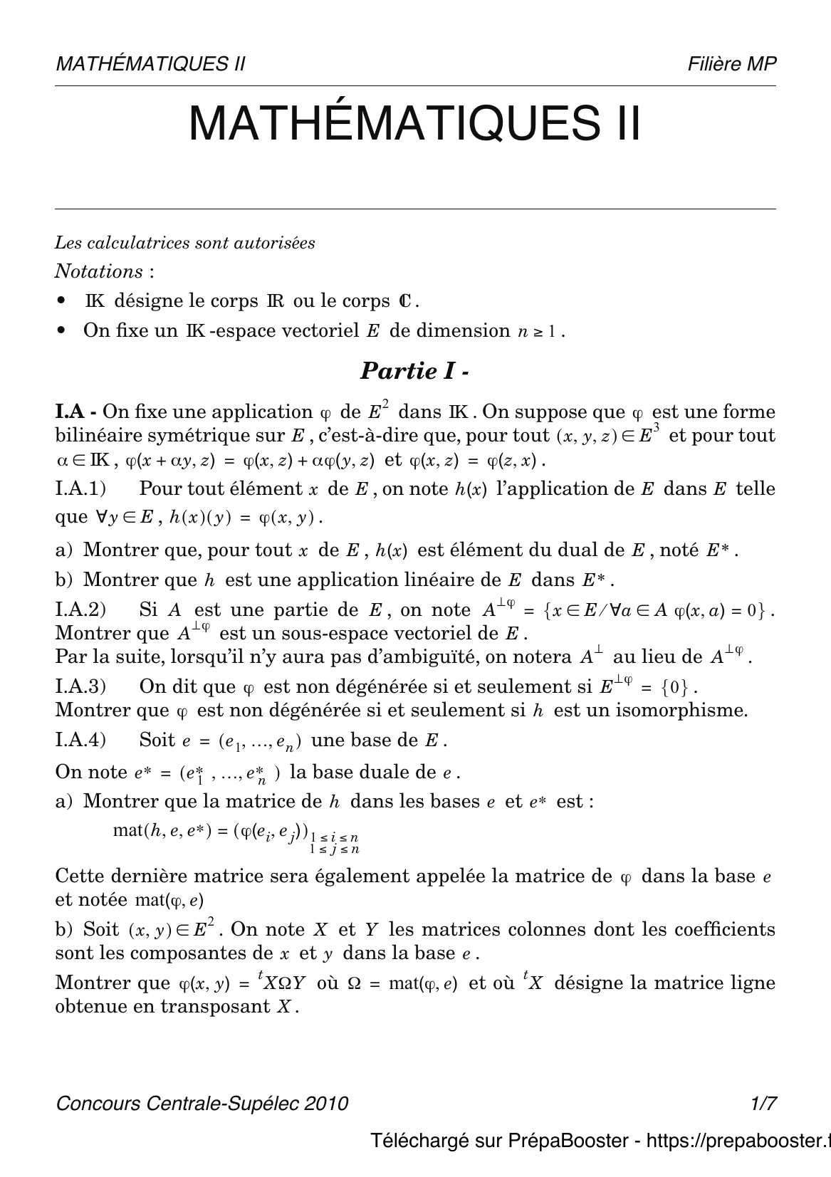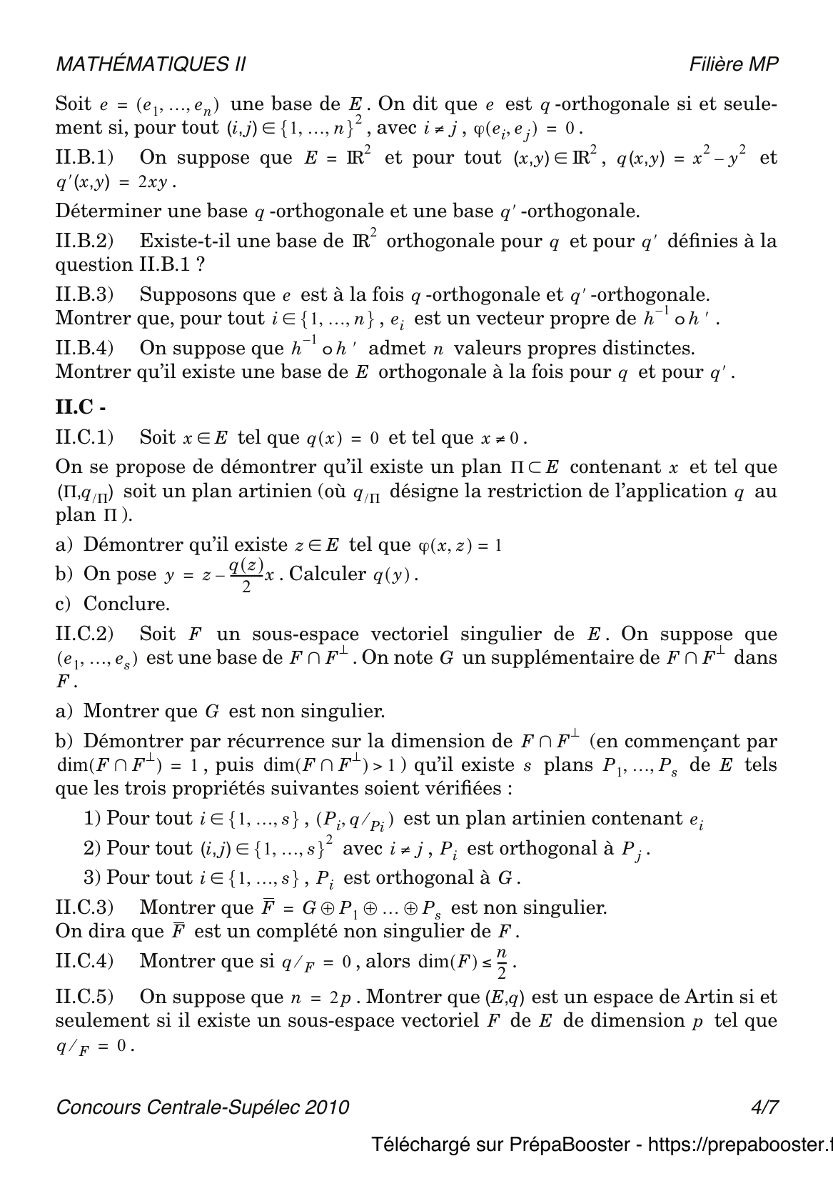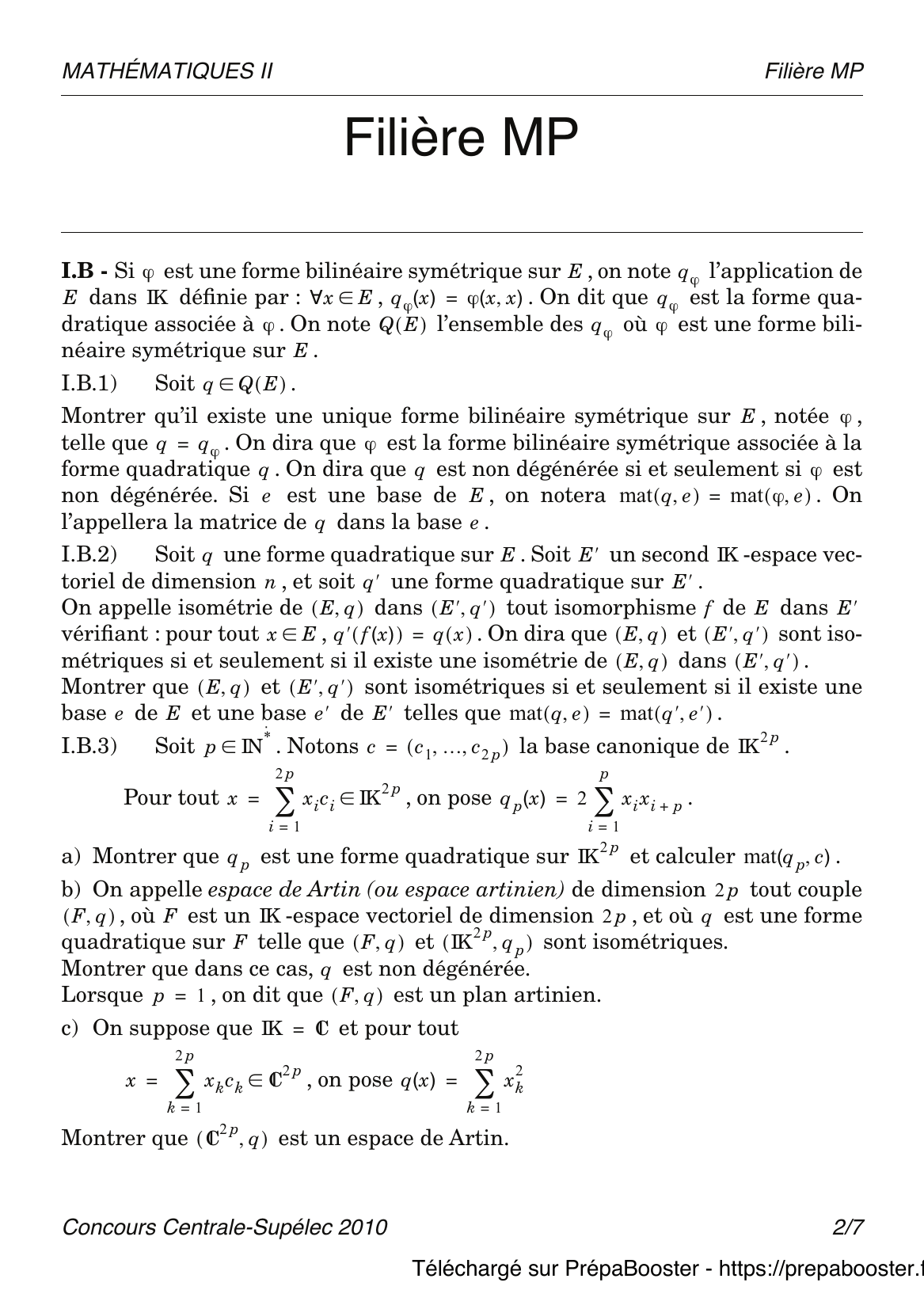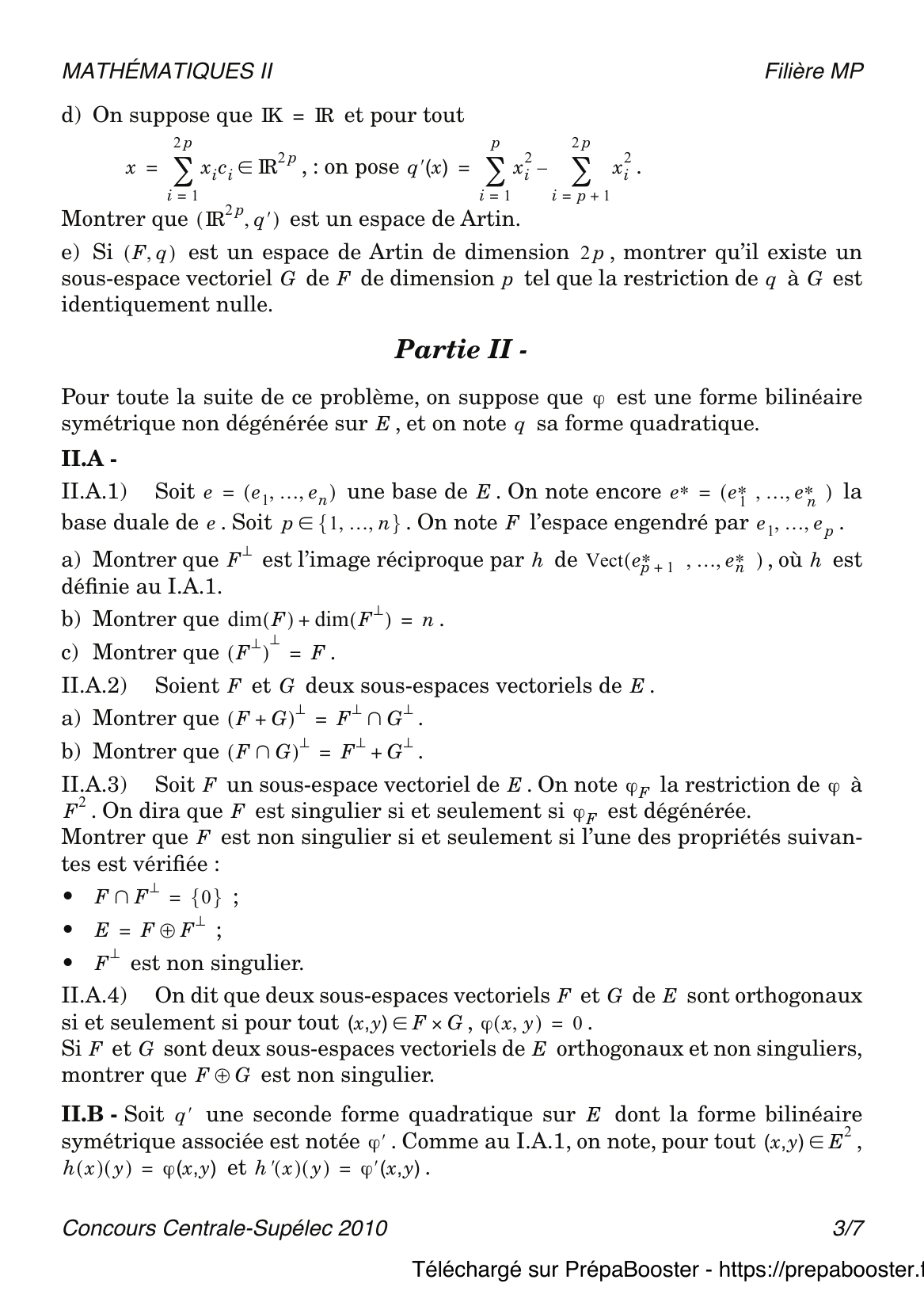 1. I.A.1) Pour tout élément $x$ de $E$, on note $h_x$ l’application de $E$ dans $IK$ telle que $h_x(y) = \varphi(x, y)$, $\forall y \in E$.\\ a) Montrer que, pour tout $x$ de $E$, $h_x$ est élément du dual de $E$, noté $E^*$.\\ b) Montrer que $h$ est une application linéaire de $E$ dans $E^*$.} 2. I.A.2) Si $A$ est une partie de $E$, on note $A^\perp = \{x \in E ~|~ \forall a \in A,~ \varphi(x, a) = 0\}$.\\ Montrer que $A^\perp$ est un sous-espace vectoriel de $E$.} 3. I.A.3) On dit que $\varphi$ est non dégénérée si et seulement si $E^{\perp} = \{0\}$.\\ Montrer que $\varphi$ est non dégénérée si et seulement si $h$ est un isomorphisme.} 4. I.A.4) Soit $\mathcal{e} = (e_1, \dots, e_n)$ une base de $E$. \\ On note $(e^*_1, \dots, e^*_n)$ la base duale de $E^*$.\\ a) Montrer que la matrice de $h$ dans les bases $\mathcal{e}$ et $(e^*_i)$ est : \\ Cette dernière matrice sera également appelée la matrice de $\varphi$ dans la base $\mathcal{e}$ et notée $\mat(\varphi, \mathcal{e})$.\\ b) Soit $x, y \in E$. On note $X, Y$ les matrices colonnes dont les coefficients sont les composantes de $x$ et $y$ dans la base $\mathcal{e}$.\\ Montrer que $\varphi(x, y) = X^t \Omega Y$ où $\Omega = \mat(\varphi, \mathcal{e})$ et où $X^t$ désigne la matrice ligne obtenue en transposant $X$.} 5. I.B.1) Soit $q \in Q_E$.\\ Montrer qu’il existe une unique forme bilinéaire symétrique sur $E$, notée $\varphi_q$, telle que $q = q_{\varphi_q}$. On dira que $\varphi_q$ est la forme bilinéaire symétrique associée à la forme quadratique $q$. On dira que $q$ est non dégénérée si et seulement si $\varphi_q$ est non dégénérée. Si $\mathcal{e}$ est une base de $E$, on notera $\mat(q,\mathcal{e}) = \mat(\varphi_q,\mathcal{e})$. On l’appellera la matrice de $q$ dans la base $\mathcal{e}$.} 6. I.B.2) Soit $q$ une forme quadratique sur $E$. Soit un second $IK$-espace vectoriel $F$ de dimension $n$, et soit $q’$ une forme quadratique sur $F$.\\ On appelle isométrie de $E$ dans $F$ tout isomorphisme $f : E \to F$ vérifiant : pour tout $x \in E,~ q'(f(x)) = q(x)$. On dira que $(E, q)$ et $(F, q’)$ sont isométriques si et seulement si il existe une isométrie de $E$ dans $F$.\\ Montrer que $(E, q)$ et $(F, q’)$ sont isométriques si et seulement si il existe une base $\mathcal{e}$ de $E$ et une base $\mathcal{e}’$ de $F$ telles que $\mat(q, \mathcal{e}) = \mat(q’, \mathcal{e}’)$.} 7. I.B.3) Soit $p \in \mathbb{N}^*$. Notons $\mathcal{c} = (c_1, \dots, c_{2p})$ la base canonique de $IK^{2p}$.\\ Pour tout $x = (x_i)_{1 \leq i \leq 2p} \in IK^{2p}$, on pose $q_p(x) = \sum_{i=1}^p x_i^2 – \sum_{i=p+1}^{2p} x_i^2$.\\ a) Montrer que $q_p$ est une forme quadratique sur $IK^{2p}$ et calculer $\mat(q_p, \mathcal{c})$.\\ b) On appelle espace de Artin (ou espace artinien) de dimension $2p$ tout couple $(F, q)$, où $F$ est un $IK$-espace vectoriel de dimension $2p$, et où $q$ est une forme quadratique sur $F$ telle que $(F, q)$ et $(IK^{2p}, q_p)$ sont isométriques. Montrer que dans ce cas, $q$ est non dégénérée. Lorsque $p = 1$, on dit que $(F, q)$ est un plan artinien.\\ c) On suppose que $IK = \mathbb{C}$ et, pour tout $x = (x_k)_{1 \leq k \leq 2p} \in \mathbb{C}^{2p}$, on pose $q(x) = \sum_{k=1}^{2p} x_k^2$. Montrer que $(\mathbb{C}^{2p}, q)$ est un espace de Artin.} 8. I.B.3)\\ d) On suppose que $IK = \mathbb{R}$ et, pour tout $x = (x_i)_{1 \leq i \leq 2p} \in \mathbb{R}^{2p}$, : on pose $q'(x) = \sum_{i=1}^p x_i^2 – \sum_{i=p+1}^{2p} x_i^2$.\\ Montrer que $(\mathbb{R}^{2p}, q’)$ est un espace de Artin.} 9. I.B.3)\\ e) Si $(F, q)$ est un espace de Artin de dimension $2p$, montrer qu’il existe un sous-espace vectoriel $G$ de $F$ de dimension $p$ tel que la restriction de $q$ à $G$ est identiquement nulle.} 10. II.A.1) Soit $\mathcal{e} = (e_1, \ldots, e_n)$ une base de $E$. On note encore $(e_1^*, \ldots, e_n^*)$ la base duale de $E^*$. Soit $F = \text{Vect}(e_1, \ldots, e_p)$.\\ a) Montrer que $F^\perp$ est l’image réciproque par $h$ de $\text{Vect}(e_{p+1}^*, \ldots, e_n^*)$, où $h$ est définie au I.A.1.\\ b) Montrer que $\dim(F) + \dim(F^\perp) = n$.\\ c) Montrer que $(F^\perp)^\perp = F$.} 11. II.A.2) Soient $F$ et $G$ deux sous-espaces vectoriels de $E$.\\ a) Montrer que $(F + G)^\perp = F^\perp \cap G^\perp$.\\ b) Montrer que $(F \cap G)^\perp = F^\perp + G^\perp$.} 12. II.A.3) Soit $F$ un sous-espace vectoriel de $E$. On note $\varphi_F$ la restriction de $\varphi$ à $F$. On dira que $F$ est singulier si et seulement si $\varphi_F$ est dégénérée.\\ Montrer que $F$ est non singulier si et seulement si l’une des propriétés suivantes est vérifiée :\\ • $F \cap F^\perp = \{0\}$;\\ • $E = F \oplus F^\perp$;\\ • $F^\perp$ est non singulier.} 13. II.A.4) On dit que deux sous-espaces vectoriels $F$ et $G$ de $E$ sont orthogonaux si et seulement si, pour tout $(x, y) \in F \times G$, $\varphi(x, y) = 0$.\\ Si $F$ et $G$ sont deux sous-espaces vectoriels de $E$ orthogonaux et non singuliers, montrer que $F \oplus G$ est non singulier.} 14. II.B.1) On suppose que $\varphi$ est une forme bilinéaire symétrique non dégénérée sur $E$, et on note $q$ sa forme quadratique.\\ Soit $q^\prime$ une seconde forme quadratique sur $E$ dont la forme bilinéaire symétrique associée est notée $\varphi^\prime$. Comme au I.A.1, on note, pour tout $x \in E,~ h(x)(y) = \varphi(x, y)$, $h^\prime(x)(y) = \varphi^\prime(x, y)$.\\ Soit $\mathcal{e} = (e_1, \dots, e_n)$ une base de $E$. On dit que $\mathcal{e}$ est $\varphi$-orthogonale si et seulement si, pour tout $(i, j) \in \{1, \dots, n\}^2$, $i \neq j$, $\varphi(e_i, e_j) = 0$.\\ On suppose que $E = \mathbb{R}^2$ et, pour tout $(x, y) \in \mathbb{R}^2$, $q(x, y) = x^2 – y^2$, $q'(x, y) = 2xy$.\\ Déterminer une base $\varphi$-orthogonale et une base $\varphi’$-orthogonale.} 15. II.B.2) Existe-t-il une base de $E$ orthogonale pour $\varphi$ et pour $\varphi’$ définies à la question II.B.1 ?} 16. II.B.