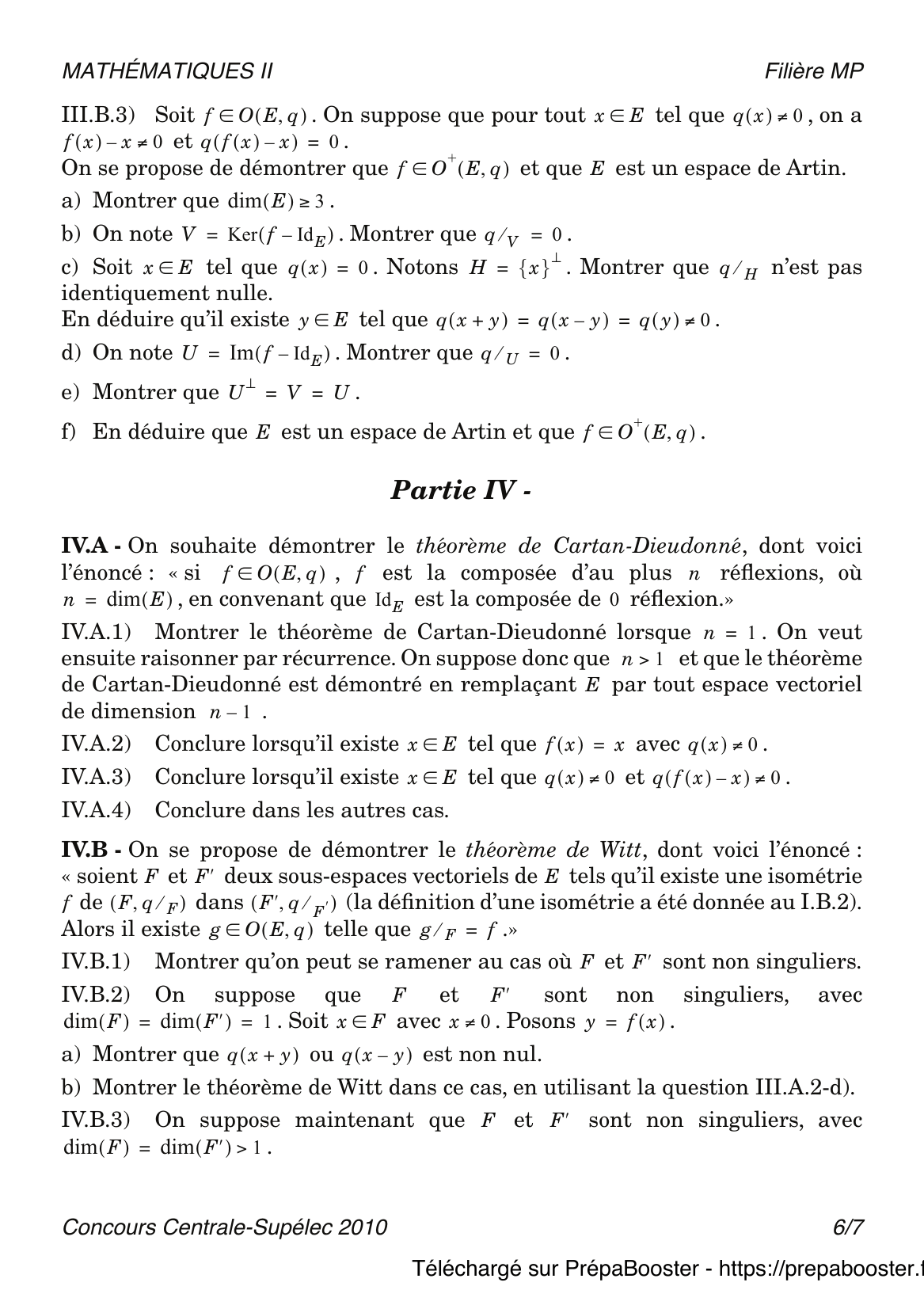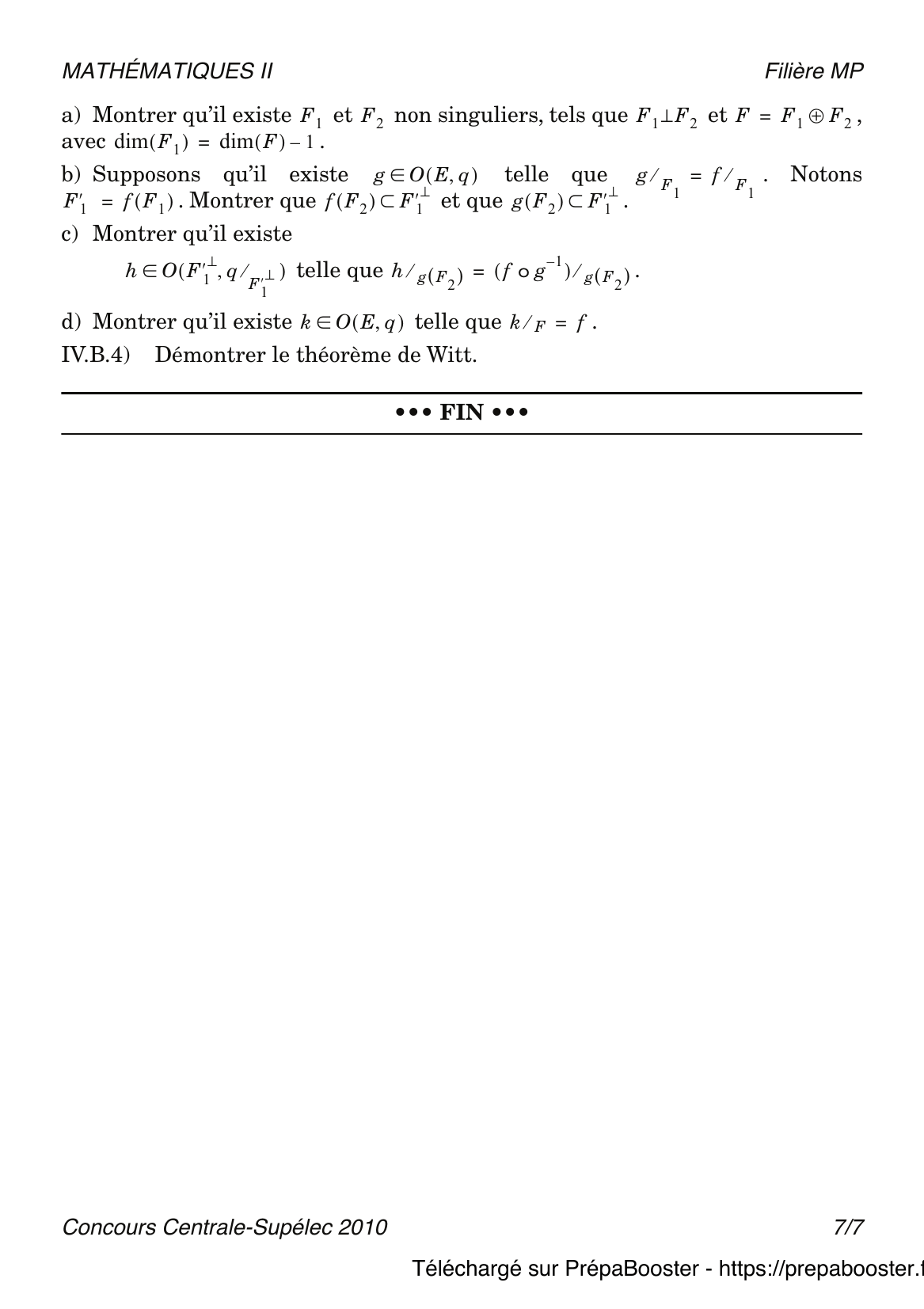 Le théorème de Witt te permet de comprendre comment deux formes quadratiques non dégénérées peuvent être reliées par une isométrie, c’est la base de toute la classification des formes quadratiques. Le théorème de Cartan-Dieudonné, quant à lui, explique que toute isométrie d’un espace quadratique non dégénéré peut s’exprimer comme produit d’un nombre fini de réflexions. Ces résultats sont incontournables et régulièrement sollicités tant en questions de cours qu’en résolution complète au concours. Tu retrouveras des applications concrètes de ces théorèmes dans le corrigé complet de l’épreuve, accessible sur Prépa Booster !
