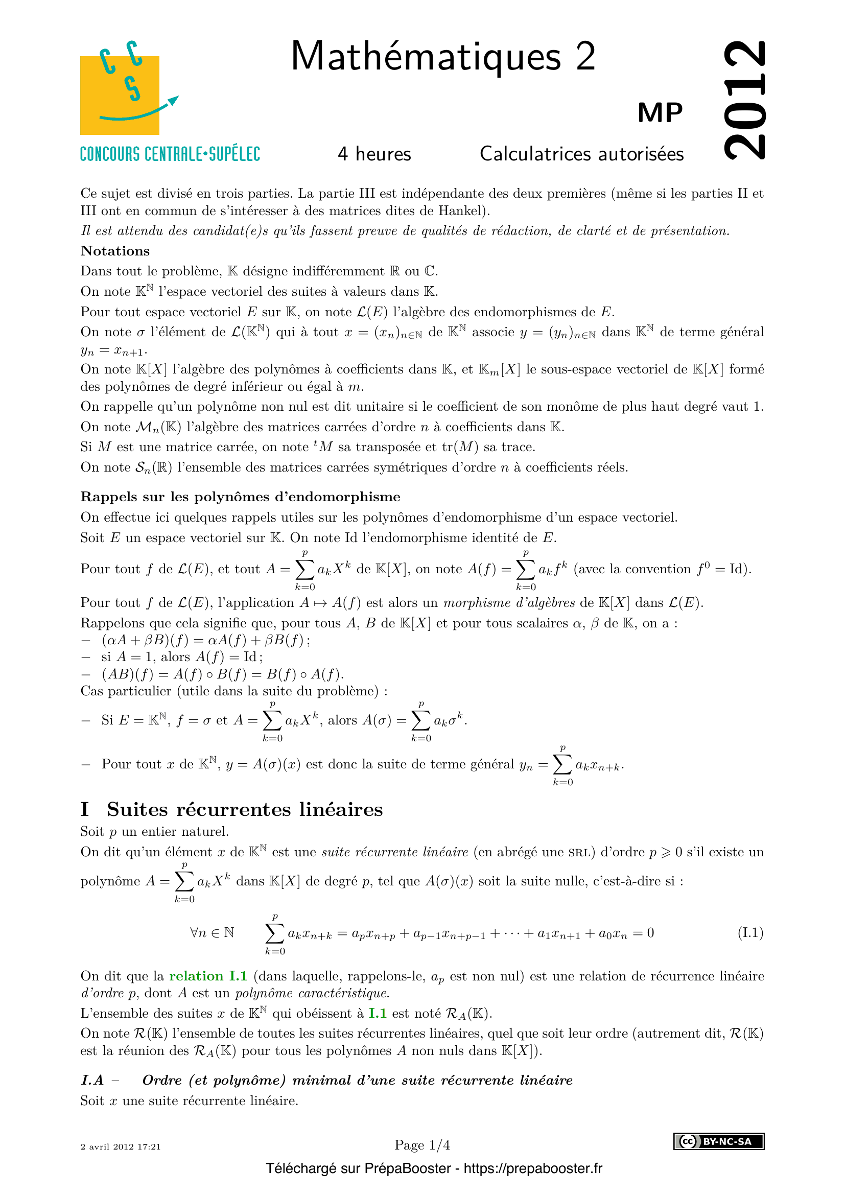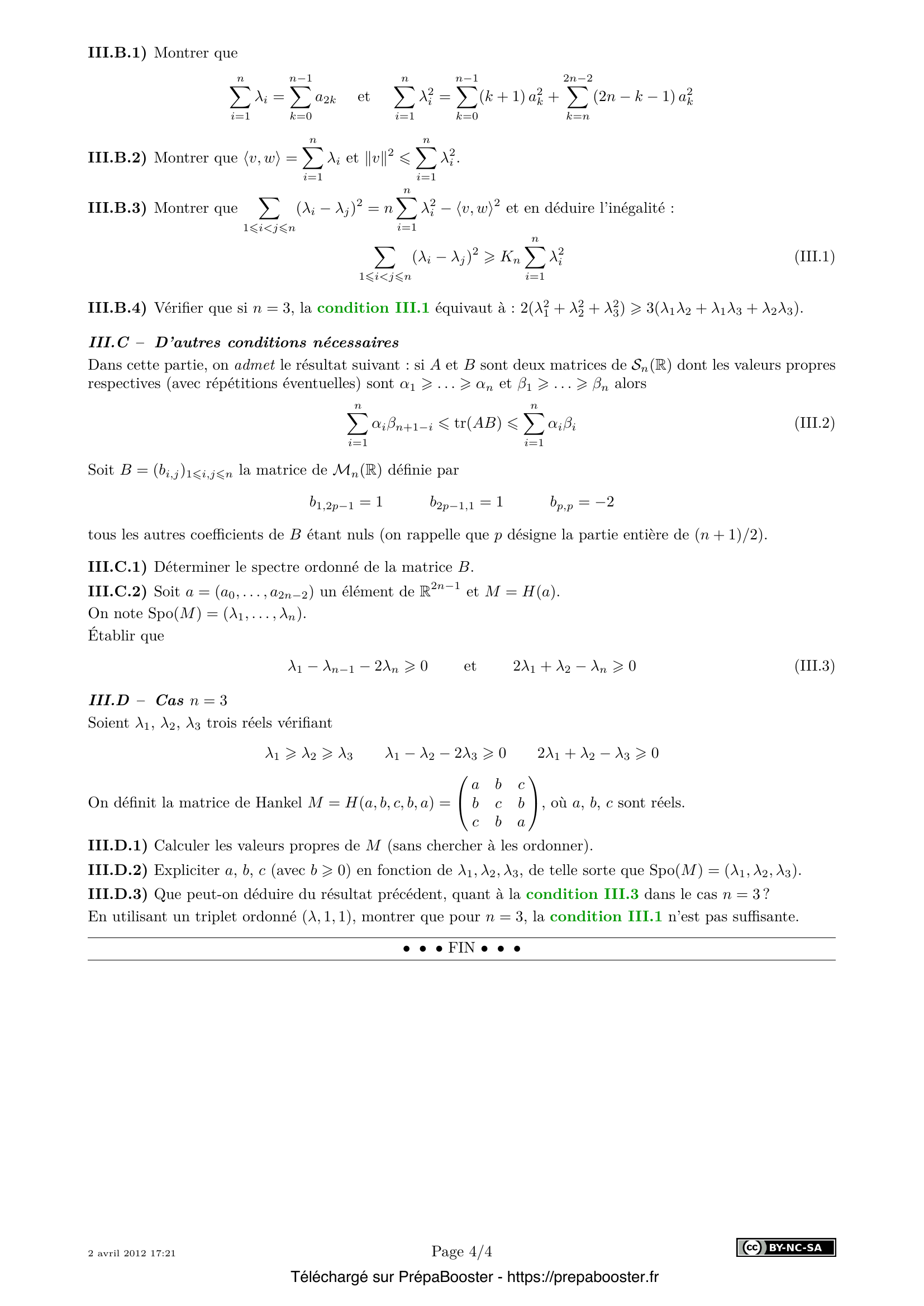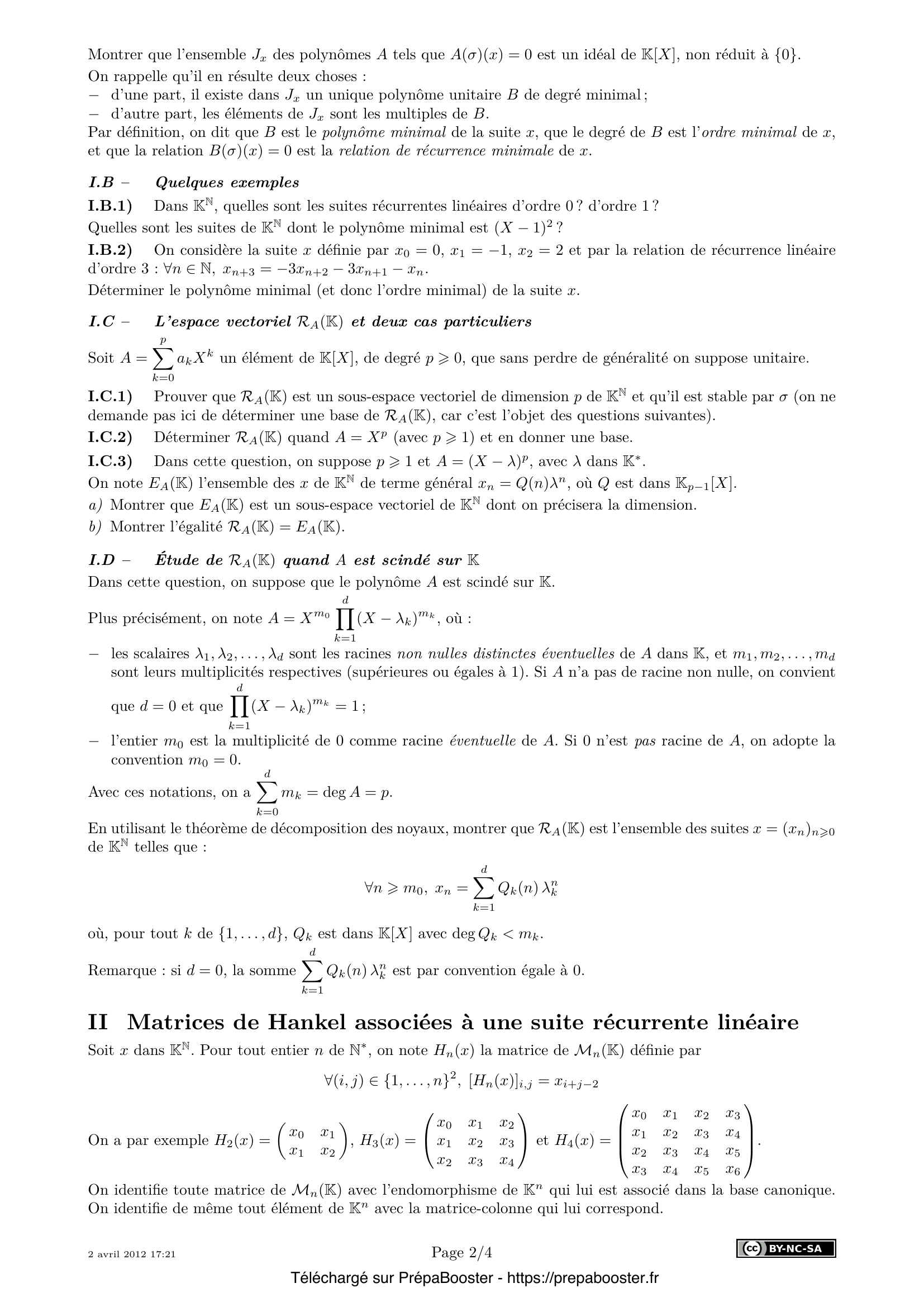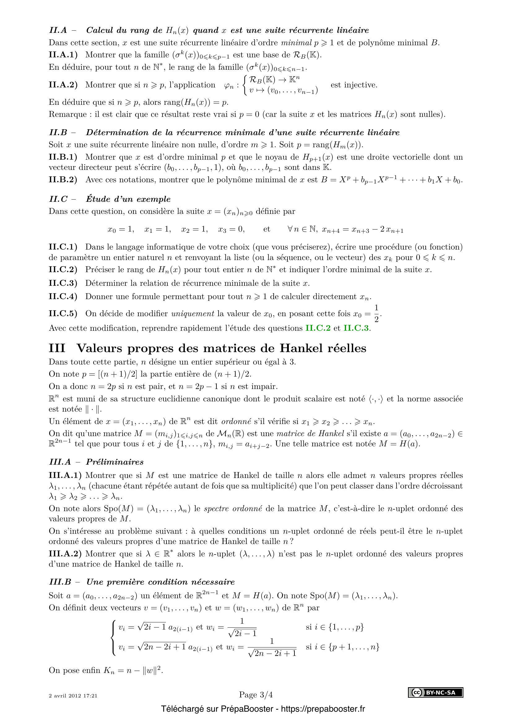 1. Montrer que l’ensemble $J_x$ des polynômes $A$ tels que $A(\sigma)(x) = 0$ est un idéal de $K[X]$, non réduit à $\{0\}$. 2. Dans $K^{\mathbb{N}}$, quelles sont les suites récurrentes linéaires d’ordre $0$ ? d’ordre $1$ ? Quelles sont les suites de $K^{\mathbb{N}}$ dont le polynôme minimal est $(X-1)^2$ ? 3. On considère la suite $x$ définie par $x_0 = 0$, $x_1 = -1$, $x_2 = 2$ et par la relation de récurrence linéaire d’ordre $3$ : $\forall n \in \mathbb{N},\ x_{n+3} = -3x_{n+2} – 3x_{n+1} – x_n$. Déterminer le polynôme minimal (et donc l’ordre minimal) de la suite $x$. 4. Prouver que $R_A(K)$ est un sous-espace vectoriel de dimension $p$ de $K^{\mathbb{N}}$ et qu’il est stable par $\sigma$ (on ne demande pas ici de déterminer une base de $R_A(K)$, car c’est l’objet des questions suivantes). 5. Déterminer $R_A(K)$ quand $A = X^p$ (avec $p > 1$) et en donner une base.} 6. Dans cette question, on suppose $p > 1$ et $A = (X – \lambda)^p$, avec $\lambda$ dans $K^\ast$. On note $E_A(K)$ l’ensemble des $x$ de $K^{\mathbb{N}}$ de terme général $x_n = Q(n)\lambda^n$, où $Q$ est dans $K_{p-1}[X]$. \begin{itemize} \item[a)] Montrer que $E_A(K)$ est un sous-espace vectoriel de $K^{\mathbb{N}}$ dont on précisera la dimension. \item[b)] Montrer l’égalité $R_A(K) = E_A(K)$. \end{itemize} 7. Dans cette question, on suppose que le polynôme $A$ est scindé sur $K$. Plus précisément, on note $A = X^{m_0} \prod_{k=1}^d (X-\lambda_k)^{m_k}$, où : \begin{itemize} \item les scalaires $\lambda_1, \ldots, \lambda_d$ sont les racines non nulles distinctes éventuelles de $A$ dans $K$, et $m_1, \ldots, m_d$ sont leurs multiplicités respectives (supérieures ou égales à 1). Si $A$ n’a pas de racine non nulle, on convient que $d = 0$ et que $\prod_{k=1}^d (X-\lambda_k)^{m_k}=1$ ; \item l’entier $m_0$ est la multiplicité de $0$ comme racine éventuelle de $A$. Si $0$ n’est pas racine de $A$, on adopte la convention $m_0 = 0$. \end{itemize} Avec ces notations, on a $\sum_{k=0}^d m_k = \deg A = p$. En utilisant le théorème de décomposition des noyaux, montrer que $R_A(K)$ est l’ensemble des suites $x = (x_n)_{n \geq 0}$ de $K^{\mathbb{N}}$ telles que : \[\forall n > m_0, \quad x_n = \sum_{k=1}^d Q_k(n)\lambda_k^n\] où, pour tout $k$ de $\{1,\ldots,d\}$, $Q_k$ est dans $K[X]$ avec $\deg Q_k < m_k$. 8. Montrer que la famille $(\sigma^k(x))_{0 \leq k \leq p-1}$ est une base de $R_B(K)$. En déduire, pour tout $n$ de $\mathbb{N}^\ast$, le rang de la famille $(\sigma^k(x))_{0 \leq k \leq n-1}$. 9. Montrer que si $n > p$, l’application $\varphi_n : \left\{\begin{array}{ccc} R_B(K) &\to& K^n \\ v &\mapsto& (v_0,\ldots,v_{n-1}) \end{array}\right.$ est injective. En déduire que si $n > p$, alors $\mathrm{rang}(H_n(x)) = p$. 10. Soit $x$ une suite récurrente linéaire non nulle, d’ordre $m>1$. Soit $p = \mathrm{rang}(H_m(x))$. Montrer que $x$ est d’ordre minimal $p$ et que le noyau de $H_{p+1}(x)$ est une droite vectorielle dont un vecteur directeur peut s’écrire $(b_0, \ldots, b_{p-1}, 1)$, où $b_0, \ldots, b_{p-1}$ sont dans $K$.} 11. Avec ces notations, montrer que le polynôme minimal de $x$ est $B = X^p + b_{p-1} X^{p-1} + \cdots + b_1 X + b_0$. 12. Dans cette question, on considère la suite $x = (x_n)_{n \geq 0}$ définie par $x_0 = 1$, $x_1 = 1$, $x_2 = 1$, $x_3 = 0$, et $\forall n \in \mathbb{N}, x_{n+4} = x_{n+3} – 2 x_{n+1}$. \begin{enumerate} \item Dans le langage informatique de votre choix (que vous préciserez), écrire une procédure (ou fonction) de paramètre un entier naturel $n$ et renvoyant la liste (ou la séquence, ou le vecteur) des $x_k$ pour $0 \leq k \leq n$. \item Préciser le rang de $H_n(x)$ pour tout entier $n$ de $\mathbb{N}^\ast$ et indiquer l’ordre minimal de la suite $x$. \item Déterminer la relation de récurrence minimale de la suite $x$. \item Donner une formule permettant pour tout $n \geq 1$ de calculer directement $x_n$. \item On décide de modifier uniquement la valeur de $x_0$, en posant cette fois $x_0 = \frac{1}{2}$. Avec cette modification, reprendre rapidement l’étude des questions II.C.2 et II.C.3. \end{enumerate} 13. Montrer que si $M$ est une matrice de Hankel de taille $n$ alors elle admet $n$ valeurs propres réelles $\lambda_1, \ldots, \lambda_n$ (chacune étant répétée autant de fois que sa multiplicité) que l’on peut classer dans l’ordre décroissant $\lambda_1 > \lambda_2 > \cdots > \lambda_n$. 14. Montrer que si $\lambda \in \mathbb{R}^\ast$ alors le $n$-uplet $(\lambda,\ldots,\lambda)$ n’est pas le $n$-uplet ordonné des valeurs propres d’une matrice de Hankel de taille $n$. 15. Montrer que \[ \sum_{i=1}^n \lambda_i = \sum_{k=0}^{n-1} a_{2k} \quad \text{et} \quad \sum_{i=1}^n \lambda_i^2 = \sum_{k=0}^{n-1} (k+1)a_{2k}^2 + 2\sum_{k=n}^{2n-2} (2n-k-1)a_k^2 \] } 16. Montrer que \[ \langle v, w \rangle = \sum_{i=1}^n \lambda_i \qquad \text{et} \qquad \|v\|^2 \leq \sum_{i=1}^n \lambda_i^2 \] 17. Montrer que \[ \sum_{1 \leq i < j \leq n} (\lambda_i - \lambda_j)^2 = n \sum_{i=1}^n \lambda_i^2 - \langle v, w\rangle^2 \] et en déduire l’inégalité : \[ \sum_{1 \leq i < j \leq n} (\lambda_i - \lambda_j)^2 \geq K_n \sum_{i=1}^n \lambda_i^2 \] 18. Vérifier que si $n=3$, la condition III.1 équivaut à : $2(\lambda_1^2 + \lambda_2^2 + \lambda_3^2) \geq 3(\lambda_1\lambda_2 + \lambda_1\lambda_3 + \lambda_2\lambda_3)$. 19. Déterminer le spectre ordonné de la matrice $B$ définie comme suit : $b_{1,2p-1} = 1,\ b_{2p-1,1} = 1,\ b_{p,p} = -2$ et tous les autres coefficients sont nuls (avec $p = \left\lfloor\frac{n+1}{2}\right\rfloor$). 20. Soit $a = (a_0,\ldots,a_{2n-2})$ un élément de $\mathbb{R}^{2n-1}$ et $M = H(a)$. On note $\mathrm{Spo}(M) = (\lambda_1,\ldots,\lambda_n)$. Établir que \[ \lambda_1 - \lambda_{n-1} - 2\lambda_n \geq 0 \qquad \text{et} \qquad 2\lambda_1 + \lambda_2 - \lambda_n \geq 0 \tag{III.3} \] } 21. Soient $\lambda_1,\lambda_2,\lambda_3$ trois réels véri