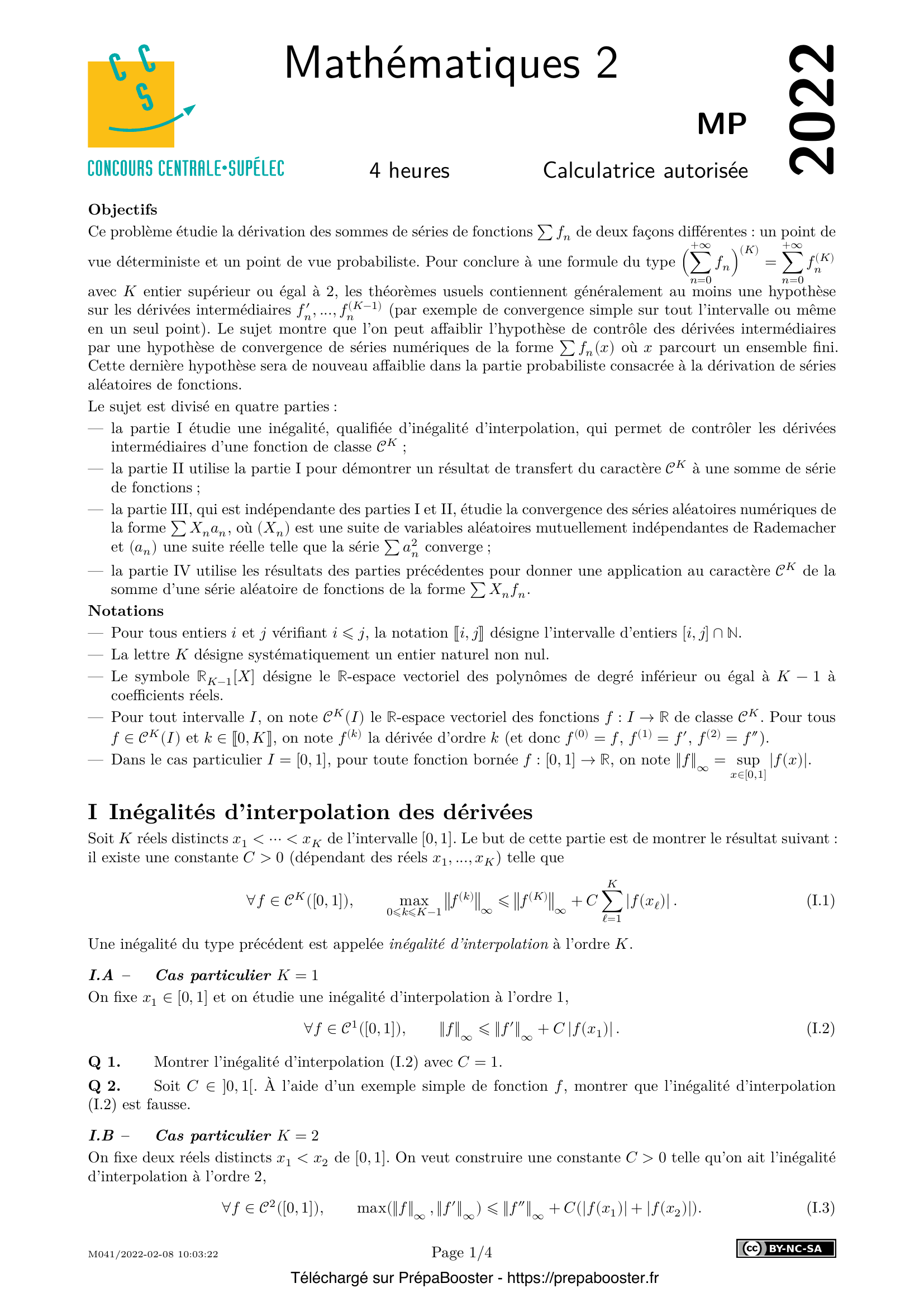 On découpe chaque f_n en P_n (polynôme d’interpolation d’ordre K-1) et le reste r_n=f_n-P_n. Montrer que Σ X_n P_n converge ponctuellement aux points d’interpolation et que Σ X_n r_n converge uniformément (et pour les dérivées jusqu’à l’ordre K) permet de reconstituer la convergence C^K de la somme. Le contrôle des r_n s’appuie sur l’inégalité d’interpolation et la convergence normale; pour la suite complète des démonstrations, débloque le corrigé sur Prépa Booster pour accéder au suivi détaillé et au dashboard personnalisé.
