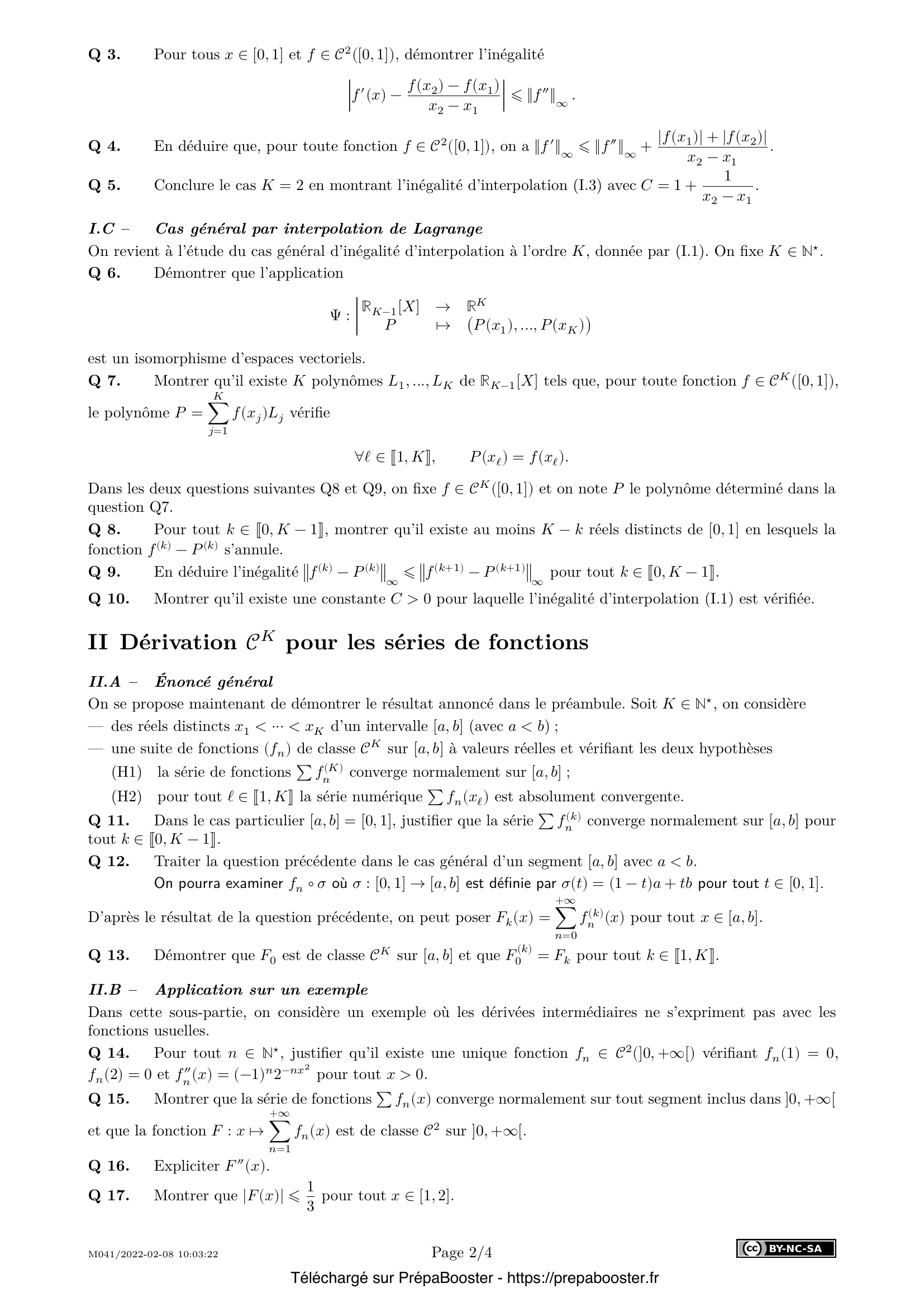 12. Traiter la question précédente dans le cas général d’un segment $[a, b]$ avec $a < b$. \textit{On pourra examiner $f_n \circ \sigma$ où $\sigma : [0, 1] \rightarrow [a, b]$ est définie par $\sigma(t) = (1 – t)a + tb$ pour tout $t \in [0, 1]$.} 13. Démontrer que $F_0$ est de classe $\mathcal{C}^K$ sur $[a, b]$ et que $F_0^{(k)} = F_k$ pour tout $k \in \llbracket 1, K\rrbracket$. 14. Pour tout $n \in \mathbb{N}^*$, justifier qu’il existe une unique fonction $f_n \in \mathcal{C}^2(]0, +\infty[)$ vérifiant $f_n(1) = 0$, $f_n(2) = 0$ et $f_n”(x) = (-1)^n 2^{-n} x^2$ pour tout $x>0$.
