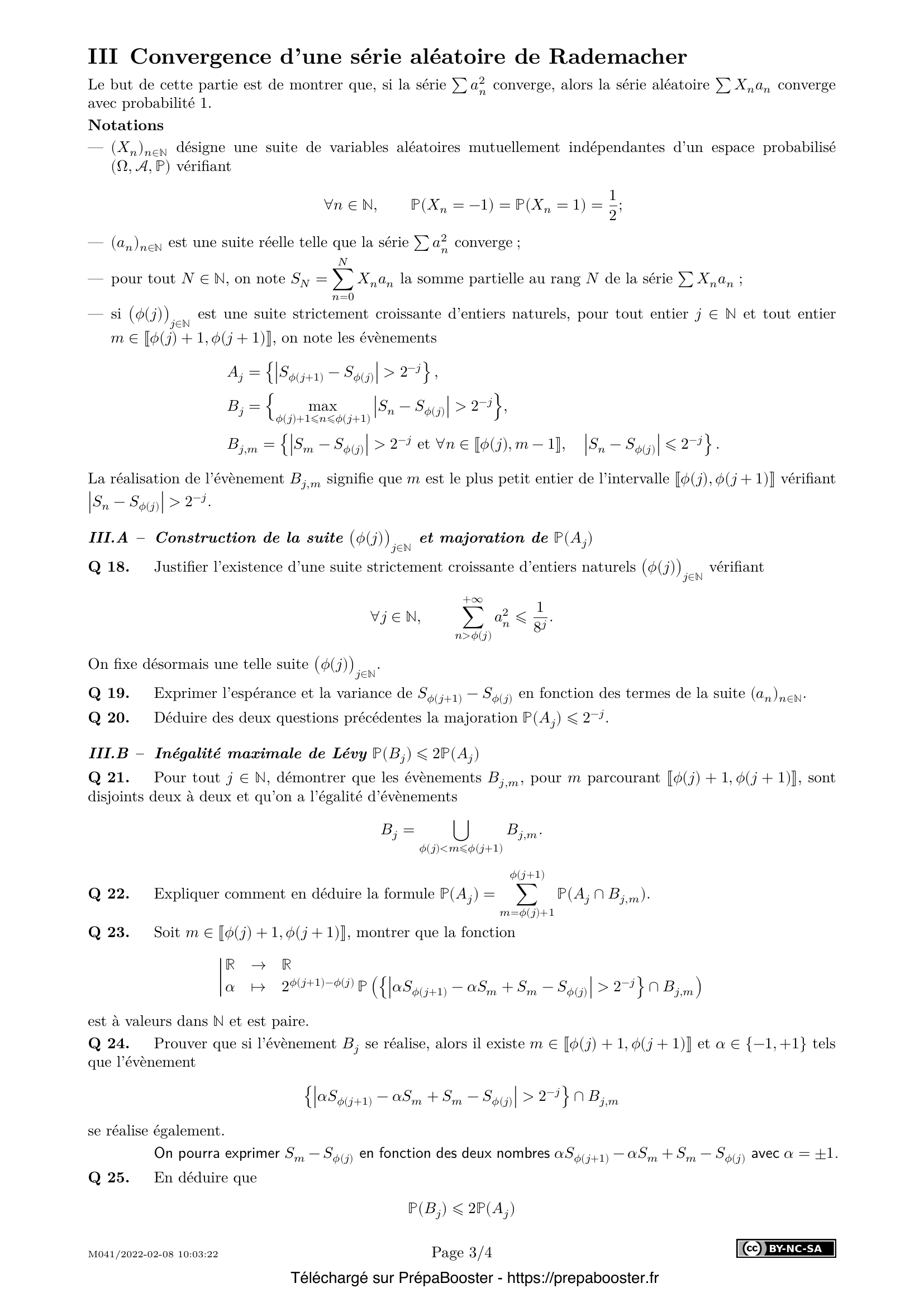 B_j = \bigcup_{\varphi(j) < m \leq \varphi(j+1)} B_{j,m}. \] 22. Expliquer comment en déduire la formule \[ \mathbb{P}(A_j) = \sum_{m = \varphi(j)+1}^{\varphi(j+1)} \mathbb{P}(A_j \cap B_{j,m}). \] 23. Soit $m \in \llbracket \varphi(j) + 1, \varphi(j+1)\rrbracket$, montrer que la fonction \[ \alpha \mapsto 2^{\varphi(j+1)-\varphi(j)} \, \mathbb{P} \left( \{ |\alpha S_{\varphi(j+1)} – \alpha S_m + S_m – S_{\varphi(j)}| > 2^{-j} \} \cap B_{j, m} \right)