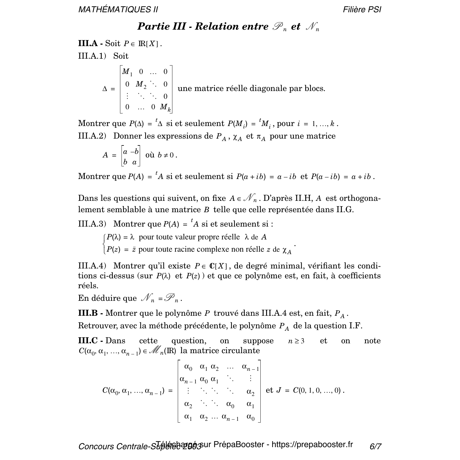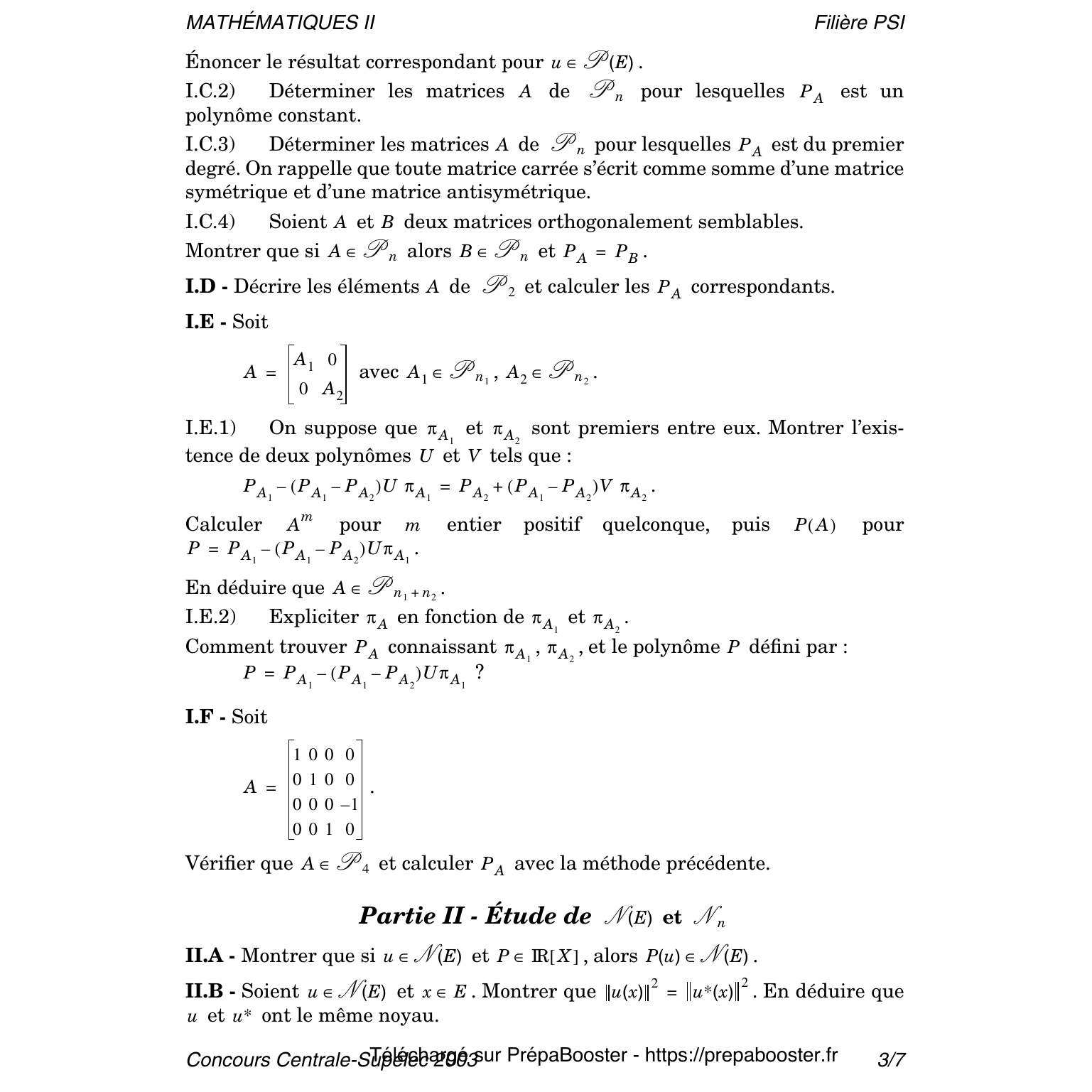 1. I.A.1) Soient $A$ et $B$ les deux matrices d’un même endomorphisme de $E$ rapporté à deux bases orthonormales. Montrer que $A$ et $B$ sont orthogonalement semblables. 2. I.A.2) Soit $u$ un endomorphisme de $E$ et $A$ sa matrice sur $\mathcal{B}$, une base orthonormale de $E$. Établir un rapport entre l’appartenance de $u$ à $\mathcal{P}(E)$ (resp. $\mathcal{N}(E)$) et l’appartenance de $A$ à $P_n$ (resp. $N_n$). 3. I.A.3) Montrer que $\mathcal{P}(E) \subset \mathcal{N}(E)$ et que $P_n \subset N_n$. 4. I.B.1) Vérifier que $\mathcal{S}(E) \subset \mathcal{P}(E)$ et $S_n \subset P_n$. 5. I.B.2) Quelles sont les matrices triangulaires supérieures qui appartiennent à $P_n$ ? En déduire que si $n \geq 2$, on a $P_n \neq L(E)$.} 6. I.B.3) Soit $u$ admettant, sur une certaine base de $E$, une matrice triangulaire supérieure. Montrer qu’il existe une base orthonormale de $E$, telle que les matrices de passage de $\mathcal{B}$ à $\mathcal{B}’$ et de $\mathcal{B}’$ à $\mathcal{B}$ soient triangulaires supérieures. Montrer que la matrice de $u$ dans $\mathcal{B}’$ est triangulaire supérieure. En déduire les éléments qui sont trigonalisables. 7. I.B.4) On suppose que $u$ est un automorphisme de $E$ ; montrer que $u$ admet un polynôme annulateur tel que $u^{-1}$ peut s’écrire comme un polynôme en $u$. En déduire que $O(E) \subset \mathcal{P}(E)$. 8. I.C.1) Montrer que si $A \in P_n$ et $A \neq 0$, alors il existe un unique polynôme réel $P_A$, que l’on note $P_A$, tel que $\operatorname{deg}(P_A) < \operatorname{deg}(\pi_A)$ et $P_A(A) = A^t$. Si $A$ est la matrice nulle, on convient que $P_A$ est le polynôme nul. Énoncer le résultat correspondant pour $u \in \mathcal{P}(E)$. 9. I.C.2) Déterminer les matrices de $P_n$ pour lesquelles $P_A$ est un polynôme constant. 10. I.C.3) Déterminer les matrices de $P_n$ pour lesquelles $P_A$ est du premier degré. On rappelle que toute matrice carrée s’écrit comme somme d’une matrice symétrique et d’une matrice antisymétrique.} 11. I.C.4) Soient $A$ et $B$ deux matrices orthogonalement semblables. Montrer que si $A \in P_n$, alors $B \in P_n$ et $P_B = P_A$. 12. I.D) Décrire les éléments de $S_n$ et calculer les $P_A$ correspondants. 13. I.E.1) On suppose que $\pi_{A_1}$ et $\pi_{A_2}$ sont premiers entre eux. Montrer l’existence de deux polynômes $U$ et $V$ tels que : $P(A) = P_{A_1}(\pi_{A_1}(A_1)\pi_{A_2}(A_2)) - U\pi_{A_1} - V\pi_{A_2}$. Calculer $P(A)$ pour $A = \begin{pmatrix} A_1 & 0 \\ 0 & A_2 \end{pmatrix}$ où $A_1 \in P_{n_1}$, $A_2 \in P_{n_2}$, puis pour $A = A_1 \oplus A_2$. En déduire que $P_A = P_{A_1} \oplus P_{A_2}$. 14. I.E.2) Expliciter $P_A$ en fonction de $P_{A_1}$ et $P_{A_2}$. Comment trouver $P_A$ connaissant $P_{A_1}$, $P_{A_2}$ et le polynôme $P$ défini par : $P(A) = P_{A_1}\pi_{A_1}(A_1)\pi_{A_2}(A_2) - U\pi_{A_1} - V\pi_{A_2}$ ? 15. I.F) Soit $A = \begin{pmatrix} 1& 0& 0& 0 \\ 0& 1& 0& 0 \\ 0& 0& 0& -1 \\ 0& 0& 1& 0 \end{pmatrix}$. Vérifier que $A \in P_4$ et calculer $P_A$ avec la méthode précédente.} 16. II.A) Montrer que si $u \in \mathcal{N}(E)$ et $P \in \mathbb{R}[X]$, alors $P(u) \in \mathcal{N}(E)$. 17. II.B) Soient $u, v \in \mathcal{N}(E)$. Montrer que $uv = vu$. En déduire que $u$ et $u^*$ ont le même noyau. 18. II.C.1) Comparer les déterminants de $f$ et $f^*$. En déduire que $m$ est pair. 19. II.C.2) On considère les applications $g$ et $h$ définies sur $\mathbb{R}^m$ par $g(x) = \|x\|^2$ et $h(x) = \|f(x)\|^2$, et l’application $q : U \to \mathbb{R}$ définie par $q(x) = \frac{\|f(x)\|^2}{\|x\|^2}$. Montrer que $g$ et $h$ sont de classe $\mathcal{C}^1$ sur $\mathbb{R}^m$ et que leurs différentielles en $x$ fixé sont les formes linéaires $2x$ et $2f^*f(x)$. Montrer que l’application $q$ est de classe $\mathcal{C}^1$ sur $U$ et déterminer sa différentielle en $x$, en calculant au moyen de produits scalaires et de normes. On note $S = \{ x \in \mathbb{R}^m \mid \|x\| = 1 \}$. Montrer que l’ensemble des valeurs prises par $q$ sur $S$ coïncide avec l’ensemble des valeurs prises par $q$ sur $\mathbb{R}^m \setminus \{0\}$. Montrer que la fonction $q$ admet un maximum sur $S$ et que ce maximum est atteint en un point $x_0$. Montrer que, pour tout $h$, on a $f(x_0) \perp x_0$. En déduire que $\Pi = \text{Vect}(x_0, f(x_0))$ est un plan stable par $f$. Donner une base orthonormale de $\Pi$ et exprimer la matrice de $f$ relative à cette base. 20. II.C.3) Montrer qu’il existe une base orthonormale de $\mathbb{R}^m$ telle que $f = \operatorname{diag}\left( \begin{matrix} \tau_1 & 0 & \ldots & 0 \\ 0 & \tau_2 & \ldots & 0 \\ \vdots & \vdots & \ddots & \vdots \\ 0 & 0 & \ldots & \tau_{m/2} \end{matrix} \right)$ avec $\tau_i = \begin{pmatrix} 0 & -b_i \\ b_i & 0 \end{pmatrix}$, $b_i \neq 0$ pour $i = 1, \ldots, m/2$.} 21. II.D.1) Montrer que $E_1^\perp$ est stable par $u$ et $u^*$. 22. II.D.2) Montrer que $u^*_{E_1} = (u_{E_1})^*$. 23. II.D.3) Montrer que si, en outre, $u \in \mathcal{N}(E)$, alors $u_{E_1} \in \mathcal{N}(E_1)$ et $u_{E_2} \in \mathcal{N}(E_2)$. 24. II.E) Soient $u$ et $u^*$ ; montrer que $u u^* = u^* u$. En déduire que $u$ et $u^*$ ont les mêmes sous-espaces propres et que ceux-ci sont en somme directe orthogonale. Si $\lambda$ est une valeur propre de $u$, on note $E_\lambda$ le sous-espace propre associé. Soit $F$ le supplémentaire orthogonal du sous-espace $\bigoplus_{\lambda} E_\lambda$, où la somme porte sur l’ensemble des valeurs propres de $u$. Montrer que $F$ est stable par $u$ et $u^*$. En considérant la restriction de $u$ à $F$, montrer que la dimension de $F$ ne peut être impaire. On notera $p = \frac{1}{2} \dim F$. 25. II.F.1) On suppose que $v$ est non nul. Soit $s = \frac{1}{2} (v+v^*)$ et $a = \frac{1}{2}(v-v^*)$. Justifier que le polynôme caractéristique de $s$ est scindé. On le note : $\chi_s(X) = \prod_{i=1}^k (X-\lambda_i)^{n_i}$. 26. II.F.2) Montrer que $s a = a s$ et $s o = o s$. Montrer 