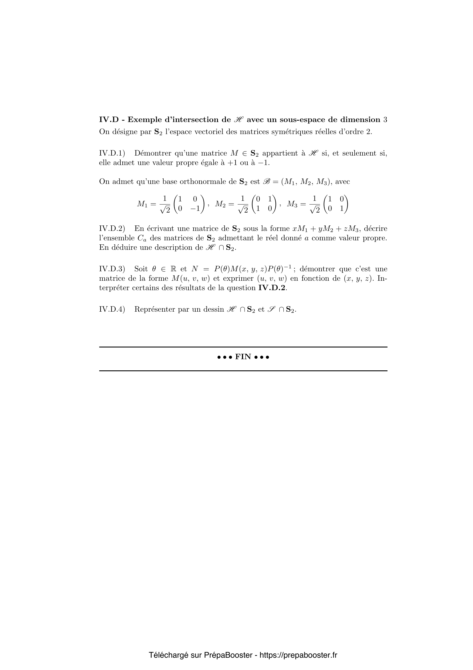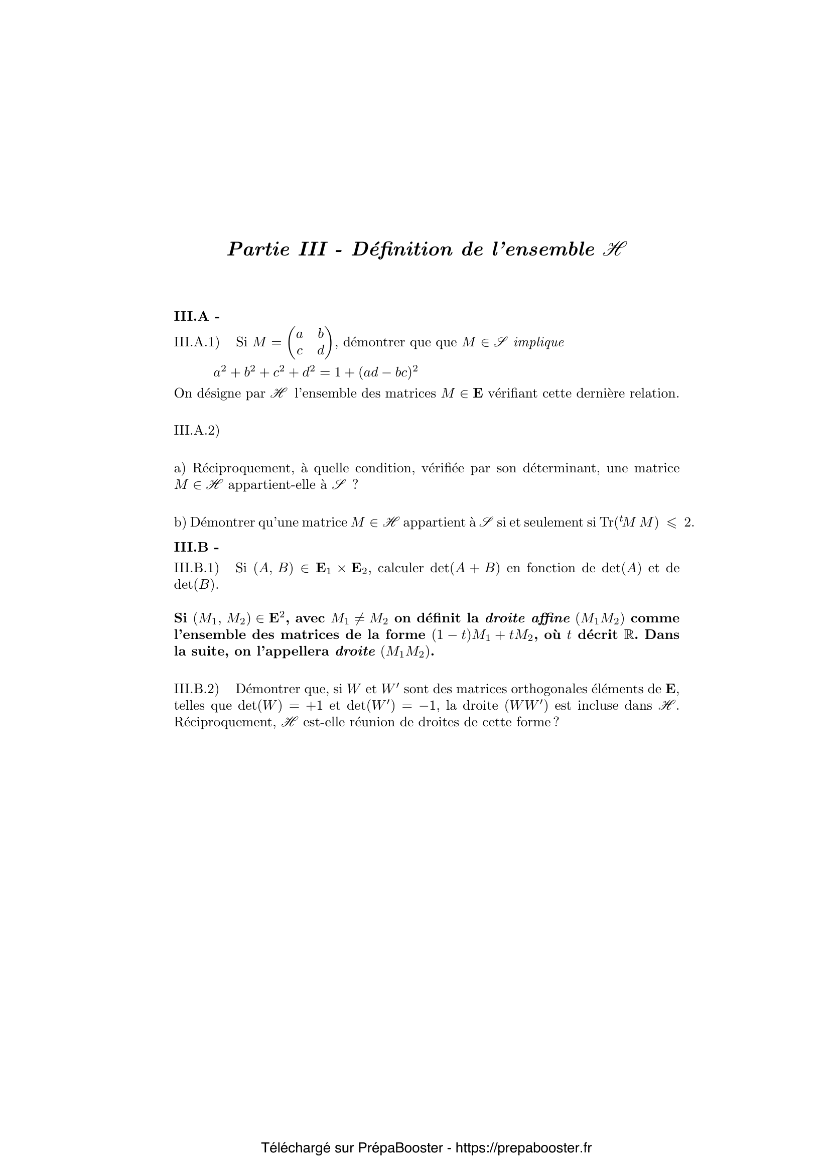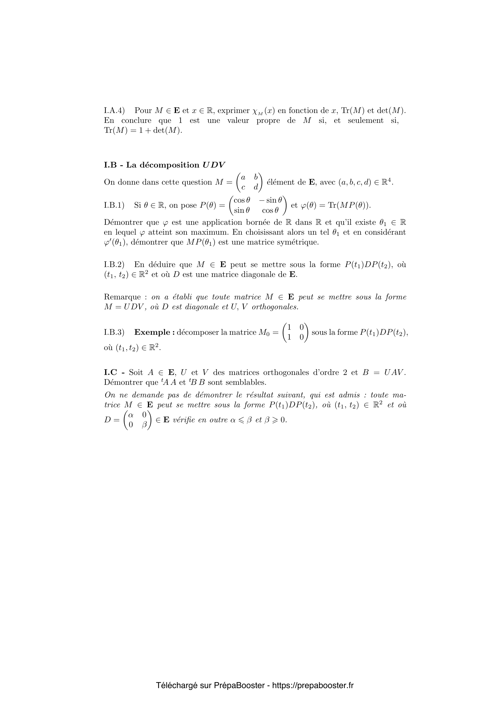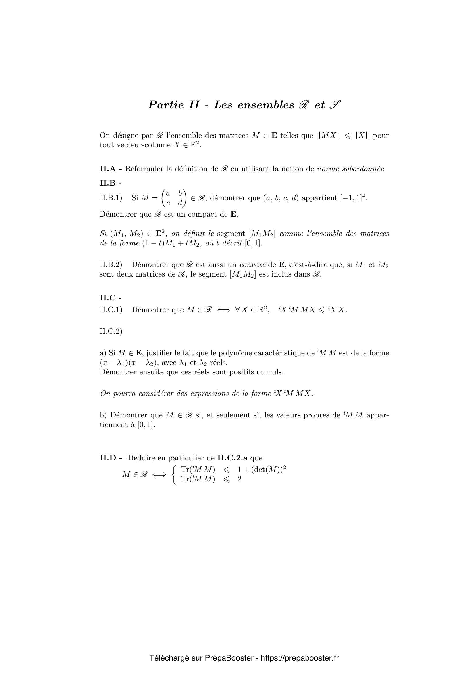 1. I.A.1) D\’emontrer que si deux matrices de $E$ sont semblables, elles ont m\^eme trace et m\^eme polyn\^ome caract\’eristique. La r\’eciproque est-elle vraie ? Justifier la r\’eponse. 2. I.A.2) D\’emontrer que $\Phi : (M_1, M_2) \mapsto \operatorname{Tr}(^t M_1 M_2)$ d\’efinit un produit scalaire sur $E$. Pour la suite du probl\`eme, $E$ pourra \^etre muni de la norme associ\’ee \`a ce produit scalaire. 3. I.A.3) D\’emontrer que, pour toute matrice $M \in E$, on a $|\det(M)| \leq \frac{1}{2} \operatorname{Tr}(^t MM)$. Quand y a-t-il \’egalit\’e ? 4. I.A.4) Pour $M \in E$ et $x \in \mathbb{R}$, exprimer $\chi_M(x)$ en fonction de $x, \operatorname{Tr}(M)$ et $\det(M)$. En conclure que $1$ est une valeur propre de $M$ si, et seulement si, $\operatorname{Tr}(M) = 1 + \det(M)$. 5. I.B.1) Si $\theta \in \mathbb{R}$, on pose $P(\theta) = \begin{pmatrix} \cos \theta & -\sin \theta \\ \sin \theta & \cos \theta \end{pmatrix}$ et $\varphi(\theta) = \operatorname{Tr}(M P(\theta))$. D\’emontrer que $\varphi$ est une application born\’ee de $\mathbb{R}$ dans $\mathbb{R}$ et qu’il existe $\theta_1 \in \mathbb{R}$ en lequel $\varphi$ atteint son maximum. En choisissant alors un tel $\theta_1$ et en consid\’erant $\varphi'(\theta_1)$, d\’emontrer que $M P(\theta_1)$ est une matrice sym\’etrique.} 6. I.B.2) En d\’eduire que $M \in E$ peut se mettre sous la forme $P(t_1) D P(t_2)$, o\`u $(t_1, t_2) \in \mathbb{R}^2$ et o\`u $D$ est une matrice diagonale de $E$. 7. I.B.3) Exemple : d\’ecomposer la matrice $M_0 = \begin{pmatrix} 1 & 0 \\ 1 & 0 \end{pmatrix}$ sous la forme $P(t_1) D P(t_2)$, o\`u $(t_1, t_2) \in \mathbb{R}^2$. 8. I.C) Soit $A \in E$, $U$ et $V$ des matrices orthogonales d’ordre $2$ et $B = U A V$. D\’emontrer que $^t A A$ et $^t B B$ sont semblables. 9. II.A) Reformuler la d\’efinition de $R$ en utilisant la notion de norme subordonn\’ee. 10. II.B.1) Si $M = \begin{pmatrix} a & b \\ c & d \end{pmatrix} \in R$, d\’emontrer que $(a, b, c, d)$ appartient \([-1,1]^4\). D\’emontrer que $R$ est un compact de $E$.} 11. II.B.2) D\’emontrer que $R$ est aussi un convexe de $E$, c’est-\`a-dire que, si $M_1$ et $M_2$ sont deux matrices de $R$, le segment $[M_1 M_2]$ est inclus dans $R$. 12. II.C.1) D\’emontrer que $M \in R \iff \forall X \in \mathbb{R}^2$, ${}^t X {}^t M M X \leq {}^t X X$. 13. II.C.2) \\ a) Si $M \in E$, justifier le fait que le polyn\^ome caract\’eristique de $^t M M$ est de la forme $(x-\lambda_1)(x-\lambda_2)$, avec $\lambda_1$ et $\lambda_2$ r\’eels. D\’emontrer ensuite que ces r\’eels sont positifs ou nuls. On pourra consid\’erer des expressions de la forme ${}^t X {}^t M M X$.\\ b) D\’emontrer que $M \in R$ si, et seulement si, les valeurs propres de $^t M M$ appartiennent \`a $[0,1]$. 14. II.D) D\’eduire en particulier de II.C.2.a que $M \in R \iff \left\{ \begin{matrix} \operatorname{Tr}(^{t}MM) \leq 1 + (\det(M))^2 \\ \operatorname{Tr}(^{t}MM) \leq 2 \end{matrix}\right.$ 15. II.E.1) En reprenant les calculs de II.C.2.a, d\’emontrer que $M$ appartient \`a $S$ si, et seulement si, le polyn\^ome caract\’eristique de $^{t}MM$ est de la forme $(x – \lambda)(x – 1)$, o\`u $\lambda \in [0,1]$.} 16. II.E.2) Si $M \in E$, on l’\’ecrit sous la forme $M = P(t_1) D P(t_2)$, o\`u $(t_1, t_2) \in \mathbb{R}^2$ et o\`u $D = \begin{pmatrix} \alpha & 0 \\ 0 & \beta \end{pmatrix}$ avec $\alpha \leq \beta$ et $\beta > 0$. a) D\’eterminer les valeurs propres de $^{t}MM$ en fonction de $\alpha$ et $\beta$.\\ b) D\’emontrer que $M \in S$ si, et seulement si, il existe $U$ et $V$, matrices orthogonales d’ordre 2 et $\gamma \in [-1,1]$ tels que $M = U \begin{pmatrix} \gamma & 0 \\ 0 & 1 \end{pmatrix} V$. 17. II.E.3) En d\’eduire que, si $M$ est une matrice non orthogonale de $S$, il existe des matrices orthogonales $W$ et $W_0$ d’ordre $2$ telles que $M$ appartienne au segment $[W W_0]$. On pourra montrer d’abord que si $M$ est de la forme $\begin{pmatrix} \gamma & 0 \\ 0 & 1 \end{pmatrix}$, avec $\gamma \in ]-1,1[$, on peut choisir $W$ et $W_0$ orthogonales et diagonales telles que $M$ appartienne au segment $[W W_0]$. 18. II.F.1) D\’emontrer que $E_1$ et $E_2$ sont deux sous-espaces vectoriels suppl\’ementaires de $E$ orthogonaux au sens du produit scalaire $\Phi$ d\’efini en I.A.2. 19. II.F.2) D\’emontrer que $E_1$ contient toutes les matrices orthogonales d’ordre $2$ et de d\’eterminant $+1$ et que $E_2$ contient toutes les matrices orthogonales d’ordre $2$ et de d\’eterminant $-1$. 20. II.F.3) Lorsque $M$ est une matrice non orthogonale de $S$, d\’eduire de ce qui pr\’ec\`ede le nombre de segments $[WW_0]$ — o\`u $W$ et $W_0$ sont orthogonales — contenant $M$.} 21. III.A.1) Si $M = \begin{pmatrix} a & b \\ c & d \end{pmatrix}$, d\’emontrer que que $M \in S$ implique $a^2 + b^2 + c^2 + d^2 = 1 + (ad-bc)^2$. 22. III.A.2) \\ a) R\’eciproquement, \`a quelle condition, v\’erifi\’ee par son d\’eterminant, une matrice $M \in H$ appartient-elle \`a $S$ ?\\ b) D\’emontrer qu’une matrice $M \in H$ appartient \`a $S$ si et seulement si $\operatorname{Tr}(^{t}MM)\leq 2$. 23. III.B.1) Si $(A,B)\in E_1\times E_2$, calculer $\det(A+B)$ en fonction de $\det(A)$ et de $\det(B)$. 24. III.B.2) D\’emontrer que, si $W$ et $W_0$ sont des matrices orthogonales \’el\’ements de $E$, telles que $\det(W)=+1$ et $\det(W_0)=-1$, la droite $(WW_0)$ est incluse dans $H$. R\’eciproquement, $H$ est-elle r\’eunion de droites de cette forme ? 25. IV.A) Si $M \in E$, on rappelle que le polyn\^ome caract\’eristique de $^{t}MM$ est de la forme $(x-\lambda_1)(x-\lambda_2)$, avec $(\lambda_1, \lambda_2) \in \mathbb{R}^2$, $\lambda_1>0$ et $\lambda_2>0$. Pour fixer les id\’ees, on suppose $0\leq\lambda_1\leq\lambda_2$. On suppose $M\neq 0$. D\’eterminer en fonction de $\lambda_1$ et $\lambda_2$ le nombre de r\’eels $t$ positifs tels que $tM\in H$. On en trouvera “en g\’en\’eral” 