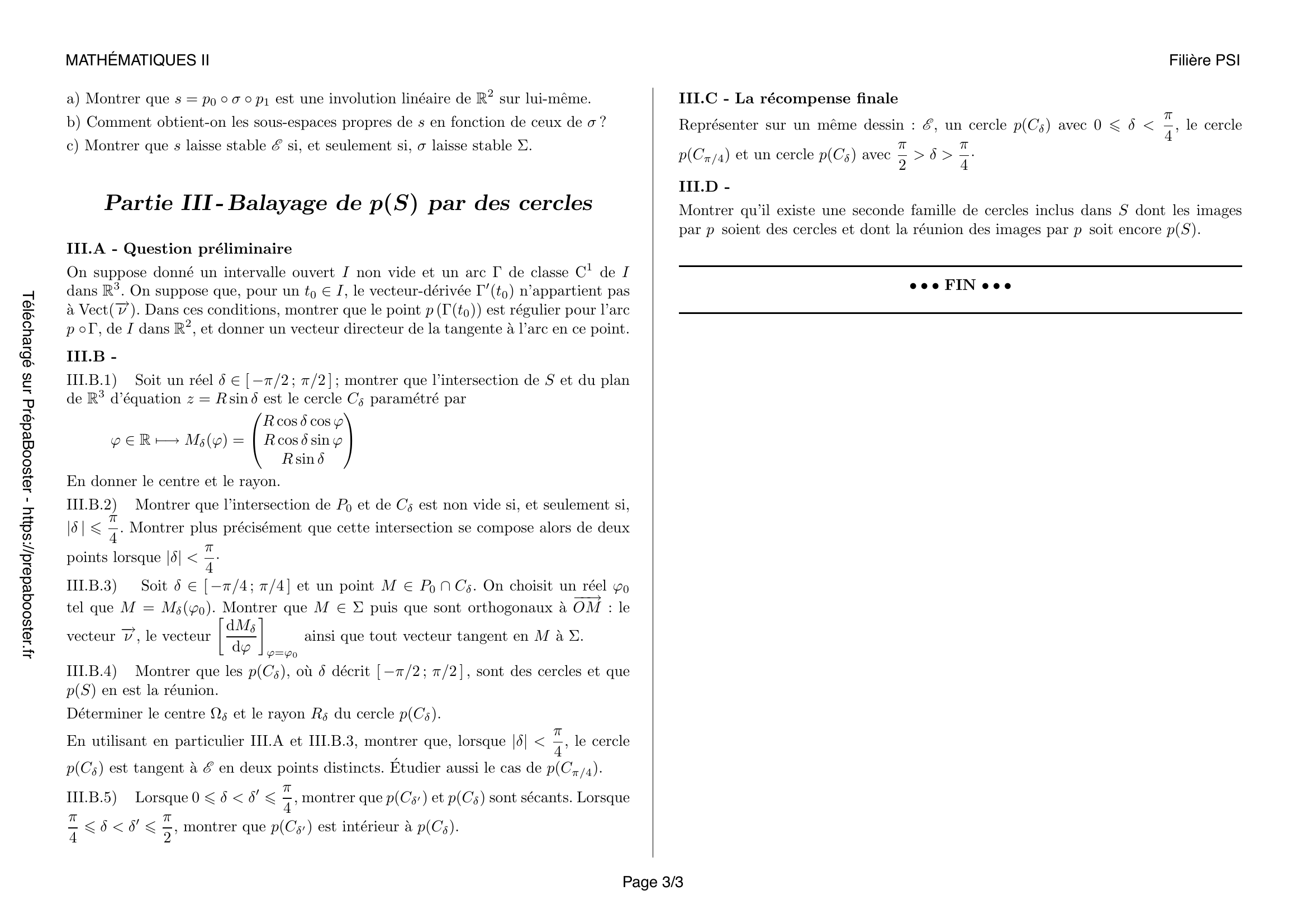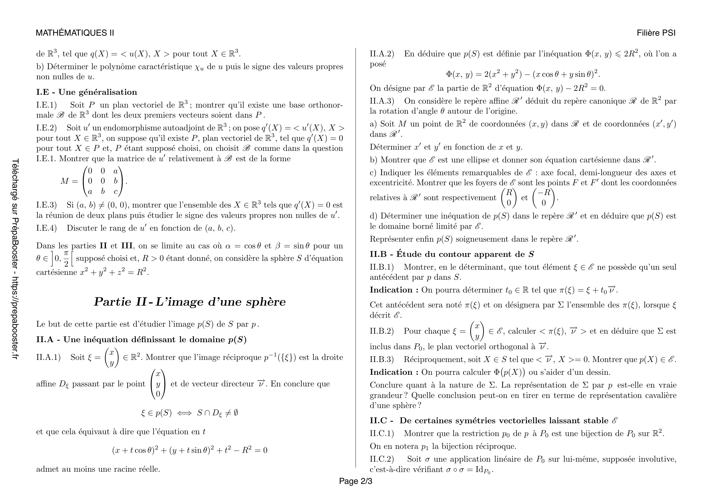 1. I.A.1) Montrer que $p$ est une application linéaire. Déterminer la matrice de $p$ relativement aux bases canoniques de $\mathbb{R}^3$ et $\mathbb{R}^2$. Déterminer le noyau et l’image de $p$. 2. I.A.2) Représenter sur un même dessin les images par $p$ des vecteurs de la base canonique de $\mathbb{R}^3$. Ce dessin donne une représentation en perspective de la base formée par ces trois vecteurs. 3. I.B) Pour cette seule question, on introduit l’endomorphisme $p$ de $\mathbb{R}^3$ qui au vecteur-colonne $\begin{pmatrix} x \\ y \\ z \end{pmatrix}$ associe $\begin{pmatrix} x-\alpha z \\ y-\beta z \\ 0 \end{pmatrix}$. Interpréter géométriquement $p$ grâce à $p$ (on pourra former $p\circ p$). Est-il vrai que $p(X)\neq X$ pour tout vecteur $X\in\mathbb{R}^3$ ? 4. I.C.1) Soit $M_0$ un point et $\vec{u}$ un vecteur de $\mathbb{R}^3$. On considère la droite affine $D = M_0 + \mathbb{R} \vec{u} = \{ M_0 + \lambda \vec{u} \}$. Montrer que $p(D) = p(M_0) + \mathbb{R} p(\vec{u})$. 5. I.C.2) Soit $D$ une droite affine de $\mathbb{R}^3$. Montrer que son image par $p$ est une droite affine ou est réduite à un point, en discutant selon un vecteur directeur de $D$.} 6. I.C.3) Soient $D$ et $D’$ deux droites affines de $\mathbb{R}^3$ dont les images par $p$ sont des droites affines de $\mathbb{R}^2$. \begin{itemize} \item[a)] Si $D$ et $D’$ sont sécantes, montrer que leurs images par $p$ le sont aussi. La réciproque est-elle vraie ? \item[b)] Si $D$ et $D’$ sont parallèles, montrer que leurs images par $p$ le sont aussi. La réciproque est-elle vraie ? \end{itemize} 7. I.C.4) Soit $\Pi$ un plan affine de $\mathbb{R}^3$. Discuter la nature de $p(\Pi)$ suivant $\vec{\nu}$ et $\Pi$. 8. I.D.1) Montrer que l’ensemble des $X\in\mathbb{R}^3$ tels que $q(X)=0$ est la réunion de deux plans $\Pi_1$ et $\Pi_2$ que l’on caractérisera par leurs équations cartésiennes. En déduire que les plans affines parallèles à l’un ou l’autre de ces deux plans sont représentés en vraie grandeur par $p$. 9. I.D.2) \begin{itemize} \item[a)] Montrer, en le déterminant, qu’il existe un unique endomorphisme autoadjoint $u$ de $\mathbb{R}^3$, tel que $q(X) = \langle u(X), X \rangle$ pour tout $X\in\mathbb{R}^3$. \item[b)] Déterminer le polynôme caractéristique $\chi_u$ de $u$ puis le signe des valeurs propres non nulles de $u$. \end{itemize} 10. I.E.1) Soit $P$ un plan vectoriel de $\mathbb{R}^3$ ; montrer qu’il existe une base orthonormale $\mathcal{B}$ de $\mathbb{R}^3$ dont les deux premiers vecteurs soient dans $P$.} 11. I.E.2) Soit $u_0$ un endomorphisme autoadjoint de $\mathbb{R}^3$ ; on pose $q_0(X) = \langle u_0(X), X \rangle$ pour tout $X\in\mathbb{R}^3$, on suppose qu’il existe $P$, plan vectoriel de $\mathbb{R}^3$, tel que $q_0(X)=0$ pour tout $X\in P$ et, $P$ étant supposé choisi, on choisit $\mathcal{B}$ comme dans la question I.E.1. Montrer que la matrice de $u_0$ relativement à $\mathcal{B}$ est de la forme $M = \begin{pmatrix} 0&0&a\\0&0&b\\a&b&c \end{pmatrix}$. 12. I.E.3) Si $(a, b) \neq (0,0)$, montrer que l’ensemble des $X\in\mathbb{R}^3$ tels que $q_0(X) = 0$ est la réunion de deux plans puis étudier le signe des valeurs propres non nulles de $u_0$. 13. I.E.4) Discuter le rang de $u_0$ en fonction de $(a, b, c)$. 14. II.A.1) Soit $\xi = \begin{pmatrix} x \\ y \end{pmatrix} \in \mathbb{R}^2$. Montrer que l’image réciproque $p^{-1}(\{\xi\})$ est la droite affine $D_\xi$ passant par le point $\begin{pmatrix} x \\ y \\ 0 \end{pmatrix}$ et de vecteur directeur $\vec{\nu}$. En conclure que $\xi \in p(S) \Leftrightarrow S \cap D_\xi \neq \varnothing$ et que cela équivaut à dire que l’équation en $t$ $(x + t\cos\theta)^2 + (y + t\sin\theta)^2 + t^2 – R^2 = 0$ admet au moins une racine réelle. 15. II.A.2) En déduire que $p(S)$ est définie par l’inéquation $\Phi(x, y)\leq 2R^2$, où l’on a posé $\Phi(x, y) = 2(x^2+y^2)-(x\cos\theta + y\sin\theta)^2$. On désigne par $E$ la partie de $\mathbb{R}^2$ d’équation $\Phi(x, y)-2R^2=0$.} 16. II.A.3) \begin{itemize} \item[a)] On considère le repère affine $R_0$ déduit du repère canonique $R$ de $\mathbb{R}^2$ par la rotation d’angle $\theta$ autour de l’origine. Soit $M$ un point de $\mathbb{R}^2$ de coordonnées $(x, y)$ dans $R$ et de coordonnées $(x_0, y_0)$ dans $R_0$. Déterminer $x_0$ et $y_0$ en fonction de $x$ et $y$. \item[b)] Montrer que $E$ est une ellipse et donner son équation cartésienne dans $R_0$. \item[c)] Indiquer les éléments remarquables de $E$ : axe focal, demi-longueur des axes et excentricité. Montrer que les foyers de $E$ sont les points $F$ et $F’$ dont les coordonnées relatives à $R_0$ sont respectivement $(R_0, 0)^T$ et $(-R_0, 0)^T$. \item[d)] Déterminer une inéquation de $p(S)$ dans le repère $R_0$ et en déduire que $p(S)$ est le domaine borné limité par $E$. Représenter enfin $p(S)$ soigneusement dans le repère $R_0$. \end{itemize} 17. II.B.1) Montrer, en le déterminant, que tout élément $\xi\in E$ ne possède qu’un seul antécédent par $p$ dans $S$. Indication : On pourra déterminer $t_0\in\mathbb{R}$ tel que $\pi(\xi) = \xi + t_0\vec{\nu}$. Cet antécédent sera noté $\pi(\xi)$ et on désignera par $\Sigma$ l’ensemble des $\pi(\xi)$, lorsque $\xi$ décrit $E$. 18. II.B.2) Pour chaque $\xi = \begin{pmatrix} x \\ y \end{pmatrix} \in E$, calculer $\langle \pi(\xi), \vec{\nu} \rangle$ et en déduire que $\Sigma$ est inclus dans $P_0$, le plan vectoriel orthogonal à $\vec{\nu}$. 19. II.B.3) Réciproquement, soit $X \in S$ tel que $\langle \vec{\nu}, X \rangle = 0$. Montrer que $p(X)\in E$. Indication : On pourra calculer $\Phi(p(X))$ ou s’aider d’un dessin. Conclure quant à la nature de $\Sigma$. La représentation de $\Sigma$ par $p$ est-elle en vraie grandeur ? Quelle conclusion peut-on en tirer en terme de représentation cavalière d’une sphère ? 20. II.C.1) Montrer que la restriction $p_0$ de $p$ à $P_0$ est une bijection de $P