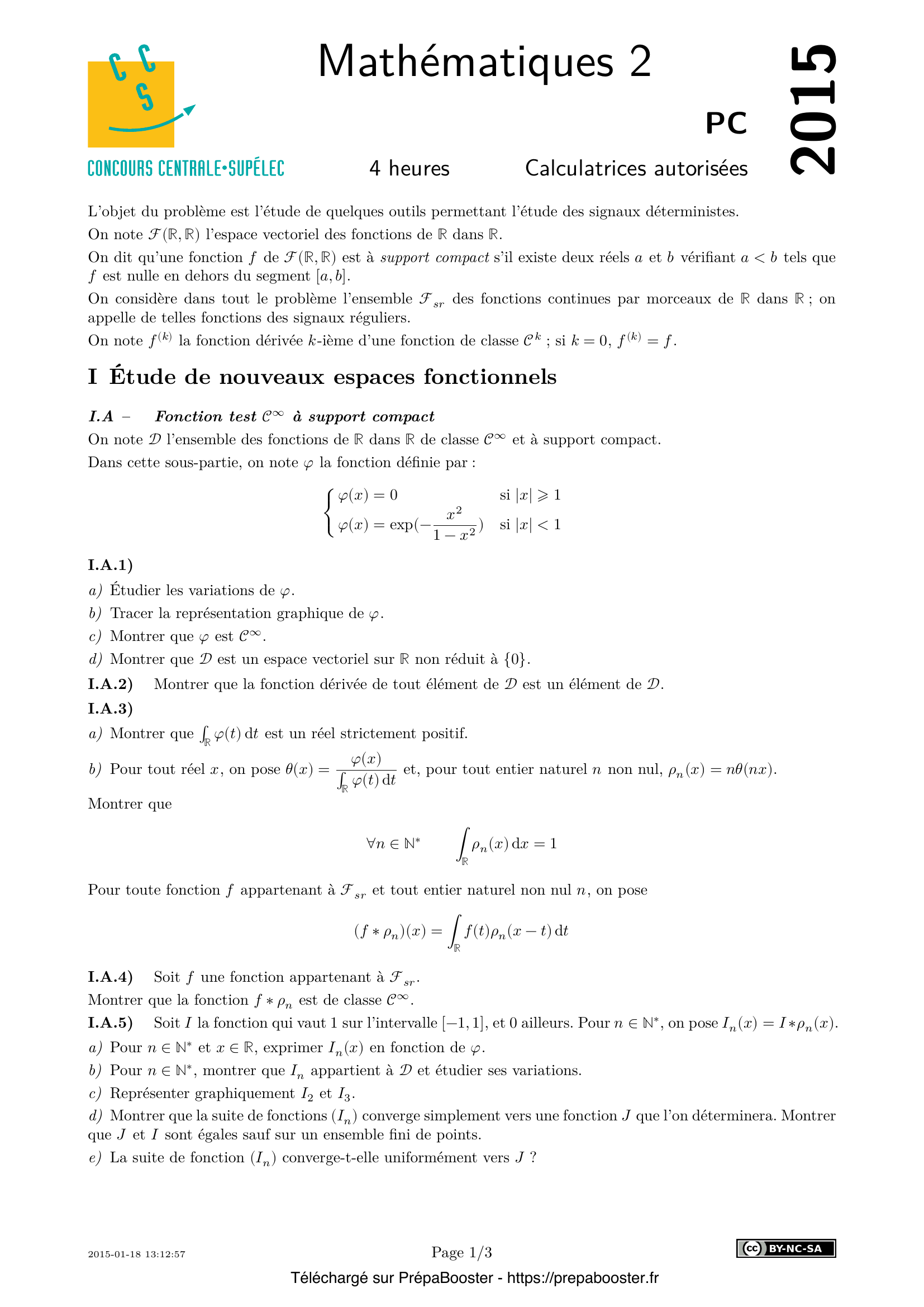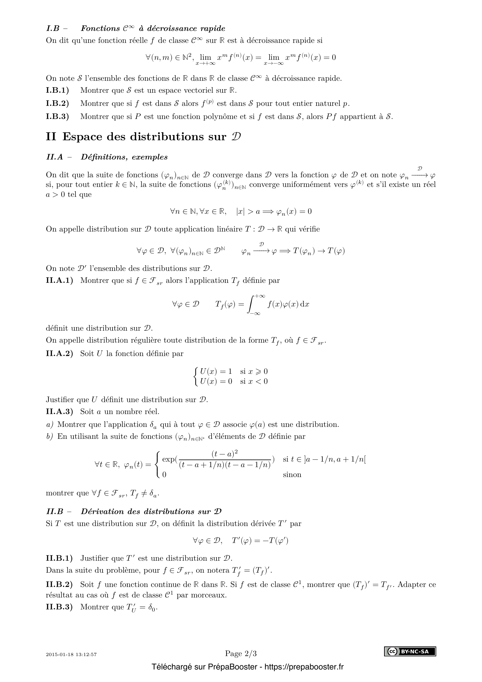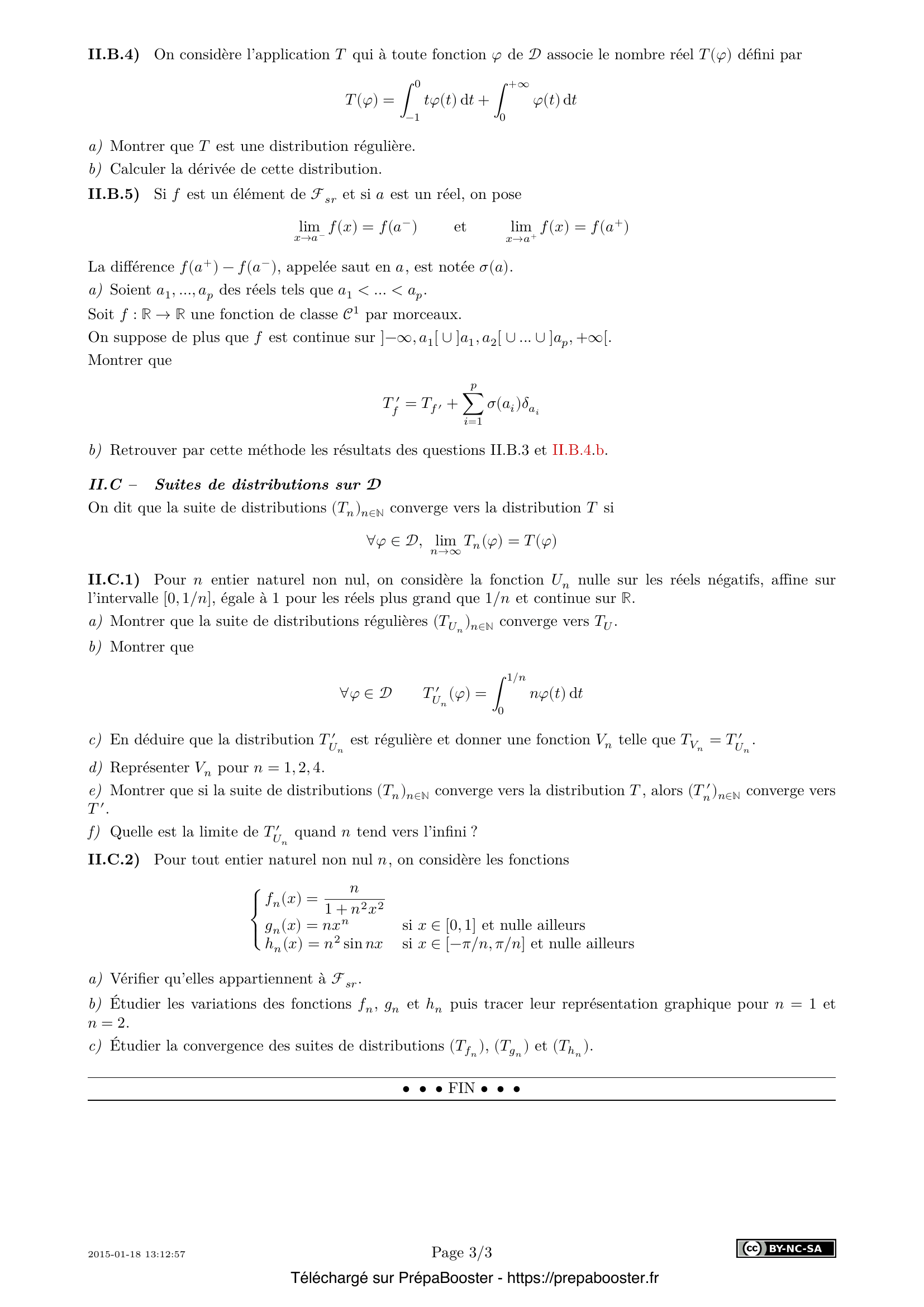 1. I.A.1)\newline a) Étudier les variations de $\varphi$.\newline b) Tracer la représentation graphique de $\varphi$.\newline c) Montrer que $\varphi$ est $\mathcal{C}^\infty$.\newline d) Montrer que $\mathcal{D}$ est un espace vectoriel sur $\mathbb{R}$ non réduit à $\{0\}$. 2. I.A.2) Montrer que la fonction dérivée de tout élément de $\mathcal{D}$ est un élément de $\mathcal{D}$. 3. I.A.3)\newline a) Montrer que $\displaystyle\int_{\mathbb{R}} \varphi(t)\mathrm{d}t$ est un réel strictement positif.\newline b) Pour tout réel $x$, on pose $\theta(x) = \dfrac{\varphi(x)}{\int_{\mathbb{R}} \varphi(t)\mathrm{d}t}$ et, pour tout entier naturel $n$ non nul, $\rho_n(x) = n\theta(nx)$.\newline Montrer que\newline $\forall n \in \mathbb{N}^*,\quad \int_{\mathbb{R}} \rho_n(x)\mathrm{d}x = 1$.\newline Pour toute fonction $f$ appartenant à $\mathcal{F}_{uu}$ et tout entier naturel non nul $n$, on pose\newline $(f\ast \rho_n)(x) = \int_{\mathbb{R}} f(t)\rho_n(x-t)\mathrm{d}t$. 4. I.A.4) Soit $f$ une fonction appartenant à $\mathcal{F}_{uu}$. Montrer que la fonction $f\ast \rho_n$ est de classe $\mathcal{C}^\infty$. 5. I.A.5) Soit $I$ la fonction qui vaut 1 sur l’intervalle $[-1,1]$, et 0 ailleurs. Pour $n \in \mathbb{N}^*$, on pose $I_n(x) = I\ast\rho_n(x)$.\newline a) Pour $n\in\mathbb{N}^*$ et $x\in\mathbb{R}$, exprimer $I_n(x)$ en fonction de $\varphi$.\newline b) Pour $n \in \mathbb{N}^*$, montrer que $I_n$ appartient à $\mathcal{D}$ et étudier ses variations.\newline c) Représenter graphiquement $I_2$ et $I_3$.\newline d) Montrer que la suite de fonctions $(I_n)$ converge simplement vers une fonction $J$ que l’on déterminera. Montrer que $J$ et $I$ sont égales sauf sur un ensemble fini de points.\newline e) La suite de fonctions $(I_n)$ converge-t-elle uniformément vers $J$?\newline } 6. I.B.1) Montrer que $\mathcal{S}$ est un espace vectoriel sur $\mathbb{R}$. 7. I.B.2) Montrer que si $f$ est dans $\mathcal{S}$ alors $f^{(p)}$ est dans $\mathcal{S}$ pour tout entier naturel $p$. 8. I.B.3) Montrer que si $P$ est une fonction polynôme et si $f$ est dans $\mathcal{S}$, alors $Pf$ appartient à $\mathcal{S}$. 9. II.A.1) Montrer que si $f \in \mathcal{F}_{uu}$ alors l’application $T_f$ définie par\newline $\forall \varphi \in \mathcal{D}\qquad T_f(\varphi) = \int_{-\infty}^{+\infty} f(x)\varphi(x)\mathrm{d}x$\newline définit une distribution sur $\mathcal{D}$. 10. II.A.2) Soit $U$ la fonction définie par\newline $\left\{\begin{array}{ll} U(x) = 1 & \text{si } x \geq 0\\ U(x) = 0 & \text{si } x < 0 \end{array}\right.$\newline Justifier que $U$ définit une distribution sur $\mathcal{D}$.} 11. II.A.3) Soit $a$ un nombre réel.\newline a) Montrer que l’application $\delta_a$ qui à tout $\varphi \in \mathcal{D}$ associe $\varphi(a)$ est une distribution.\newline b) En utilisant la suite de fonctions $(\varphi_n)_{n\in\mathbb{N}^*}$ d’éléments de $\mathcal{D}$ définie par\newline $\forall t\in\mathbb{R},\qquad \varphi_n(t) = \begin{cases} \exp\left(\frac{(t-a)^2}{(t-a+\frac{1}{n})(t-a-\frac{1}{n})}\right) & \text{si } t\in ]a-\frac{1}{n},a+\frac{1}{n}[\\ 0 & \text{sinon} \end{cases}$\newline montrer que $\forall f \in \mathcal{F}_{uu},\quad T_f \neq \delta_a$. 12. II.B.1) Justifier que $T'$ est une distribution sur $\mathcal{D}$. 13. II.B.2) Soit $f$ une fonction continue de $\mathbb{R}$ dans $\mathbb{R}$. Si $f$ est de classe $\mathcal{C}^1$, montrer que $(T_f)' = T_{f'}$. Adapter ce résultat au cas où $f$ est de classe $\mathcal{C}^1$ par morceaux. 14. II.B.3) Montrer que $T'_f = \delta_0$. 15. II.B.4) On considère l’application $T$ qui à toute fonction $\varphi$ de $\mathcal{D}$ associe le nombre réel $T(\varphi)$ défini par\newline $T(\varphi) = \int_{-1}^0 t\varphi(t)\mathrm{d}t + \int_0^{+\infty} \varphi(t)\mathrm{d}t$\newline a) Montrer que $T$ est une distribution régulière.\newline b) Calculer la dérivée de cette distribution.} 16. II.B.5) Si $f$ est un élément de $\mathcal{F}_{uu}$ et si $a$ est un réel, on pose\newline $\lim_{x\to a^-} f(x) = f(a^-)$ et $\lim_{x\to a^+} f(x) = f(a^+)$\newline La différence $f(a^+)-f(a^-)$, appelée saut en $a$, est notée $\sigma(a)$.\newline a) Soient $a_1,\ldots,a_n$ des réels tels que $a_1<\cdotsFAQ