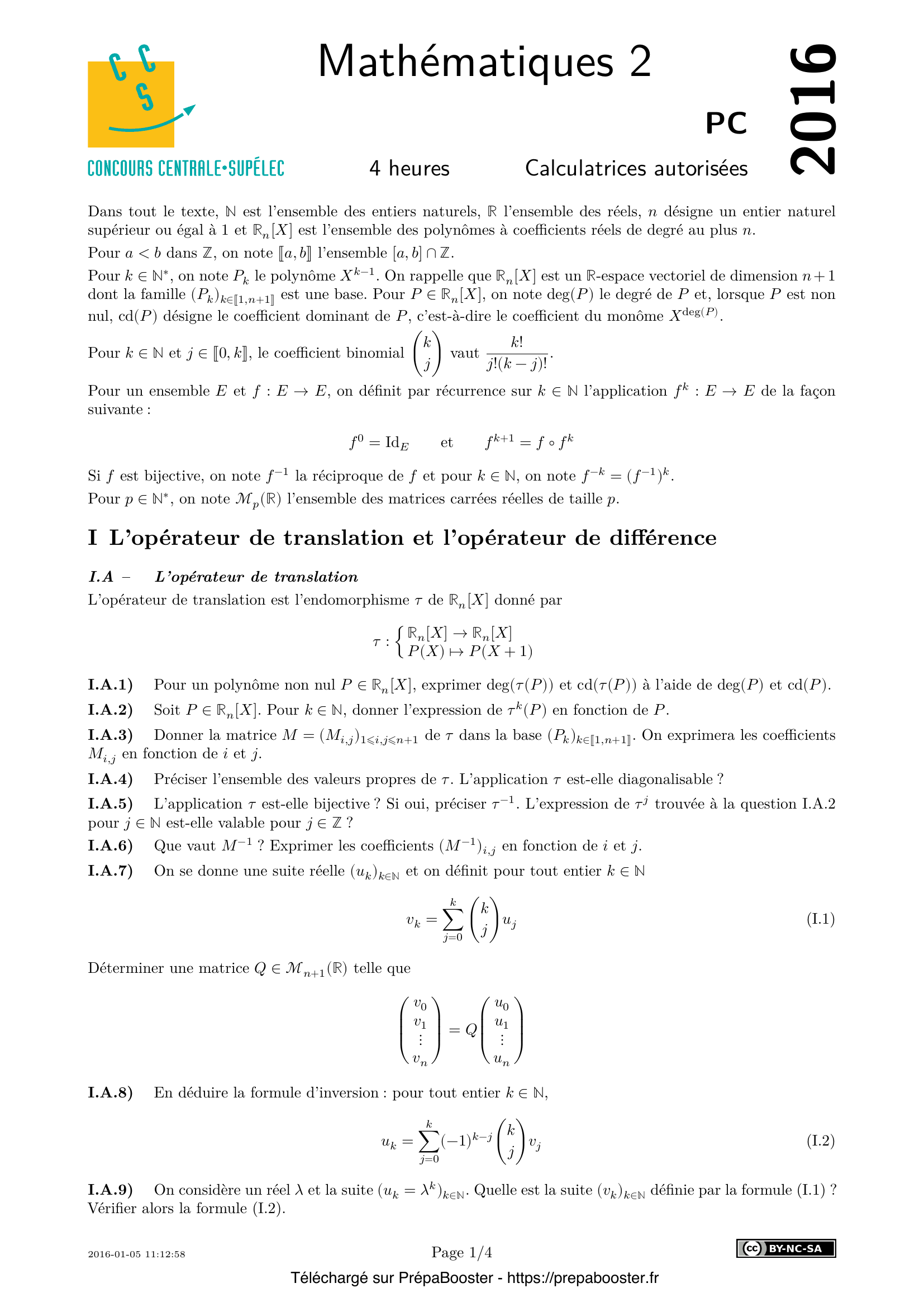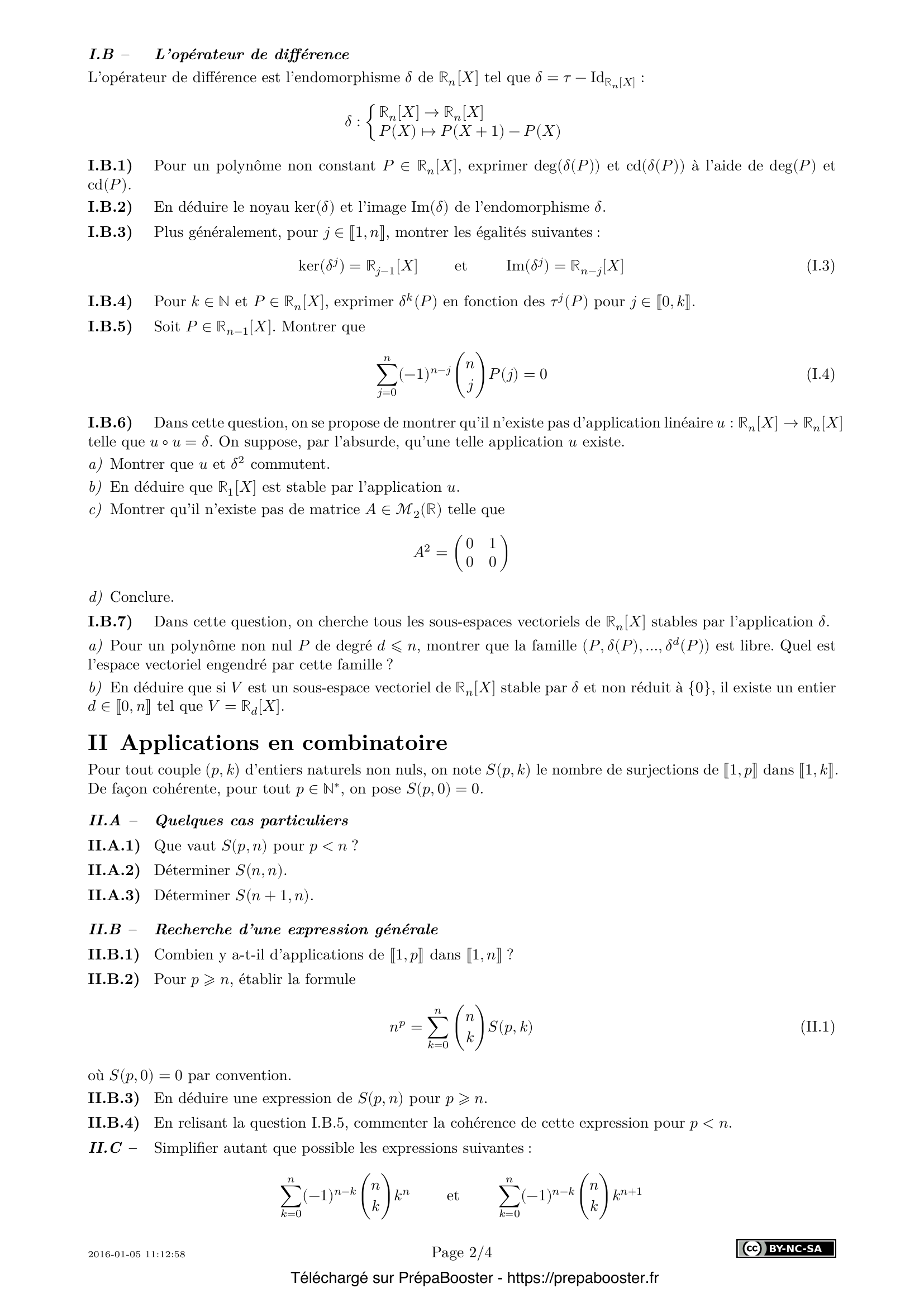 1. I.A.1) Pour un polynôme non nul $P \in \mathbb{R}_n[X]$, exprimer $\deg(\tau(P))$ et $cd(\tau(P))$ à l’aide de $\deg(P)$ et $cd(P)$. 2. I.A.2) Soit $P \in \mathbb{R}_n[X]$. Pour $k \in \mathbb{N}$, donner l’expression de $\tau^k(P)$ en fonction de $P$. 3. I.A.3) Donner la matrice $M = (M_{i,j})_{1 \leq i,j \leq n+1}$ de $\tau$ dans la base $(P_j)_{j \in \llbracket 1, n+1 \rrbracket}$. On exprimera les coefficients $M_{i,j}$ en fonction de $i$ et $j$. 4. I.A.4) Préciser l’ensemble des valeurs propres de $\tau$. L’application $\tau$ est-elle diagonalisable ? 5. I.A.5) L’application $\tau$ est-elle bijective ? Si oui, préciser $\tau^{-1}$. L’expression de $\tau^k$ trouvée à la question I.A.2 pour $k \in \mathbb{N}$ est-elle valable pour $k \in \mathbb{Z}$ ?} 6. I.A.6) Que vaut $M^{-1}$ ? Exprimer les coefficients $(M^{-1})_{i,j}$ en fonction de $i$ et $j$. 7. I.A.7) On se donne une suite réelle $(u_j)_{j \in \mathbb{N}}$ et on définit pour tout entier $k \in \mathbb{N}$ \[ v_j = \sum_{i=0}^j \binom{j}{i} u_i \tag{I.1} \] Déterminer une matrice $Q \in \mathcal{M}_{n+1}(\mathbb{R})$ telle que \[ \begin{pmatrix} v_0\\ v_1\\ \vdots\\ v_n \end{pmatrix} = Q \begin{pmatrix} u_0\\ u_1\\ \vdots\\ u_n \end{pmatrix} \] 8. I.A.8) En déduire la formule d’inversion : pour tout entier $k \in \mathbb{N}$, \[ u_j = \sum_{i=0}^j (-1)^{j-i} \binom{j}{i} v_i \tag{I.2} \] 9. I.A.9) On considère un réel $\lambda$ et la suite $(u_j = \lambda^j)_{j \in \mathbb{N}}$. Quelle est la suite $(v_j)_{j \in \mathbb{N}}$ définie par la formule (I.1) ? Vérifier alors la formule (I.2). 10. I.B.1) Pour un polynôme non constant $P \in \mathbb{R}_n[X]$, exprimer $\deg(\delta(P))$ et $cd(\delta(P))$ à l’aide de $\deg(P)$ et $cd(P)$.} 11. I.B.2) En déduire le noyau $\ker(\delta)$ et l’image $\operatorname{Im}(\delta)$ de l’endomorphisme $\delta$. 12. I.B.3) Plus généralement, pour $k \in \llbracket 1, n \rrbracket$, montrer les égalités suivantes : \[ \ker(\delta^k) = \mathbb{R}_{k-1}[X] \quad \text{et} \quad \operatorname{Im}(\delta^k) = \mathbb{R}_{n-k}[X] \tag{I.3} \] 13. I.B.4) Pour $k \in \mathbb{N}$ et $P \in \mathbb{R}_n[X]$, exprimer $\delta^k(P)$ en fonction des $\tau^j(P)$ pour $j \in \llbracket 0, k \rrbracket$. 14. I.B.5) Soit $P \in \mathbb{R}_{n-1}[X]$. Montrer que \[ \sum_{j=0}^n (-1)^{n-j} \binom{n}{j} P(j) = 0 \tag{I.4} \] 15. I.B.6) Dans cette question, on se propose de montrer qu’il n’existe pas d’application linéaire $u : \mathbb{R}_n[X] \to \mathbb{R}_n[X]$ telle que $u \circ u = \delta$. On suppose, par l’absurde, qu’une telle application $u$ existe. \begin{itemize} \item[a)] Montrer que $u$ et $\delta^2$ commutent. \item[b)] En déduire que $\mathbb{R}_1[X]$ est stable par l’application $u$. \item[c)] Montrer qu’il n’existe pas de matrice $A \in \mathcal{M}_2(\mathbb{R})$ telle que $A^2 = \begin{pmatrix} 0 & 1 \\ 0 & 0 \end{pmatrix}$. \item[d)] Conclure. \end{itemize} } 16. I.B.7) Dans cette question, on cherche tous les sous-espaces vectoriels de $\mathbb{R}_n[X]$ stables par l’application $\delta$. \begin{itemize} \item[a)] Pour un polynôme non nul $P$ de degré $d \leq n$, montrer que la famille $(P, \delta(P), \ldots, \delta^d(P))$ est libre. Quel est l’espace vectoriel engendré par cette famille ? \item[b)] En déduire que si $V$ est un sous-espace vectoriel de $\mathbb{R}_n[X]$ stable par $\delta$ et non réduit à $\{0\}$, il existe un entier $d \in \llbracket 0, n \rrbracket$ tel que $V = \mathbb{R}_d[X]$. \end{itemize} 17. II.A.1) Que vaut $S(p, n)$ pour $p < n$ ? 18. II.A.2) Déterminer $S(n, n)$. 19. II.A.3) Déterminer $S(n+1, n)$. 20. II.B.1) Combien y a-t-il d’applications de $\llbracket 1, p \rrbracket$ dans $\llbracket 1, n \rrbracket$ ?} 21. II.B.2) Pour $p \geq n$, établir la formule \[ n^p = \sum_{k=0}^n \binom{n}{k} S(p, k) \tag{II.1} \] où $S(p, 0) = 0$ par convention. 22. II.B.3) En déduire une expression de $S(p, n)$ pour $p \geq n$. 23. II.B.4) En relisant la question I.B.5, commenter la cohérence de cette expression pour $p < n$. 24. II.C) Simplifier autant que possible les expressions suivantes : \[ \sum_{k=0}^n (-1)^{n-k} \binom{n}{k} k^n \quad \text{et} \quad \sum_{k=0}^n (-1)^{n-k} \binom{n}{k} k^{n+1} \] 25. III.A.1) Montrer que la famille $(H_k)_{k \in \llbracket 0, n \rrbracket}$ est une base de $\mathbb{R}_n[X]$.} 26. III.A.2) Calculer $\delta(H_0)$ et, pour $k \in \llbracket 1, n \rrbracket$, exprimer $\delta(H_k)$ à l’aide de $H_{k-1}$. 27. III.A.3) La matrice $M$ définie à la question I.A.3 et la matrice $M'$ de taille $n+1$ donnée par \[ M' = \begin{pmatrix} 1 & 1 & 0 & \dots & 0 \\ 0 & \ddots & \ddots & & \vdots \\ \vdots & \ddots & \ddots & \ddots & 0 \\ \vdots & & \ddots & \ddots & 1 \\ 0 & \dots & \dots & 0 & 1 \end{pmatrix} \] sont-elles semblables ? 28. III.A.4) Montrer que, pour $k, \ell \in \llbracket 0, n \rrbracket$, \[ \delta^k(H_\ell)(0) = \begin{cases} 1 & \text{si } k = \ell \\ 0 & \text{si } k \neq \ell\end{cases} \] 29. III.A.5) Montrer que, pour tout $P \in \mathbb{R}_n[X]$, \[ P = \sum_{k=0}^n (\delta^k(P))(0) H_k \] 30. III.B.1) Donner les coordonnées du polynôme $X^3 + 2X^2 + 5X + 7$ dans la base $(H_0, H_1, H_2, H_3)$ de $\mathbb{R}_3[X]$.} 31. III.B.2) En déduire un polynôme $P \in \mathbb{R}_5[X]$ tel que \[ \delta^2(P) = X^3 + 2X^2 + 5X + 7 \] 32. III.B.3) Déterminer les suites réelles $(u_k)_{k \in \mathbb{N}}$ telles que \[ u_{k+2} - 2u_{k+1} + u_k = k^3 + 2k^2 + 5k + 7 \quad (k \in \mathbb{N}) \] 33. III.C.1) Soit $k \in \mathbb{Z}$. Calculer $H_n(k)$. On distinguera trois cas : $k \in \llbracket 0, n-1 \rrbracket$, $k \geq n$ et $k < 0$. Pour ce dernier cas, on posera $k = -p$. 34. III.C.2) En déduire que $H_n(\mathbb{Z}) \subset \mathbb{Z}$, c’est-à-dire que $H_n$ est à valeurs entières sur les entiers. 35. III.C.3) Soit $P \in \mathbb{R}_n[X]$ à valeurs entières sur les entiers. Montrer que $\delta(P)$ est aussi à valeurs entières sur les entiers.}