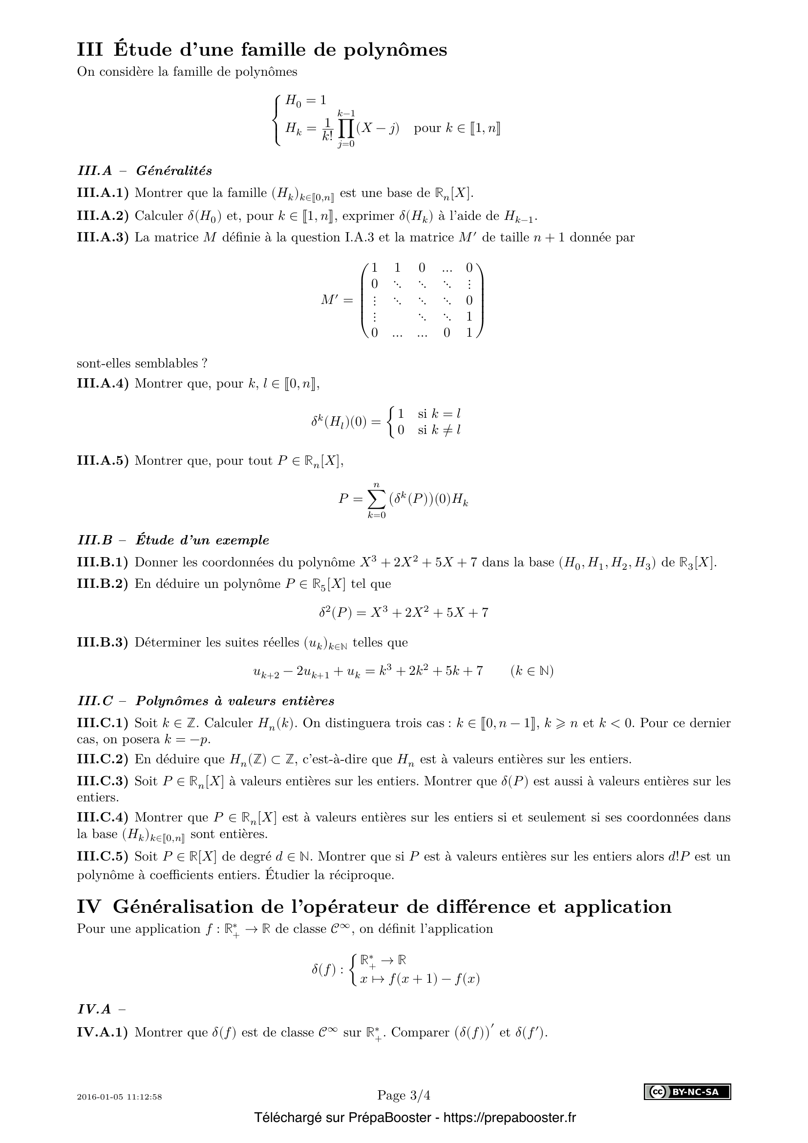 L’opérateur δ, défini par δ(P) = P(X+1) – P(X), est essentiel car il permet d’étudier les différences finies, un outil clé en analyse numérique et en combinatoire. Dans ce sujet, il est utilisé pour caractériser les polynômes à valeurs entières sur les entiers (partie III.C). Par exemple, la question III.C.5 montre que si P est à valeurs entières, alors δ(P) l’est aussi. Pour approfondir, explore les corrigés et les exercices sur Prépa Booster !