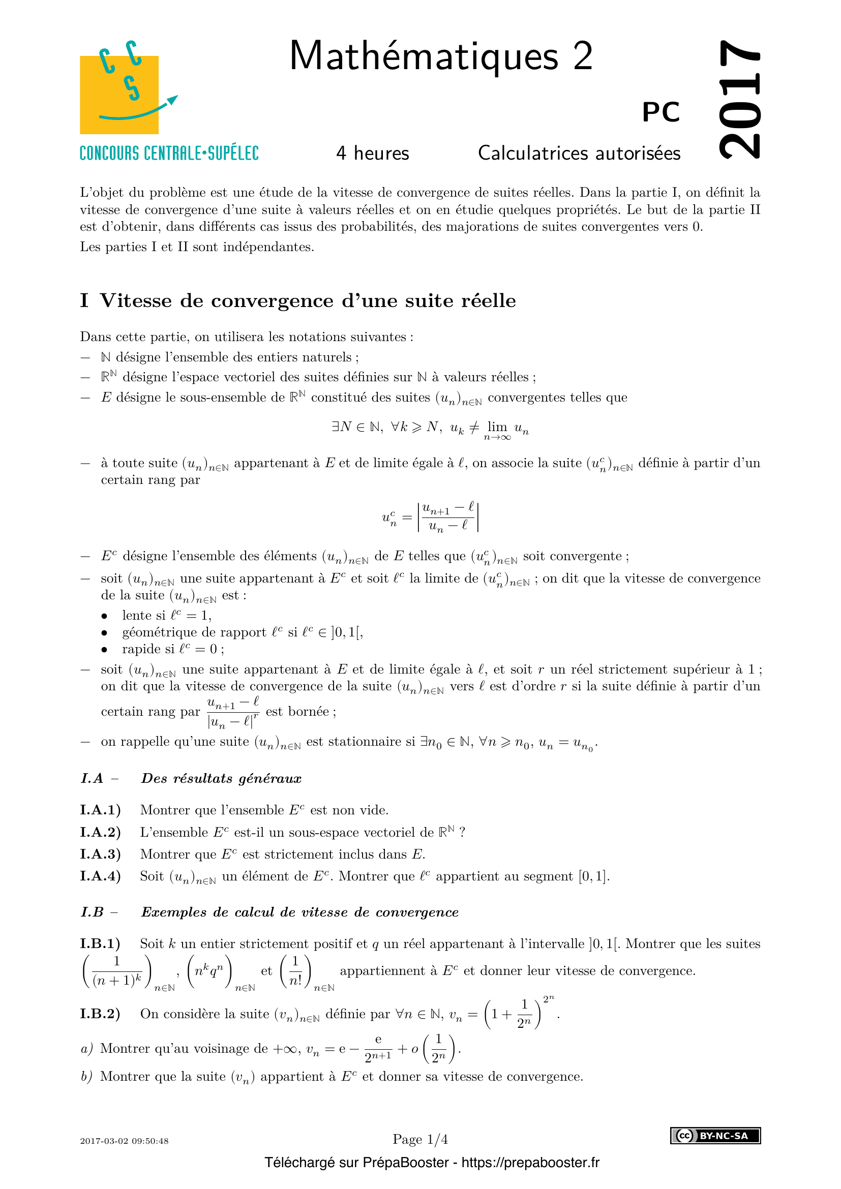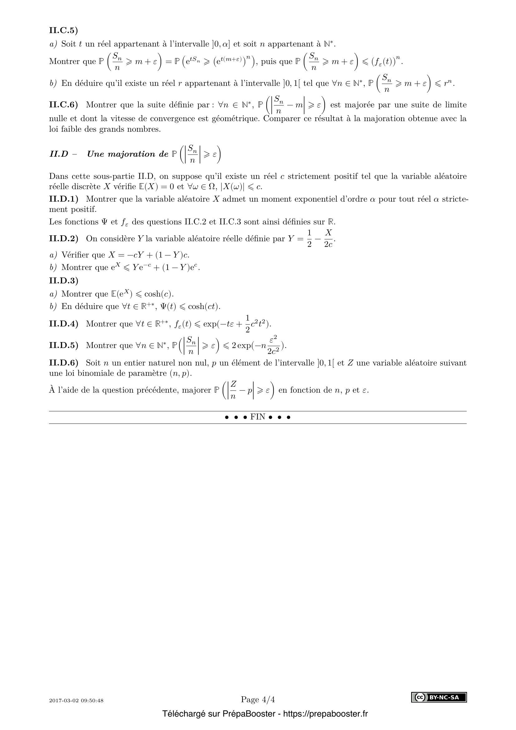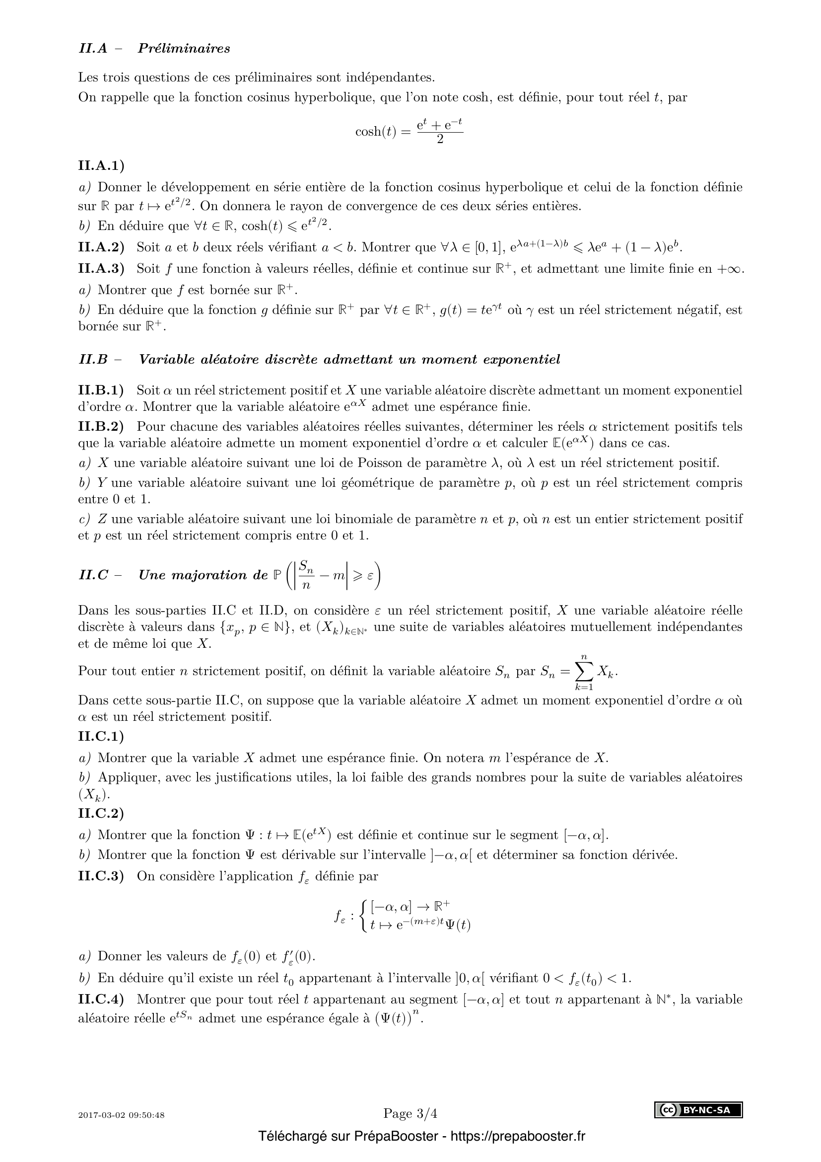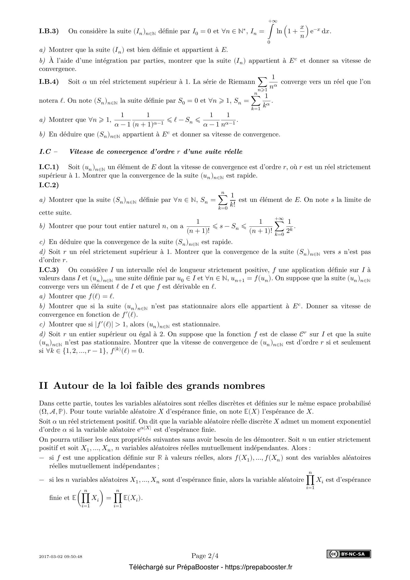 1. I.A.1) Montrer que l’ensemble $E_c$ est non vide. 2. I.A.2) L’ensemble $E_c$ est-il un sous-espace vectoriel de $\mathbb{R}^{\mathbb{N}}$ ? 3. I.A.3) Montrer que $E_c$ est strictement inclus dans $E$. 4. I.A.4) Soit $(u_n)_{n \in \mathbb{N}}$ un élément de $E_c$. Montrer que $\ell_c$ appartient au segment $[0, 1]$. 5. I.B.1) Soit $k$ un entier strictement positif et $q$ un réel appartenant à l’intervalle $]0, 1[$. Montrer que les suites $\left(\frac{1}{(n+1)^k}\right)_{n \in \mathbb{N}}$, $\left(n^k q^n\right)_{n \in \mathbb{N}}$ et $\left(\frac{1}{n!}\right)_{n \in \mathbb{N}}$ appartiennent à $E_c$ et donner leur vitesse de convergence.} 6. I.B.2) On considère la suite $(v_n)_{n \in \mathbb{N}}$ définie par $\forall n \in \mathbb{N},\ v_n = \left(1 + \frac{1}{2^n}\right)^{2^n}$. \\ a) Montrer qu’au voisinage de $+\infty$, $v_n = e – \frac{e}{2^{n+1}} + o\left(\frac{1}{2^n}\right)$.\\ b) Montrer que la suite $(v_n)$ appartient à $E_c$ et donner sa vitesse de convergence. 7. I.B.3) On considère la suite $(I_n)_{n \in \mathbb{N}}$ définie par $I_0 = 0$ et $\forall n \in \mathbb{N}^*,\ I_n = \int_0^{+\infty} \ln(1 + x^n) e^{-x}\, dx$.\\ a) Montrer que la suite $(I_n)$ est bien définie et appartient à $E$.\\ b) À l’aide d’une intégration par parties, montrer que la suite $(I_n)$ appartient à $E_c$ et donner sa vitesse de convergence. 8. I.B.4) Soit $\alpha$ un réel strictement supérieur à 1. La série de Riemann $\sum_{n \geq 1} \frac{1}{n^{\alpha}}$ converge vers un réel que l’on notera $\ell$. On note $(S_n)_{n \in \mathbb{N}}$ la suite définie par $S_0 = 0$ et $\forall n \geq 1,\ S_n = \sum_{k=1}^{n} \frac{1}{k^{\alpha}}$.\\ a) Montrer que $\forall n \geq 1,\ \frac{1}{\alpha – 1}\cdot \frac{1}{(n+1)^{\alpha – 1}} \leq \ell – S_n \leq \frac{1}{\alpha – 1}\cdot \frac{1}{n^{\alpha-1}}$.\\ b) En déduire que $(S_n)_{n \in \mathbb{N}}$ appartient à $E_c$ et donner sa vitesse de convergence. 9. I.C.1) Soit $(u_n)_{n \in \mathbb{N}}$ un élément de $E$ dont la vitesse de convergence est d’ordre $r$, où $r$ est un réel strictement supérieur à 1. Montrer que la convergence de la suite $(u_n)_{n \in \mathbb{N}}$ est rapide. 10. I.C.2)\\ a) Montrer que la suite $(S_n)_{n \in \mathbb{N}}$ définie par $\forall n \in \mathbb{N},\ S_n = \sum_{k=0}^n \frac{1}{k!}$ est un élément de $E$. On note $s$ la limite de cette suite.\\ b) Montrer que pour tout entier naturel $n$, on a $\frac{1}{(n+1)!} \leq s – S_n \leq \frac{1}{(n+1)!} \sum_{k=0}^{+\infty} \frac{1}{2^k}$.\\ c) En déduire que la convergence de la suite $(S_n)_{n \in \mathbb{N}}$ est rapide.\\ d) Soit $r$ un réel strictement supérieur à 1. Montrer que la convergence de la suite $(S_n)_{n \in \mathbb{N}}$ vers $s$ n’est pas d’ordre $r$.} 11. I.C.3) On considère $I$ un intervalle réel de longueur strictement positive, $f$ une application définie sur $I$ à valeurs dans $I$ et $(u_n)_{n \in \mathbb{N}}$ une suite définie par $u_0 \in I$ et $\forall n \in \mathbb{N},\ u_{n+1} = f(u_n)$. On suppose que la suite $(u_n)_{n \in \mathbb{N}}$ converge vers un élément $\ell$ de $I$ et que $f$ est dérivable en $\ell$.\\ a) Montrer que $f(\ell) = \ell$.\\ b) Montrer que si la suite $(u_n)_{n \in \mathbb{N}}$ n’est pas stationnaire alors elle appartient à $E_c$. Donner sa vitesse de convergence en fonction de $f'(\ell)$.\\ c) Montrer que si $|f'(\ell)| > 1$, alors $(u_n)_{n \in \mathbb{N}}$ est stationnaire.\\ d) Soit $r$ un entier supérieur ou égal à $2$. On suppose que la fonction $f$ est de classe $\mathcal{C}^r$ sur $I$ et que la suite $(u_n)_{n \in \mathbb{N}}$ n’est pas stationnaire. Montrer que la vitesse de convergence de $(u_n)_{n \in \mathbb{N}}$ est d’ordre $r$ si et seulement si $\forall k \in \{1, 2, \ldots, r-1\},\ f^{(k)}(\ell) = 0$. 12. II.A.1)\\ a) Donner le développement en série entière de la fonction cosinus hyperbolique et celui de la fonction définie sur $\mathbb{R}$ par $t \mapsto e^{t^2/2}$. On donnera le rayon de convergence de ces deux séries entières.\\ b) En déduire que $\forall t \in \mathbb{R},\ \cosh(t) \leq e^{t^2/2}$. 13. II.A.2) Soit $a$ et $b$ deux réels vérifiant $a < b$. Montrer que $\forall \lambda \in [0,1],\ e^{\lambda a + (1-\lambda) b} \leq \lambda e^{a} + (1-\lambda) e^{b}$. 14. II.A.3) Soit $f$ une fonction à valeurs réelles, définie et continue sur $\mathbb{R}_+$, et admettant une limite finie en $+\infty$.\\ a) Montrer que $f$ est bornée sur $\mathbb{R}_+$.\\ b) En déduire que la fonction $g$ définie sur $\mathbb{R}_+$ par $\forall t \in \mathbb{R}_+,\ g(t) = t e^{\gamma t}$ où $\gamma$ est un réel strictement négatif, est bornée sur $\mathbb{R}_+$. 15. II.B.1) Soit $\alpha$ un réel strictement positif et $X$ une variable aléatoire discrète admettant un moment exponentiel d’ordre $\alpha$. Montrer que la variable aléatoire $e^{\alpha X}$ admet une espérance finie.} 16. II.B.2) Pour chacune des variables aléatoires réelles suivantes, déterminer les réels $\alpha$ strictement positifs tels que la variable aléatoire admette un moment exponentiel d’ordre $\alpha$ et calculer $\mathbb{E}(e^{\alpha X})$ dans ce cas.\\ a) $X$ une variable aléatoire suivant une loi de Poisson de paramètre $\lambda$, où $\lambda$ est un réel strictement positif.\\ b) $Y$ une variable aléatoire suivant une loi géométrique de paramètre $p$, où $p$ est un réel strictement compris entre 0 et 1.\\ c) $Z$ une variable aléatoire suivant une loi binomiale de paramètre $n$ et $p$, où $n$ est un entier strictement positif et $p$ est un réel strictement compris entre 0 et 1. 17. II.C.1)\\ a) Montrer que la variable $X$ admet une espérance finie. On notera $m$ l’espérance de $X$.\\ b) Appliquer, avec les justifications utiles, la loi faible des grands nombres pour la suite de variables aléatoires $(X_k)$. 18. II.C.2)\\ a) Montrer que la fonction $\Psi : t \mapsto \mathbb{E}(e^{tX})$ est définie et continue sur le segm