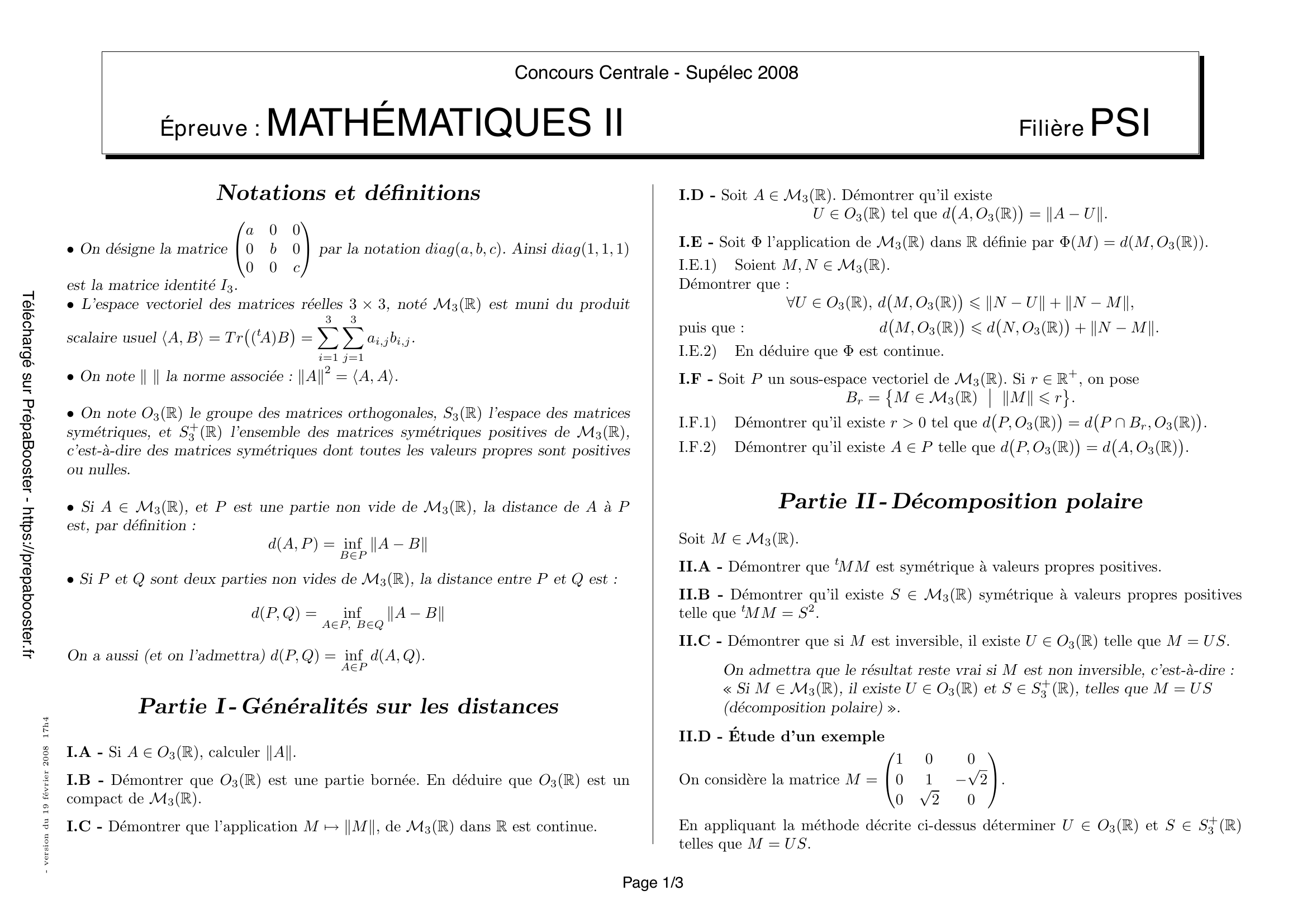 Le sujet de mathématiques PSI Centrale 2008 aborde des notions clés de l’algèbre linéaire telles que les matrices orthogonales (O₃(ℝ)), la norme matricielle, la compacité, la continuité des applications, la distance entre un espace vectoriel et un compact, la décomposition polaire des matrices, ainsi que l’analyse des valeurs propres et les propriétés des matrices symétriques. On y retrouve également un volet géométrique avec l’étude d’ensembles et la distance d’une matrice à un ensemble d’orthogonaux. Ces notions sont fondamentales pour aborder avec sérénité le programme de mathématiques en classe préparatoire PSI.