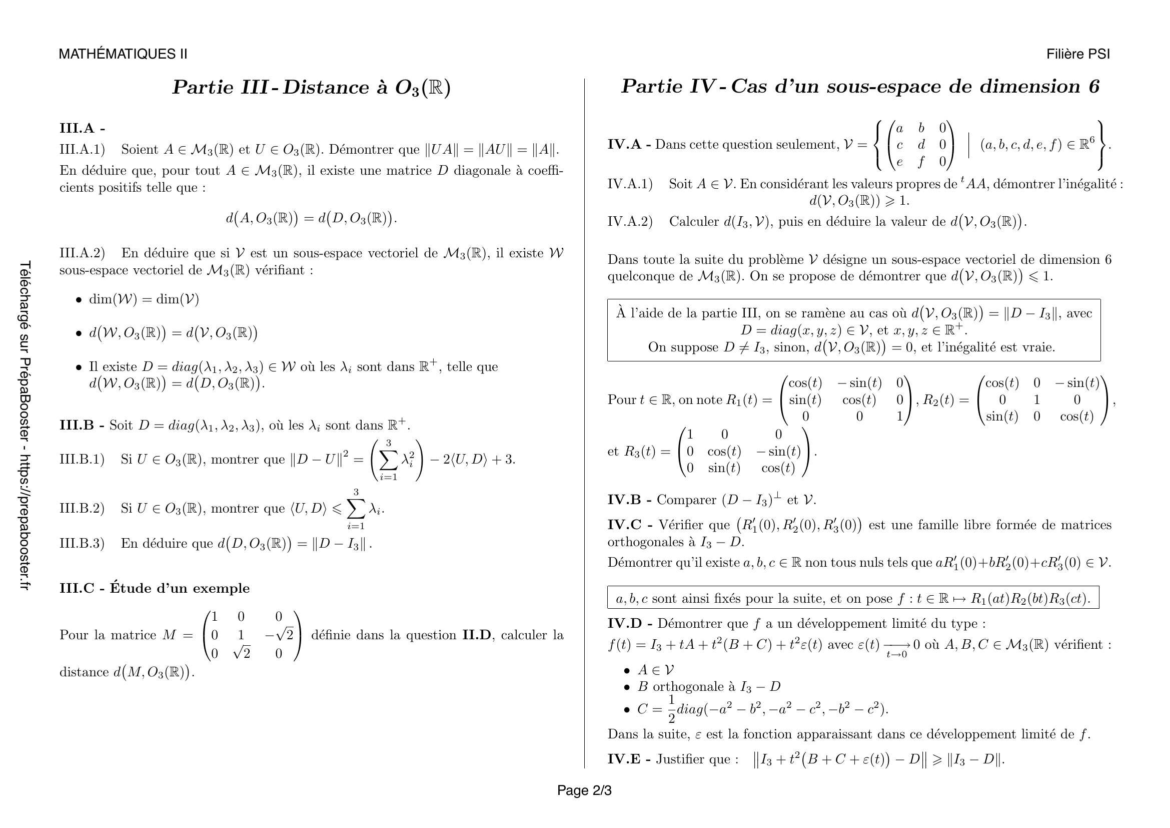 1. I.A – Si $A \in O_3(\mathbb{R})$, calculer $\|A\|$. 2. I.B – D\’emontrer que $O_3(\mathbb{R})$ est une partie born\’ee. En d\’eduire que $O_3(\mathbb{R})$ est un compact de $M_3(\mathbb{R})$. 3. I.C – D\’emontrer que l’application $M \mapsto \|M\|$, de $M_3(\mathbb{R})$ dans $\mathbb{R}$ est continue. 4. I.D – Soit $A \in M_3(\mathbb{R})$. D\’emontrer qu’il existe $U \in O_3(\mathbb{R})$ tel que $d(A, O_3(\mathbb{R})) = \|A – U\|$. 5. I.E – Soit $\Phi$ l’application de $M_3(\mathbb{R})$ dans $\mathbb{R}$ d\’efinie par $\Phi(M) = d(M, O_3(\mathbb{R}))$.} 6. I.E.1) Soient $M, N \in M_3(\mathbb{R})$. D\’emontrer que : $\forall U \in O_3(\mathbb{R}), d(M, O_3(\mathbb{R})) \leq \|N-U\| + \|N – M\|$, puis que : $d(M, O_3(\mathbb{R})) \leq d(N, O_3(\mathbb{R})) + \|N-M\|$. 7. I.E.2) En d\’eduire que $\Phi$ est continue. 8. I.F – Soit $P$ un sous-espace vectoriel de $M_3(\mathbb{R})$. Si $r \in \mathbb{R}_+$, on pose $B_r = \{M \in M_3(\mathbb{R}) \mid \|M\| \leq r\}$. 9. I.F.1) D\’emontrer qu’il existe $r > 0$ tel que $d(P, O_3(\mathbb{R})) = d(P \cap B_r, O_3(\mathbb{R}))$. 10. I.F.2) D\’emontrer qu’il existe $A \in P$ telle que $d(P, O_3(\mathbb{R})) = d(A, O_3(\mathbb{R}))$.} 11. II.A – D\’emontrer que $^tMM$ est sym\’etrique \`a valeurs propres positives. 12. II.B – D\’emontrer qu’il existe $S \in M_3(\mathbb{R})$ sym\’etrique \`a valeurs propres positives telle que $^tMM = S^2$. 13. II.C – D\’emontrer que si $M$ est inversible, il existe $U \in O_3(\mathbb{R})$ telle que $M = US$. On admettra que le r\’esultat reste vrai si $M$ est non inversible, c’est-\`a-dire : « Si $M \in M_3(\mathbb{R})$, il existe $U \in O_3(\mathbb{R})$ et $S \in S^+_3(\mathbb{R})$, telles que $M = US$ (d\’ecomposition polaire) ». 14. II.D – Etude d’un exemple. On consid\`ere la matrice $M = \begin{pmatrix} 1 & 0 & 0 \\ 0 & 1 & -\sqrt{2} \\ 0 & \sqrt{2} & 0 \end{pmatrix}$. En appliquant la m\’ethode d\’ecrite ci-dessus d\’eterminer $U \in O_3(\mathbb{R})$ et $S \in S^+_3(\mathbb{R})$ telles que $M=US$.} 15. III.A.1) Soient $A \in M_3(\mathbb{R})$ et $U \in O_3(\mathbb{R})$. D\’emontrer que $\|UA\| = \|AU\| = \|A\|$. En d\’eduire que, pour tout $A \in M_3(\mathbb{R})$, il existe une matrice $D$ diagonale \`a coefficients positifs telle que : $d(A, O_3(\mathbb{R})) = d(D, O_3(\mathbb{R}))$. 16. III.A.2) En d\’eduire que si $V$ est un sous-espace vectoriel de $M_3(\mathbb{R})$, il existe $W$ sous-espace vectoriel de $M_3(\mathbb{R})$ v\’erifiant :\\ • $\dim(W) = \dim(V)$\\ • $d(W, O_3(\mathbb{R})) = d(V, O_3(\mathbb{R}))$\\ • Il existe $D = \mathrm{diag}(\lambda_1, \lambda_2, \lambda_3) \in W$ o\`u les $\lambda_i$ sont dans $\mathbb{R}_+$, telle que $d(W, O_3(\mathbb{R})) = d(D, O_3(\mathbb{R}))$. 17. III.B.1) Soit $D = \mathrm{diag}(\lambda_1, \lambda_2, \lambda_3)$, o\`u les $\lambda_i$ sont dans $\mathbb{R}_+$. Si $U \in O_3(\mathbb{R})$, montrer que $\|D – U\|^2 = (\sum_{i=1}^3 \lambda_i^2) – 2\langle U, D\rangle + 3$. 18. III.B.2) Si $U \in O_3(\mathbb{R})$, montrer que $\langle U, D \rangle \leq \sum_{i=1}^3 \lambda_i$. 19. III.B.3) En d\’eduire que $d(D, O_3(\mathbb{R})) = \|D – I_3\|$.} 20. III.C – Etude d’un exemple : Pour la matrice $M = \begin{pmatrix} 1 & 0 & 0 \\ 0 & 1 & -\sqrt{2} \\ 0 & \sqrt{2} & 0 \end{pmatrix}$ d\’efinie dans la question II.D, calculer la distance $d(M, O_3(\mathbb{R}))$. 21. IV.A.1) Soit $A \in V$. En consid\’erant les valeurs propres de $^tAA$, d\’emontrer l’in\’egalit\’e : $d(V, O_3(\mathbb{R})) > 1$. 22. IV.A.2) Calculer $d(I_3, V)$, puis en d\’eduire la valeur de $d(V, O_3(\mathbb{R}))$. 23. IV.B – Comparer $(D – I_3)^\perp$ et $V$. 24. IV.C – V\’erifier que $(R_1′(0), R_2′(0), R_3′(0))$ est une famille libre form\’ee de matrices orthogonales \`a $I_3 – D$. D\’emontrer qu’il existe $a, b, c \in \mathbb{R}$ non tous nuls tels que $aR_1′(0)+bR_2′(0)+cR_3′(0) \in V$. $a, b, c$ sont ainsi fix\’es pour la suite, et on pose $f : t \in \mathbb{R} \mapsto R_1(at) R_2(bt) R_3(ct)$.} 25. IV.D – D\’emontrer que $f$ a un d\’eveloppement limit\’e du type :\\ $f(t) = I_3 + tA + t^2(B + C) + t^2 \epsilon(t)$ avec $\epsilon(t) \xrightarrow[t \to 0]{} 0$ o\`u $A, B, C \in M_3(\mathbb{R})$ v\’erifient :\\ • $A \in V$ \\ • $B$ orthogonale \`a $I_3 – D$\\ • $C = \frac{1}{2}\mathrm{diag}(-a^2-b^2, -a^2-c^2, -b^2-c^2)$.\\ Dans la suite, $\epsilon$ est la fonction apparaissant dans ce d\’eveloppement limit\’e de $f$. 26. IV.E – Justifier que : $\|I_3 + t^2(B + C + \epsilon(t)) – D\| > \|I_3 – D\|$. 27. IV.F – \’Etablir que :\\ $\|I_3 + t^2(B + C + \epsilon(t)) – D\|^2 = \|I_3 – D\|^2 + 2 t^2 \langle I_3 – D, C \rangle + t^2 \epsilon_2(t)$\\ avec $\epsilon_2(t) \xrightarrow[t \to 0]{} 0$. Qu’en d\’eduire sur $\langle I_3 – D, C \rangle$ ? 28. IV.G – D\’emontrer que l’un au moins des trois r\’eels $2 – x – y$, $2 – y – z$, $2 – x – z$ est n\’egatif ou nul.\\ On suppose pour la suite, ce qui ne change rien, que $2 – x – y \leq 0$. 29. IV.H – D\’emontrer que $x^2 + y^2 + z^2 = x + y + z$.} 30. IV.I – Identifier g\’eom\’etriquement les ensembles suivants :\\ • $E = \{ (x, y, z) \in \mathbb{R}^3 \mid x^2 + y^2 + z^2 = x + y + z \}$,\\ • $F = \{ (x, y, z) \in \mathbb{R}^3 \mid x + y = 2 \}$,\\ • $G = \{ (x, y, z) \in \mathbb{R}^3 \mid x + y > 2 \}$ .,\\ Justifier que $E \cap F$ est un cercle dont on d\’eterminera le rayon. Quel est le diam\`etre de $E \cap G$ (c’est-\`a-dire la distance maximum entre deux de ses points) ? 31. IV.J – D\’emontrer que $d(V, O_3(\mathbb{R})) \leq 1$.}FAQ