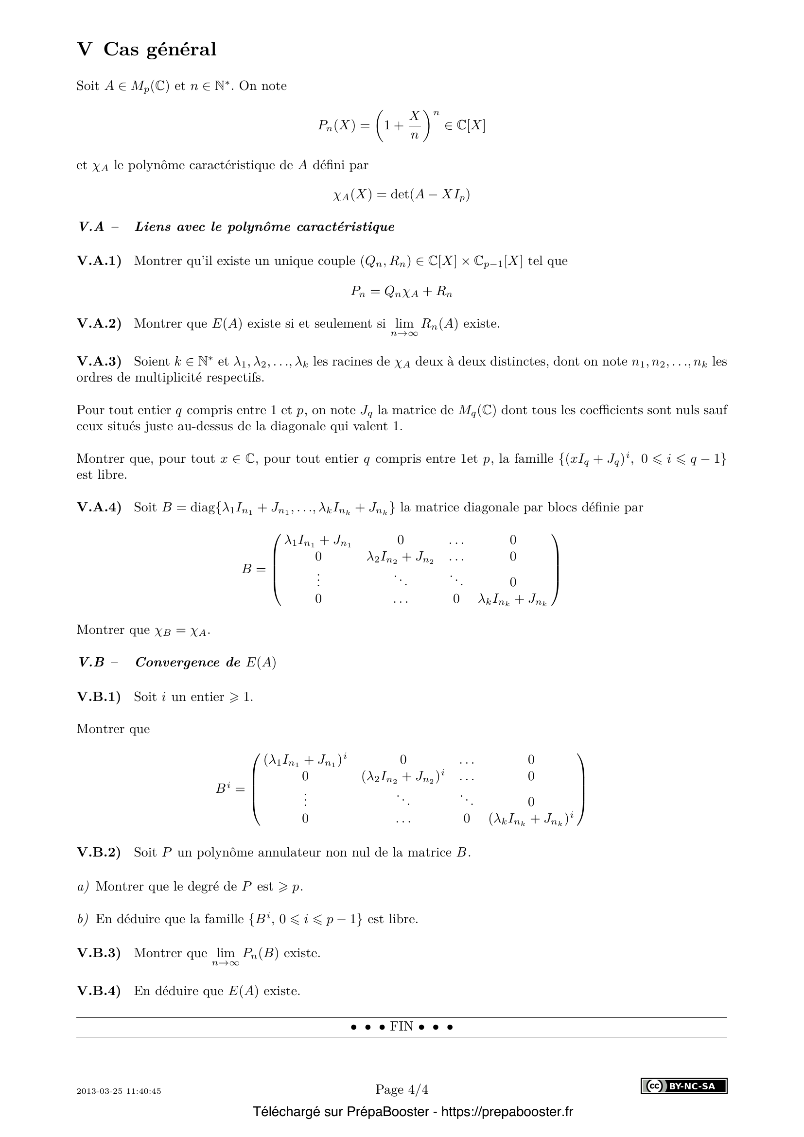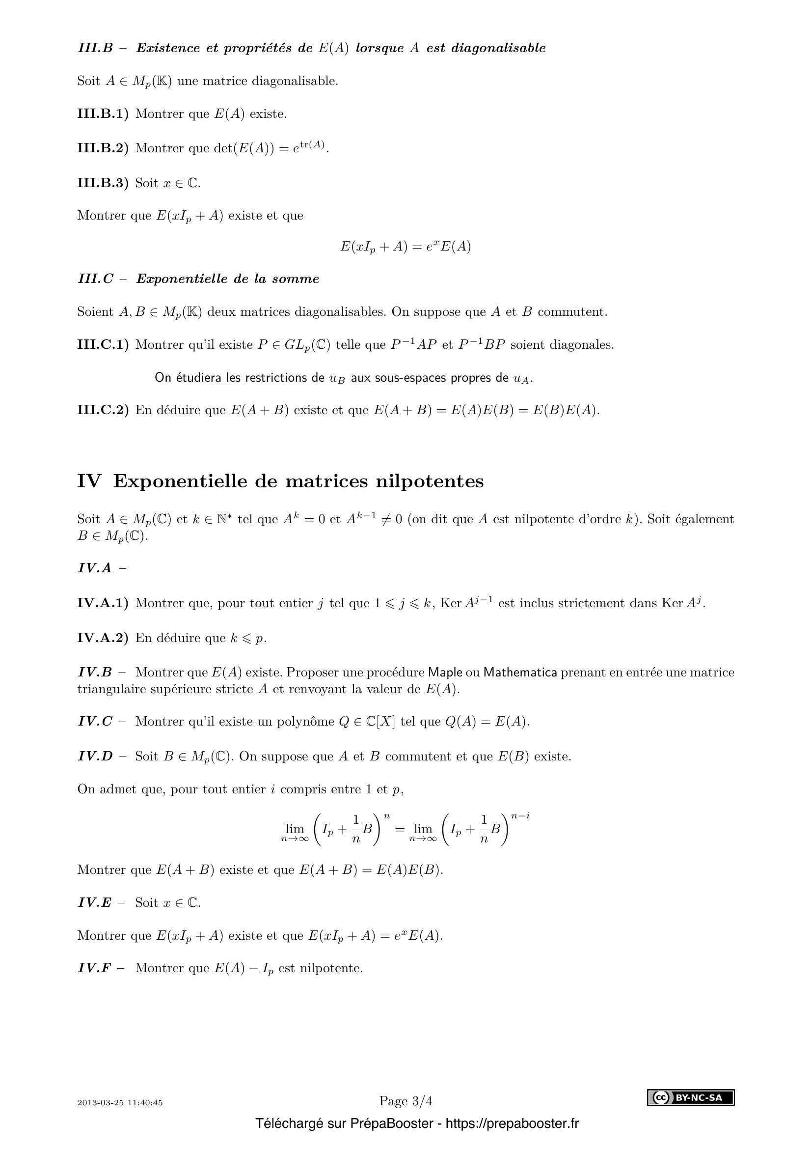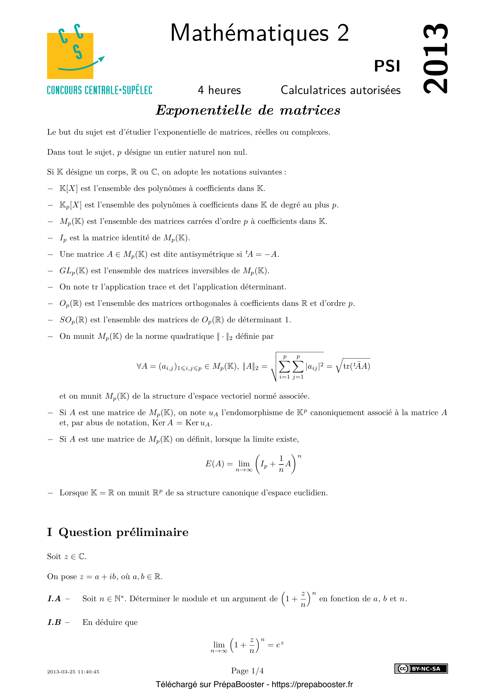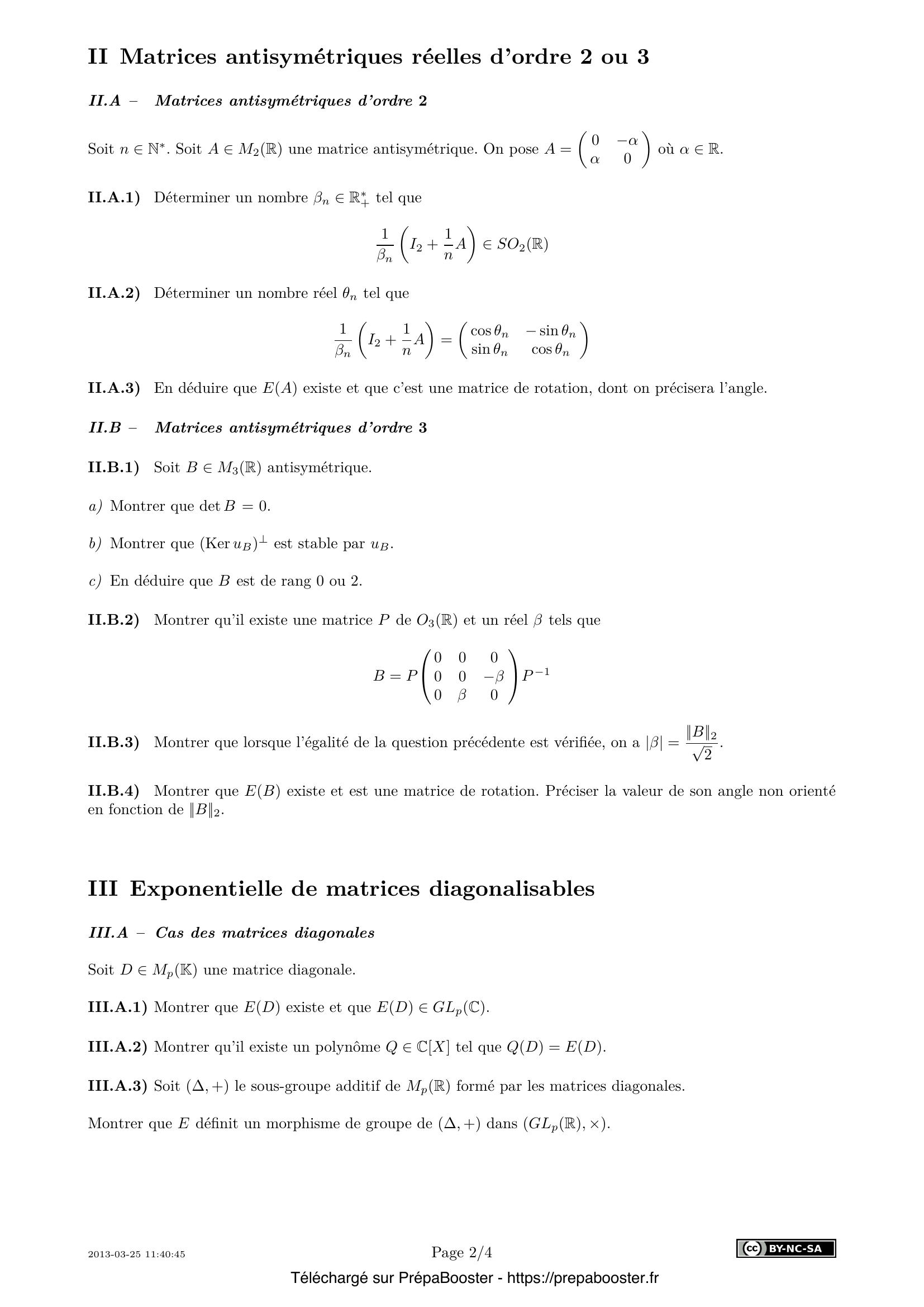 1. I.A – Soit $n \in \mathbb{N}^*$. Déterminer le module et un argument de $\left(1 + \dfrac{z}{n}\right)^n$ en fonction de $a$, $b$ et $n$. 2. I.B – En déduire que $\displaystyle \lim_{n \to \infty} \left(1 + \dfrac{z}{n}\right)^n = e^z$. 3. II.A.1) Déterminer un nombre $\beta_n \in \mathbb{R}_+^*$ tel que $\dfrac{1}{\beta_n}\left(I_2 + \dfrac{1}{n}A\right) \in SO_2(\mathbb{R})$. 4. II.A.2) Déterminer un nombre réel $\theta_n$ tel que $\dfrac{1}{\beta_n}\left(I_2 + \dfrac{1}{n}A\right) = \begin{pmatrix} \cos \theta_n & -\sin \theta_n \\ \sin \theta_n & \cos \theta_n \end{pmatrix}$. 5. II.A.3) En déduire que $E(A)$ existe et que c’est une matrice de rotation, dont on précisera l’angle.} 6. II.B.1) Soit $B \in M_3(\mathbb{R})$ antisymétrique. \begin{itemize} \item[a)] Montrer que $\det B = 0$. \item[b)] Montrer que $(\Ker u_B)^\perp$ est stable par $u_B$. \item[c)] En déduire que $B$ est de rang $0$ ou $2$. \end{itemize} 7. II.B.2) Montrer qu’il existe une matrice $P$ de $O_3(\mathbb{R})$ et un réel $\beta$ tels que $$ B = P \begin{pmatrix} 0 & 0 & 0 \\ 0 & 0 & -\beta \\ 0 & \beta & 0 \end{pmatrix} P^{-1}. $$ 8. II.B.3) Montrer que lorsque l’égalité de la question précédente est vérifiée, on a $|\beta| = \dfrac{\|B\|_2}{\sqrt{2}}$. 9. II.B.4) Montrer que $E(B)$ existe et est une matrice de rotation. Préciser la valeur de son angle non orienté en fonction de $\|B\|_2$. 10. III.A.1) Montrer que $E(D)$ existe et que $E(D) \in GL_p(\mathbb{C})$.} 11. III.A.2) Montrer qu’il existe un polynôme $Q \in \mathbb{C}[X]$ tel que $Q(D) = E(D)$. 12. III.A.3) Soit $(\Delta, +)$ le sous-groupe additif de $M_p(\mathbb{R})$ formé par les matrices diagonales. Montrer que $E$ définit un morphisme de groupe de $(\Delta, +)$ dans $(GL_p(\mathbb{R}), \times)$. 13. III.B.1) Montrer que $E(A)$ existe. 14. III.B.2) Montrer que $\det(E(A)) = e^{\operatorname{tr}(A)}$. 15. III.B.3) Soit $x \in \mathbb{C}$. Montrer que $E(xI_p + A)$ existe et que $E(xI_p + A) = e^{x}E(A)$.} 16. III.C.1) Soient $A$, $B \in M_p(K)$ deux matrices diagonalisables. On suppose que $A$ et $B$ commutent. Montrer qu’il existe $P \in GL_p(\mathbb{C})$ telle que $P^{-1}AP$ et $P^{-1}BP$ soient diagonales. On étudiera les restrictions de $u_B$ aux sous-espaces propres de $u_A$. 17. III.C.2) En déduire que $E(A+B)$ existe et que $E(A+B) = E(A)E(B) = E(B)E(A)$. 18. IV.A.1) Montrer que, pour tout entier $j$ tel que $1 \leqslant j \leqslant k$, $\Ker A^{j-1}$ est inclus strictement dans $\Ker A^j$. 19. IV.A.2) En déduire que $k \leqslant p$. 20. IV.B – Montrer que $E(A)$ existe. Proposer une procédure Maple ou Mathematica prenant en entrée une matrice triangulaire supérieure stricte $A$ et renvoyant la valeur de $E(A)$.} 21. IV.C – Montrer qu’il existe un polynôme $Q \in \mathbb{C}[X]$ tel que $Q(A) = E(A)$. 22. IV.D – Soit $B \in M_p(\mathbb{C})$. On suppose que $A$ et $B$ commutent et que $E(B)$ existe. On admet que, pour tout entier $i$ compris entre $1$ et $p$, $$ \lim_{n \to \infty} \left(I_p + \frac{1}{n} B\right)^n = \lim_{n \to \infty} \left(I_p + \frac{1}{n} B\right)^{n-i}. $$ Montrer que $E(A+B)$ existe et que $E(A+B) = E(A)E(B)$. 23. IV.E – Soit $x \in \mathbb{C}$. Montrer que $E(xI_p + A)$ existe et que $E(xI_p + A) = e^x E(A)$. 24. IV.F – Montrer que $E(A) – I_p$ est nilpotente. 25. V.A.1) Montrer qu’il existe un unique couple $(Q_n, R_n) \in \mathbb{C}[X] \times \mathbb{C}_{p-1}[X]$ tel que $P_n = Q_n \chi_A + R_n$.} 26. V.A.2) Montrer que $E(A)$ existe si et seulement si $\lim_{n \to \infty} R_n(A)$ existe. 27. V.A.3) Soient $k \in \mathbb{N}^*$ et $\lambda_1, \lambda_2, \ldots, \lambda_k$ les racines de $\chi_A$ deux à deux distinctes, dont on note $n_1, n_2, \ldots, n_k$ les ordres de multiplicité respectifs. Pour tout entier $q$ compris entre $1$ et $p$, on note $J_q$ la matrice de $M_q(\mathbb{C})$ dont tous les coefficients sont nuls sauf ceux situés juste au-dessus de la diagonale qui valent $1$. Montrer que, pour tout $x \in \mathbb{C}$, pour tout entier $q$ compris entre $1$ et $p$, la famille $\{(xI_q + J_q)^i,\, 0 \leqslant i \leqslant q-1\}$ est libre. 28. V.A.4) Soit $B = \operatorname{diag}\{\lambda_1 I_{n_1} + J_{n_1}, \ldots, \lambda_k I_{n_k} + J_{n_k}\}$ la matrice diagonale par blocs définie par $$ B = \begin{pmatrix} \lambda_1 I_{n_1} + J_{n_1} & 0 & \cdots & 0 \\ 0 & \lambda_2 I_{n_2} + J_{n_2} & \cdots & 0 \\ \vdots & \vdots & \ddots & \vdots \\ 0 & 0 & \cdots & \lambda_k I_{n_k} + J_{n_k} \end{pmatrix} $$ Montrer que $\chi_B = \chi_A$. 29. V.B.1) Soit $i$ un entier $> 1$. Montrer que $$ B^i = \begin{pmatrix} (\lambda_1 I_{n_1} + J_{n_1})^i & 0 & \cdots & 0 \\ 0 & (\lambda_2 I_{n_2} + J_{n_2})^i & \cdots & 0 \\ \vdots & \vdots & \ddots & \vdots \\ 0 & 0 & \cdots & (\lambda_k I_{n_k} + J_{n_k})^i \end{pmatrix}. $$ 30. V.B.2) Soit $P$ un polynôme annulateur non nul de la matrice $B$. \begin{itemize} \item[a)] Montrer que le degré de $P$ est $> p$. \item[b)] En déduire que la famille $\{B^i, 0 \leqslant i \leqslant p-1\}$ est libre. \end{itemize}} 31. V.B.3) Montrer que $\lim_{n \to \infty} P_n(B)$ existe. 32. V.B.4) En déduire que $E(A)$ existe.}FAQ