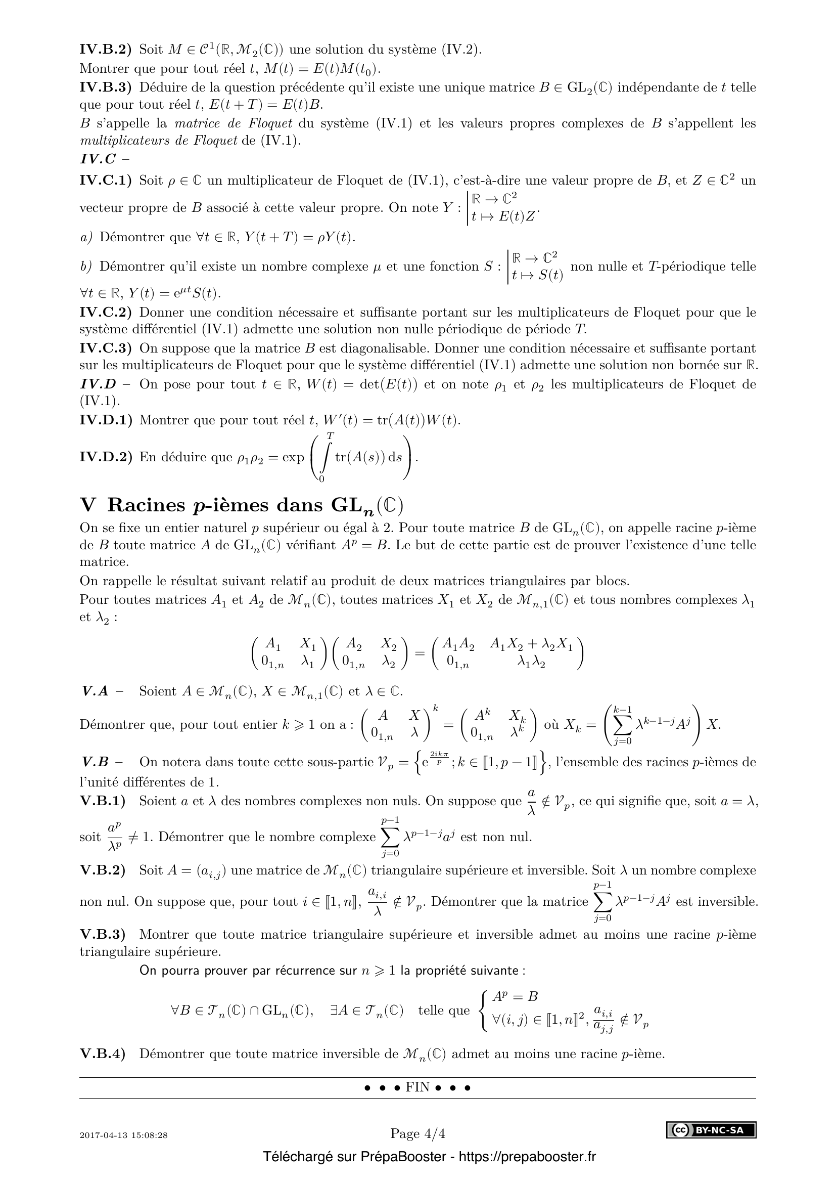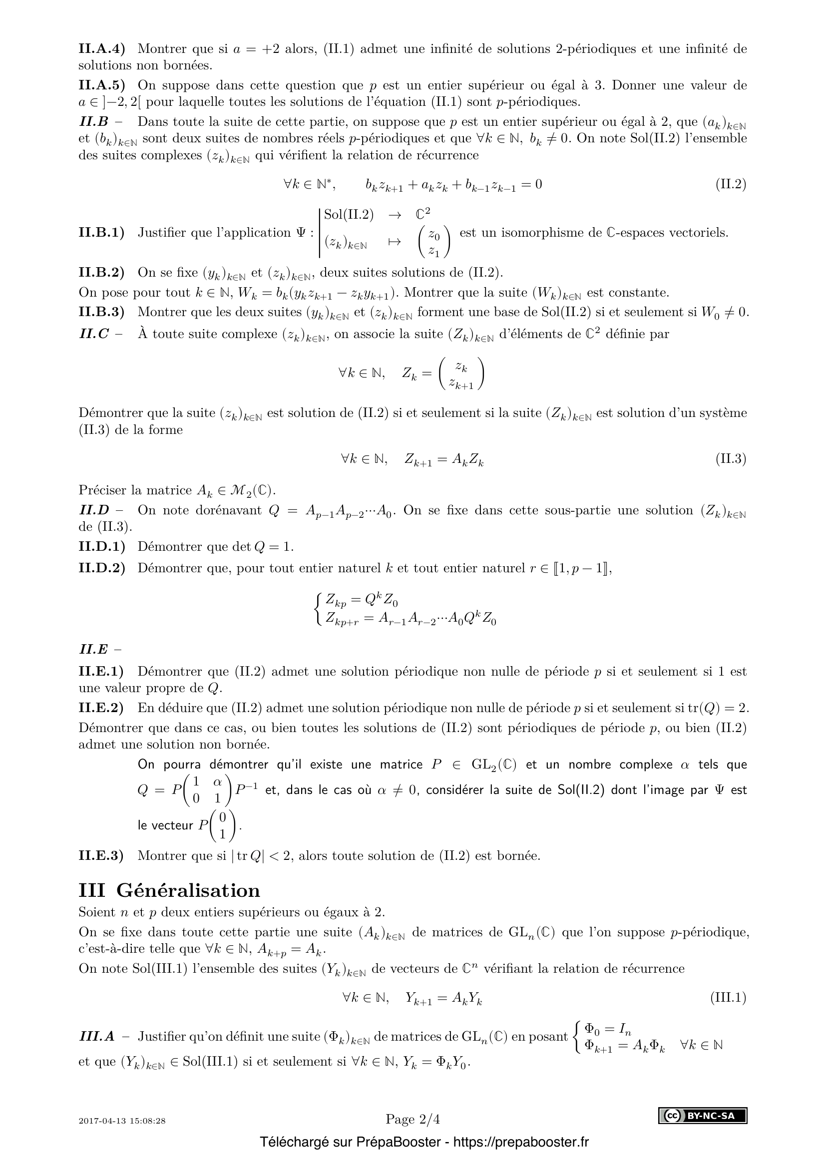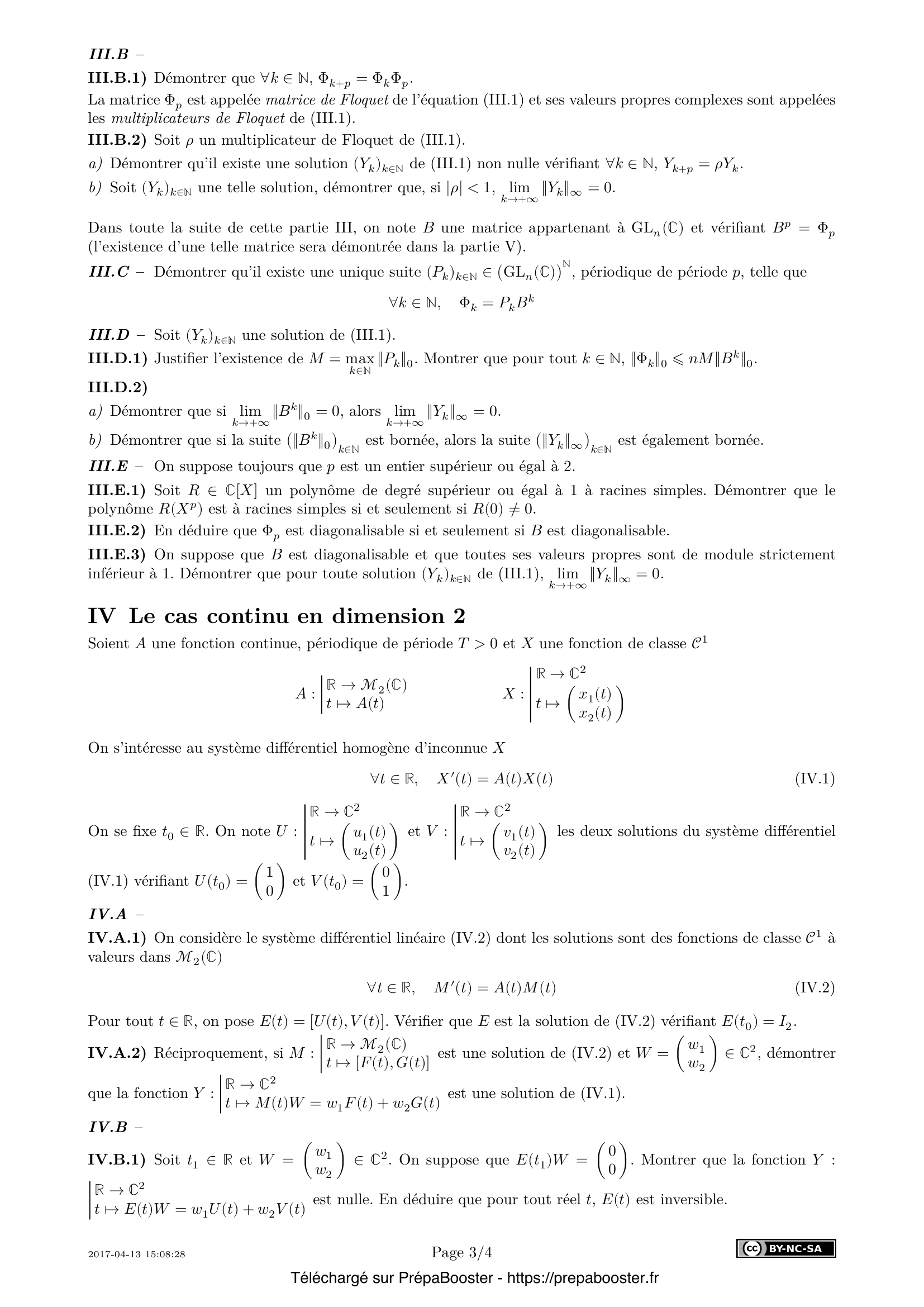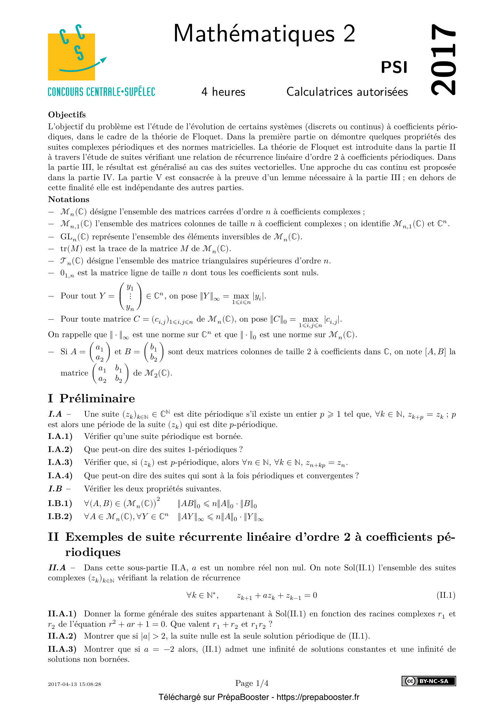 1. I.A.1) Vérifier qu’une suite périodique est bornée. 2. I.A.2) Que peut-on dire des suites 1-périodiques ? 3. I.A.3) Vérifier que, si $(z_k)$ est $p$-périodique, alors $\forall n \in \mathbb{N}, \forall k \in \mathbb{N}, z_{n+k p} = z_n$. 4. I.A.4) Que peut-on dire des suites qui sont à la fois périodiques et convergentes ? 5. I.B.1) $\forall (A, B) \in (\mathcal{M}_n(\mathbb{C}))^2$, $\|AB\|_0 \leq n\|A\|_0 \cdot \|B\|_0$} 6. I.B.2) $\forall A \in \mathcal{M}_n(\mathbb{C}), \forall Y \in \mathbb{C}^n$, $\|AY\|_\infty \leq n \|A\|_0 \cdot \|Y\|_\infty$ 7. II.A.1) Donner la forme générale des suites appartenant à Sol(II.1) en fonction des racines complexes $r_1$ et $r_2$ de l’équation $r^2 + a r + 1 = 0$. Que valent $r_1+r_2$ et $r_1 r_2$? 8. II.A.2) Montrer que si $|a| > 2$, la suite nulle est la seule solution périodique de (II.1). 9. II.A.3) Montrer que si $a = -2$ alors, (II.1) admet une infinité de solutions constantes et une infinité de solutions non bornées. 10. II.A.4) Montrer que si $a = +2$ alors, (II.1) admet une infinité de solutions 2-périodiques et une infinité de solutions non bornées.} 11. II.A.5) On suppose dans cette question que $p$ est un entier supérieur ou égal à 3. Donner une valeur de $a \in ]-2,2[$ pour laquelle toutes les solutions de l’équation (II.1) sont $p$-périodiques. 12. II.B.1) Justifier que l’application $\Psi : \mathrm{Sol(II.2)} \to \mathbb{C}^2$, $(z_k)_{k \in \mathbb{N}} \mapsto \begin{pmatrix}z_0 \\ z_1\end{pmatrix}$ est un isomorphisme de $\mathbb{C}$-espaces vectoriels. 13. II.B.2) On se fixe $(y_k)_{k\in\mathbb{N}}$ et $(z_k)_{k\in\mathbb{N}}$, deux suites solutions de (II.2). On pose pour tout $k\in\mathbb{N}$, $W_k = b_k(y_k z_{k+1} – z_k y_{k+1})$. Montrer que la suite $(W_k)_{k\in\mathbb{N}}$ est constante. 14. II.B.3) Montrer que les deux suites $(y_k)_{k\in\mathbb{N}}$ et $(z_k)_{k\in\mathbb{N}}$ forment une base de $\mathrm{Sol(II.2)}$ si et seulement si $W_0 \ne 0$. 15. II.C) À toute suite complexe $(z_k)_{k \in \mathbb{N}}$, on associe la suite $(Z_k)_{k \in \mathbb{N}}$ d’éléments de $\mathbb{C}^2$ définie par $\forall k \in \mathbb{N}, Z_k = \begin{pmatrix}z_k \\ z_{k+1}\end{pmatrix}$. Démontrer que la suite $(z_k)_{k\in\mathbb{N}}$ est solution de (II.2) si et seulement si la suite $(Z_k)_{k\in\mathbb{N}}$ est solution d’un système (II.3) de la forme $\forall k\in\mathbb{N}, Z_{k+1}=A_k Z_k$. Préciser la matrice $A_k \in \mathcal{M}_2(\mathbb{C})$.} 16. II.D.1) Démontrer que $\det Q = 1$. 17. II.D.2) Démontrer que, pour tout entier naturel $k$ et tout entier naturel $r \in \llbracket 1, p-1\rrbracket$, $\{ Z_{k p} = Q^k Z_0\\ Z_{kp+r} = A_{r-1} A_{r-2} \cdots A_0 Q^k Z_0 \}$. 18. II.E.1) Démontrer que (II.2) admet une solution périodique non nulle de période $p$ si et seulement si 1 est une valeur propre de $Q$. 19. II.E.2) En déduire que (II.2) admet une solution périodique non nulle de période $p$ si et seulement si $\tr(Q) = 2$. Démontrer que dans ce cas, ou bien toutes les solutions de (II.2) sont périodiques de période $p$, ou bien (II.2) admet une solution non bornée. On pourra démontrer qu’il existe une matrice $P \in \mathrm{GL}_2(\mathbb{C})$ et un nombre complexe $\alpha$ tels que $Q = P \begin{pmatrix}1 & \alpha \\ 0 & 1\end{pmatrix} P^{-1}$ et, dans le cas où $\alpha \neq 0$, considérer la suite de Sol(II.2) dont l’image par $\Psi$ est le vecteur $P\begin{pmatrix}0 \\ 1\end{pmatrix}$. 20. II.E.3) Montrer que si $| \tr Q | < 2$, alors toute solution de (II.2) est bornée.} 21. III.A) Justifier qu’on définit une suite $(\Phi_k)_{k\in\mathbb{N}}$ de matrices de $\mathrm{GL}_n(\mathbb{C})$ en posant $ \Phi_0 = I_n, \; \Phi_{k+1} = A_k\Phi_k\ \forall k\in\mathbb{N}$ et que $(Y_k)_{k\in\mathbb{N}} \in \mathrm{Sol(III.1)}$ si et seulement si $\forall k\in\mathbb{N},\, Y_k = \Phi_k Y_0$. 22. III.B.1) Démontrer que $\forall k \in \mathbb{N}, \Phi_{k+p} = \Phi_k \Phi_p$. 23. III.B.2) Soit $\rho$ un multiplicateur de Floquet de (III.1).\\ a) Démontrer qu’il existe une solution $(Y_k)_{k\in\mathbb{N}}$ de (III.1) non nulle vérifiant $\forall k\in\mathbb{N}, Y_{k+p} = \rho Y_k$.\\ b) Soit $(Y_k)_{k\in\mathbb{N}}$ une telle solution, démontrer que, si $|\rho| < 1$, $\lim_{k\to+\infty} \|Y_k\|_\infty = 0$. 24. III.C) Démontrer qu’il existe une unique suite $(P_k)_{k\in\mathbb{N}} \in (GL_n(\mathbb{C}))^{\mathbb{N}}$, périodique de période $p$, telle que $\forall k\in\mathbb{N}, \Phi_k = P_k B^k$. 25. III.D.1) Justifier l’existence de $M = \max_{k\in\mathbb{N}} \|P_k\|_0$. Montrer que pour tout $k\in\mathbb{N}$, $\|\Phi_k\|_0 \leq n M \|B^k\|_0$.} 26. III.D.2)\\ a) Démontrer que si $\lim_{k\to+\infty} \|B^k\|_0 = 0$, alors $\lim_{k\to+\infty} \|Y_k\|_\infty = 0$.\\ b) Démontrer que si la suite $(\|B^k\|_0)_{k\in\mathbb{N}}$ est bornée, alors la suite $(\|Y_k\|_\infty)_{k\in\mathbb{N}}$ est également bornée. 27. III.E.1) Soit $R\in \mathbb{C}[X]$ un polynôme de degré supérieur ou égal à $1$ à racines simples. Démontrer que le polynôme $R(X^p)$ est à racines simples si et seulement si $R(0)\ne 0$. 28. III.E.2) En déduire que $\Phi_p$ est diagonalisable si et seulement si $B$ est diagonalisable. 29. III.E.3) On suppose que $B$ est diagonalisable et que toutes ses valeurs propres sont de module strictement inférieur à 1. Démontrer que pour toute solution $(Y_k)_{k\in\mathbb{N}}$ de (III.1), $\lim_{k\to+\infty} \|Y_k\|_\infty = 0$. 30. IV.A.1) On considère le système différentiel linéaire (IV.2) dont les solutions sont des fonctions de classe $\mathcal{C}^1$ à valeurs dans $\mathcal{M}_2(\mathbb{C})$, $\forall t\in\mathbb{R},\, M'(t) = A(t)M(t)$ (IV.2). Pour tout $t \in \mathbb{R}$, on pose $E(t) = [U(t), V(t)]$. Vérifier que $E$ est la solution de (IV.2) vérifiant $E(t_0) = I_2$.} 31. IV.A.2) Réciproquement, si $M: \mathbb{R} \to \mathcal{M}_2(\mathbb{C})$, $t\mapsto [F(t), G(t)]$, est une solution de (IV.2) et $W = \begin{pmatrix}w_1\