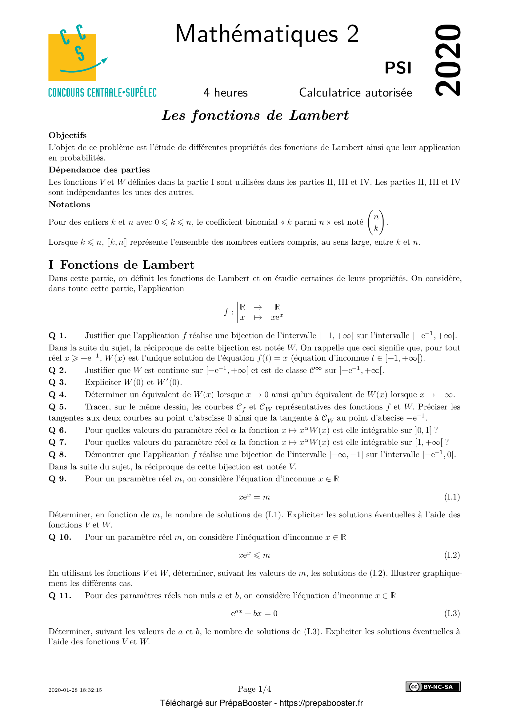 9. Pour un paramètre réel $m$, on considère l’équation d’inconnue $x \in \mathbb{R}$ \[ xe^x = m \tag{I.1} \] Déterminer, en fonction de $m$, le nombre de solutions de (I.1). Expliciter les solutions éventuelles à l’aide des fonctions $V$ et $W$.