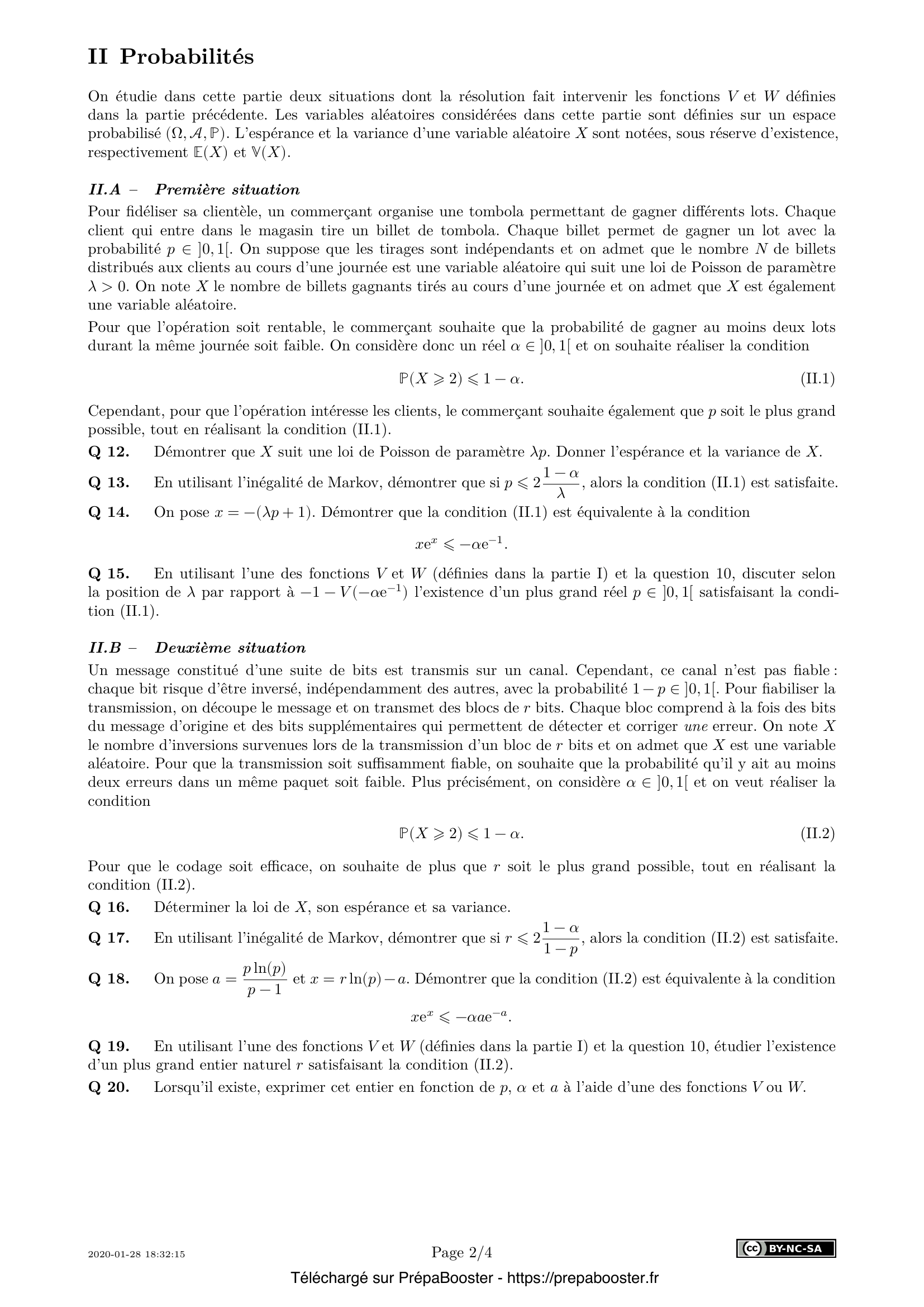 15. En utilisant l’une des fonctions $V$ et $W$ (définies dans la partie I) et la question 10, discuter selon la position de $\lambda$ par rapport à $-1 – V(-\alpha e^{-1})$ l’existence d’un plus grand réel $p \in ]0,1[$ satisfaisant la condition (II.1).}