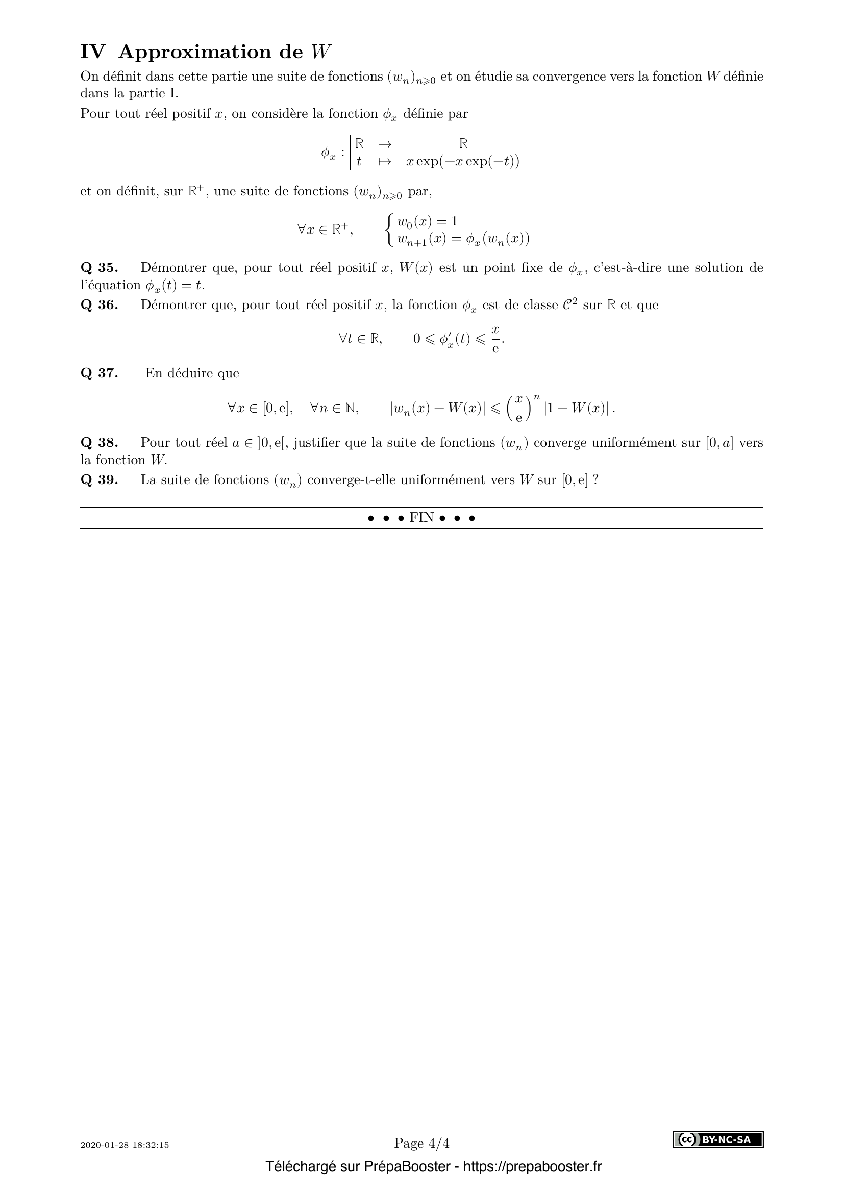 37. En déduire que \[ \forall x \in [0, e],\ \forall n \in \mathbb{N},\, |w_n(x) – W(x)| \leq \left(\frac{x}{e}\right)^n |1 – W(x)|. \]