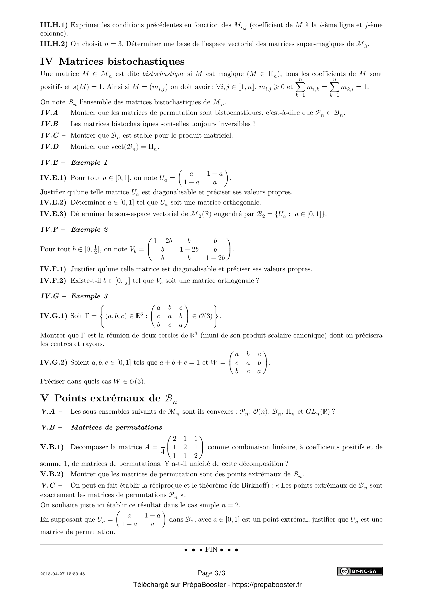 22. III.C.4) Montrer que $s : M \in \Pi_n \mapsto s(M) \in \mathbb{R}$ est une application linéaire, vérifiant $s(MM’) = s(M) s(M’)$ pour tous $M, M’ \in \Pi_n$.