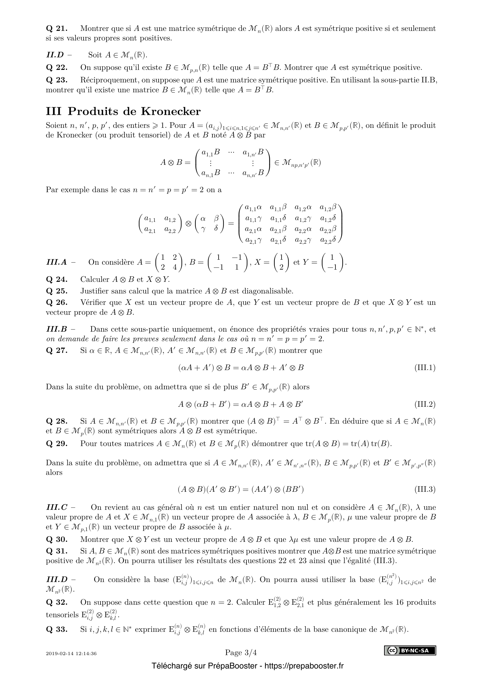 31. Si $A, B \in \mathcal{M}_n(\mathbb{R})$ sont des matrices symétriques positives montrer que $A \otimes B$ est une matrice symétrique positive de $\mathcal{M}_{n^2}(\mathbb{R})$. On pourra utiliser les résultats des questions 22 et 23 ainsi que l’égalité (III.3).