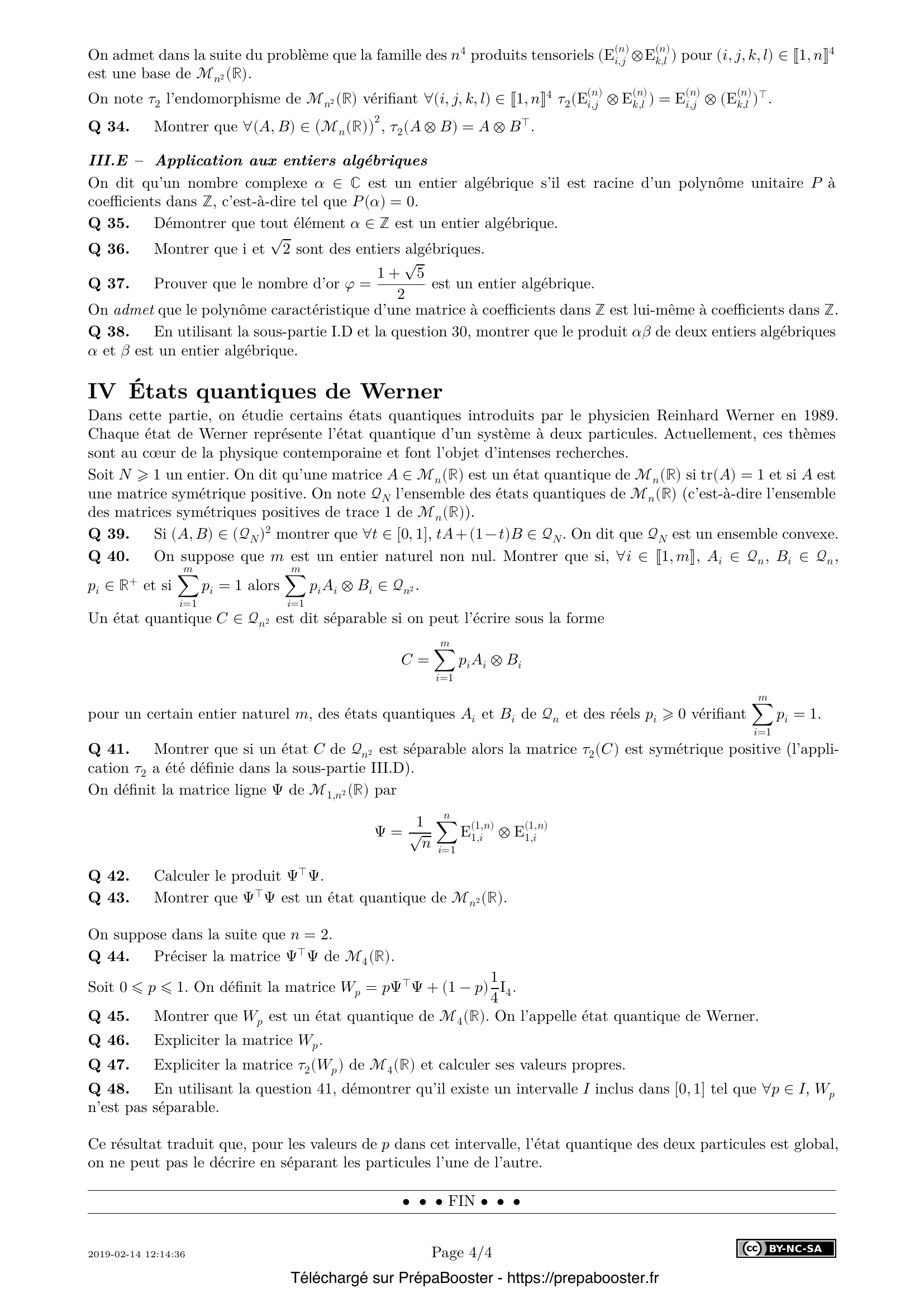 41. Montrer que si un état $C$ de $\mathcal{Q}_{n^2}$ est séparable alors la matrice $\tau_2(C)$ est symétrique positive (l’application $\tau_2$ a été définie dans la sous-partie III.D).