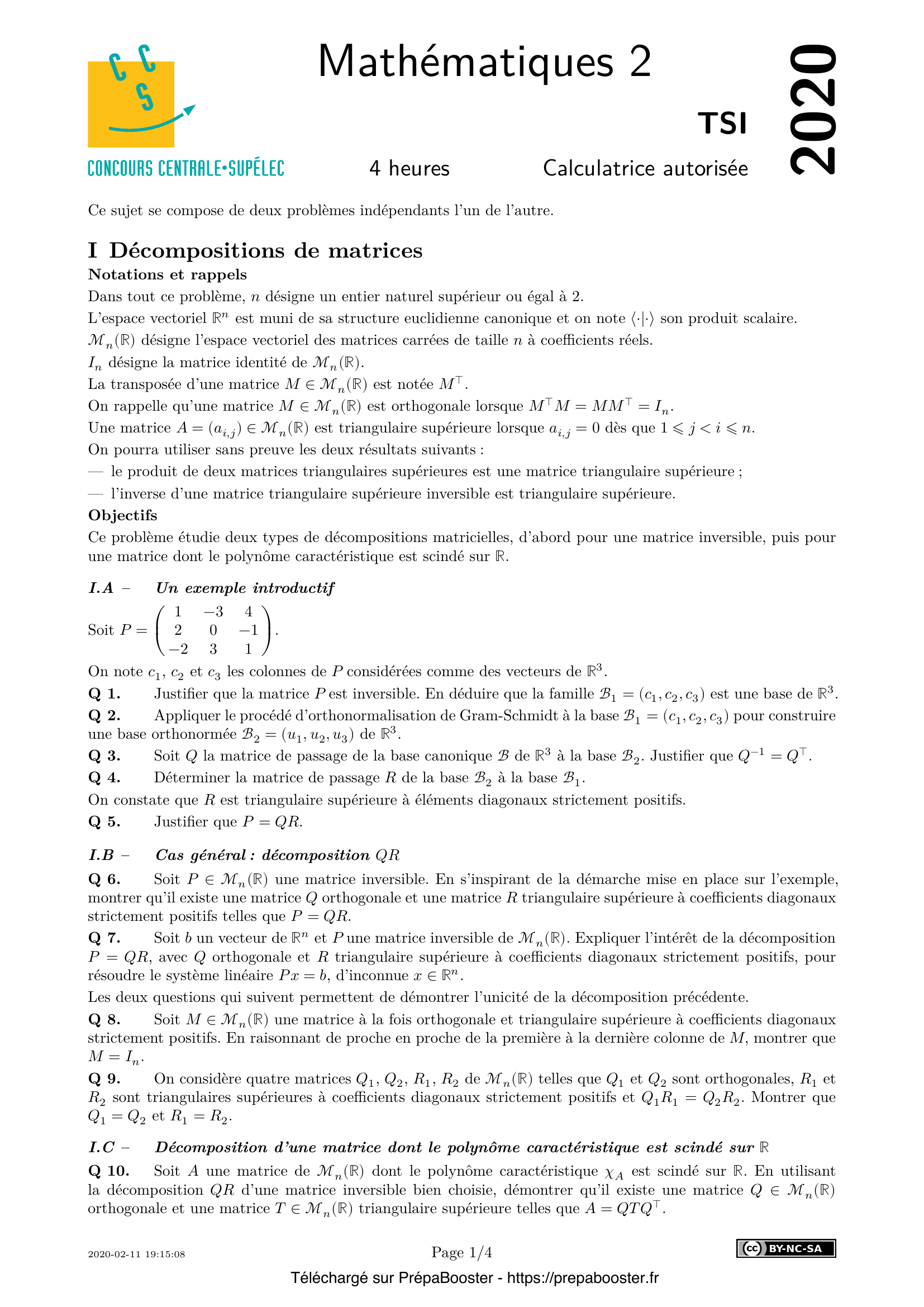 10. Soit $A$ une matrice de $\mathcal{M}_n(\mathbb{R})$ dont le polynôme caractéristique $\chi_A$ est scindé sur $\mathbb{R}$. En utilisant la décomposition $QR$ d’une matrice inversible bien choisie, démontrer qu’il existe une matrice $Q \in \mathcal{M}_n(\mathbb{R})$ orthogonale et une matrice $T \in \mathcal{M}_n(\mathbb{R})$ triangulaire supérieure telles que $A = Q T Q^\top$.}