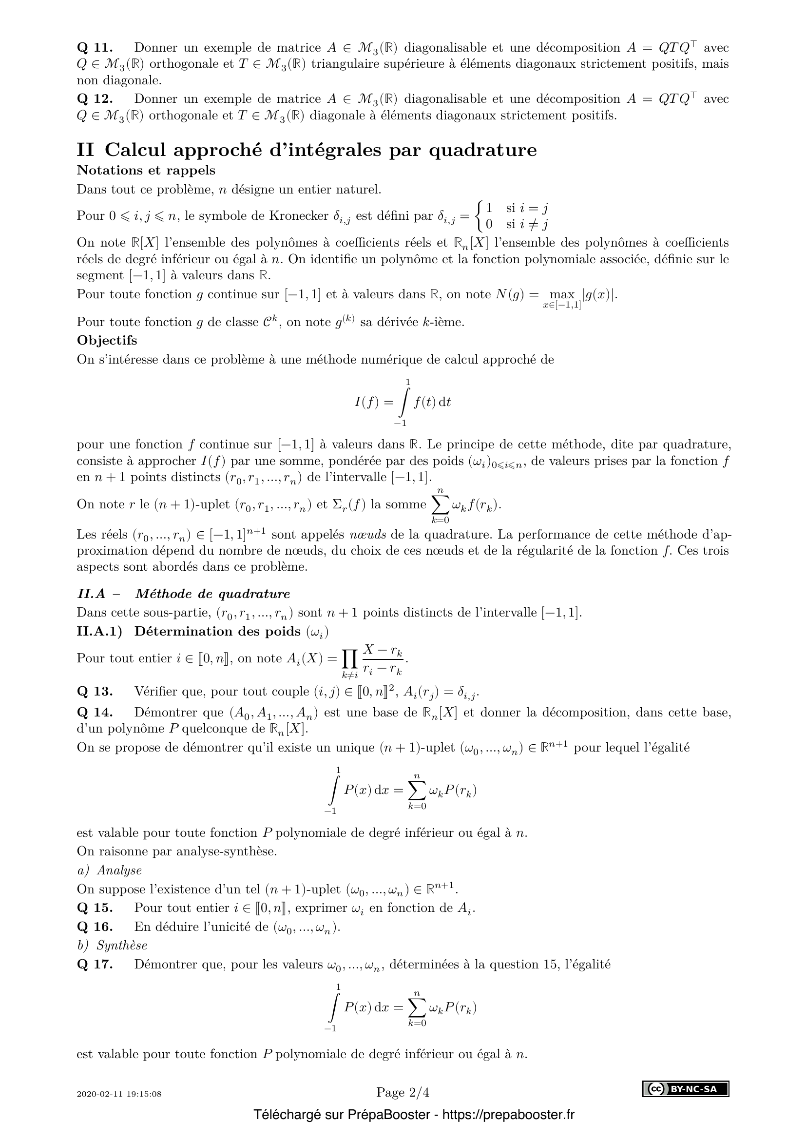 11. Donner un exemple de matrice $A \in \mathcal{M}_3(\mathbb{R})$ diagonalisable et une décomposition $A = Q T Q^\top$ avec $Q \in \mathcal{M}_3(\mathbb{R})$ orthogonale et $T \in \mathcal{M}_3(\mathbb{R})$ triangulaire supérieure à éléments diagonaux strictement positifs, mais non diagonale.