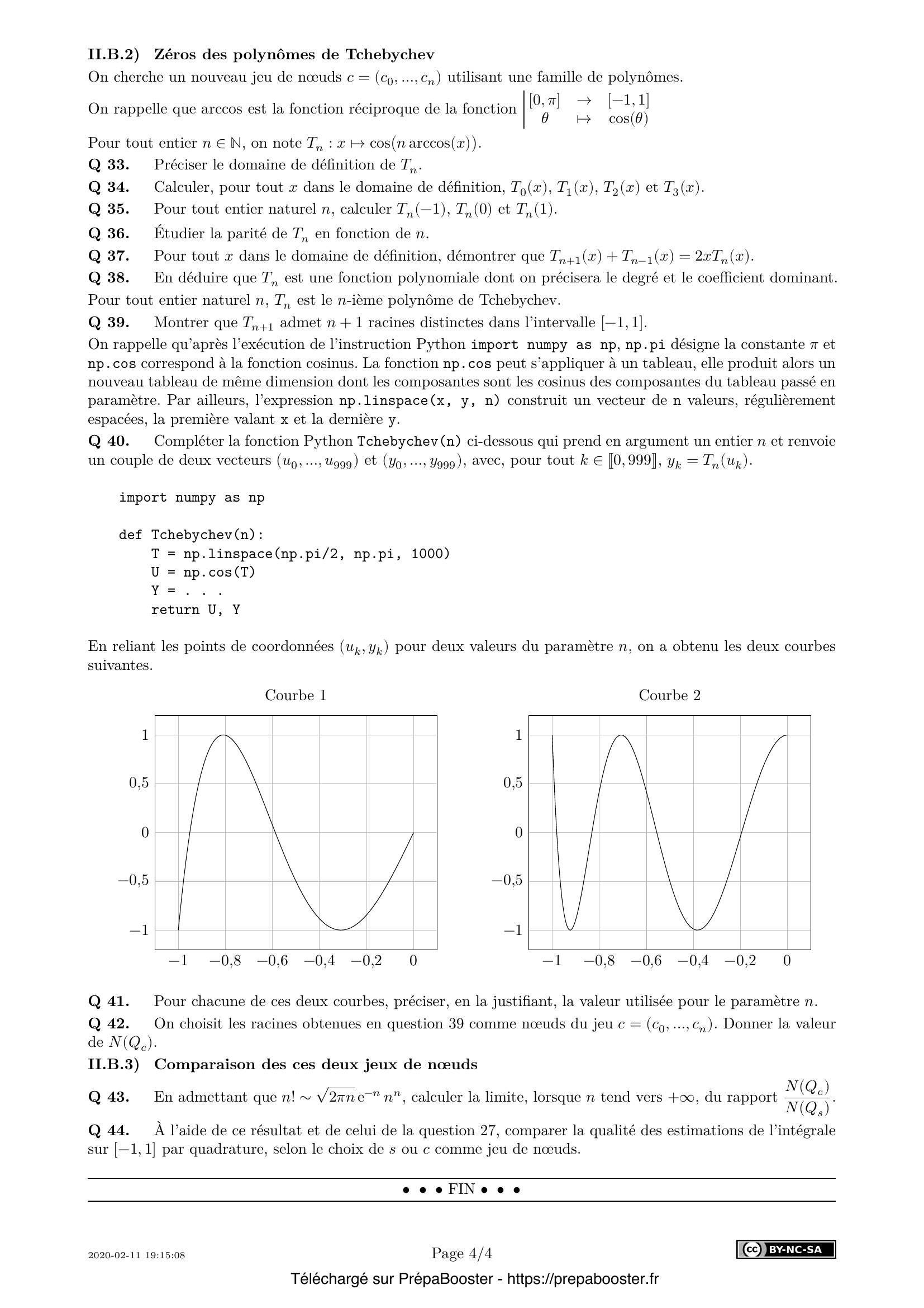 41. Compléter la fonction Python \texttt{Tchebychev(n)} ci-dessous qui prend en argument un entier $n$ et renvoie un couple de deux vecteurs $(u_0, \ldots, u_{999})$ et $(y_0, \ldots, y_{999})$, avec, pour tout $k \in \llbracket 0, 999 \rrbracket$, $y_k = T_n(u_k)$.