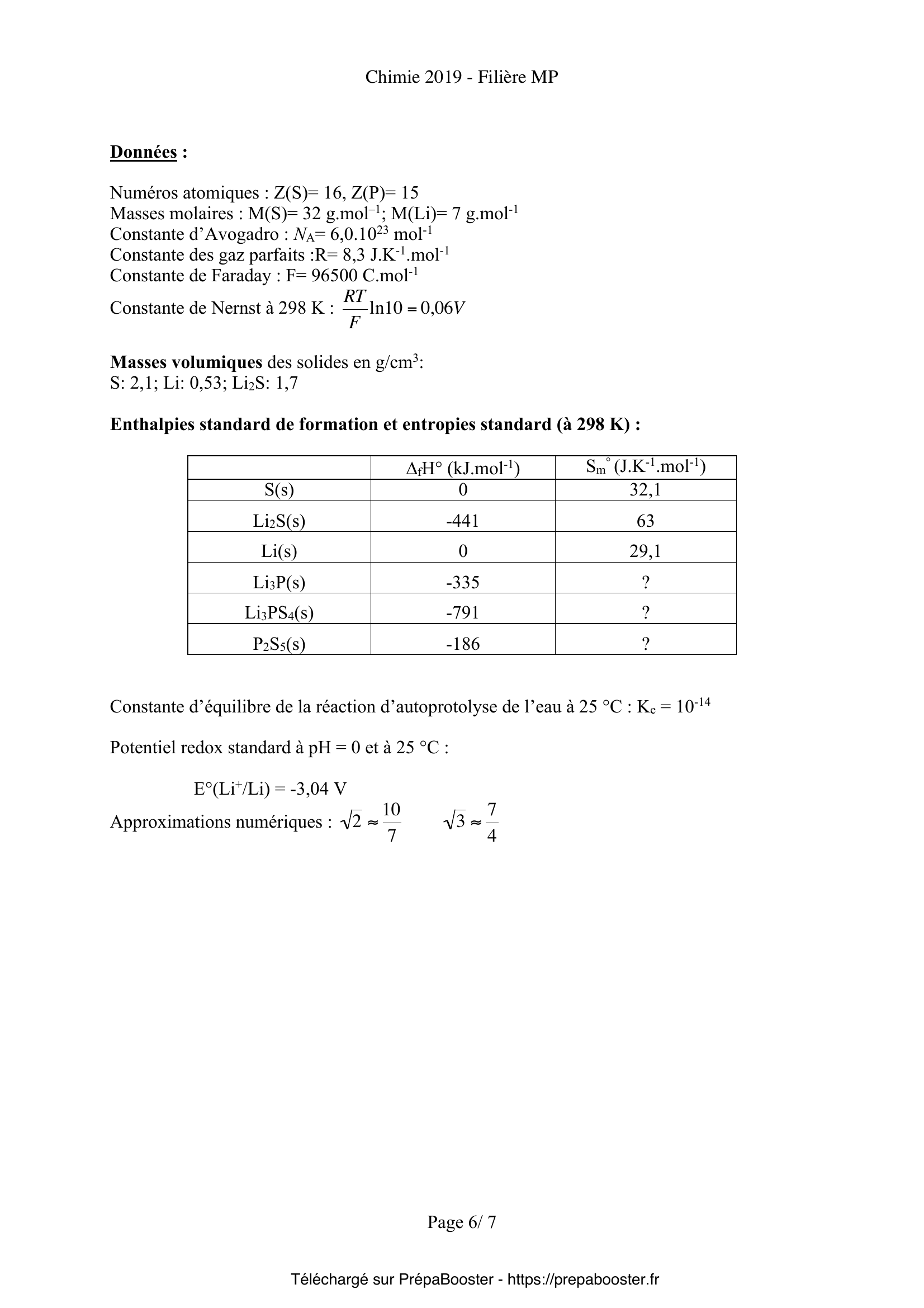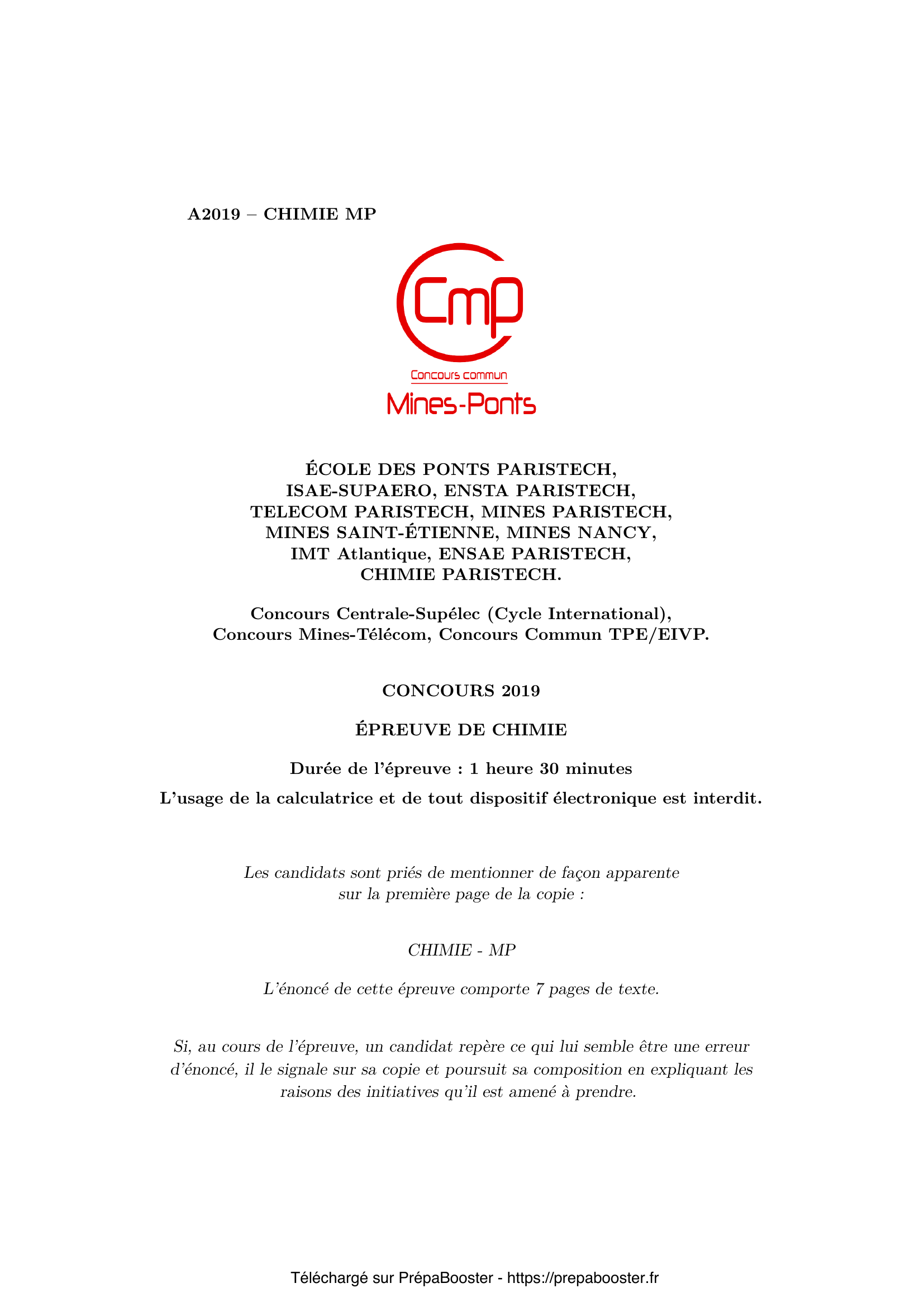 Ce sujet de Chimie du concours Mines Ponts MP 2019 correspond aux épreuves disponibles sur le site officiel du concours Mines Ponts. Retrouve sur Prépa Booster toutes les ressources nécessaires pour ta préparation, y compris les corrigés détaillés.