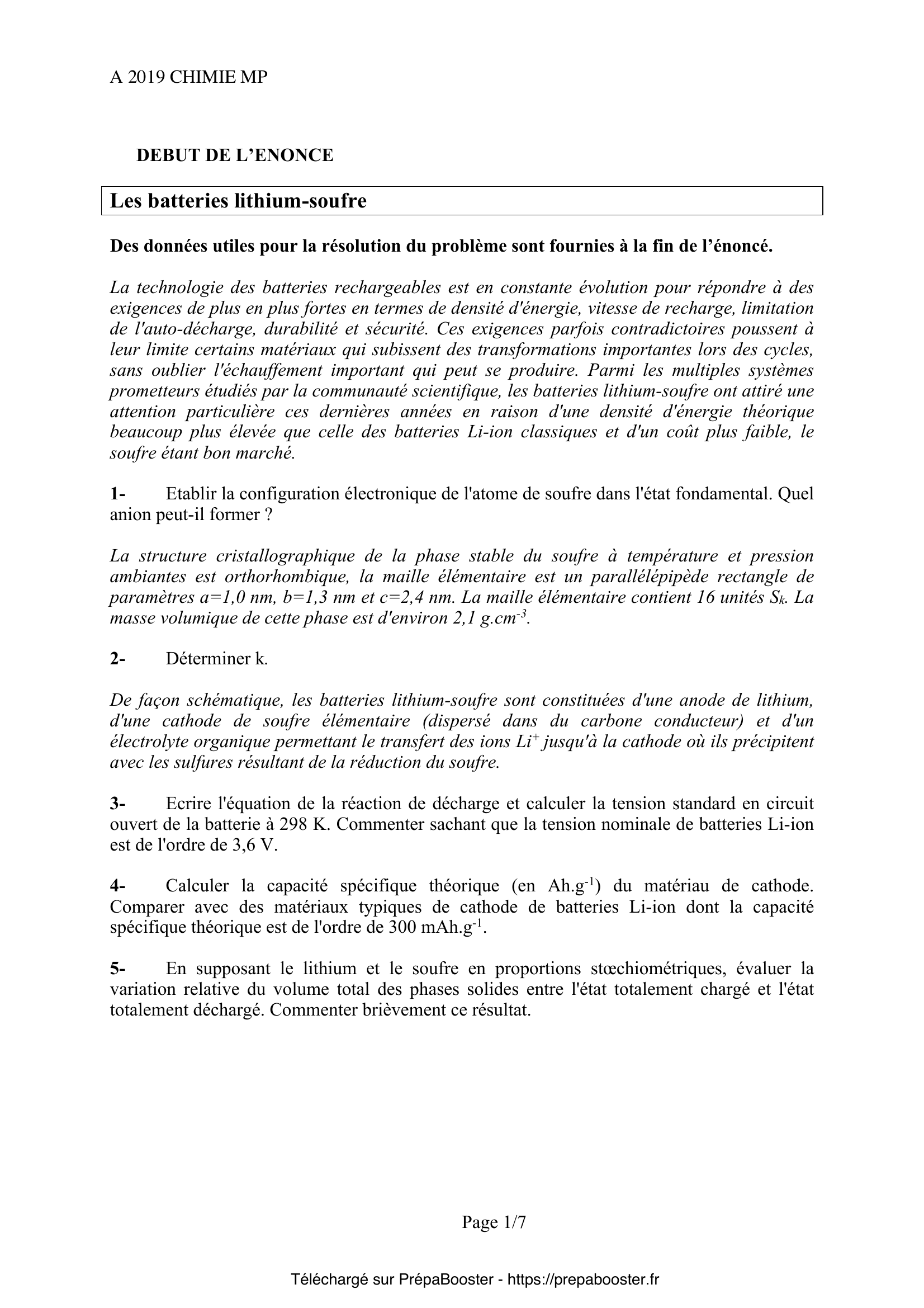 Énoncé Mines Ponts 2019 – MP – chimie 1