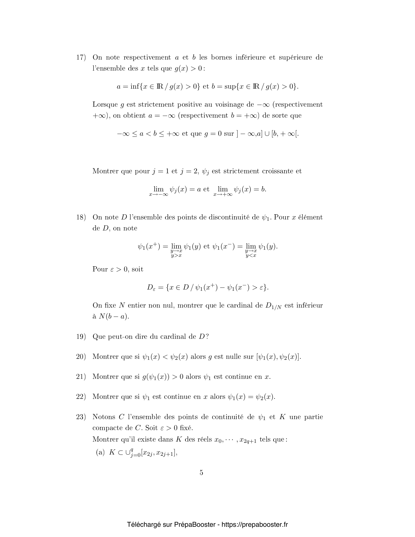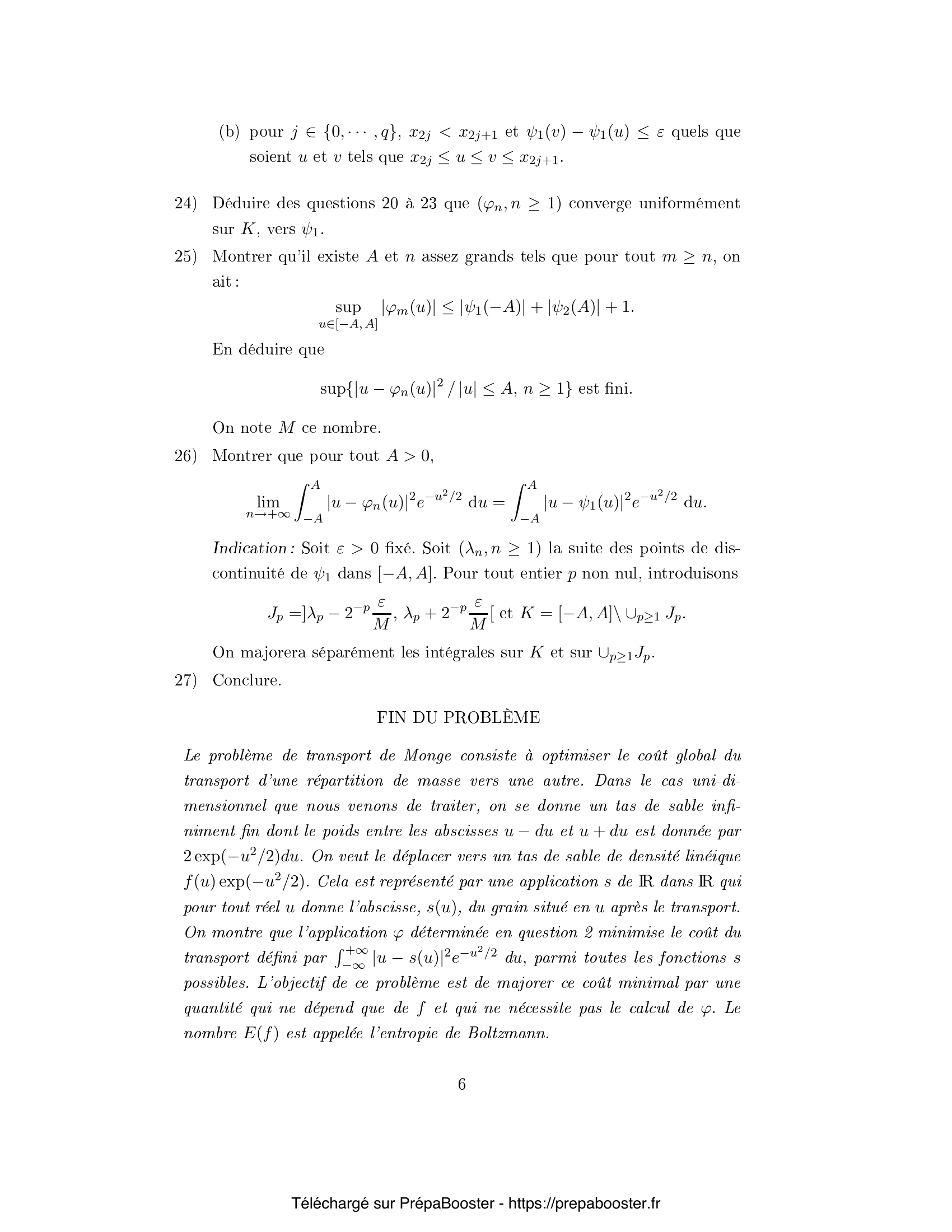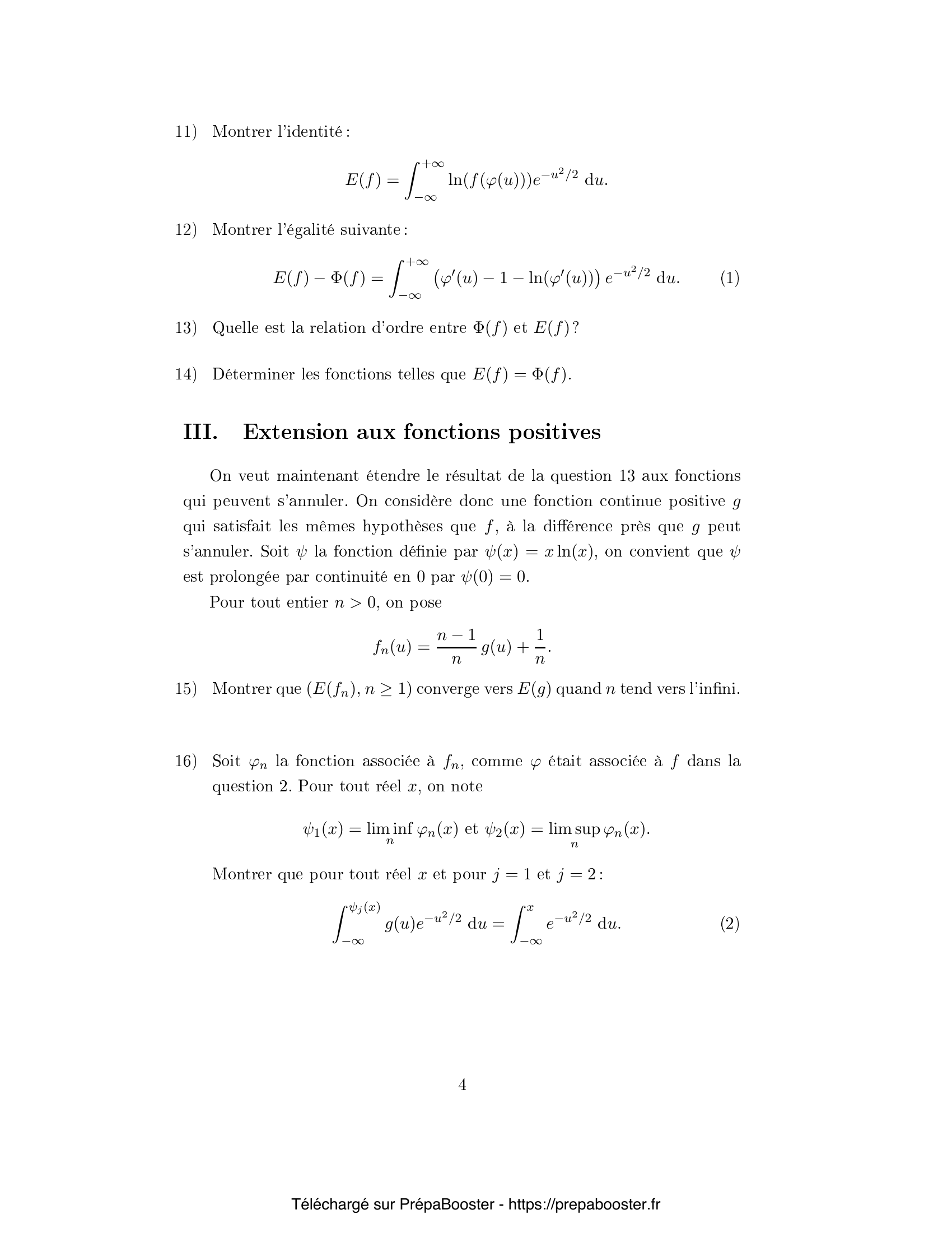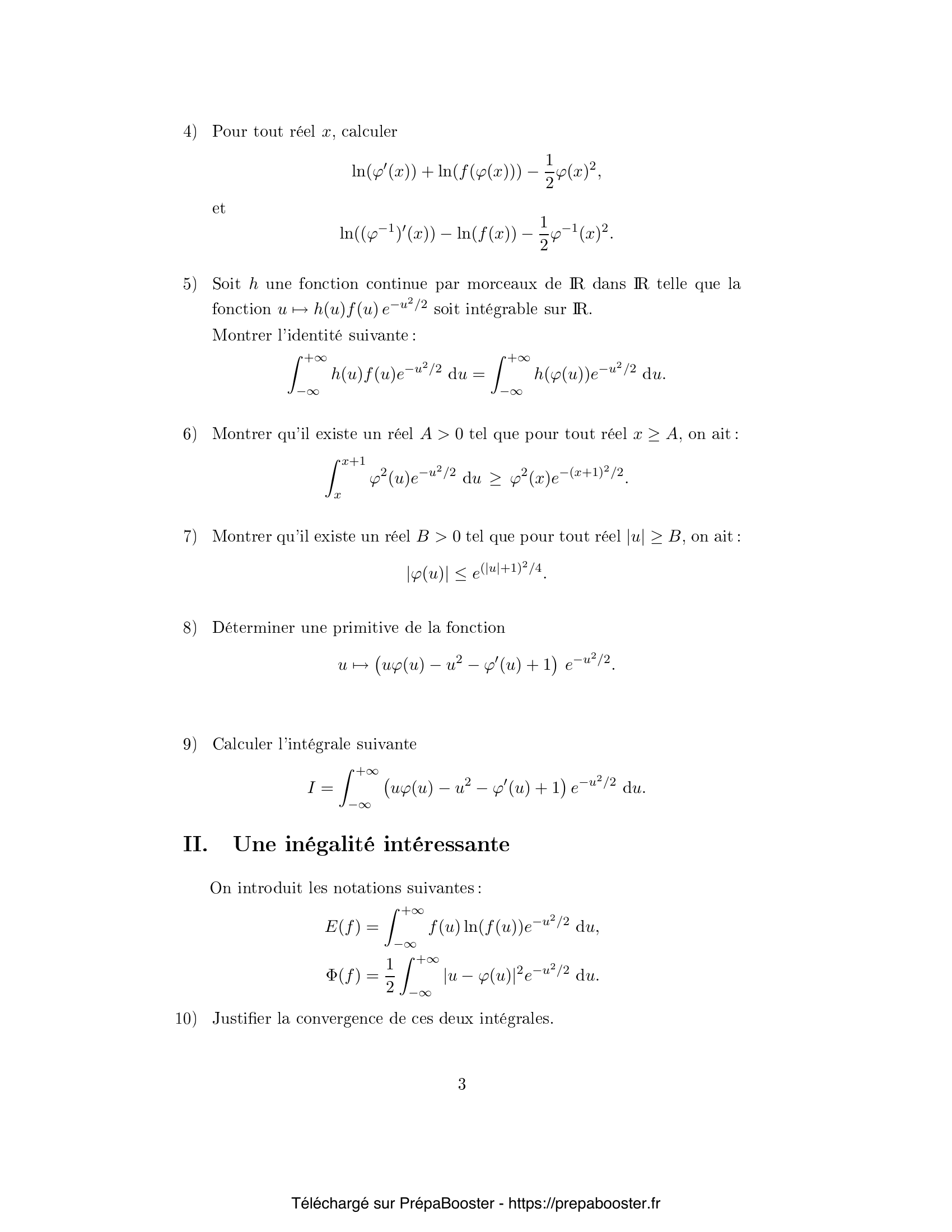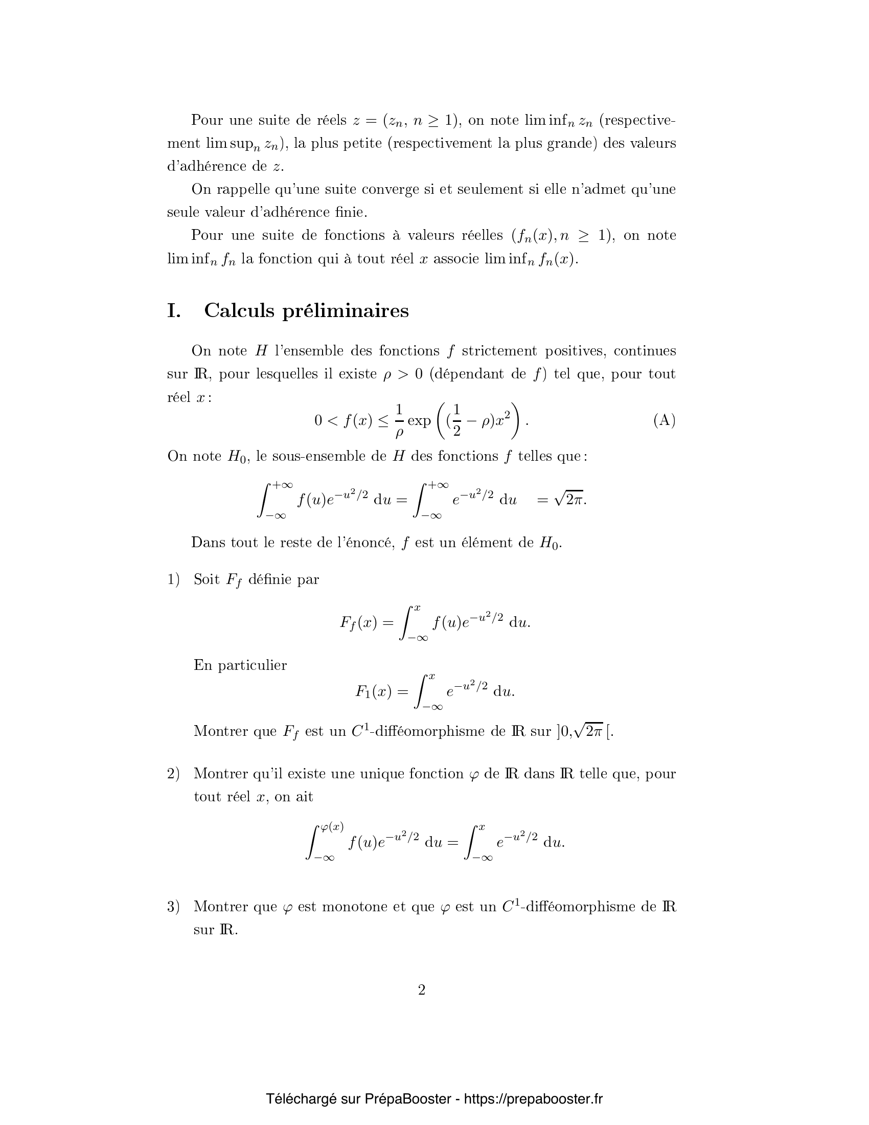 1. Soit $z = (z_n, n \geq 1)$ une suite réelle. Rappeler les définitions suivantes : \[ \liminf_{n} z_n \quad \text{et} \quad \limsup_{n} z_n \] 2. Soit $(f_n(x), n \geq 1)$ une famille de fonctions réelles. Montrer que : \[ \liminf_{n} f_n(x) \leq \liminf_{n} f_n \leq \limsup_{n} f_n \leq \limsup_{n} f_n(x) \] 3. Soit $f$ une fonction mesurable et positive sur $\mathbb{R}$ telle que, pour un réel $\rho>0$, on ait pour tout $x\in\mathbb{R}$ : \[ 0 < f(x) \leq \frac{1}{\rho} \exp\left( \frac{1}{2}-\rho)x^2 \right) \] Montrer que $f$ est intégrable par rapport à la mesure de probabilité gaussienne normale centrée réduite. 4. Soit $H$ l'espace des fonctions mesurables et positives sur $\mathbb{R}$ telles que : \[ \int_{-\infty}^{+\infty} f(u)e^{-u^2/2} du = \sqrt{2\pi} \] Montrer que l'opérateur intégral suivant définit une bijection de $H$ sur $H_0$ : \[ F_f(x) = \int_{-\infty}^{x} f(u) e^{-u^2/2} du \] où $H_0$ est l'ensemble des fonctions croissantes de $\mathbb{R}$ dans $[0,\sqrt{2\pi}]$ qui tendent vers $0$ en $-\infty$ et vers $\sqrt{2\pi}$ en $+\infty$. 5. Montrer que l'opérateur $\varphi$ défini par l'égalité \[ \int_{-\infty}^{\varphi(x)} f(u) e^{-u^2/2} du = \int_{-\infty}^{x} e^{-u^2/2} du \] est une bijection croissante de $\mathbb{R}$ sur $\mathbb{R}$.} 6. Établir la formule suivante pour $h$ continue bornée : \[ \int_{-\infty}^{+\infty} h(u) f(u) e^{-u^2/2} du = \int_{-\infty}^{+\infty} h(\varphi(u)) e^{-u^2/2} du \] 7. Justifier l'existence, pour $A>0$, $x\geq A$ : \[ \int_{x}^{x+1} \varphi^2(u) e^{-u^2/2} du \geq \varphi^2(x) e^{-(x+1)^2/2} \] 8. Justifier que pour $B>0$ et $|u|\geq B$ : \[ |\varphi(u)| \leq e^{(|u|+1)^2/4} \] 9. Soit \[ I = \int_{-\infty}^\infty (u\varphi(u) – u^2 – \varphi(u) + 1) e^{-u^2/2} du \] Calculer $I$. 10. Soit \[ E(f) = \int_{-\infty}^{+\infty} f(u)\ln(f(u)) e^{-u^2/2} du, \quad \Phi(f) = \frac{1}{2} \int_{-\infty}^{+\infty} |u – \varphi(u)|^2 e^{-u^2/2} du \] Exprimer $E(f)$ uniquement en fonction de $\varphi$.} 11. Montrer que \[ E(f) – \Phi(f) = \int_{-\infty}^{+\infty} \left(\varphi(u) – 1 – \ln(\varphi(u))\right) e^{-u^2/2} du \] 12. Montrer que $E(f) \geq \Phi(f)$, et donner le cas d’égalité. 13. Soit $\psi(x) = x \ln x$. Montrer que pour $f_n(u) = \frac{n-1}{n} g(u) + \frac{1}{n}$ où $g$ est une fonction positive intégrable : \[ E(f_n) \to E(g) \] 14. Notant $\varphi_n$ la fonction associée à $f_n$ comme plus haut et posant \[ \psi_1(x) = \liminf_n \varphi_n(x),\quad \psi_2(x) = \limsup_n \varphi_n(x) \] Montrer que pour tout $x$ réel : \[ \int_{-\infty}^{\psi_j(x)} g(u) e^{-u^2/2} du = \int_{-\infty}^x e^{-u^2/2} du \quad \text{pour } j=1,2 \] 15. Posons $a = \inf\{x \in \mathbb{R} : g(x) > 0\}$ et $b = \sup\{x \in \mathbb{R} : g(x)>0\}$. Montrer que $\psi_j(x)\to a$ lorsque $x\to -\infty$ et $\psi_j(x)\to b$ lorsque $x\to +\infty$.} 16. Soit $D = \{ x \in \mathbb{R} : \psi_1(x^+) – \psi_1(x^-) > 0\}$. Montrer que $|D| \leq b-a$. 17. Montrer que si pour un $x$, $\psi_1(x) < \psi_2(x)$ alors $g$ est non nulle sur $[\psi_1(x),\psi_2(x)]$. 18. Montrer si $g(\psi_1(x))>0$ alors $\psi_1$ est strictement croissante au voisinage à gauche de $x$. 19. Montrer que si $\psi_1$ est continue en $x$, alors $\psi_1(x) = \psi_2(x)$. 20. Soit $K$ un compact inclus dans $\mathbb{R}$. Montrer que pour tout $\varepsilon > 0$, on peut recouvrir $K$ par un nombre fini d’intervalles sur lesquels la discontinuité de $\psi_1$ est au plus $\varepsilon$.} 21. Soit $(\varphi_n)$ une suite de fonctions comme ci-dessus. Montrer que pour tout $A>0$ : \[ \lim_{n \to +\infty} \int_{-A}^A |u-\varphi_n(u)|^2e^{-u^2/2} du = \int_{-A}^A |u-\psi_1(u)|^2 e^{-u^2/2} du \] }FAQ